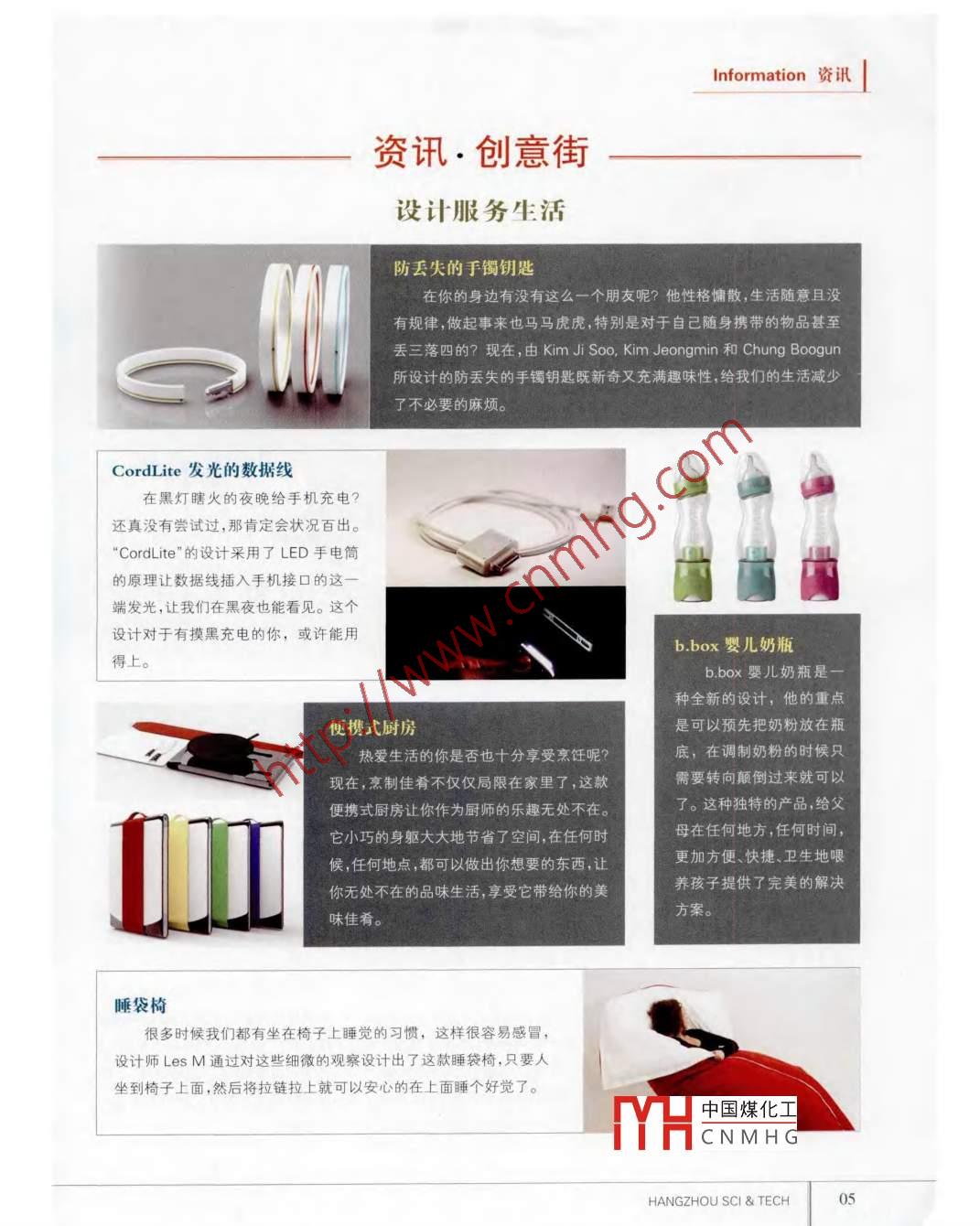 Information資訊資訊.創(chuàng)意街設(shè)計(jì)服務(wù)生活;防丟失的手鐲鑰匙在你的身邊有沒(méi)有這么一個(gè)朋友呢?他性格慵散,生活隨意且沒(méi)有規(guī)律,做起事來(lái)也馬馬虎虎,特別是對(duì)于自己隨身攜帶的物品甚至丟三落四的?現(xiàn)在由Kim Ji Soo, Kim Jeongmin和Chung BoogunSM所設(shè)計(jì)的防丟失的手鐲鑰匙既新奇又充滿趣味性,給我們的生活減少了不必要的麻煩。CordLite發(fā)光的數(shù)據(jù)線在黑燈瞎火的夜晚給手機(jī)充電?還真沒(méi)有嘗試過(guò),那肯定會(huì)狀況百出。"CordLite"的設(shè)計(jì)采用了LED手電筒的原理讓數(shù)據(jù)線插入手機(jī)接口的這一端發(fā)光,讓我們?cè)诤谝挂材芸匆?jiàn)。這個(gè)設(shè)計(jì)對(duì)于有摸黑充電的你,或許能用b.box嬰兒奶瓶得上。b.box嬰兒奶瓶是一種全新的設(shè)計(jì),他的重點(diǎn)便攜式廚房是可以預(yù)先把奶粉放在瓶熱愛(ài)生活的你是否也十分享受烹飪呢?底,在調(diào)制奶粉的時(shí)候只現(xiàn)在,烹制佳肴不僅僅局限在家里了,這款需要轉(zhuǎn)向顛倒過(guò)來(lái)就可以便攜式廚房讓你作為廚師的樂(lè)趣無(wú)處不在。了。這種獨(dú)特的產(chǎn)品,給父它小巧的身軀大大地節(jié)省了空間,在任何時(shí)母在任何地方,任何時(shí)間,候,任何地點(diǎn),都可以做出你想要的東西,讓更加方便、快捷、衛(wèi)生地喂你無(wú)處不在的品味生活,享受它帶給你的美養(yǎng)孩子提供了完美的解決方案。I0味佳肴。唾袋椅很多時(shí)候我們都有坐在椅子上睡覺(jué)的習(xí)慣,這樣很容易感冒,設(shè)計(jì)師Les M通過(guò)對(duì)這些細(xì)微的觀察設(shè)計(jì)出了這款睡袋椅,只要人坐到椅子上面,然后將拉鏈拉上就可以安心的在上面睡個(gè)好覺(jué)了。中國(guó)煤化工fYHCNMHGHANGZHOU SCI &TECH05.