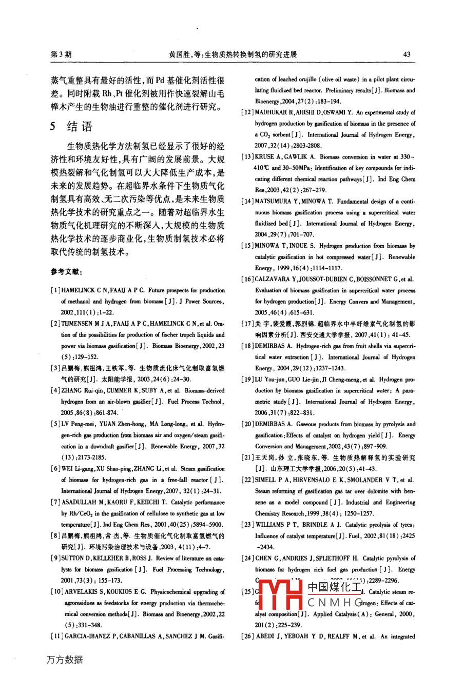 第42卷第3期生物質(zhì)化學工程Vol 42 No. 3008年5月Biomass Chemical EngineeringMay 2008生物質(zhì)熱轉(zhuǎn)換制氫的研究進展黃國勝,陳明強·,王君,陳明功,于宗保(安徽理工大學化學工程學院,安徽淮南232001)摘要:氫氣是一種理想的潔凈能源。從能源角度和環(huán)境角度考慮,發(fā)展生物質(zhì)制氬技術(shù)都具有重要的意義。生物質(zhì)制氨技術(shù)主要包括熱化學法和生物法,其中熱化學法主要是將生物質(zhì)氣化或液化,再進行重整和水蒸氣變換反應(yīng),獲得氫氣。本文綜逑了生物質(zhì)熱化學轉(zhuǎn)化(包括氣化、超臨界水氣化、熱裂解等)制氫技術(shù)的研究進展,并對典型的制氨技術(shù)作了評述和展望。關(guān)鍵詞:生物質(zhì);氫;熱化學轉(zhuǎn)換中圖分類號:TQ517.5文獻標識碼:A文章編號:1673-5854(2008)03-0039-06Research Progress in Hydrogen Production byThermochemical Conversion of biomassHUANG Guo-sheng, CHEN Ming-qiang, WANG Jun, CHEN Ming-gong, YU Zong-baoInstitute of Chemical Engineering, Anhui University of Science and Technology, Huainan 232001, ChinaAbstract: Hydrogen is a kind of ideal clean energy sources. Considering from energy source point of view and environment pointof view, it is very important to develop technology of hydrogen production from biomass. Technology of hydrogen production frombiomass mainly includes thermochemical and biological process. In the former process, biomass was gasified or liquefied, thenreformed and shift reacted by water vapor to produce hydrogen. The research progress in the technology of hydrogen productionfrom biomass by thermochemical conversion including gasification, gasification in supercritical water; pyrolysis) was summarizedin this paper and the typical technique for hydrogen production from biomass was also commented and viewedKey words: biomass; hydrogen; thermochemical conversion氫氣無毒、無味,燃燒生成水,實現(xiàn)真正“零術(shù)的主要發(fā)展方向之一,是一種很有前途的方法。排放”,不產(chǎn)生任何污染物;可儲存運輸,也適于本文論述了生物質(zhì)熱轉(zhuǎn)換法制氫的方法和研究進管道運輸,是一種理想、高效、可再生的清潔能源,展。預(yù)測氫能將成為未來世界的主要能源形式之目前傳統(tǒng)的制氫方法主要有電解水熱裂解化石1生物質(zhì)氣化制氫能源等方法。這些方法中90%都是通過天然生物質(zhì)氣化是生物質(zhì)在高溫(800~900℃)氣、煤、石油為原料制取。下通過氣化劑的作用部分氧化轉(zhuǎn)化成含一氧化碳生物質(zhì)能作為太陽能的一種儲存形式,具有和氫氣等易燃氣體混合物的過程,該方法適用于可再生性、硫含量低、污染小、分布廣、儲量大等特含水率低于35%的生物質(zhì),其目標是將生物質(zhì)原點,是一種可持續(xù)發(fā)展的清潔能源和戰(zhàn)略能源。料部分氧化轉(zhuǎn)化成氣體燃料,產(chǎn)生的低熱值氣體采用生物質(zhì)為原料制氫不僅減少環(huán)境污染,節(jié)約可以直接作為渦輪和發(fā)動機的氣體燃料不可再生能源,而且還可能成為未來能源制備技生物質(zhì)氣化主要反應(yīng)步驟如下(2:1)生物質(zhì)中國煤化工收稿日期:2007-09-07基金項目:國家自然科學基金(20676002);國家重點基礎(chǔ)研究項目(2007CNMHGI青年教師科研資助計劃(2006jp1075)作者簡介:黃國勝(1984-),男,安徽廬江人,碩士生,主要研究方向為生物質(zhì)能源;E-mail:hgsxiaoh@yaho.com,cn通訊作者陳明強(1964-),男,安徽宿州人教授,主要從事生物質(zhì)能源轉(zhuǎn)化方面的研究;Eml; machen@ aust.cdu,cn。生物質(zhì)化學工程第42卷加熱分解轉(zhuǎn)化成氣體、焦炭和一級焦油。2)一級高而增大,焦油、焦炭產(chǎn)量相應(yīng)減少。焦油熱解成氣體,同時生成二級、三級焦油。3)在氣化反應(yīng)器方面主要開發(fā)的3種形式的設(shè)二級、三級焦油的熱解。其化學反應(yīng)主要包括:備:流化床反應(yīng)器、下吹式氣化爐反應(yīng)器和自由落1)熱解過程生成焦炭的非均相和均相氣化反應(yīng);體反應(yīng)器,反應(yīng)器裝置趨向于大型化。近期研究2)熱解過程生成焦炭的燃燒和易燃氣體的氧化的注意力多數(shù)集中于循環(huán)流化床和有催化劑的高反應(yīng)壓反應(yīng)器。前者是出于裝置大型化的考慮,后者1.1氣化劑是為了獲得含氫量高的合成原料氣在氣化過程中加人的氣化劑主要有空氣、氧總之,生物質(zhì)氣化制取氫氣共同存在的問題氣、水蒸氣。根據(jù)氣化劑不同可分為:1)空氣氣是氣化效率低,產(chǎn)物種類分散,不易提取高純度氫化:這是獲得高效率單一產(chǎn)物最廣泛使用的技術(shù)。氣;其優(yōu)點是工藝流程簡單。產(chǎn)品氣品質(zhì)較差,熱值為4~6MJ/Nm,氫氣體1.3催化劑積分數(shù)為8%~14%,反應(yīng)器溫度為900在氣化過程中通常加入催化劑,其主要作用1000℃,但成本較低。2)氧氣氣化:產(chǎn)品氣具有為:1)降低熱解氣化反應(yīng)溫度,減少能耗;2)減少很好的品質(zhì),熱值為10~15M/Nm3。此過程溫氣化劑的投入;3)進行定向催化裂解,促進反應(yīng)度可以達到1000~1400℃,但存在成本和安全平衡,得到更多的目標產(chǎn)物。問題。3)水蒸氣氣化:生成氣體、焦炭、焦油,氫氣生物質(zhì)催化氣化系統(tǒng)主要包括兩大部分體積分數(shù)為30%~60%,但焦油的存在會導(dǎo)致是生物質(zhì)氣化部分,在流化床氣化爐(或其他形催化劑中毒、降低氣化效率、腐蝕設(shè)備等問題。呂式的氣化爐)內(nèi)進行;二是氣化氣催化交換