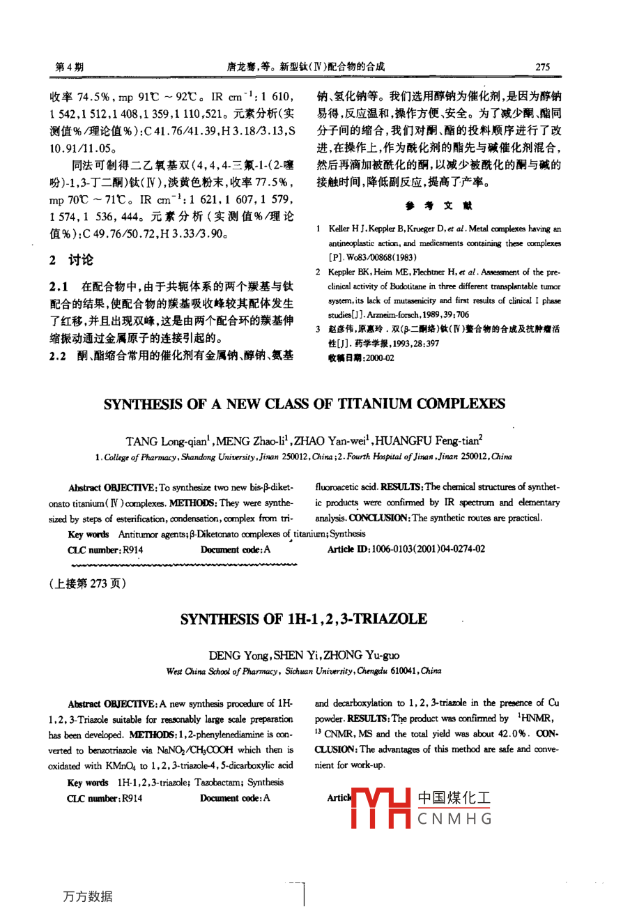 華西藥學雜志2001 ,16(4):274 ~ 275WC]. PS新型鈦(IV )配合物的合成唐龍騫',孟昭力,趙彥偉',皇甫豐田21.山東大學藥學院,山東濟南250012;2.濟南市第四人民醫(yī)院,山東濟南250012摘要目的:合成兩個新的雙(β二酮絡(luò))鈦(IV)配合物。 方法:以三氟乙酸為起始原料,經(jīng)酯化,縮合、配合等步驟制備而成。結(jié)果:產(chǎn)物經(jīng)元素分析、紅外光譜等確證。結(jié)論:此合成線路完全可行。關(guān)鍵詞抗腫瘤藥物;鈦 β二酮配合物;合成中圈分類號:R914文獻標識碼:A文章編號:1006-0103(2001 )04-0274-02雙(β_二酮絡(luò))鈦( IV )配合物的抗腫瘤作用已引1實驗部分起人們的關(guān)注,其中,二乙氧基雙(1.苯基-1,3-丁二酮絡(luò))鈦( IV )( budotitane)和二氯化雙(1.苯基-1,3-各化合物熔點用毛細管法測定(溫度未經(jīng)校丁二酮絡(luò))鈦( N )的抗瘤活性最好。Budotitane 已正),紅外光譜用Perkin-elemer 783型KBr壓片,元進入臨床試驗[1]。它是唯- -進 入抗腫瘤臨床研究素分析由兵器工業(yè)部第五三研究所測定。實驗用溶的非鉑過渡金屬配合物。Budotitane 的抗瘤特點是劑均經(jīng)無水處理。對AMMN誘導的結(jié)、直腸癌有明顯療效,并且毒性1.1乙醉鈉的制備小,無骨髓抑制作用,無誘變性[2]。因此,鈦配合物將10 g金屬鈉加人到160 ml無水乙醚中,然后作為抗腫瘤藥物也就更具吸引力和發(fā)展前途。滴加26ml無水乙醇,回流3h,得乙醇鈉的乙醚混由于配合物的結(jié)構(gòu)與抗瘤活性之間有密切的關(guān)合物,蒸除乙醚,得乙醇鈉白色固體粉末21 g,收率系,其中β二酮配體中的平面芳香環(huán)是該類配合物69.3%。抗腫瘤的重要活性基團[(3],其羰基兩端取代基的極1.2三氟乙酸乙酯的制備性大小對抗瘤活性亦有明顯影響,極性相差越大,其將78.4 ml無水乙醇加人反應器中,分批投入抗瘤活性越高,而酸性配體對其影響不大。根據(jù)這9.6 ml濃硫酸,冷卻,攪拌,加人64.2 g三氟乙酸,-特,點,在對分子結(jié)構(gòu)進行修飾時,我們把極性較大.攪拌反應8 h,蒸餾,得粗品。將粗品與28 ml濃硫的-CF3引人到含有平面芳香環(huán)p-二酮分子中,并以酸在5C以下混勻,精餾,收集60C ~ 62C餾分,得乙氧基為酸性配體,設(shè)計合成了兩個新- -類 型的雙70 g,收率87.7%。(β-二酮絡(luò))鈦( IV )配合物(圖1)。1.3配體β-二酮的制備在5.8 g(0.085 mol)乙醇鈉的10 ml苯溶液中CF3--0C2HsR=thieayl.phenyI加人12 g(0.085 mol)三氟乙酸乙酯及有12.6 g(0. 100 mol)2-乙酰噻吩的10 ml苯溶液,回流3 h, .靜置過夜,傾人含有30 ml水、30g冰、30 ml苯和30 ml濃鹽酸的混合液中,分出有機層,無水碳酸鈉Fig1 Stroctures of the complexes千燥,蒸除苯,減壓蒸餾,收集96七~98亡餾分,得當R= thienyl時,為二乙氧基雙[4,4,4三氟1桔黃色針狀晶體4,4,4-三氟-1-(2-噻吩)-1-3-丁二(2-噻吩基)-1,3~丁二銅]絡(luò)鈦(IV);當R= phenyl時酮14 g,收率74.5% ,mp 41C ~42C。為二乙氧基雙(4,4,4-三氟-1-苯基-1,3~丁二酮)絡(luò)同法可制得4,4,4三氟-1.苯基-1,3.丁二酮白鈦(V)。其合成路線如下。色柱狀晶體,收率57 .0% ,mp 30C ~31C。,CF3COOH C250 CF C0C2851.4配合物的制備CcCh.1y0-R-C-can2-C-cP3在2.28 g(0.001 mol)四乙氧基鈦(IV )和20 mlNAOCHS苯的混合液中,加入4.9 g(0.022 mol) 4,4,4三氟-TIH-Ti(R-c--CP3) 2(OC28s)21-(2-噻中國煤化工苯,用乙醇將透明膠MYHE4,4,4-三氟1作者簡介:唐龍壽,男.碩士,講師,從事藥物化學的研究工作。CNMHC色粉末4.3g,第4期唐龍騫,等。新型鈦(V )配合物的合成275收率74.5%,mp 91C ~92C。IR cm~4:1 610,鈉、氫化鈉等。我們選用醇鈉為催化劑,是因為醇鈉1 542,1 512,1 408,1 359,1 110,521。 元素分析(實易得,反應溫和,操作方便、安全。為了臧少酮酯同測值% /理論值% ):C 41.76/41.39,H3.18/3.13,S分子間的縮合,我們對酮、酯的投料順序進行了改10.91/11 .05。進,在操作.上,作為?;瘎┑孽ハ扰c堿催化劑混合,同法可制得二乙氧基雙(4,4,4三氟-1-<2-噻然后再滴加被?;耐?以減少被?;耐c堿的吩)-1,3-丁二酮)鈦(IV),淡黃色粉末,收率77.5%,接觸時間,降低副反應,提高了產(chǎn)率。mp 70C ~ 71C。IR cm-':1 621,1 607,1 579,參考文獻1574,1 536, 444。元素分析(實測值%/理論值%):C 49.76/50.72,H 3.33/3.90。1 Keller HJ.Keppler B,Krueger D,et al . Mctal camplexes having助antinoplastic action, and medicaments containing these complexes2討論[P]. Wo83/00868( 1983)2 Kepler BK, Heim ME, Flchuner H, et al. Asenent of the pre-2.1在配合物中 ,由于共軛體系的兩個羰基與鈦配合的結(jié)果,使配合物的羰基吸收峰較其配體發(fā)生sytamnits lack of mutasenicity and finst results of cinical I phasestudies[J]. Armeim-forsch, 1989 ,39:706了紅移,并且出現(xiàn)雙峰,這是由兩個配合環(huán)的羰基伸3趙彥偉,原惠玲.雙(β二酮絡(luò))鐵(IV )鰲合物的合成及抗腫瘸活縮振動通過金屬原子的連接引起的。性[J].藥學學報,1993,28:3972.2酮、酯縮合常 用的催化劑有金屬鈉、醇鈉氨基收稿日期:000-02SYNTHESIS OF A NEW CLASS OF TTTANIUM COMPLEXESTANG Long-qian' ,MENG Zhaoli2' ,ZHAO Yan- weil ,HUANGFU Feng tian21.College of Pharmacy, Shandong Unirersity,Jinan 25012,China ;2.Fourth Hospital of Jinan ,Jinan 250012,ChinaAhstract OBJECTTVE: To synthesize twO new bisβ diket-fluoroacetic acid. RESULTS: The chernical structures of synthet-onato titanium( IV ) comoplexes. METHODS: They were synthe-ic products were confirmed by IR spectrun and elementarysized by steps of esterification, condensation, complex from rianalysis. CONCLUSION:The synthetic troutes are practical.Key words Antumor agents;A-Diketonato oumplexes of titanium; SynthesisaLc number:R914Document code;AArticke D: 1006-0103(2001)04-0274