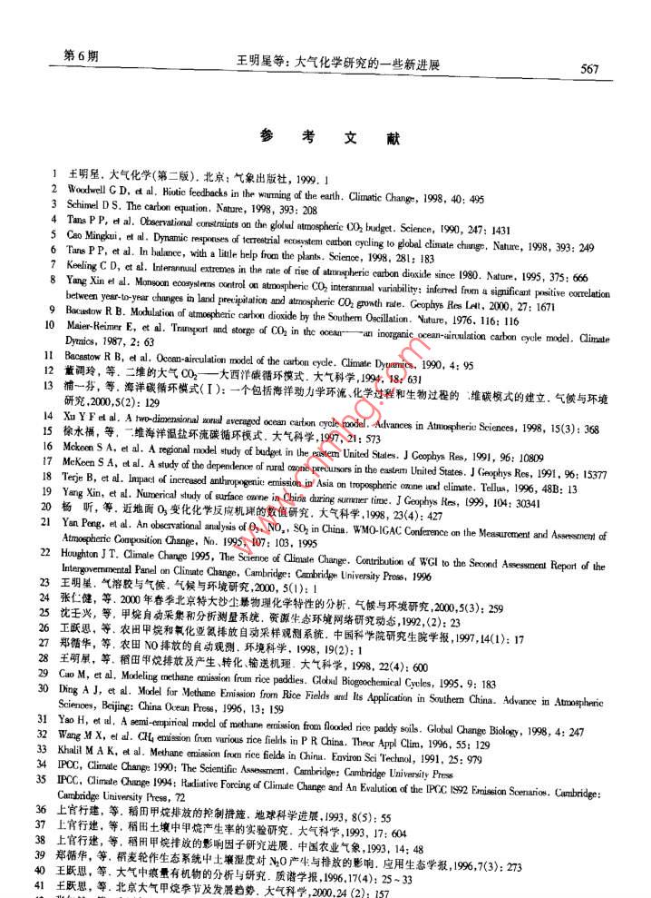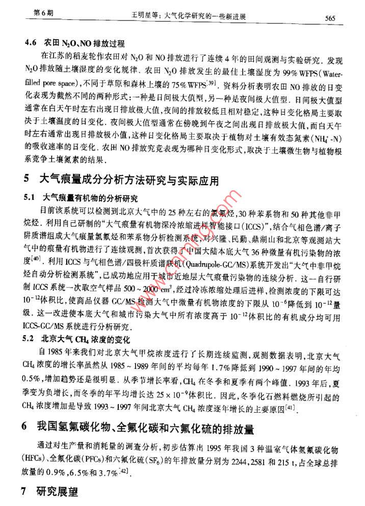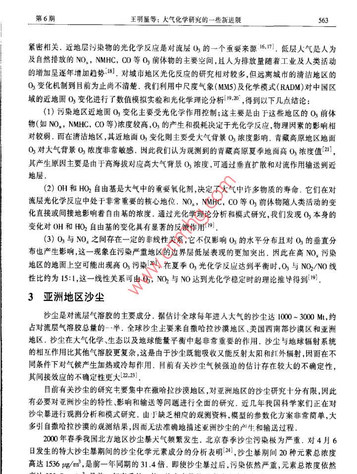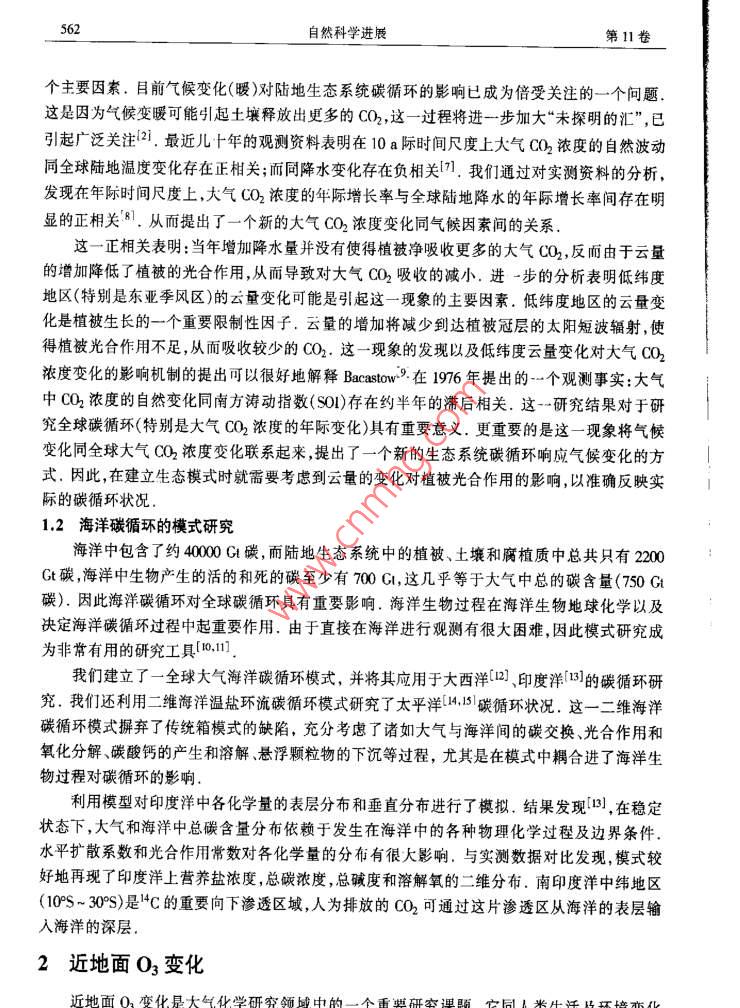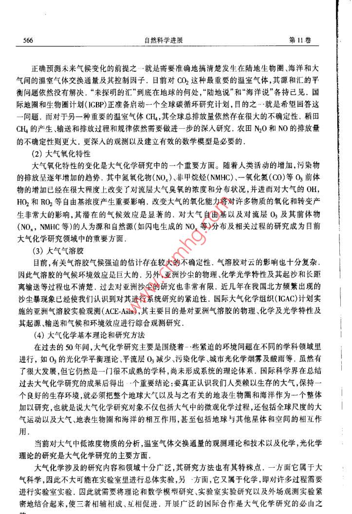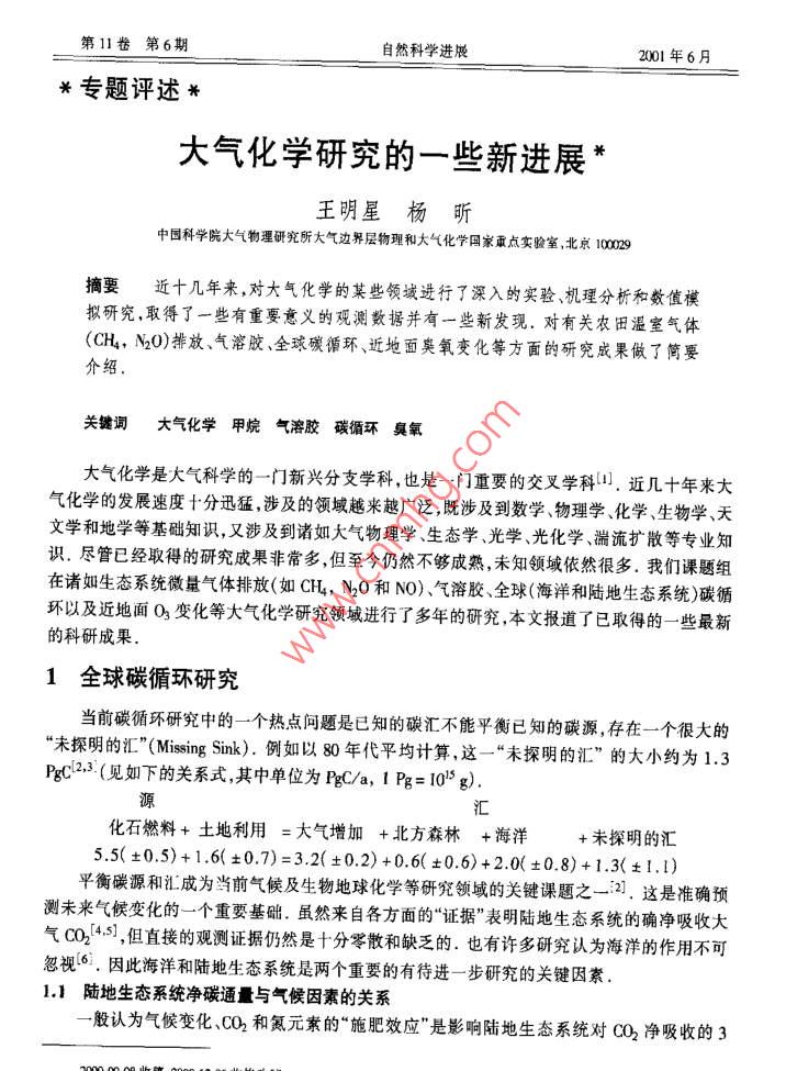 第11卷第6期自然科學(xué)進(jìn)展2001年6月*專題評(píng)述*大氣化學(xué)研究的一些新進(jìn)展王明星楊昕中國(guó)科學(xué)院大氣物理研究所大氣邊界層物理和大氣化學(xué)國(guó)家重點(diǎn)實(shí)驗(yàn)室北京100909摘要近十幾年來,對(duì)大氣化學(xué)的某些領(lǐng)域進(jìn)行了深入的實(shí)驗(yàn)、機(jī)理分析和數(shù)值模擬研究,取得了一些有重要意義的觀測(cè)數(shù)據(jù)并有一些新發(fā)現(xiàn).對(duì)有關(guān)農(nóng)田溫室氣體(CH, N2O)排放、氣溶膠、全球碳循環(huán)、近地面臭氧變化等方面的研究成果做了簡(jiǎn)要介紹.關(guān)鍵詞大氣化學(xué)甲烷氣溶膠碳循環(huán)臭氧大氣化學(xué)是大氣科學(xué)的一門新興分支學(xué)科,也是一門重要的交叉學(xué)科(1。近幾十年來大氣化學(xué)的發(fā)展速度十分迅猛,涉及的領(lǐng)域越來越廣泛,既涉及到數(shù)學(xué)物理學(xué)、化學(xué)生物學(xué)、天文學(xué)和地學(xué)等基礎(chǔ)知識(shí),又涉及到諸如大氣物理學(xué)生態(tài)學(xué).光學(xué)、光化學(xué)、湍流擴(kuò)散等專業(yè)知識(shí).盡管已經(jīng)取得的研究成果非常多,但至今仍然不夠成熟,未知領(lǐng)城依然很多.我們課題組在諸如生態(tài)系統(tǒng)微量氣體排放(如CH, N20和NO)、氣溶膠、全球(海洋和陸地生態(tài)系統(tǒng))碳循環(huán)以及近地面O3變化等大氣化學(xué)研究領(lǐng)城進(jìn)行了多年的研究,本文報(bào)道了已取得的一些最新的科研成果.1全球碳循環(huán)研究當(dāng)前碳循環(huán)研究中的一一個(gè)熱點(diǎn)問題是已知的碳匯不能平衡已知的碳源,存在-一個(gè)很大的“未探明的匯”(Missing Sink).例如以80年代平均計(jì)算,這- -“未探明的匯”的大小約為1.3PegC123(見如下的關(guān)系式,其中單位為PgC/a, 1 Pg= 10'5g).源匯化石燃料+土地利用= 大氣增加+北方森林+ 海洋+未探明的匯5.5(+0.5)+1.6( +0.7) =3.2( +0.2) +0.6( +0.6>+2.0<+0.8)+1.3(+1.1)平衡碳源和匯成為當(dāng)前氣候及生物地球化學(xué)等研究領(lǐng)域的關(guān)鍵課題之一2]. 這是準(zhǔn)確預(yù)測(cè)未來氣候變化的一個(gè)重要基礎(chǔ).雖然來自各方面的“證據(jù)"表明陸地生態(tài)系統(tǒng)的確凈吸收大氣C0[4.s],但直接的觀測(cè)證據(jù)仍然是十分零散和缺乏的.也有許多研究認(rèn)為海洋的作用不可忽視[6j.因此海洋和陸地生態(tài)系統(tǒng)是兩個(gè)重要的有待進(jìn)-步研究的關(guān)鍵因素.1.1陸地生態(tài) 系統(tǒng)凈碳通與氣候因素的關(guān)系--般認(rèn)為氣候變化,CO2和氮元素的“施肥效應(yīng)"是影響陸地生態(tài)系統(tǒng)對(duì)CO2凈吸收的3mmm業(yè)站aen----業(yè)山→=自然科學(xué)進(jìn)展第11卷個(gè)主要因素,目前氣候變化(暖)對(duì)陸地生態(tài)系統(tǒng)碳循環(huán)的影響已成為倍受關(guān)注的一一個(gè)問題.這是因?yàn)闅夂蜃兣赡芤鹜寥泪尫懦龈嗟腃O2,這一過程將進(jìn)-步加大“未探明的匯”,已引起廣泛關(guān)注(2i.最近兒十年的觀測(cè)資料表明在10a際時(shí)間尺度上大氣C02濃度的自然波動(dòng)同全球陸地溫度變化存在正相關(guān);而同降水變化存在負(fù)相關(guān)[7.我們通過對(duì)實(shí)測(cè)資料的分析,發(fā)現(xiàn)在年際時(shí)間尺度上,大氣CO2濃度的年際增長(zhǎng)率與全球陸地降水的年際增長(zhǎng)率間存在明顯的正相關(guān)'8].從而提出了一個(gè)新的大氣CO2濃度變化同氣候因素間的關(guān)系.這一正相關(guān)表明:當(dāng)年增加降水量并沒有使得植被凈吸收更多的大氣C02,反而由于云量的增加降低了植被的光合作用,從而導(dǎo)致對(duì)大氣CO2吸收的減小,進(jìn)一步的分析表明低緯度地區(qū)(特別是東亞季風(fēng)區(qū))的云量變化可能是引起這一現(xiàn)象的主要因素.低緯度地區(qū)的云量變化是植被生長(zhǎng)的一個(gè)重要限制性因子.云量的增加將減少到達(dá)植被冠層的太陽短波輻射,使得植被光合作用不足,從而吸收較少的CO2.這一現(xiàn)象的發(fā)現(xiàn)以及低緯度云量變化對(duì)大氣CO2濃度變化的影響機(jī)制的提出可以很好地解釋Bacastow.在1976 年提出的一個(gè)觀測(cè)事實(shí):大氣中CO2濃度的自然變化同南方濤動(dòng)指數(shù)(SOI)存在約半年的滯后相關(guān).這-研究結(jié)果對(duì)于研究全球碳循環(huán)(特別是大氣CO2濃度的年際變化)具有重要意義.更重要的是這-現(xiàn)象將氣候變化同全球大氣C02依度變化聯(lián)系起來,提出了一個(gè)新的生態(tài)系統(tǒng)碳循環(huán)響應(yīng)氣候變化的方式.因此,在建立生態(tài)模式時(shí)就需要考慮到云量的變化對(duì)植被光合作用的影響,以準(zhǔn)確反映實(shí)際的碳循環(huán)狀況.1.2 海洋碳循環(huán)的模式研究海洋中包含了約40000 Gu碳,而陸地生態(tài)系統(tǒng)中的植被、土壤和腐植質(zhì)中總共只有2200Gt碳,海洋中生物產(chǎn)生的活的和死的碳至少有700 G,這幾乎等于大氣中總的碳含量(750 Gt碳).因此海洋碳循環(huán)對(duì)全球碳循環(huán)具有重要影響.海洋生物過程在海洋生物地球化學(xué)以及決定海洋碳循環(huán)過程中起重要作用,由于直接在海洋進(jìn)行觀測(cè)有很大困難,因此模式研究成為非常有用的研究工具0.11.我們建立了一全球大氣海洋碳循環(huán)模式,并將其應(yīng)用于大西洋[12]、印度