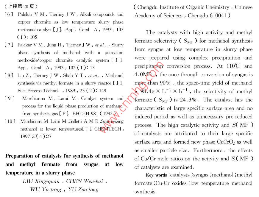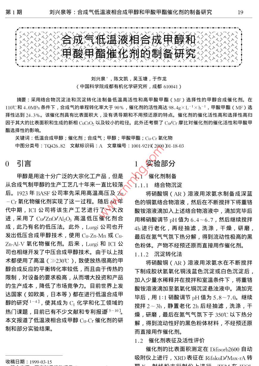 合成氣低溫液相合成甲醇和甲酸甲酯催化劑的制備研究