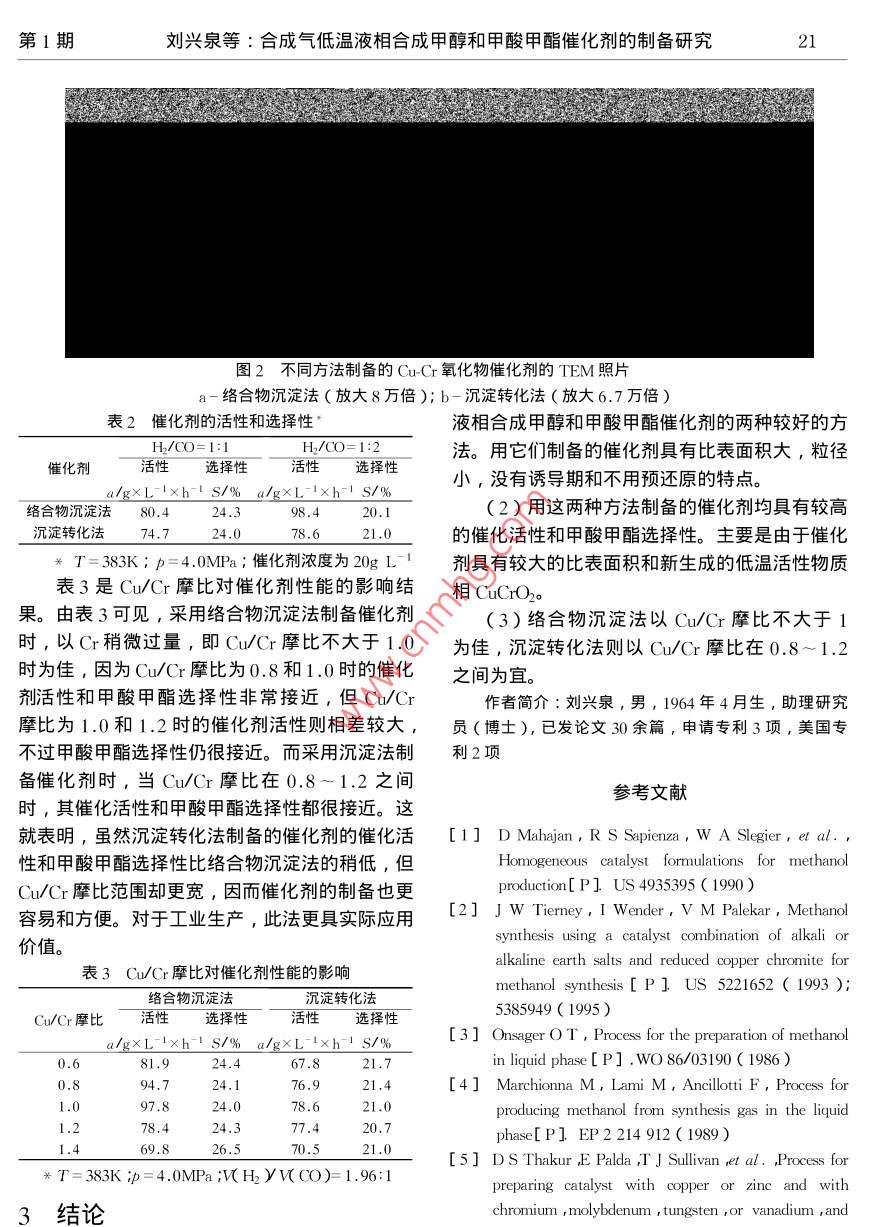 第1期劉興泉等:合成氣低溫液相合成甲醇和甲酸甲酯催化劑的制備研究合成氣低溫液相合成申醇和甲酸甲酯催化劑的制備研究一,一劉興泉,陳文凱,吳玉塘,于作龍中國科學(xué)院成都有機化學(xué)研究所,成都610041)摘要:采用絡(luò)合物沉淀法和沉淀轉(zhuǎn)化法制備低溫高活性和高甲酸甲酯(MF)選擇性的甲醇合成催化劑。在110℃和4.0MPa條件下,合成氣的單程轉(zhuǎn)化率大于90%,催化劑的活性高達98.4g×L1×h1,甲酸甲酯(MF)選擇性達到24.3%。該催化劑具有比表面積大,沒有誘導(dǎo)期和不用預(yù)還原的特點。催化劑的催化活性高和選擇性高歸因于其大的比表面積和生成的新相C'以及較小的粒徑。此外還考察了Cu/(r摩比對催化劑的催化活性和甲酸甲酯選擇性的影響。關(guān)鍵詞:低溫合成甲醇;催化劑;合成氣;甲醇;甲酸甲酯;CuCr氧化物中圖分類號:TQ426.82文獻標識碼:A文章編號:1001-92192000)1-18-030引言1實驗部分甲醇是用途十分廣泛的大宗化工產(chǎn)品,但是1.1催化劑制備從合成氣制甲醇的生產(chǎn)工藝幾十年來一直比較落1.1.1絡(luò)合物沉淀后。1923年BASF公司率先采用高溫高壓及Zn將硝酸銅(AR)溶液用濃氨水制備成深藍r氧化物催化劑實現(xiàn)了這一過程。隨后60年色的銅氨絡(luò)合物溶液,然后在不斷攪拌下將重鉻代中期,II公司將該生產(chǎn)工藝進行了一大改酸銨溶液滴加入上述絡(luò)合物溶液中,滴加完畢后進,采用了Cu/ ZnO/ALC3高溫低壓催化劑合用稀硝酸調(diào)節(jié)pH值為6.4-6.7,然后繼續(xù)攪拌成,此乃有名的低壓法。此外,L公司也開4h進行老化,再經(jīng)抽濾,洗滌,干燥,研磨發(fā)出低壓合成甲醇技術(shù),使用 Cu-Zn-Mn或Cu最后在氮氣氣氛下熱分解,得到流動性極高的黑ZmAV氧化物催化劑。后來,Lurg和ICI公色粉體。產(chǎn)物不經(jīng)預(yù)還原而直接用作催化劑。司也相繼開發(fā)了中壓合成甲醇技術(shù)。由于以上技1.1.2沉淀轉(zhuǎn)化法術(shù)都使用了高溫(>230℃),致使放熱很高的甲將硝酸銅(AR)溶液用濃氨水在不斷攪拌醇合成反應(yīng)的平衡轉(zhuǎn)化率較低,而且由于傳熱的下制成膠狀氫氧化銅淺藍色沉淀或白色沉淀后,限制,對設(shè)備的要求極高,從而增大投資和產(chǎn)品加入少量水稀釋并在攪拌和室溫條件下,將重鉻的生產(chǎn)成本,降低了市場競爭力。目前世界上發(fā)酸銨溶液滴加至氫氧化銅沉淀懸濁液中。滴加完達國家(如歐美,日本等)都在進行低溫合成甲畢后,用1:1硝酸調(diào)節(jié)pH值為5.8~7.0。繼續(xù)醇的研究1-4],使其成為C1化學(xué)和化工領(lǐng)域的攪拌2~3h,靜置老化2h后經(jīng)抽濾,洗滌,干熱門課題,目前已有不少文獻和專利報道5-10燥,研磨,最后在氮氣氣氛下于350℃以下熱分本文報道了低溫液相合成甲醇CuGr催化劑的研解,得到流動性好的黑色粉體材料,不經(jīng)預(yù)還原制和部分實驗結(jié)果。而直接用作催化劑1.2催化劑表征及活性評價催化劑的比表面積測定在 Difisorb2600自動吸附儀上進行,XRD表征在 RifakuD/ Max-rA轉(zhuǎn)收稿日期:1999-03-15天然氣化工2000年第25卷JSM-35掃描電鏡上進行,活性評價在0.5L磁Cr2O4尖晶石衍射峰,基本上不出現(xiàn)CuCO2衍攪拌不銹鋼高壓釜中完成。反應(yīng)條件射峰,而且氧化物的晶型完整,粒徑較大,所以W(αOyv〔H2)=1:2或1:1,T=383K衍射峰尖銳且強度高。而絡(luò)合物沉淀法和沉淀轉(zhuǎn)(110℃),p=4.0~6.0MPa,催化劑濃度=20g化法制備的Cu(r氧化物催化劑,其衍射峰出現(xiàn)L。催化活性以每升反應(yīng)物每小時生成甲醇明顯的寬化現(xiàn)象,而且其中的CuO衍射峰明顯和甲酸甲酯的總克數(shù)表示及時空收率 STYCHOH,減弱,同時尖晶石型CuCr2O4衍射峰消失,出甲酸甲酯以1:2的比例換算成甲醇(因為1摩甲現(xiàn)了新相CuCO2的弱衍射峰。這表明用本文方酸甲酯相當(dāng)于2摩甲醇),甲酸甲酯的選擇性為法制備的CuCr氧化物催化劑與普通方法制備的甲酸甲酯占甲醇和甲酸甲酯總量的摩分率。有顯著不同,衍射峰的嚴重寬化和強度減弱都證2結(jié)果與討論明催化劑的顆粒較小,甚至可能以納米微晶形式存在,新相的生成是催化劑活性較高的主要原2.1比表面積測定因BET比表面積測定結(jié)果表明,采用普通方2.3TEM和SEM分析法制備的CuCr催化劑的比表面積較小,而采用TEM和SEM觀察結(jié)果表明,普通方法制備絡(luò)合物沉淀法和沉淀轉(zhuǎn)化法制備的CuCr催化劑的CuμCr氧化物催化劑為球形微粒,粒徑較大,的比表面積均較大,如表1所示平均粒徑約500×10-m,而用絡(luò)合物沉淀法和表1不同方法制備CuCr氧化物催化劑的比表面積沉淀轉(zhuǎn)化法制備的Cu-Cr氧化物催化劑多數(shù)為球制備方法普通方法絡(luò)合物沉淀法沉淀轉(zhuǎn)化法形微粒,但有少部分呈非晶態(tài)(無定形態(tài)),催比表面積/m3/g≤4化劑顆粒較小,其平均粒徑分別為絡(luò)合物沉淀法從表1可看出,絡(luò)合物沉淀法制備的催化劑38×10m,沉淀轉(zhuǎn)化法50×10m,粒徑分布的比表面積約是普通方法的2.5倍,沉淀轉(zhuǎn)化法都比較均勻,如圖2所示??梢姳缺砻娣e大完全約是普通方法的18倍,且絡(luò)合物沉淀法的比表是與其本身呈納米顆粒有關(guān)。面積約比沉淀轉(zhuǎn)化法的高25%。這是因為絡(luò)合2.4催化劑的活性評價物沉淀法制備的催化劑顆粒更細,粒徑更小,且活性和選擇性評價結(jié)果表明,采用間歇式反分布十分均勻的緣故。這和后面的XRD結(jié)果及應(yī