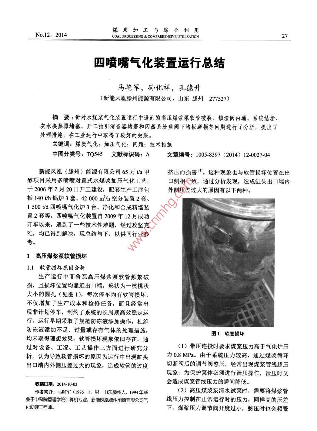 四噴嘴水煤漿氣化爐工業(yè)應(yīng)用情況簡(jiǎn)介 2020-03-23