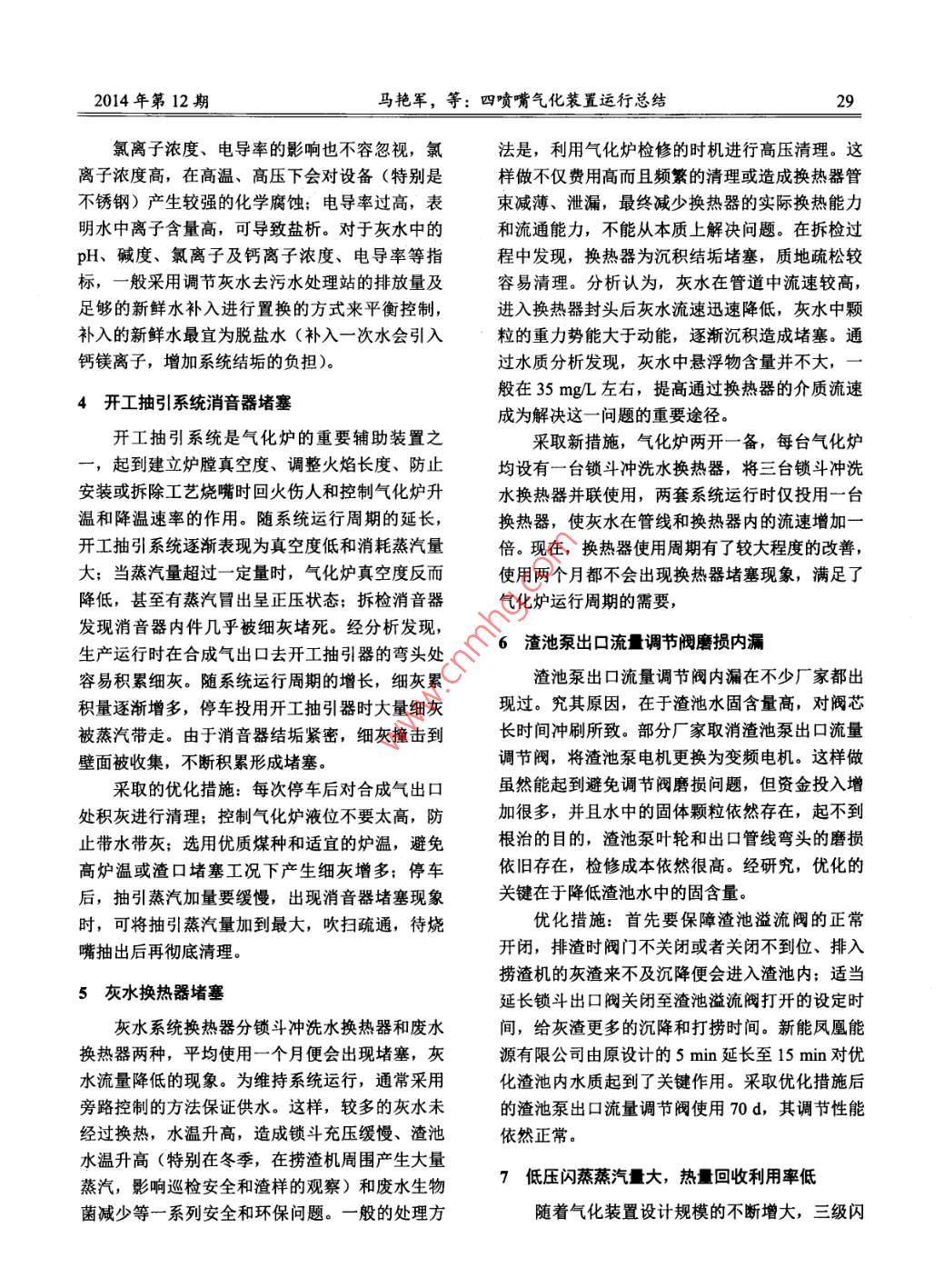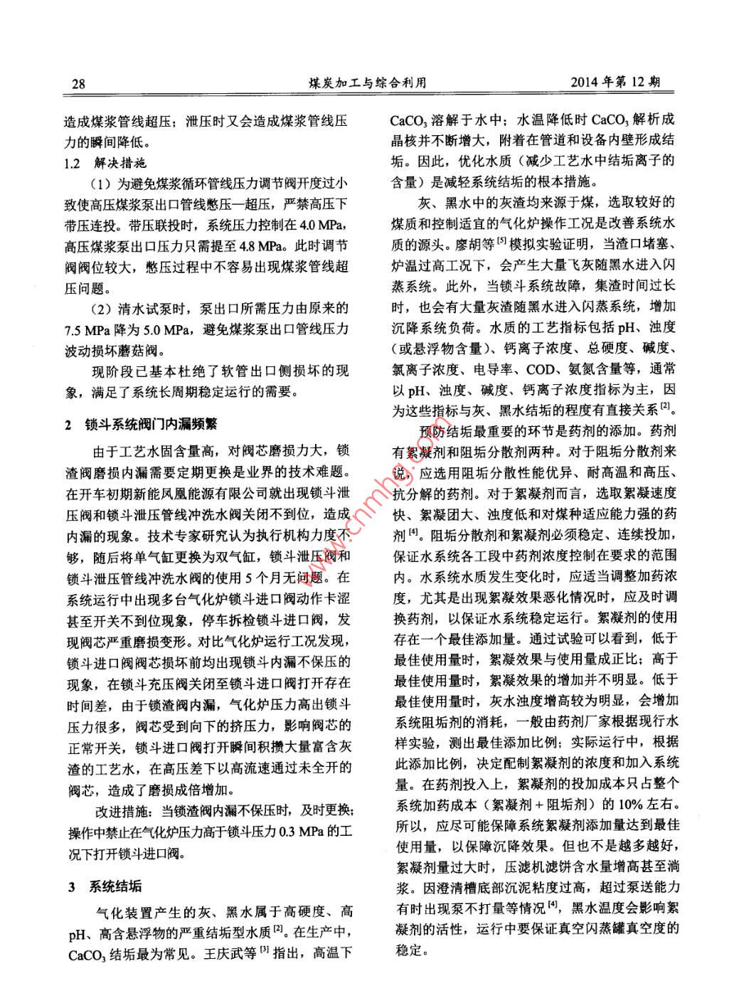 No.12,2014煤炭加工與綜合利用 COAL PROCESSING COMPREHENSIVE UTILIZATION27四噴嘴氣化裝置運(yùn)行總結(jié)馬艷軍,孫化祥,孔德升(新能鳳凰滕州能源有限公司,山東滕州277527)摘要:針對(duì)水煤漿氣化裝置運(yùn)行中遇到的高壓煤漿泵軟管破裂、鎖渣閥內(nèi)漏、系統(tǒng)結(jié)垢、灰水換熱器堵塞、開(kāi)工抽引消音器堵塞和閃蒸系統(tǒng)角閥下堵板磨損等問(wèn)題進(jìn)行了分析,提出了處理措施,在工業(yè)運(yùn)行中取得了較好的效果。關(guān)鍵詞:煤炭氣化;加壓氣化;問(wèn)題;技術(shù)措施中圖分類號(hào):TQ545文獻(xiàn)標(biāo)識(shí)碼:A文章編號(hào):1005-8397(2014)12-0027-04新能鳳凰(滕州)能源有限公司65萬(wàn)ta甲擠壓而損害這種現(xiàn)象也與軟管損壞位置在出醇項(xiàng)目采用多噴嘴對(duì)置式水煤漿加壓氣化工藝,口側(cè)相一致。通過(guò)分析發(fā)現(xiàn),造成缸頭出口端內(nèi)于2006年7月20日開(kāi)工建設(shè),配套生產(chǎn)工序包外側(cè)壓差過(guò)大的原因有以下兩種。括140th鍋爐3套、42000m3h空分裝置2套、1500td四噴嘴氣化爐3臺(tái)、凈化和合成精餾裝置2套等。四噴嘴氣化裝置自2009年12月成功開(kāi)車以來(lái),遇到了一些技術(shù)性難題,經(jīng)過(guò)攻堅(jiān)克難,均已得到解決,現(xiàn)總結(jié)與下,以供同行業(yè)參考。1高壓煤漿泵軟管損壞1.1軟管損壞原因分析生產(chǎn)運(yùn)行中菲魯瓦高壓煤漿泵軟管頻繁破損,且損壞位置均靠近出口端,形狀為一核桃狀大小的圓孔(見(jiàn)圖1),每次停車均有軟管損壞,不僅增加了生產(chǎn)成本和檢修任務(wù),而且經(jīng)常出現(xiàn)非計(jì)劃停車,制約了系統(tǒng)的長(zhǎng)周期高效穩(wěn)定運(yùn)行。運(yùn)行早期采取了規(guī)范防凍液添加操作,杜絕防凍液添加不足、過(guò)量或存有氣體的處理措施,圖1軟管損壞均未取得理想效果,軟管損壞現(xiàn)象依舊存在。通過(guò)對(duì)設(shè)備、工況、工藝操作三方面進(jìn)行研究分(1)帶壓連投時(shí)要求煤漿壓力高于氣化爐壓析,認(rèn)為導(dǎo)致軟管損壞的原因?yàn)檫\(yùn)行中出現(xiàn)缸頭力.ma由于系統(tǒng)壓力較高,通過(guò)煤漿循環(huán)出口端內(nèi)外側(cè)壓差過(guò)大的現(xiàn)象,造成軟管的過(guò)度切斷閥后的調(diào)節(jié)閥憋壓,經(jīng)常出現(xiàn)煤漿管線超壓現(xiàn)象;為保護(hù)泵體必須進(jìn)行泄壓操作,泄壓時(shí)又收稿日期:2014-10-03會(huì)造成煤漿管線壓力的瞬間降低。作者簡(jiǎn)介:馬艷軍(1976一),男,山東滕州人,1994年畢(2)高壓煤漿泵清水試泵時(shí),需要將煤漿管業(yè)于中科院管理學(xué)院計(jì)算機(jī)專業(yè),新能鳳凰滕州能源有限公司氣線壓力控制在正常運(yùn)行時(shí)的壓力,同樣高的壓差化助理工程師下,煤漿壓力調(diào)節(jié)閥開(kāi)度過(guò)小,憋壓時(shí)也會(huì)頻繁28煤炭加工與綜合利用2014年第12期造成煤漿管線超壓;泄壓時(shí)又會(huì)造成煤漿管線壓caco3溶解于水中水溫降低時(shí)CaCO3解析成力的瞬間降低。晶核并不斷增大,附著在管道和設(shè)備內(nèi)壁形成結(jié)1.2解決措施垢。因此,優(yōu)化水質(zhì)(減少工藝水中結(jié)垢離子的(1)為避免煤漿循環(huán)管線壓力調(diào)節(jié)閥開(kāi)度過(guò)小含量)是減輕系統(tǒng)結(jié)垢的根本措施致使高壓煤漿泵出口管線憋壓一超壓,嚴(yán)禁高壓下灰、黑水中的灰渣均來(lái)源于煤,選取較好的帶壓連投。帶壓聯(lián)投時(shí),系統(tǒng)壓力控制在4.0MPa,煤質(zhì)和控制適宜的氣化爐操作工況是改善系統(tǒng)水高壓煤漿泵出口壓力只需提至4.8MPa。此時(shí)調(diào)節(jié)質(zhì)的源頭。廖胡等模擬實(shí)驗(yàn)證明,當(dāng)渣口堵塞、閥閥位較大,憋壓過(guò)程中不容易出現(xiàn)煤漿管線超爐溫過(guò)高工況下,會(huì)產(chǎn)生大量飛灰隨黑水進(jìn)入閃壓?jiǎn)栴}。蒸系統(tǒng)。此外,當(dāng)鎖斗系統(tǒng)故障,集渣時(shí)間過(guò)長(zhǎng)(2)清水試泵時(shí),泵出口所需壓力由原來(lái)的時(shí),會(huì)有大量灰渣隨黑水進(jìn)入閃蒸系統(tǒng),增加7.5Ma降為5.0MPa,避免煤漿泵出口管線壓力沉降系統(tǒng)負(fù)荷水質(zhì)的工藝指標(biāo)包括pH、濁度波動(dòng)損壞蘑菇閥。(或懸浮物含量)、鈣離子濃度、總硬度、堿度、現(xiàn)階段已基本杜絕了軟管出口側(cè)損壞的現(xiàn)氯離子濃度、電導(dǎo)率、COD、氨氮含量等,通常象,滿足了系統(tǒng)長(zhǎng)周期穩(wěn)定運(yùn)行的需要。以pH、濁度、堿度、鈣離子濃度指標(biāo)為主,因?yàn)檫@些指標(biāo)與灰、黑水結(jié)垢的程度有直接關(guān)系2鎖斗系統(tǒng)閥門內(nèi)漏頻繁預(yù)防結(jié)垢最重要的環(huán)節(jié)是藥劑的添加。藥劑由于工藝水固含量高,對(duì)閥芯磨損力大,鎖有絮凝劑和阻垢分散劑兩種。對(duì)于阻垢分散劑來(lái)渣閥磨損內(nèi)漏需要定期更換是業(yè)界的技術(shù)難題。說(shuō),應(yīng)選用阻垢分散性能優(yōu)異、耐高溫和高壓、在開(kāi)車初期新能鳳凰能源有限公司就出現(xiàn)鎖斗泄抗分解的藥劑。對(duì)于絮凝劑而言,選取絮凝速度壓閥和鎖斗泄壓管線沖洗水閥關(guān)閉不到位,造成快、絮凝團(tuán)大、濁度低和對(duì)煤種適應(yīng)能力強(qiáng)的藥內(nèi)漏的現(xiàn)象。技術(shù)專家研究認(rèn)為執(zhí)行機(jī)構(g