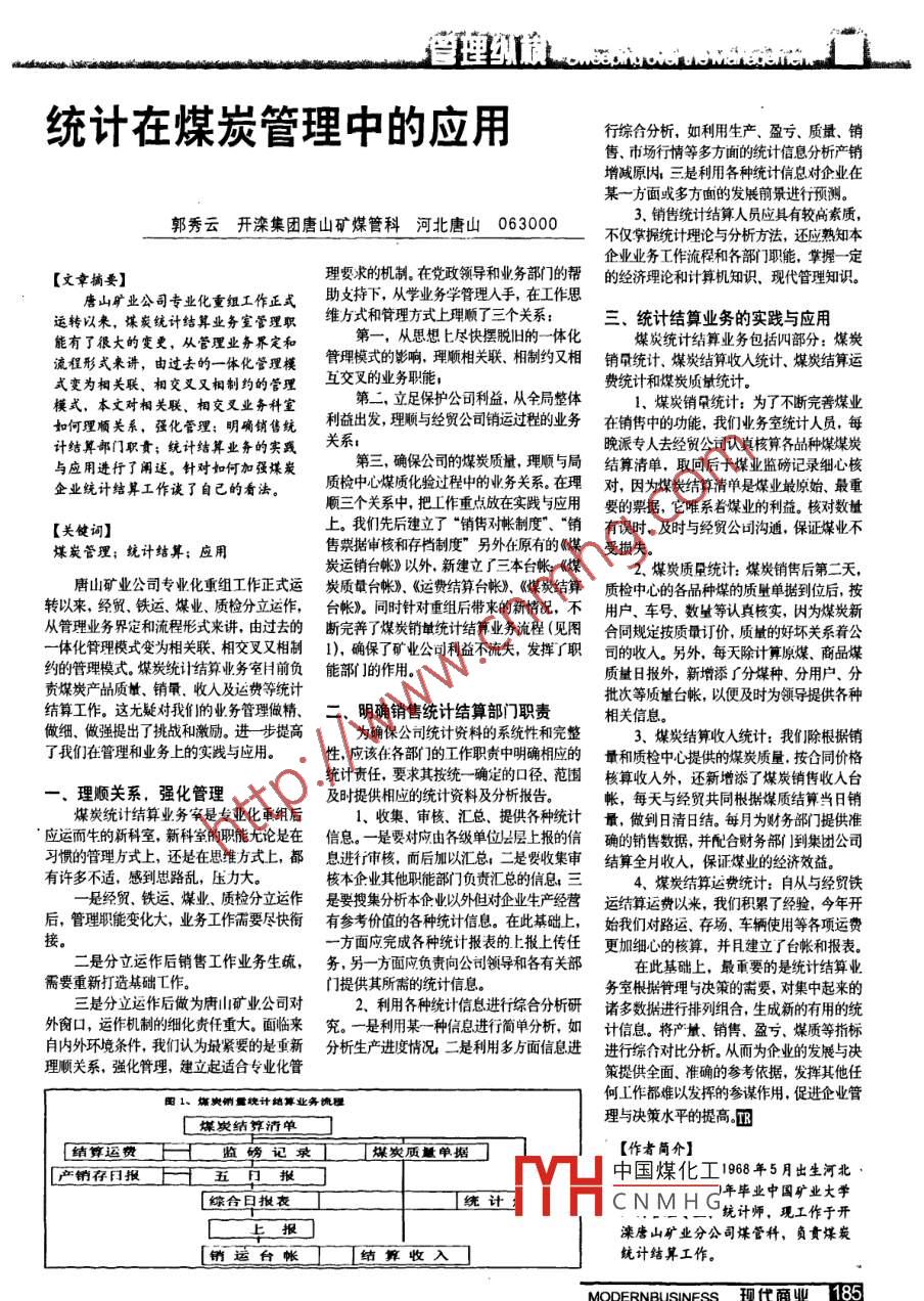 行綜合分析,如利用生產(chǎn)、盈虧.質(zhì)量.銷統(tǒng)計(jì)在煤炭管理中的應(yīng)用售市場行情等多方面的統(tǒng)計(jì)信息分析產(chǎn)銷增減原內(nèi):三是利用各種統(tǒng)計(jì)信息對企業(yè)在某~方面或多方面的發(fā)展前景進(jìn)行預(yù)測。郭秀云開灤集團(tuán)唐山礦煤管科 河北唐山 0630003.銷售統(tǒng)計(jì)結(jié)算人員應(yīng)具有較高素質(zhì),不僅掌據(jù)統(tǒng)計(jì)理論與分析方法,還應(yīng)熟知本企業(yè)業(yè)務(wù)工作流程和各部門職能,掌握- -定[文章摘要]理要求的機(jī)制。在黨政領(lǐng)導(dǎo)和業(yè)務(wù)部門的幫的經(jīng)濟(jì)理論和計(jì)算機(jī)知識、 現(xiàn)代管理知識。唐山礦業(yè)公司專業(yè)化重組工作正式助支持下,從學(xué)業(yè)務(wù)學(xué)管理人手,在工作思運(yùn)轉(zhuǎn)以來,煤炭統(tǒng)計(jì)結(jié)算業(yè)務(wù)室管理職維萬5式和管理方式上理順了三個(gè)關(guān)系:三、統(tǒng)計(jì)結(jié)算業(yè)務(wù)的實(shí)踐與應(yīng)用能有了很大的變更,從管理業(yè)務(wù)界定和第一,從思想上盡快擺脫舊的-體化煤炭統(tǒng)計(jì)結(jié)算業(yè)務(wù)包括四部分:煤炭流程形式來講,由過去的一體化管理模管理模式的影響,理順相關(guān)聯(lián).相制約又相銷量統(tǒng)計(jì)、 煤炭結(jié)算收入統(tǒng)計(jì),煤炭結(jié)算運(yùn)式變?yōu)橄嚓P(guān)聯(lián)、相交叉又相制約的管理互交叉的業(yè)務(wù)職能,費(fèi)統(tǒng)計(jì)和煤炭質(zhì)量統(tǒng)計(jì)。模式,本文對相關(guān)聯(lián)、相交叉業(yè)務(wù)科室第二,立足保護(hù)公司利益,從全局整體、煤炭銷朵統(tǒng)計(jì):為了不斷完善煤業(yè)如何理順關(guān)系,強(qiáng)化管理;明確銷售統(tǒng)利益出發(fā),理順與經(jīng)貿(mào)公司銷運(yùn)過程的業(yè)務(wù)在銷售中的功能,我們業(yè)務(wù)室統(tǒng)計(jì)人員,每計(jì)結(jié)算部門職責(zé);統(tǒng)計(jì)結(jié)算業(yè)務(wù)的實(shí)踐關(guān)系;第三,確保公司的煤炭質(zhì)量,理順與局結(jié)算清單, 取回后十煤業(yè)監(jiān)磅記錄細(xì)心核晚派專人去經(jīng)貿(mào)公司認(rèn)真核算齊品種煤煤炭與應(yīng)用進(jìn)行了闌述。針對如何加強(qiáng)煤炭企業(yè)統(tǒng)計(jì)結(jié)算工作談了自己的看法。質(zhì)檢中心煤質(zhì)化驗(yàn)過程中的業(yè)務(wù)關(guān)系。在理對, 因?yàn)槊禾拷Y(jié)算清單是煤業(yè)最原始、最重順三個(gè)關(guān)系中,把工作重點(diǎn)放在實(shí)踐與應(yīng)用要的票據(jù), 它唯系若媒業(yè)的利益。核對數(shù)量[關(guān)鍵詞]上。我們先后建立了“銷偉對帳制度"、“銷有誤時(shí),及時(shí)與經(jīng)貿(mào)公司溝通,保證煤業(yè)不煤炭管理;統(tǒng)計(jì)結(jié)算;應(yīng)用售票據(jù)審核和存檔制度”另外在原有的《煤受損失。炭運(yùn)銷臺帳》以外,新建立了三本臺帳《煤2.煤炭質(zhì)量統(tǒng)計(jì):煤炭銷售后第二天,唐山礦業(yè)公司專北化重組工作正式運(yùn)炭質(zhì)最臺帳). 《運(yùn)費(fèi)結(jié)算臺帳》、《煤炭結(jié)算質(zhì)檢中心的各品種煤的質(zhì)量單據(jù)到位后, 按轉(zhuǎn)以來,經(jīng)貿(mào)。鐵運(yùn)、煤業(yè)、質(zhì)檢分立運(yùn)作,臺帳)。 同時(shí)針對重組后帶來的新情況,不用戶、 號、數(shù)量等認(rèn)真核實(shí),因?yàn)槊禾啃聫墓芾順I(yè)務(wù)界定和流程形式來講,由過去的斷完善 了煤炭銷量統(tǒng)計(jì)結(jié)算業(yè)務(wù)流程(見圖合同規(guī)定按質(zhì)最訂價(jià),質(zhì)量的好壞關(guān)系著公-體化管理模式變?yōu)橄嚓P(guān)聯(lián).相交叉又相制1), 確保了礦業(yè)公司利益不流失,發(fā)揮了職司的收人。另外,每天除計(jì)算原煤、商品煤約的管理模式。煤炭統(tǒng)計(jì)結(jié)算業(yè)務(wù)室目前負(fù)能部i ]的作用。質(zhì)量日報(bào)外,新增添了分煤種、分用戶、分責(zé)煤炭產(chǎn)品質(zhì)量、銷氧.收人及運(yùn)費(fèi)等統(tǒng)計(jì)批次等質(zhì)量臺帳,以便及時(shí)為領(lǐng)導(dǎo)提供各種結(jié)算工作。這尤疑對我們的業(yè)務(wù)管理做精、二. 明確銷售統(tǒng)計(jì)結(jié)算部門職責(zé)相關(guān)信息。做細(xì)、做強(qiáng)提出了挑戰(zhàn)和激勵(lì)。進(jìn)步提高為確保公可統(tǒng)計(jì)資料的系統(tǒng)性和完整3.煤炭結(jié)算收入統(tǒng)計(jì):我們]除根據(jù)銷了我們在管理和業(yè)務(wù)上的實(shí)踐與應(yīng)用。性,應(yīng)該任各部[ ]的工作職責(zé)中明確相應(yīng)的量和質(zhì)檢中心提供的煤炭質(zhì)量. 按合同價(jià)格統(tǒng)計(jì)責(zé)任,要求其按統(tǒng)一確定的口徑范圍核算收入外, 還新增添了煤發(fā)銷售收人臺-.理順關(guān)系,強(qiáng)化管理及時(shí)提供相應(yīng)的統(tǒng)計(jì)資料及分析報(bào)告。帳,每天與經(jīng)貿(mào)共同根據(jù)煤質(zhì)結(jié)算當(dāng)日銷煤炭統(tǒng)計(jì)結(jié)算業(yè)務(wù)室是專業(yè)化重組后.1、收集、審核、匯總提供各種統(tǒng)計(jì) 最,做到日清日結(jié)。每月為財(cái)務(wù)部門提供準(zhǔn): 應(yīng)運(yùn)而生的新科室,新科室的職能尤論是在 信息。一是要對應(yīng)由齊級單位公層上報(bào)的信 確的銷售數(shù)據(jù),并院合財(cái)務(wù)刪到集團(tuán)公司習