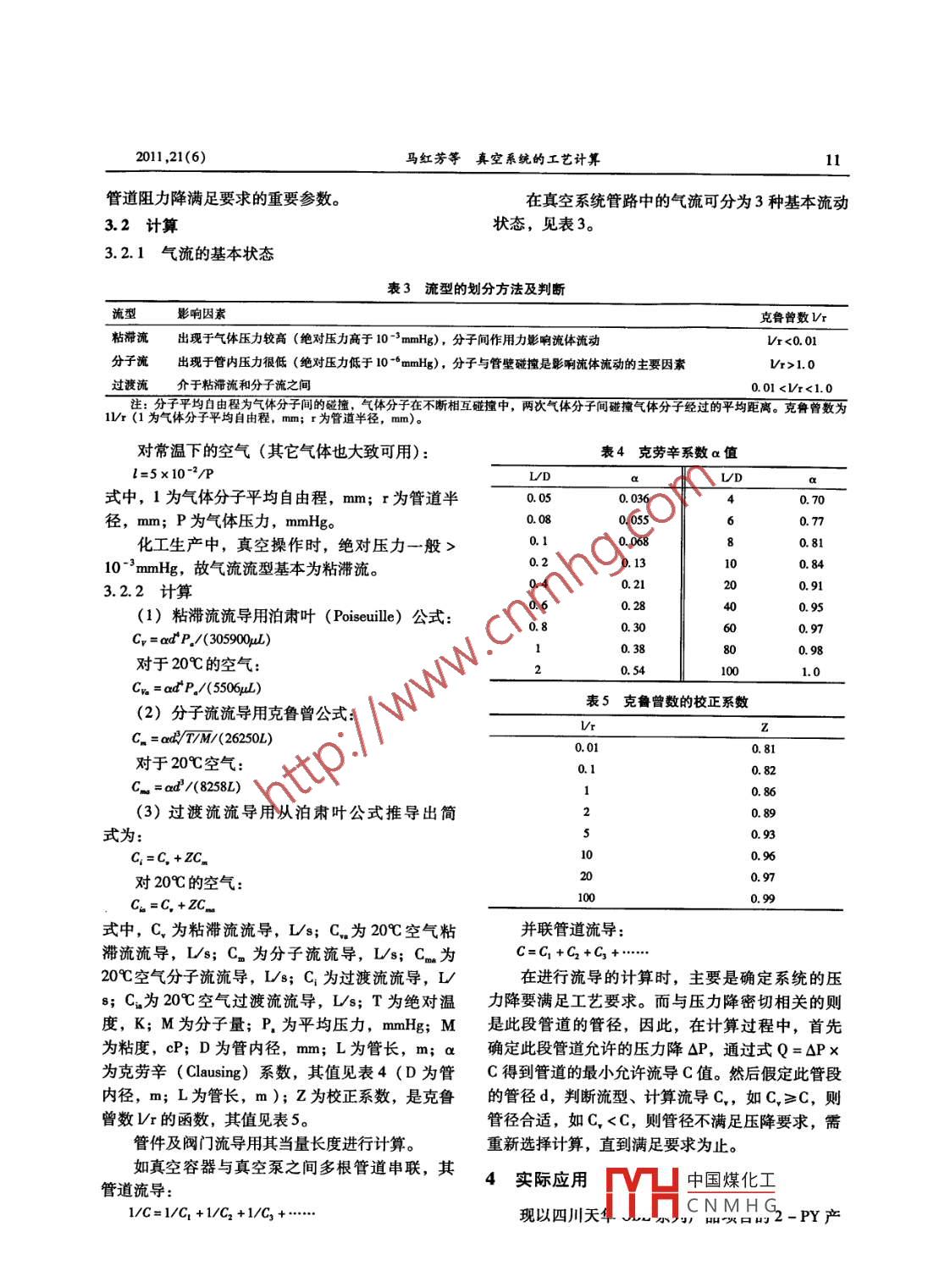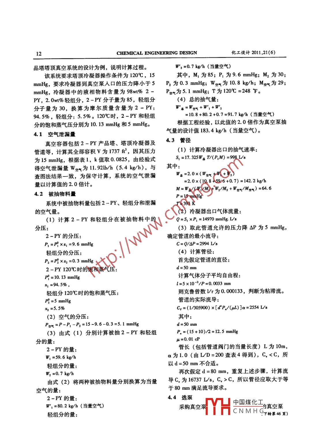2011,21(6)馬紅芳等真空系統(tǒng)的工藝計(jì)算真空系統(tǒng)的工藝計(jì)算馬紅芳·駱彩萍鮑賢康華陸工程科技有限責(zé)任公司西安710065摘要介紹抽氣量、壓降等真空系統(tǒng)的工藝計(jì)算方法和結(jié)合工程的實(shí)際應(yīng)用。關(guān)鍵詞真空系統(tǒng)抽氣量當(dāng)量空氣流導(dǎo)工藝計(jì)算化工生產(chǎn)裝置中,真空系統(tǒng)主要應(yīng)用于精餾、W=kx v3過濾、千燥、脫水等工藝過程。真空系統(tǒng)所要達(dá)式中,W2為空氣泄漏量,B/h;V為真空系統(tǒng)的到的真空度是通過真空泵來實(shí)現(xiàn)的影響真空度容積,m;k為壓力常數(shù),取值見表1。的因素除了真空泵的性能外,系統(tǒng)的空氣泄漏量表1k取值工藝氣量和系統(tǒng)的壓力損失等亦是非常關(guān)鍵的。所以在真空系統(tǒng)的工藝計(jì)算過程中,要充分考慮壓力(mmHg)>900.1940.08250.05080.0254上述影響因素,做到系統(tǒng)設(shè)計(jì)完善、可靠、經(jīng)濟(jì)。1真空系統(tǒng)的組成(2)對(duì)應(yīng)于上式,最大空氣泄漏量見圖2。圖中為絕對(duì)壓力,英制和公制分別見圖2(a)和(b)。真空系統(tǒng)通常由真空泵、真空容器及真空管道組成,典型流程見圖1Q P1 SI真空管道真空泵真空容器圖1真空系統(tǒng)典型流程圖2真空系統(tǒng)的設(shè)計(jì)基礎(chǔ)系統(tǒng)體積(f3)2.1抽氣量抽氣量是真空泵的重要參數(shù),在化工生產(chǎn)中,真空容器的被抽氣量主要是指空氣泄漏量與被抽出的工藝氣之和。21.1空氣泄漏量3在抽真空過程中,因管件、設(shè)備密封性能等因素的影響,不能保證系統(tǒng)完全密閉,總是有空氣泄漏入真空系統(tǒng),對(duì)任何真空系統(tǒng)都應(yīng)進(jìn)行試驗(yàn)以確定其空氣泄漏量,對(duì)新設(shè)計(jì)和不能進(jìn)行試00.20.3驗(yàn)的場(chǎng)合采用估算,目前主要有以下幾種方法。系統(tǒng)容積(m3)(1)對(duì)于工業(yè)上嚴(yán)密系統(tǒng)的空氣泄漏量,經(jīng)驗(yàn)公式如下:圖2工業(yè)上嚴(yán)密系統(tǒng)最大空氣泄漏量值中國煤化工·馬紅芳:工程師。200年畢業(yè)于太原理工大學(xué)工業(yè)催化專業(yè)獲碩士學(xué)位。一直從事化CNMHG話:(09)87988636, E-mail: mh2078@ chinahualueng comoCHEMICAL ENGINEERING DESIGN化工設(shè)計(jì)2011,21(6)(3)管件的空氣泄漏量的估算見表2。氣的分子量;P料為物料蒸氣的分壓,mmHg;表2真空系統(tǒng)管件的空氣泄漏量估算表(kgh)P絲氣為空氣的分壓, mmHg管件類型估算的平均空氣泄漏量設(shè)計(jì)和選擇真空泵時(shí),需要將工藝物料氣量2以下的螺紋連接0.045換算為當(dāng)量空氣量,其換算公式如下:2"以上的螺紋連接0.091W當(dāng)量空氣=0.375W物ln(M物/2)[1-0.000(7-70)]6以下的法蘭連接0.227(2)6-24“包括人孔在內(nèi)的法蘭連接0.363式中,T為被抽物料的溫度,F。24"以上的法蘭連接0.499-0.907桿直徑在1/2″以下的填料閥將上述氣體的流量相加,即得真空容器的總閥桿直徑在12"以上的填料閥抽氣量(當(dāng)量空氣):具有潤滑的旋塞排放旋塞0.091在此,應(yīng)特別注意單位的換算和公式及圖表玻璃視鏡0.454要求的單位對(duì)應(yīng)關(guān)系。玻璃液面計(jì)包括液面計(jì)旋塞0.907攪拌器軸、泵等封液填料函,以每英3真空管道的流導(dǎo)寸軸直徑計(jì)普通填料函,以每英寸軸直徑計(jì)在選擇真空泵時(shí),除真空容器被抽氣量外,安全閥或破真空的設(shè)施,以每英寸計(jì)0.454另一重要參數(shù)為真空泵的抽氣壓力,其大小決定對(duì)于真空容器,一般保守估算時(shí)采用(1)法著系統(tǒng)的真空度。真空泵入口的壓力應(yīng)根據(jù)工藝計(jì)算值,或(2)法的查圖值,再加上(3)法所容器的真空度要求和真空容器與真空泵之間管道得管件泄漏量之值?;蛘?采用(1)法計(jì)算值或的壓力降來確定。為使真空管道的壓力降在允許(2)法查圖值的兩倍,即得該真空系統(tǒng)的空氣泄的范圍內(nèi),必須核算管道的管徑。此處采用真空管道流導(dǎo)來核算管徑,現(xiàn)以圖1中真空容器出口漏量。對(duì)于帶有采用普通軸封的攪拌器,其空氣泄(1點(diǎn))與真空泵入口(2)之間的管道為例計(jì)算。漏量應(yīng)為每個(gè)攪拌器增加5b/h(2.27kg/h),如3.1定義14采用特殊良好密封,此值可為1~2l/h(0.45抽氣速率S1是指單位時(shí)間內(nèi)真空泵在其人口0.90kg/h)。壓力下從系統(tǒng)中抽走的氣體體積,其計(jì)算式如下2.12被抽出的工藝物料氣量S2=17.325Wa7/(P2M化工生產(chǎn)中,真空容器被抽氣體除泄漏的空式中,S2為真空系統(tǒng)2點(diǎn)處抽氣速率,Ls;P2為氣外,主要還包括工藝生產(chǎn)過程中產(chǎn)生與系統(tǒng)中真空系統(tǒng)2點(diǎn)處的壓力,mmHg;T為被抽氣體的的液體處于平衡狀態(tài)的物料蒸氣。物料蒸氣量的溫度,K;M為被抽氣體的平均分子量。計(jì)算如下:真空泵的氣體流量Q為入口抽氣速率與人口由拉烏爾定律2可知,對(duì)于混合溶液中的某壓力之積。組分,其在氣相中的分壓為:真空系統(tǒng)某點(diǎn)的抽氣速率與氣體流量的P,=P x關(guān)系式中,P1為各組分的分壓,mmHg;P為純物質(zhì)的Q=S1×P1=S2XP2飽和蒸氣壓,mmHg;x1為液體中各組分的摩爾式中,Q為氣體流量, mmHg Ls;S1為真空系統(tǒng)分?jǐn)?shù)。1點(diǎn)處抽氣速率,Ls;P1為真空系統(tǒng)1點(diǎn)處的壓由上式可得出:被抽氣體中,物料蒸氣的分力, mmHg壓P料=∑P,抽真空時(shí),真空容器的絕對(duì)壓力P真空系
