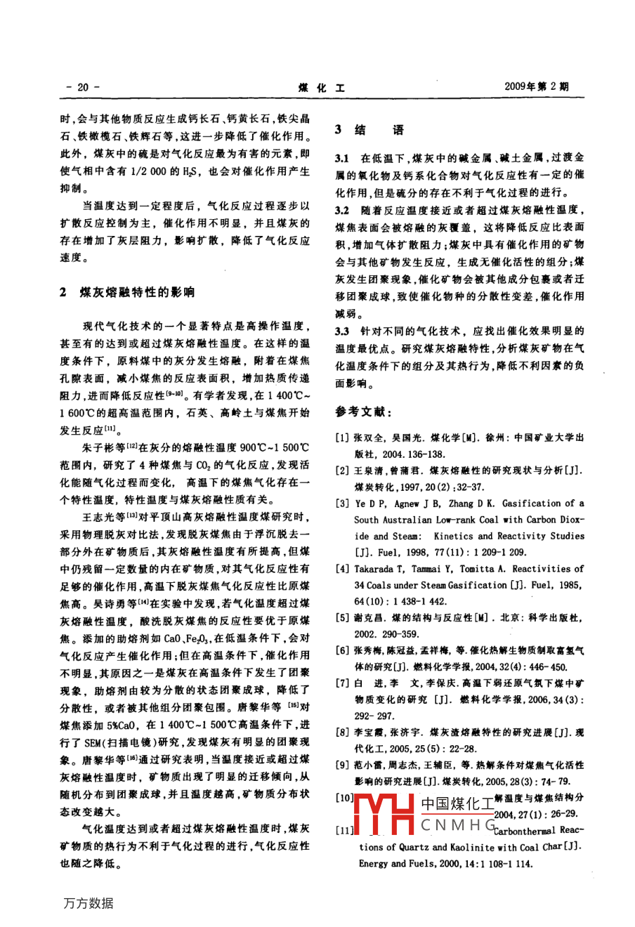 第2期(總第141期)o2(Total No 141)2009年4月Coal Chemical IndustryApr.2009煤灰對(duì)氣化反應(yīng)性的影響谷小虎1曹敏2王蘭甫2田亞鵬(1河南理工大學(xué)焦作454000;2.義馬煤業(yè)集團(tuán)股份有限公司,義馬472300)摘要討論了煤灰在氣化過程中對(duì)氣化反應(yīng)性的影響,主要為:在低溫下,某些礦物組分對(duì)氣化過程有催化作用,但在高溫下,礦物發(fā)生變化,會(huì)生成無催化活性的組分;當(dāng)氣化溫度接近或超過煤灰熔融性溫度時(shí),煤灰發(fā)生熔融甚至團(tuán)聚,導(dǎo)致反應(yīng)比表面積降低,催化礦物分散性變差,影響氣化反應(yīng)性。關(guān)鍵詞煤灰氣化反應(yīng)性催化作用煤灰熔融特性文章編號(hào):10059598(2009)01-001903中圖分類號(hào):TQ54文獻(xiàn)標(biāo)識(shí)碼:AK+cO2Na+CO2→Na2O+C0Na+C→2NatC0過渡金屬同樣也具有催化作用,如鐵系氧化物,煤氣化反應(yīng)性是影響煤氣化過程的關(guān)鍵因素,經(jīng)過研究認(rèn)為鐵的催化反應(yīng)存在下列過程反應(yīng)性的強(qiáng)弱直接影響煤在氣化爐內(nèi)反應(yīng)的快慢、FeO+COQ2→Fe20=1+C0FenO+C→Fe0+C0(3)完成程度、耗氧量、耗煤量以及煤氣中有效成分的含鈣系化合物在氣化過程中的催化機(jī)理,學(xué)者們量山。我國(guó)普遍采用煤或煤焦與CQ2反應(yīng)后的CO2還認(rèn)為CaCO3會(huì)與煤表面的羧基發(fā)生離子交換,形成原率作為反應(yīng)性的評(píng)價(jià)指標(biāo)。通常以氧化物的形式來(C00)Ca,這種結(jié)構(gòu)會(huì)提高反應(yīng)速率。反應(yīng)機(jī)理表示煤灰的組成,通過化學(xué)分析可知,煤灰由SiQ2、如下:A1A3、Ca0、Mg0、Na20K0、Ti02和S03等組分構(gòu)成2。本Ca2+2(000)→(-C0)2Ca+2H(4)文主要討論煤灰對(duì)氣化反應(yīng)性的影響。氧化鈣的催化過程如下5ca0+CO2→Capn1+C0cao1+C→Ca0C0(5)煤灰某些組分的催化作用張秀梅等在對(duì)幾種金屬氧化物的催化作用進(jìn)行比較后認(rèn)為,CrO3擁有良好的催化性能。其催化機(jī)煤中的灰分在氣化過程中具有催化作用,會(huì)降低理如下:氣化反應(yīng)的活化能。D.P.Ye等(研究南澳大利亞低Cr3+CO2→Cr20+C0cr04+C→CrO+C0(6)煤階煤時(shí)發(fā)現(xiàn),其反應(yīng)性遠(yuǎn)比其他煤種強(qiáng),但經(jīng)過酸不同氣化技術(shù)的操作溫度也不盡相同,如流化床洗除灰后,其反應(yīng)性之間的差異已變得很小,他認(rèn)為采用800℃-1100℃,氣流床采用1300℃-1700℃這是由煤中含有的固有礦物質(zhì)所造成的。日本學(xué)者而煤灰中的礦物質(zhì)在高溫下的變化較為復(fù)雜,除了礦T. Takarada等認(rèn)為煤焦的反應(yīng)性與其富含的無機(jī)物質(zhì)的熔融外,礦物質(zhì)組分之間還會(huì)形成低溫共熔物含量有關(guān)。煤中起催化作用的主要是堿金屬和堿土體,生成新的物質(zhì),這些變化對(duì)于催化反應(yīng)有著重要金屬,一般認(rèn)為K的效果最好,其次為Na。其催化機(jī)影響理如下式溫度超過850℃時(shí),會(huì)發(fā)生如下反應(yīng)10FeS+2S2+2l02→2Fe2O3+2Fe04+14s02基金項(xiàng)目:義馬煤業(yè)集團(tuán)股份有限公司2008年重點(diǎn)科研項(xiàng)目(No.2008018)。中國(guó)煤化工作用,但同時(shí)堿性收稿日期:200901-1催化CNMH(化物發(fā)生共熔生作者簡(jiǎn)介:谷小虎(1984)男,2007年畢業(yè)于河南理工成新的復(fù)雜硅酸鹽復(fù)合物,如Na0·A1O3·2SiQ2),則大學(xué),在讀碩士研究生,從事煤氣化方向的研究。會(huì)大大降低催化作用。Ca0、Fe0在溫度超過1300℃煤化工2009年第2期時(shí),會(huì)與其他物質(zhì)反應(yīng)生成鈣長(zhǎng)石、鈣黃長(zhǎng)石,鐵尖晶石、鐵橄欖石、鐵輝石等,這進(jìn)一步降低了催化作用。3結(jié)此外,煤灰中的硫是對(duì)氣化反應(yīng)最為有害的元素即31在低溫下,煤灰中的堿金屬、堿土金屬,過渡金使氣相中含有1200的BS,也會(huì)對(duì)催化作用產(chǎn)生屬的氧化物及鈣系化合物對(duì)氣化反應(yīng)性有一定的催抑制?;饔?但是硫分的存在不利于氣化過程的進(jìn)行。當(dāng)溫度達(dá)到一定程度后,氣化反應(yīng)過程逐步以32隨著反應(yīng)溫度接近或者超過煤灰熔融性溫度,擴(kuò)散反應(yīng)控制為主,催化作用不明顯,并且煤灰的煤焦表面會(huì)被熔融的灰覆盞,這將降低反應(yīng)比表面存在增加了灰層阻力,影響擴(kuò)散,降低了氣化反應(yīng)積,增加氣體擴(kuò)散阻力;煤灰中具有催化作用的礦物會(huì)與其他礦物發(fā)生反應(yīng),生成無催化活性的組分;煤灰發(fā)生團(tuán)聚現(xiàn)象,催化礦物會(huì)被其他成分包裹或者遷2煤灰熔融特性的影響移團(tuán)聚成球,致使催化物種的分散性變差,催化作用減弱。現(xiàn)代氣化技術(shù)的一個(gè)顯著特點(diǎn)是高操作溫度3.3針對(duì)不同的氣化技術(shù),應(yīng)找出催化效果明顯的甚至有的達(dá)到或超過煤灰熔融性溫度。在這樣的溫溫度最優(yōu)點(diǎn)。研究煤灰熔融特性,分析煤灰礦物在氣度條件下,原料煤中的灰分發(fā)生熔融,附著在煤焦化溫度條件下的組分及其熱行為降低不利因素的負(fù)孔隙表面,減小煤焦的反應(yīng)表面積,增加熱質(zhì)傳遞面影響。阻力,進(jìn)而降低反應(yīng)性。有學(xué)者發(fā)現(xiàn),在1400℃1600℃的超高溫范圍內(nèi),石英、高嶺土與煤焦開始參考文獻(xiàn):發(fā)生反應(yīng)[1]張雙全,吳國(guó)光.煤化學(xué)[M].徐州:中國(guó)礦