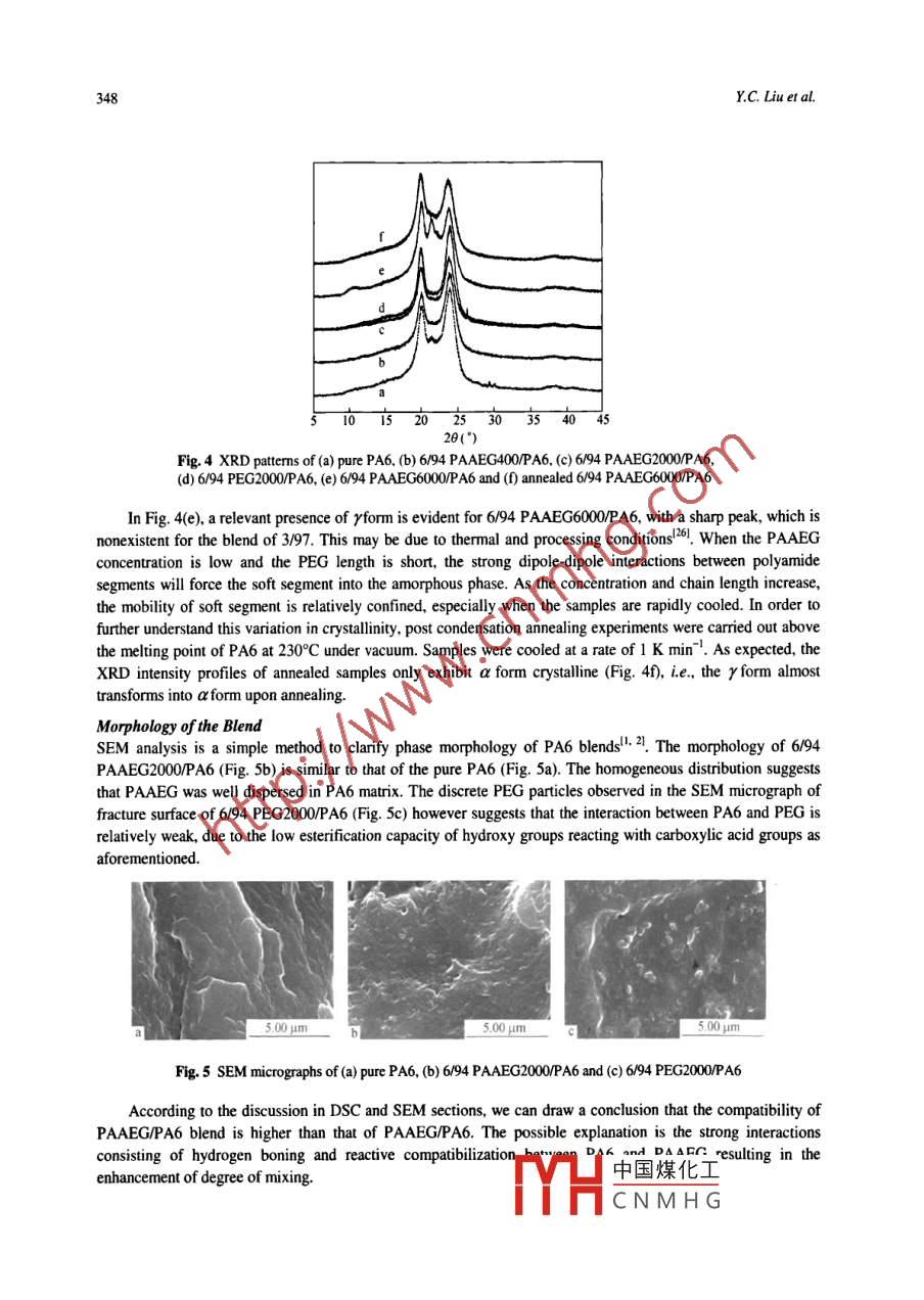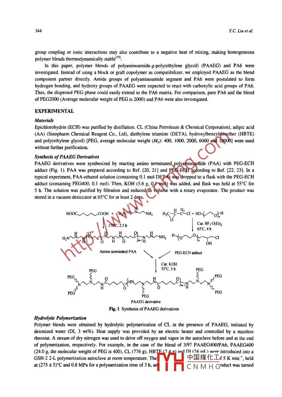 Chinese Joumal of Polymer Science Vol. 27, No. 3, (2009), 343-350Chinese Journal ofPolymer Science02009 World ScientifieMODIFICATION OF POLYAMIDE 6 WITH POLYAMINOAMIDE-g-POLY(ETHYLENE GLYCOL) VIA HYDROLYTIC POLYMERIZATIONYao-chi Liu*b, Wei Xu", Yuan-qin Xiong", Fan Zhang" and Wei-jian Xu"'Institute of Polymer Science & Engineering, Hunan University, Changsha 410082, ChinaCollege of Urban Construction, Nanhua Universiry, Hengyang 421001, ChinaAbstract To enhance the impact strength of polyamide 6. hydrolytic polymerization modification by the polyaminoamide-g-poly(ethylene glycol) (PAAEG) derivatives with poly(ethylene glycol) (PEG) molecular weight of 400-10000 was studied.Amide groups of polyaminoamide segments were postulated to form hydrogen bonding with polyamide 6, and hydroxygroups of PAAEG units were expected to react with carboxylic acid groups of polyamide 6 forming copolymers during thepolymerization. The improved compatibility in amorphous regions of blends has been confirmed by differential scanningcalorimetry (DSC) and scanning electron microscopy (SEM) of fracture surfaces. The efects of PAAEG on the waterabsorption and notch sensitivity of blends were investigated, using water uplake measurement and mechanical testings,respectively. For comparison, pure polyamide 6 and the blend of PEG/polyamide 6 were also invetigated. The addition ofPAAEG retarded the cytallization of polyamide 6, but did not make remarkable influences on is cystalline stucture. As aconsequence of the strong interactions between the dispersed phases and polyamide 6 matrices, PAAEG was a more suitableadditive for improving the notched impact strength of polyamide 6 than PEG.Keywords: Polyamidce 6; Polyaminoamide-8-polylethye gyco); Blends; Impact strength; Compaiblity.INTRODUCTIONPolymer blends have been extensively studied because of their simplicity, and many new products have beenmanufactured to achieve improved properties generally not available in any single polymeric materiall-y.Polyamide 6 (PA6) is a kind of widely used engineering plastics because of its chemical stability and goodfatiguel4-", but its usage is limited by notch sensitivity. Generally, the low temperature impact strength isimproved by random incorporation of rubber particles into the nylon 6 matrices. Polyether is the commonly usedrubber phase with low glass transition temperature and small domain sizel8. Polymer blends of PA6 and polyetherare immiscible because of the positive enthalpy change and the small increase of entropy on mixing. Therefore,the stabilization and enhancement of adhesion between the two phases is very important.PA6 can be prepared by hydrolytic or anionic polymerization of Ecaprolactam (CL)9!. A large number ofefforts were made to incorporate poly(ethylene glycol) (PEG) into PA6 by anionic polymerization. The block orgraft copolymers formed during anionic polymerization act as compatibilizers, which reduces the size ofdispersed phase and stabilizes the dispersed phasell0-14I. For hydrolytic polymerization, Fakirov et al. investigatedmultiblock poly(ether-ester-amide)s (PEEA) based on carboxyl-terminated PA6 oligomers and PEG by a two-step polycondensation reaction'5, 16. Deschamps et al. investigated PEEA copolymers based on PEG, 1,4butanediol and a diester- diamide monomerlt, 8. These chemical routes however didn't avoid the phaseseparation between polyamide and PEG because of low esterification capacities resulting in low yields ofcopolymer. As regards the poor miscibility of polymer pairs, hydrogen bonding, dipolar interactions, phenyl'This work was financially supported by the National Natural Scienc中國煤化工7008) and ChinaPetroleum & Chemical Corporation.“Corresponding author: Weijian Xu (徐偉箭), E-mail: polymer. groupT_HCNMHGReceived January 2, 2008; Revised February 23, 2008; Accepted Februaly大cwvo344Y.C. Liu et al.group coupling or ionic interactions may also contribute to a negative heat of mixing, making homogeneouspolymer blends thermodynamically stablell.In this paper, polymer blends of polyaminoamide-g-poly(ethylene glycol) (PAAEG) and PA6 wereinvestigated. Instead of using a block or graft copolymer as compatibilizer, we employed PAAEG as the blendcomponent partner directly. Amide groups of polyaminoamide segment and PA6 were postulated to formhydrogen bonding, and hydroxy groups of PAAEG were expected to react with carboxylic acid groups of PA6.Thus, the dispersed PEG phase could easily extend to the PA6 matrix. For comparison, pure PA6 and the blendof PEG2000 (Average molecular weight of PEG is 2000) and PA6 were also investigated.EXPERIMENTALMaterialsEpichlorohydrin (ECH) was purified by disillation. CL (China Petroleum & Chemical Corporation), adipic acid(AA) (Sinopharm Chemical Reagent Co., Ltd), diethylene triamine (DETA), hydroxylbenzylthioether (HBTE)and poly(ethylene glycol) [PEG, average molecular weight (M): 400, 1000, 2000, 6000 and 1000 were usedwithout further purification.Synthesis of PAAEG DerivativesPAAEG derivatives were synthesized by reacting amino terminated polyaminoamide (PAA) with PEG-ECHadduct (Fig. 1). PAA was prepared according to Ref. [20, 21] and PEG-ECH according to Ref. [22, 23]. In atypical experiment, PAA-ethanol solution (containing 0.1 mol DETA) was dropped to a flask with the PEG-ECHadduct (containing PEG400, 0.1 mol). Then, KOH (5.6 g, 0.1 mol) was added, and flask was held at 559C for5 h. The solution was purified by filtration and reduced in volume with a rotary evaporator. The product wasstored in a vacuum desiccator at 65°C for at least 2 days.HoOCM COOH+ HN~ii-Nh; HEa+Ho(^ofH170C,2.5hCal: BF;O(E)265C,4hH2~aOHAmino terminated PAAPEG-ECH adductCat: KOH ;PEGs5"C,5h。PEGmnh"YPEG'PAAEG derivativeFig, 1 Synthesis of PAAEG derivativesHydrolytic PolymerizationPolymer blends were obtained by hydrolytic polymerization of CL in the presence of PAAEG, initiated bydeionized water (DI, 3 wt%). Heat supply was provided by an electric heater and controlled