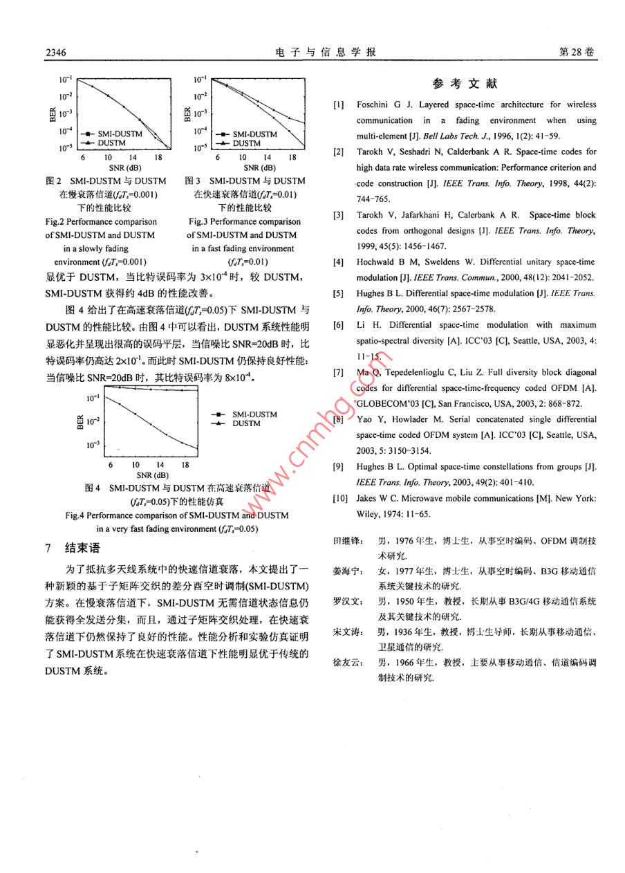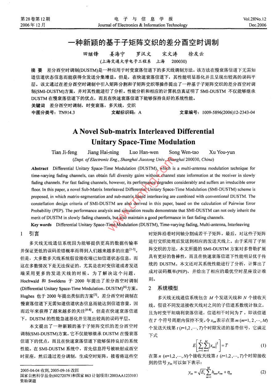第28卷第12期電子與信息學(xué)報Vol.28No 122006年12月Journal of Electronics Information TechnologyDec.2006一種新穎的基于子矩陣交織的差分酉空時調(diào)制田繼鋒姜海寧羅漢文宋文濤徐友云上海交通大學(xué)電子工程系上海2000摘要差分酉空時調(diào)制 DUSTM是一種應(yīng)用于時變衰落信道下的多天線調(diào)制方法。該方法在慢衰落信道下無需知道信道狀態(tài)信息而能獲得全發(fā)送分集增益。但是,在快速衰落信道下,其性能明顯惡化并且呈現(xiàn)出較高的誤碼平層。該文通過在差分酉空時調(diào)制中引入矩陣分割和子矩陣交織等操作提出了一種基于子矩陣交織的差分酉空時調(diào)制(SM- DUSTM)方案,并對其性能進行了分析。性能分析和相應(yīng)的計算機仿真證明了SM- DUSTM不僅能夠繼承DUSTM在慢衰落信道下的優(yōu)點,而且在快速衰落信道下能夠保持良好的系統(tǒng)性能關(guān)鍵詞差分酉空時調(diào)制,時變衰落,多天線,交織中圖分類號:TN9143文獻標(biāo)識碼:A文章編號:1009-5896(2006)122343-04A Novel Sub-matrix Interleaved DifferentialUnitary Space-Time ModulationTian Ji-feng Jiang Hai-ning Luo Han-wen Song Wen-tao Xu You-yunDept. of Electronic Eng, Shanghai Jiaotong Univ, Shanghai 200030, China)Abstract Differential Unitary Space-Time Modulation(DUSTM), which is a multi-antenna modulation technique fortime-varying fading channels, can obtain full diversity gains without channel state information at the receiver in slowlyfading channels. For fast fading channels, however, its performance degrades considerably and suffers an irreducible errorfloor. In this paper, a novel Sub-Matrix Interleaved Differential Unitary Space-Time Modulation(SMI-DUSTM) scheme isproposed, in which matrix-segmentation and sub-matrix based interleaving are combined with conventional DUSTM. Theconstellation design criteria of SMI-DUSTM are also derived in this paper, based on the calculation of Pairwise ErrorProbability(PEP). The performance analysis and simulation results demonstrate that SMI-DUSTM can not only inherit themerit of DUSTM in slowly fading channels, but also maintain a good performance in fast fading channelsKey words Differential Unitary Space-Time Modulation(DUSTM), Time-varying fading, Multi-antenna, Interleaving1引言時矩陣沿著時間軸分割成若干子矩陣。最后,對這些子矩陣多天線無線通信系統(tǒng)因為能夠提供更高的數(shù)據(jù)傳輸率進行交織處理后發(fā)送到相應(yīng)的發(fā)送天線上。由于采用了子矩并保證更低的誤碼差錯概率而得到人們越來越多的注意。陣交織的方法,本文所提的 SMI-DUSTM方案對多普勒擴展但是,大多數(shù)多天線系統(tǒng)假設(shè)接收端已知信道狀態(tài)信息,而具有更好的魯棒性,而且在快速衰落信道下性能明顯優(yōu)于傳這在多數(shù)情況下是無法保證的,尤其是在時變信道或者發(fā)送統(tǒng)的 DUSTM。本文還對其系統(tǒng)性能進行了分析,計算出了端采用更多的發(fā)送天線的時候。為了解決這個問題,成對誤碼概率(PEP),并給出了相應(yīng)的最優(yōu)空時星座設(shè)計準(zhǔn)Hochwald和 Sweldens于2000年提出了差分酉空時調(diào)制Differential Unitary Space- -Time Modulation, DUSTM)方案。2系統(tǒng)模型Hughes也于2000年提出類似的方案。差分酉空時調(diào)制在多天線無線通信系統(tǒng)包含M個發(fā)送天線和N個接收天慢衰落信道下無需知道信道狀態(tài)信息而能達到信道容量,因線。假設(shè)不同發(fā)送接收天線對之間的子信道系數(shù)統(tǒng)計獨立,而近年來獲得了越來越多的關(guān)注但是在快速衰落信道且為時變平坦瑞利衰落信道,信道相干時間為T,即該信道下, DUSTM的性能急速惡化并呈現(xiàn)出較高的誤碼平層。在T個符號周期內(nèi)保持不變。令xm表示在第m(m=1,2…,M本文提出了一種新穎的基于子矩陣交織的差分西空時個發(fā)送天線第r(=1,2,,D個時隙發(fā)送的基帶信號,它滿足調(diào)制( SMI-DUSTM方案,它不僅能夠繼承 DUSTM在慢衰落下式信道下的優(yōu)點,而且在快速衰落信道下能夠保持良好的系統(tǒng)性能。在SM|- DUSTM系統(tǒng)中,首先信息符號被映射成酉空小0時星座,然后通過差分調(diào)制,生成空時矩陣,接著將這些空在第n(m=1,2,…,M個接收天線第t(=1,2,…,T)個時隙接收到的信號ym可以如下表示2005-04-04收到,2005-0916改回國家自然科學(xué)基金(60272079)和國家863計劃項目(2003AA12330)VE∑資助課題電子與信息學(xué)報第28卷其中hm為信道系數(shù),符合均值為0每維方差為05的復(fù)高4.1發(fā)送端斯分布;nm為加性復(fù)白高斯噪聲,其均值為0每維方差為在發(fā)送端,首先,對信息符號zr(=1,…,N)進行酉空N/2:E表示每個接收天線上的平均信噪比(SNR)。時調(diào)制,其過程簡述如下:首先將信息符號z映射成矩陣以每M個符號為一組,假設(shè)MsT,那么可以將式(2)寫v,該矩陣為西對角星座群中的元素。定義星座群2的成矩陣矢量的形式Y(jié)=√EX,H+W維數(shù)為L,(L=2),R為傳輸碼率。根據(jù)式(4)對其進行差其中τ表示所在符號組的序號,X表示MM的發(fā)送矩陣分調(diào)制,可得酉空時矩陣X1(r=0…,N)。X的第m列表Y表示MN的接收矩陣,H為MkN的信道矩陣,W為MN示在第m個發(fā)送天線上不同時刻發(fā)送的信號。的噪聲矩陣然后,對所得酉空時矩陣x進行矩陣分割,即沿著空時矩陣的時間軸將X分割成M個子矩陣,每個子矩陣維數(shù)3差分酉空時調(diào)制( DUSTM為1×M。為方便起見,將這些矩陣依時間順序標(biāo)記為2000年, Hochwald,, Sweldens和 Hughes
