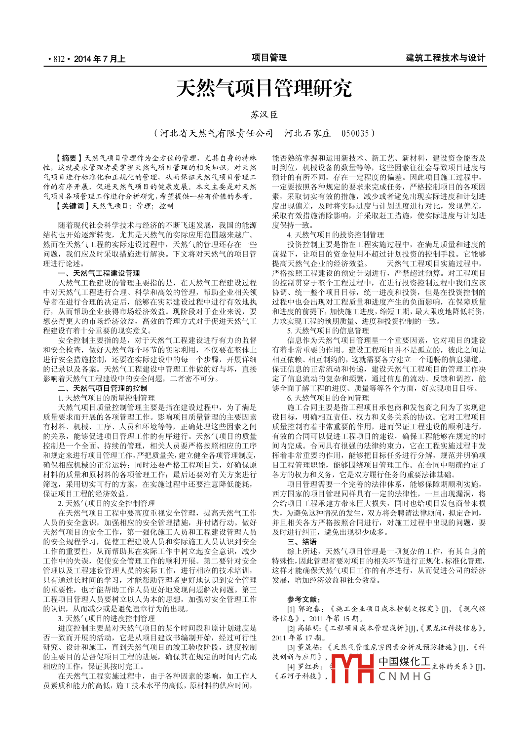 812·2014年7月上項目管理建筑工程技術(shù)與設(shè)計天然氣項目管理研究蘇漢臣(河北省天然氣有限責任公司河北石家莊050035)【摘要】天然氣項目管理作為全方位的管理,尤其自身的特殊?能否熟練掌握和運用新技術(shù)、新工藝、新材料,建設(shè)資金能否及性,這就要求管理者要掌握天然氣項目管理的相關(guān)知識,對天然時到位,機械設(shè)備的數(shù)量等等,這些因素往往會導(dǎo)致項目進度與氣項目進行標準化和正規(guī)化的管理,從而保誣夭然氣項目管理工預(yù)計的有所不同,存在一定程度的偏差。因此項目施工過程中作的有序開展,促進天然氣項目的健康發(fā)展。本文主要是對天然一定要按照各種規(guī)定的要求來完成任務(wù),嚴格控制項目的各項因氣項目各項管理工作進行分析研究,希望提供一些有價值的參考素,采取切實有效的措施,減少或者避免出現(xiàn)實際進度和計劃進【關(guān)鍵詞】天然氣項目;管理;控制度出現(xiàn)偏差,及時將實際進度與計劃進度進行對比,發(fā)現(xiàn)偏差采取有效措施消除影響,并采取趕工措施,使實際進度與計劃進隨著現(xiàn)代社會科學(xué)技術(shù)與經(jīng)濟的不斷飛速發(fā)展,我國的能源度保持一致結(jié)構(gòu)也開始逐漸轉(zhuǎn)變,尤其是天然氣的實際應(yīng)用范圍越來越廣4.天然氣項目的投資控制管理然而在天然氣工程的實際建設(shè)過程中,天然氣的管理還存在一些投資控制主要是指在工程實施過程中,在滿足質(zhì)量和進度的問題,我們應(yīng)及時采取措施進行解決。下文將對天然氣的項目管前提下,讓項目的資金使用不超過計劃投資的控制手段。它能夠理進行論述提高天然氣企業(yè)的經(jīng)濟效益。天然氣工程項目實施過程中,天然氣工程建設(shè)管理嚴格按照工程建設(shè)的預(yù)定計劃進行,嚴禁超過預(yù)算。對工程項目天然氣工程建設(shè)的管理主要指的是,在天然氣工程建設(shè)過程的控制貫穿于整個工程過程中,在進行投資控制過程中我們應(yīng)該中對天然氣工程進行合理、科學(xué)和高效的管理,幫助企業(yè)相關(guān)領(lǐng)協(xié)調(diào)、統(tǒng)一整個項目目標,統(tǒng)一進度和投資,但是在投資控制的導(dǎo)者在進行合理的決定后,能夠在實際建設(shè)過程中進行有效地執(zhí)過程中也會岀現(xiàn)對工程質(zhì)量和進度產(chǎn)生的負面影響,在保障質(zhì)量行,從而幫助企業(yè)獲得市場經(jīng)濟效益?,F(xiàn)階段對于企業(yè)來說,要和進度的前提下,加快施工進度,縮短工期,最大限度地降低耗資,想獲得更大的市場經(jīng)濟效益,高效的管理方式對于促進天然氣工力求實現(xiàn)工程的預(yù)期質(zhì)量、進度和投資控制的一致程建設(shè)有著十分重要的現(xiàn)實意義5.天然氣項目的信息管理安全控制主要指的是,對于天然氣工程建設(shè)進行有力的監(jiān)督信息作為天然氣項目管理里一個重要因素,它對項目的建設(shè)和安全檢查,做好天然氣每個環(huán)節(jié)的實際利用,不僅要在整體上有著非常重要的作用。建設(shè)工程項目并不是孤立的,彼此之間是進行安全措施控制,還要在實際建設(shè)中的每一個步驟,開展詳細相互依賴、相互制約的,這就需要各方建立一個通暢的信息渠道,的記錄以及備案。天然氣工程建設(shè)中管理工作做的好與壞,直接保證信息的正常流動和傳遞,建設(shè)天然氣工程項目的管理工作決影響著天然氣工程建設(shè)中的安全問題,二者密不可分定了信息流動的復(fù)雜和頻繁,通過信息的流動、反饋和調(diào)控,能二、天然氣項目管理的控制夠全面了解工程的進度、質(zhì)量等等各個方面,好實現(xiàn)項目目標天然氣項目的質(zhì)量控制管理6.天然氣項目的合同管理天然氣項目質(zhì)量控制管理主要是指在建設(shè)過程中,為了滿足施工合同主要是指工程項目承包商和發(fā)包商之間為了實現(xiàn)建質(zhì)量要求而開展的各項管理工作。影響項目質(zhì)量管理的主要因素設(shè)目標,明確相互責任、權(quán)力和義務(wù)關(guān)系的協(xié)議。它對工程項目有材料、機械、工序、人員和環(huán)境等等,正確處理這些因素之間質(zhì)量控制有著非常重要的作用,進而保證工程建設(shè)的順利進行,的關(guān)系,能夠促進項目管理工作的有序進行。天然氣項目的質(zhì)量有效的合同可以促進工程項目的建設(shè),確保工程能夠在規(guī)定的時控制是一個全面、持續(xù)的管理,相關(guān)人員要嚴格按照相應(yīng)的工序間內(nèi)完成。合同具有很強的法律約束力,它在工程實施過程中發(fā)和規(guī)定來進行項目管理工作,嚴把質(zhì)量關(guān),建立健全各項管理制度,揮著非常重要的作用,能夠把目標仼務(wù)進行分解,規(guī)范并明確項確保相應(yīng)機械的正常運轉(zhuǎn);冋時還要嚴格工程項目關(guān),好確保原目工程管理職能,能夠圍繞項目管理工作。在合同中明確約定了材料的質(zhì)量和原材料的各項管理工作;最后還要對有關(guān)方案進行各方的權(quán)力和義務(wù),它是雙方履行任務(wù)的重要法律基礎(chǔ)篩選,采用切實可行的方案,在實施過程中還要注意降低能耗項目管理需要一個完善的法律體系,能夠保障期順利實施,保證項目工程的經(jīng)濟效益。西方國家的項目管理同樣具有一定的法律性,一旦出現
