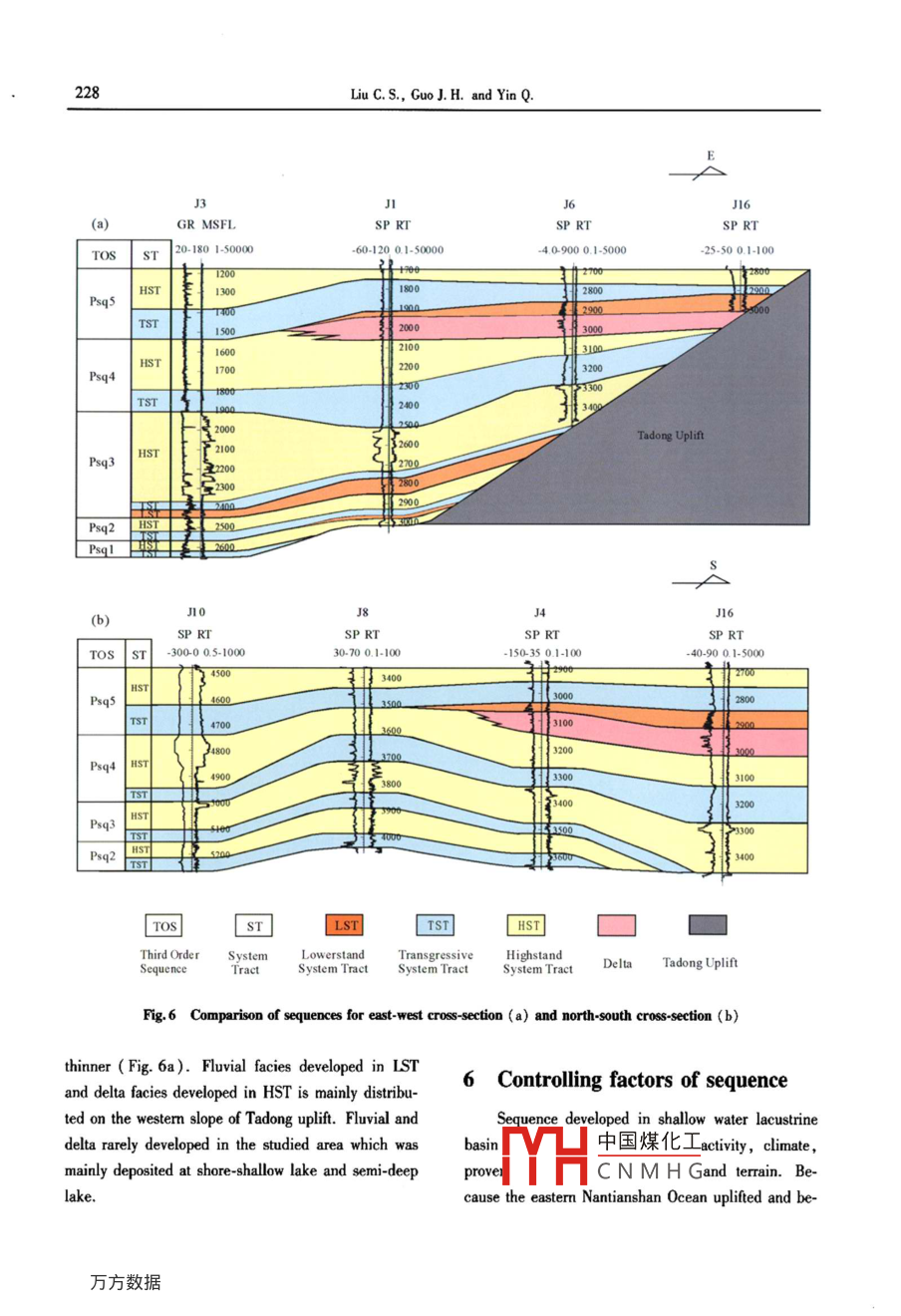 Global Geology, 14(4): 221-230(2011)doi;10. 3969/j. issn. 1673-9736. 2011. 04.02Article ID: 1673-9736(2011 )040221-10Permian sequence stratigraphy of shallow water basinin Tarim BasinLIU Chensheng',2,GUO Jianhual!2 and YIN Qiong',2I. Key Laboralory of Nonferrous Meallogentic Prognosis,Ministry of Education, Central Souh University, Changsha 410083, China;2. School of Geosciences and Info-physics , Central South University, Changsha 410083, ChinaAbstract: Based on analysis of drilling, logging and field profile data, six sequence boundaries in Permian areidentified in Bachu and Tazhong regions of Tarim Basin. All sequence boundaries are of type I sequence bound-aries, and are characterized by down cut. According to the six sequence boundaries, the Permian in this areacan be divided into 5 third-order sequences, and all the sequences correspond with classic sequence model ofVail. Sequence Psq4 indicates lake transgressive system tract (TST) and highstand system tract ( HST). Se-quences Psq1,Psq2, Psq3, Psq5 indicate low stand system tract ( LST) , transgressive system tract and high-stand system tract. LST is deposited by incised channel ifilling with features of fluvial facies. TST is depositedby shore shallw lake and semi -deep lake. HST is deposited by semi -deep lake ,shore-shallow lake and delta.In addition, volcanic rocks are present on the top part of HST in sequence Psq3. Incised channel inilling anddeltaice deposits were mainly distributed on westerm slope of Tadong uplift.Key words: Tarim Basin; Permian; sequence stratigraphy ; incised channel in6lling; deltaic depositing and inner framework of sequences.1 IntroductionTarim Basin is a typical shallow basin in PermianThe reasons for formation of shallow basins arewhich is also the most important period for transfor-drought climate and flat lake bottom. Because waterming of Tarim Basin from marine to continental facies.body of shallow basin is shallow , basin sediments areMarine carbonates deposited in west and southwesterndifferent from others in type, mainly including shore-parts of the basin in Early Permian. During later Earlyshallow lake, semi-deep lake and delta, rare deepPermian, regression happened from east to west( He etlake. Due to drought climate , shallw water body andal, 2005), and fllowed by deposition with craton-lttle provenance, lacustrine fan and wedge-shapeinner-depression continental facies. During Middlebody deposited in lowstand system tract don not devel-Permian, lots of volcanic rocks are present in the ba-oped. Major sediment is fine grain sediment, such assin because of close of South Tianshan Ocean and col-mudstone which intercalates with thin lake carbonatelision between Tianshuihai block ( Qaidam block) andin the basin. Coarse grain sediment often distributesTarim block (Fig. 1). Most area of the basin is uplif-around basin margin. Because shallow basin has spe-ted with continental deposition during Late Permiancial sedimentary environment, there are particularities(Ji中國煤化工Ioreland basin onlyin sequence boundaries recognizing, sequence divid-distri!YHC N M H Greas, where devel-Received 22 June 2011, accepted 20 July 2011222liwC.S., GuoJ.H. and Yin Q.oped fluvial and lacustrine facies. Comprehensive re-derstanding of reservoir types and distribution fea-search of Permian sequence is beneficial for better un-UrumchiJunggar PlateNt-haptiashagsag-ntianshan block.PAKS0--KurleHgishichang sction 10wuping, Tazhong areTadong uplft arca"Makeleinkagblock1Qaidam Plate'Hertian\●1312口subduction belt口mainfault CV ieland- are beltactive belt of ancient landthe studied arca國basement rocks of Tarim Plateblock boundaryFig.1 Location of study area2 Sedimentary characteristic3 Sequence boundary recognitionTarim Basin can be divided into four blocks viz:The main evidences for recognizing sequenceSouthwestern block, Keping block , Taklimakan blockboundaries include:①absence of strata; ?change ofand Nantianshan block. Bachu and Tazhong are theparasequence superimposing styles; ③sharp changesfocused study areas in this paper are located in Takli-of facies;④erosion and infll of fluvial;⑤inner re-makan block, where the Permian strala are divided in-flection features of seismic data. According to thoseto Nanzha Formation, lower clastic-rock member, vol-evidences, six sequence boundaries can be recognizedcanic member and upper clastic-rock member. Thein Permian in this area. 'These boundaries from lowerNanzha Formation deposited by micrite and grainedto upper strala are BI, B2, B3, B4, B5 and B6.limeslone is only distributed al Bachu and southwest-boundary B1 : under which develops carbonateem Tarim Basin ( Wang et al., 2006). Thickness ofrock deposited in Carboniferous, locates in the bottormNanzha Formation becomes thinning from southwest toof Permian. Paleo-weathering crust, inilling of ero-Bachu area, and the strata are absent in Tazhong areaded channel and tide flat facies are present over the(Ding el al, 1998). light-gray and brown red thicksequence boundary. Facies sharply developed uppermudstone intercalated with sandstone and limestone ,and lower boundary BI change , thus, boundary BI isis the major deposition in the lower clastic-rock mem-ast中國煤化Iygena zone, Trit-ber and upper clastic -rock member. Clastic-rock faci-icites:IHCNMHGare normally pres-es include lacustrine, fluvial and delta (Jiang et al.,ent beuween rerman au Luarouerous are absenl ac-2003) .cording to paleontological data( Xiong, 1997; ZhangPermian sequence stratigraphy of shallow water basin in Tarim Basin223el al, 2006). The reason is that the strata were up-conformity surface in Qimugen-Sangzhuhe section inlifted after Carboniferous deposition and then eroded.Southwesterm block (Xi et al. , 2002). Platform car-Thus, the boundary B1 is a type I sequence bounda-bonate of Keziliqiman Formation ( corresponding tory, it corresponds to T rllecting surface according toNanzha Formation) deposits under boundary B2, butseismic da