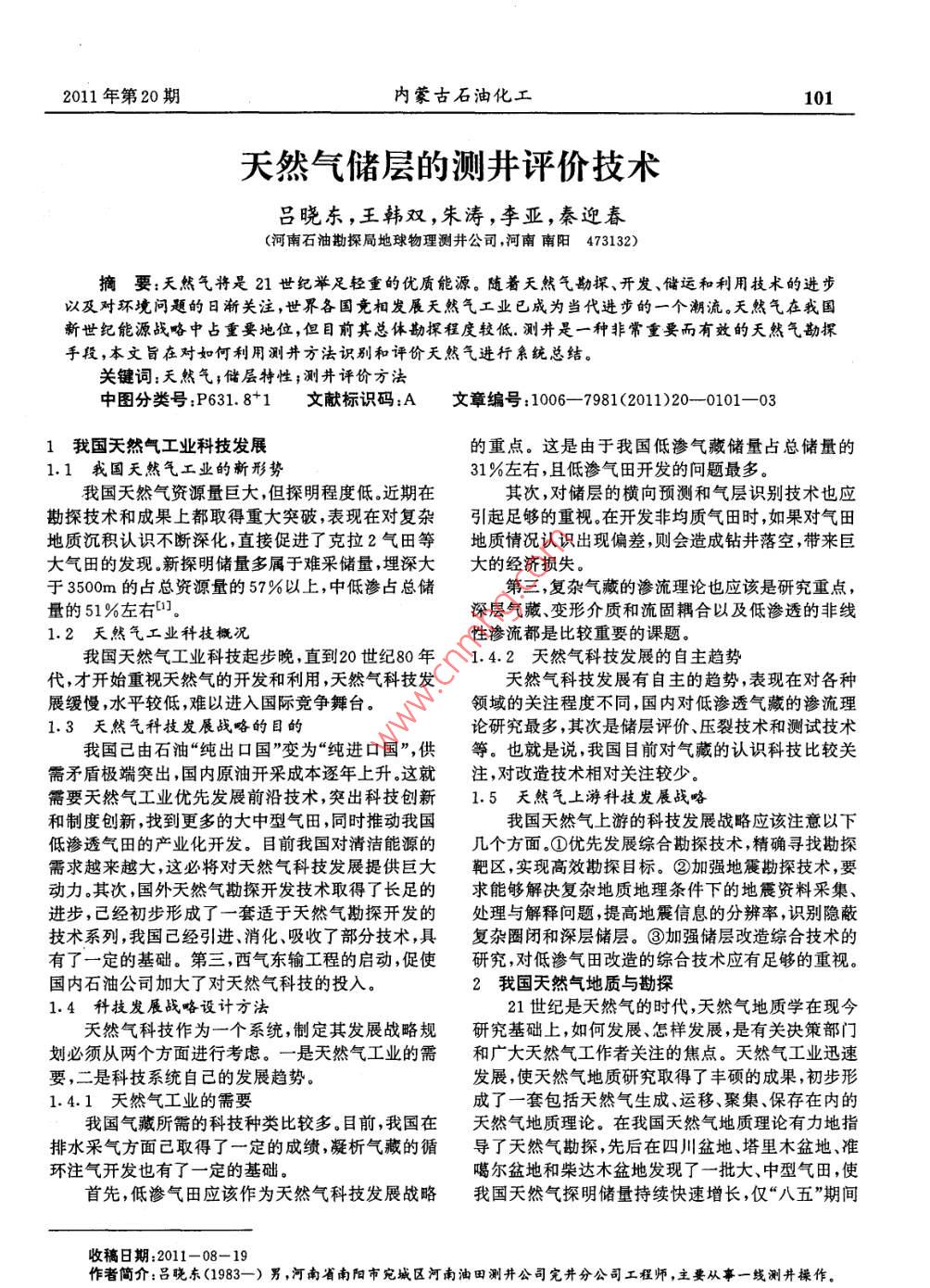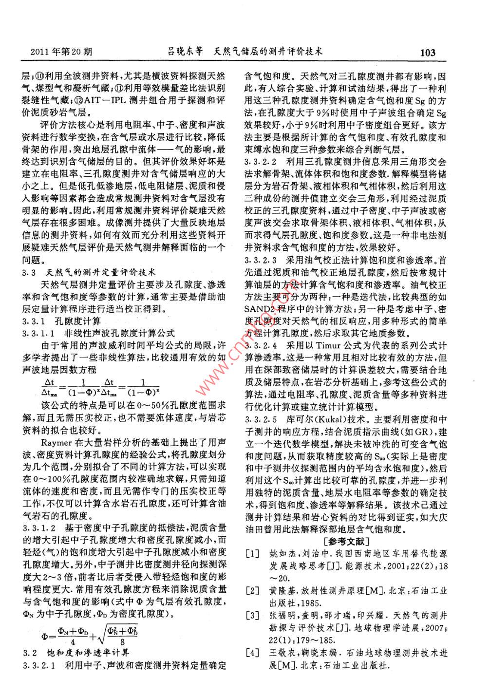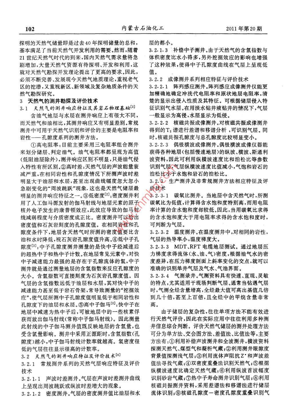 2011年第20期內(nèi)蒙古石油化工101天然氣儲(chǔ)層的測(cè)井評(píng)價(jià)技術(shù)呂曉東,王韓雙,朱濤,李亞,秦迎春(河南石油勘探局地球物理測(cè)井公司,河南南陽(yáng)473132)摘要:天然氣將是21世紀(jì)舉足輕重的優(yōu)質(zhì)能源。隨著天然氣勘探、開(kāi)發(fā)、儲(chǔ)運(yùn)和利用技術(shù)的進(jìn)步以及對(duì)環(huán)境問(wèn)題的日漸關(guān)注,世界各國(guó)竟相發(fā)展天然氣工業(yè)已成為當(dāng)代進(jìn)步的一個(gè)潮流。天然氣在我國(guó)新世紀(jì)能源戰(zhàn)咯中占重要地位,但目前其總體勘探程度較低.測(cè)井是一種非常重要而有效的天然氣勘探手段,本文旨在對(duì)如何利用測(cè)井方法識(shí)別和評(píng)價(jià)天然氣進(jìn)行親統(tǒng)總結(jié)。關(guān)鍵詞:天然氣;儲(chǔ)層持性;測(cè)井評(píng)價(jià)方法中圖分類號(hào):P631.81文獻(xiàn)標(biāo)識(shí)碼:A文章編號(hào):1006-7981(2011)20—0101-031我國(guó)天然氣工業(yè)科技發(fā)展的重點(diǎn)。這是由于我國(guó)低滲氣藏儲(chǔ)量占總儲(chǔ)量的1.1我國(guó)天然氣工業(yè)的新形勢(shì)31%左右,且低滲氣田開(kāi)發(fā)的問(wèn)題最多。我國(guó)天然氣資源量巨大,但探明程度低。近期在其次,對(duì)儲(chǔ)層的橫向預(yù)測(cè)和氣層識(shí)別技術(shù)也應(yīng)勘探技術(shù)和成果上都取得重大突破,表現(xiàn)在對(duì)復(fù)雜引起足夠的重視。在開(kāi)發(fā)非均質(zhì)氣田時(shí),如果對(duì)氣田地質(zhì)沉積認(rèn)識(shí)不斷深化,直接促進(jìn)了克拉2氣田等地質(zhì)情況認(rèn)識(shí)出現(xiàn)偏差,則會(huì)造成鉆井落空,帶來(lái)巨大氣田的發(fā)現(xiàn)新探明儲(chǔ)量多屬于難采儲(chǔ)量,埋深大大的經(jīng)濟(jì)損失。于3500m的占總資源量的57%以上,中低滲占總儲(chǔ)第三,復(fù)雜氣藏的滲流理論也應(yīng)該是研究重點(diǎn),量的51%左右。深層氣藏、變形介質(zhì)和流固耦合以及低滲透的非線1.2天然氣工業(yè)科技概況性滲流都是比較重要的課題我國(guó)天然氣工業(yè)科技起步晚,直到20世紀(jì)80年1.4.2天然氣科技發(fā)展的自主趨勢(shì)代,才開(kāi)始重視天然氣的開(kāi)發(fā)和利用,天然氣科技發(fā)天然氣科技發(fā)展有自主的趨勢(shì),表現(xiàn)在對(duì)各種展緩慢,水平較低,難以進(jìn)入國(guó)際竟?fàn)幬枧_(tái)領(lǐng)域的關(guān)注程度不同,國(guó)內(nèi)對(duì)低滲透氣藏的滲流理1.3天然氣科技發(fā)展戰(zhàn)咯的目的論研究最多,其次是儲(chǔ)層評(píng)價(jià)、壓裂技術(shù)和測(cè)試技術(shù)我國(guó)己由石油“純出口國(guó)”變?yōu)椤凹冞M(jìn)口國(guó)”,供等。也就是說(shuō),我國(guó)目前對(duì)氣藏的認(rèn)識(shí)科技比較關(guān)需矛盾極端突出,國(guó)內(nèi)原油開(kāi)采成本逐年上升。這就注,對(duì)改造技術(shù)相對(duì)關(guān)注較少需要天然氣工業(yè)優(yōu)先發(fā)展前沿技術(shù),突出科技創(chuàng)新1.5天然氣上游科技發(fā)展戰(zhàn)咯和制度創(chuàng)新,找到更多的大中型氣田,同時(shí)推動(dòng)我國(guó)我國(guó)天然氣上游的科技發(fā)展戰(zhàn)略應(yīng)該注意以下低滲透氣田的產(chǎn)業(yè)化開(kāi)發(fā)。目前我國(guó)對(duì)清潔能源的幾個(gè)方面。①優(yōu)先發(fā)展綜合勘探技術(shù),精確尋找勘探需求越來(lái)越大,這必將對(duì)天然氣科技發(fā)展提供巨大靶區(qū),實(shí)現(xiàn)高效勘探目標(biāo)。②加強(qiáng)地震勘探技術(shù),要?jiǎng)恿ΑF浯?國(guó)外天然氣勘探開(kāi)發(fā)技術(shù)取得了長(zhǎng)足的求能夠解決復(fù)雜地質(zhì)地理?xiàng)l件下的地震資料采集進(jìn)步,己經(jīng)初步形成了一套適于天然氣勘探開(kāi)發(fā)的處理與解釋問(wèn)題,提高地震信息的分辨率,識(shí)別隱蔽技術(shù)系列,我國(guó)己經(jīng)引進(jìn)、消化、吸收了部分技術(shù),具復(fù)雜圈閉和深層儲(chǔ)層。③加強(qiáng)儲(chǔ)層改造綜合技術(shù)的有了一定的基礎(chǔ)。第三,西氣東輸工程的啟動(dòng),促使研究,對(duì)低滲氣田改造的綜合技術(shù)應(yīng)有足夠的重視國(guó)內(nèi)石油公司加大了對(duì)天然氣科技的投入。2我國(guó)天然氣地質(zhì)與勘探1.4科技發(fā)展戰(zhàn)咯設(shè)計(jì)方法21世紀(jì)是天然氣的時(shí)代,天然氣地質(zhì)學(xué)在現(xiàn)今天然氣科技作為一個(gè)系統(tǒng),制定其發(fā)展戰(zhàn)略規(guī)研究基礎(chǔ)上,如何發(fā)展、怎樣發(fā)展,是有關(guān)決策部門劃必須從兩個(gè)方面進(jìn)行考慮。一是天然氣工業(yè)的需和廣大天然氣工作者關(guān)注的焦點(diǎn)。天然氣工業(yè)迅速要,二是科技系統(tǒng)自己的發(fā)展趨勢(shì)。發(fā)展,使天然氣地質(zhì)研究取得了豐碩的成果,初步形1.4.1天然氣工業(yè)的需要成了一套包括天然氣生成、運(yùn)移、聚集、保存在內(nèi)的我國(guó)氣藏所需的科技種類比較多。目前,我國(guó)在天然氣地質(zhì)理論。在我國(guó)天然氣地質(zhì)理論有力地指排水采氣方面己取得了一定的成績(jī),凝析氣藏的循導(dǎo)了天然氣勘探,先后在四川盆地、塔里木盆地、準(zhǔn)環(huán)注氣開(kāi)發(fā)也有了一定的基礎(chǔ)。噶爾盆地和柴達(dá)木盆地發(fā)現(xiàn)了一批大、中型氣田,使首先,低滲氣田應