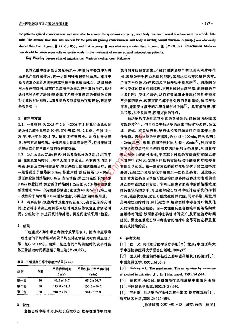 186直林醫(yī)學(xué)2008年2月第29卷第3期3典型病例而易于成活。皮片移植到植皮床后,必須繼續(xù)獲得營(yíng)養(yǎng)和建例1:女,37歲因8年前行咬肌部分切除致頰部凹陷于立血液循環(huán)否則不但不能完成植皮后的愈合,反而會(huì)壞004年3月人院。局部麻醉下取下腹部真皮組織移植至類(lèi)部死1。真皮內(nèi)血管網(wǎng)主要是通過(guò)血管吻接的方法建立血凹陷部位范圍約3.5cmx50cm,移植皮片完全成活。術(shù)后1運(yùn)1,由于真皮內(nèi)血管網(wǎng)的完整保留,與受區(qū)基底部血管網(wǎng)直年隨訪見(jiàn)頰部豐滿、質(zhì)地柔軟、外貌效果滿意(見(jiàn)圖1)。接吻合,建立良好的血液循環(huán)致使皮片移植具備滿意的成活例2:男,15歲因唇裂術(shù)后唇部繼發(fā)凹陷畸形于2006年率。需注意受皮區(qū)創(chuàng)基、創(chuàng)緣止血要徹底在保持皮片適當(dāng)張1月人院。局部麻醉下取左側(cè)髂前上嵴部真皮組織移植于唇力的情況下加壓包扎,壓力要均勻,以30mmHg左右為宜,以部凹陷部位,術(shù)后半年隨訪效果滿意(見(jiàn)圖2)。保證真皮血管網(wǎng)舒展及與受區(qū)緊密貼合聞。筆者認(rèn)為,該真皮片切取和移植操作簡(jiǎn)單實(shí)用,此方法在面部凹陷畸形的填充矯治中與美學(xué)觀念相結(jié)合,可以取得較好整復(fù)效果。5參考文獻(xiàn)[]王煒整形外科學(xué)M]杭州:浙江科技出版社,199術(shù)前術(shù)后9圖2唇部繼發(fā)凹陷畸形術(shù)前術(shù)后對(duì)比[2]陳日亭頜面頸手術(shù)解剖[M]北京:人民衛(wèi)生出版社,4討論1984:292.真皮移植有著百余年的歷史真皮移植的臨床應(yīng)用始于[3]柳大烈楊果凡,劉驍燕等真皮下血管網(wǎng)皮片基底血Lw930年報(bào)道用真皮片修補(bǔ)腹壁疝和斷離的肌腱"多運(yùn)建立的研究[J實(shí)用美容整形外科雜志9,7(2):76年來(lái)真皮移植物一直被臨床用作組織加強(qiáng)、替代和充填的良[4]鄭少萍帶真皮下血管網(wǎng)皮膚移植術(shù)[].醫(yī)學(xué)信息,好材料,并在整形美容領(lǐng)域得到進(jìn)一步的推廣及利用2001,14(2):112.人體真皮組織主要成分是膠原其富有彈性質(zhì)地柔軟[收稿日期:2007-03-19編校黃榮鄭英善]結(jié)構(gòu)致密、強(qiáng)韌且因保存了完整豐富的真皮內(nèi)層毛細(xì)血管網(wǎng)重度乙醇中毒不同給藥方法研究戴艷(湖北省武漢市中心醫(yī)院急診科湖北武漢430014)摘要]目的研究不同給藥方法對(duì)重度乙醇中毒患者的催醒效應(yīng)以得到最佳治療方案。方法:將90例患者隨機(jī)分為3組,第一組首劑給予納絡(luò)酮0.8mg靜脈注射然后每隔10~30min重復(fù)靜脈注射納絡(luò)酮0.8mg。第二組先給予納絡(luò)酮08mg靜脈注射然后給予納絡(luò)酮1.2mg加人5%葡萄糖氯化鈉注射液500m中持續(xù)靜脈滴注。第三組一次性給予納絡(luò)酮0.8mg靜脈注射,不再追加納絡(luò)酮用量。確切記錄給藥時(shí)間患者神志轉(zhuǎn)清正確回答問(wèn)題時(shí)間及肢體恢復(fù)正?;顒?dòng)時(shí)間。分組統(tǒng)計(jì),并進(jìn)行統(tǒng)計(jì)學(xué)處理。結(jié)果:第一組患者的平均清醒時(shí)間及平均肢體正?;顒?dòng)時(shí)間明顯短于第二組(P<0.05)。而第二組患者的平均清醒時(shí)間及平時(shí)肢體正?;顒?dòng)時(shí)間明顯短于第三組(P<0.05)。結(jié)論重度乙醇中毒患者的治療中應(yīng)盡可能選擇納絡(luò)酮重復(fù)給藥或持續(xù)給藥。[關(guān)鍵詞]重度乙醇中毒;不同給藥方法;納絡(luò)酮Clinical observation of various medications on severe ethanol-intoxicationpatientsDAI Yan (Department of Emergency, the Center Haupital of Wuhan Ciy, Hubei Prouince, Wuhan 430014, China)Abstract: Objective To study the wakening effect of various medications on severe ethanol-intoxication patients, in order to obtainthe best therapeutic scMethod Ninety patients were divided into three groups by random, Group I received intravenous injection ofNaloxone(0. 8mg), then repeated intravenous injection of Naloxone(0. 8mg)at intervals of 10-30 min. Croup I firstly had intravenousinjection of Naloxone(0. 8mg), then had continuous intravenous drip of Naloxone(1. 2mg), together with normal saline 500ml, 5%ofsugar. Group Ill directly had intravenous injection of Naloxone(0. 8mg) without more dosage of Naloxone. The exact times o medication林醫(yī)學(xué)2008年2月第29卷第3期the patients gained consciousness and were able to answer the questions correctly, and body resumed normal function were recorded. Re-sults The average time that was needed for the patients gaining consciousness and body resuming nomal function in group I was obviouslyshorter than that of group I(P<0. 05), and that in group I was obviously shorter than in group I(P<0. 05). Conclusion Medica-tion should be given repeatedly or continuously in the treatment of severe ethanol intoxication patientsKey Words: Severe ethanol intoxication; various medications; Naloxone急性乙醇中毒是急診常見(jiàn)病之一,中毒后主要對(duì)中樞神源性阿片肽釋放出來(lái),乙醇代謝的某些產(chǎn)物也具有阿片樣作經(jīng)系統(tǒng)產(chǎn)生抑制作用進(jìn)一步影響呼吸和循環(huán)系統(tǒng)。重度中用,表現(xiàn)為中樞神經(jīng)系統(tǒng)的抑制,出現(xiàn)運(yùn)動(dòng)及神經(jīng)精神失常毒可誘發(fā)心血管系統(tǒng)疾患或呼吸中樞麻痹而死亡。納絡(luò)酮是嚴(yán)重者呈昏睡昏迷狀態(tài)及導(dǎo)致呼吸中樞麻痹。納絡(luò)酮為阿片受體拮抗劑,目前廣泛應(yīng)用于急性乙醇