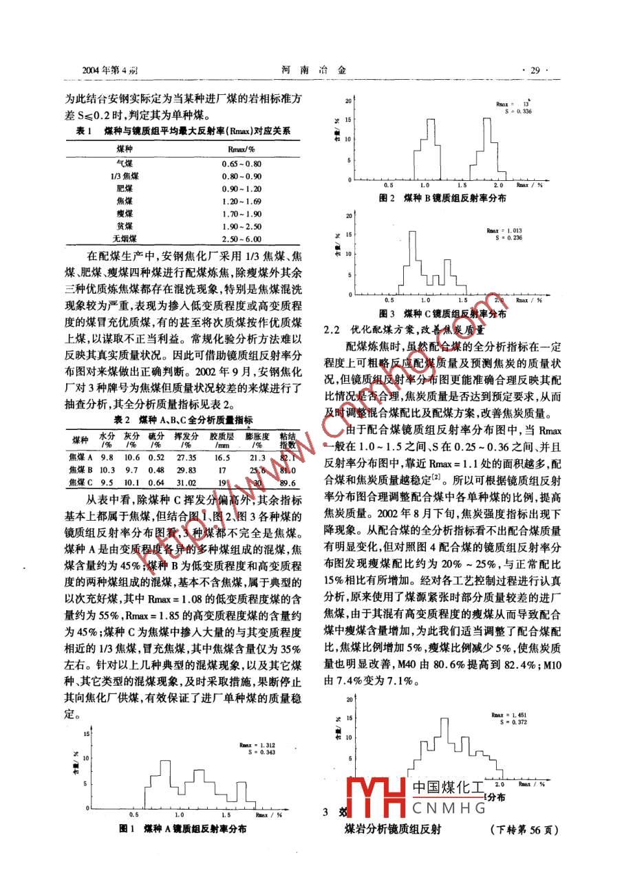2004年8月河南冶金Aug 2004.第12卷第4期HENAN METALLURGYVol.12 No.4煤巖分析在配煤生產中的應用李洪鈞曹紀剛宋英臣白巧枝劉立軍陳昕(安陽鋼鐵股份有限公司)摘要介紹了煤巖分析鏡質組反射率分 布圖的原理及在生產中的應用情況,通過煤巖分析有效促進了單種煤管理和配合煤質量的改善。關鍵詞煤巖分析單種煤配合煤質量改善APPLICATION OF COAL PETROGRAPHY ANALYSIS IN MATCHING COALli Hongjun Cao Jigang Song Yingchen Bai Qiaozhi Liu Ljun Chen Xin(Anyang lron & Seel Co. ,Ld)ABSTRACT The paeper introduces the rlectivit profile' s pinciple of coal petrography analysis and is aplication. Throughanalysis. , manegement of single coal and quality of matching coal have been improved.KEY WORDS coal petrography analysis single coal matching coal quality improvenent近年來,隨著冶金焦價格的不斷上漲以及優(yōu)質機組分中碳元素的含量增加而增加,不受煤的巖石煉焦煤資源的缺乏,各焦化企業(yè)使用的煉焦煤種及成分含量變化的影響,是目前公認的最能全面準確煤源有逐年增加的趨勢。在進煤過程中,由于各地反映煉焦煤變質程度和結焦性能的質量指標。不僅資源條件不同和煤的質量控制方法的差異,使得進可有效的對進廠單種煤進行跟蹤監(jiān)督和評價,杜絕場單種煤煤質波動較大,存在著不同程度的混煤現(xiàn)劣質煤進廠,降低焦化配煤成本,而且還可用于配合象,加之一些洗煤廠為了追求高額利潤,將一些劣質煤管理,優(yōu)化配煤方案,預測及改善焦炭質量”1。煤摻入優(yōu)質煤中故意混煤,造成單種煤煤質波動較2應用大。而焦化企業(yè)采用的常規(guī)化驗方法難以檢查監(jiān)測2.1單種煤混煤的判定混煤現(xiàn)象,使配煤生產受到嚴重影響,同時也不利于單種煤是指具有一定變質程度及相同煤巖組分焦炭質量的穩(wěn)定。因此,安鋼焦化廠經(jīng)過認真考察組成的煤。但由于成煤地質條件的差異、巖層深度分析,根據(jù)國內各廠均把鏡質組反射率確定為判定的不同及外界條件的影響,嚴格意義上的單種煤基煉焦煤變質程度的指標的情況,于2002年6月底引本上是不存在的。通常所謂的單種煤是指煤巖分析進了HY-3型全自動顯微光度計,利用其測定的鏡具有鏡質組反射率直方圖分布范圍窄、標準方差“S”質組反射率分布圖對進廠單種煤進行鑒定。小等特點的煤,并且該煤種的各批次來煤顯微組分HY- 3型全自動顯微光度計性能基本無變化。而混煤-般指變質程度不同的兩種或HY-3型全自動顯微光度計系統(tǒng)包括顯微光度兩種以上的單種煤按- -定 比例混合成煤巖組成差別計、四維自動掃描臺、數(shù)據(jù)采集系統(tǒng)、掃描物臺控制較大的煤,其煤巖分析表現(xiàn)為鏡質組反射率直方圖系統(tǒng)、計算機、打印機等。顯微光度計的測定點數(shù)在為雙峰或多峰、分布范圍寬及標準方差“S"大等特0.3~ 60萬點之間,測定速度為每分鐘0.5~ 10萬點。常規(guī)的煤的工業(yè)分析及全分析難以判定其混洗點。其通過3點直線提取方法,可準確反映進廠煤程度。但是由于各個煤種具有一定的鏡 質組平均最中各變質程度的煤的分布情況。配套計算機系統(tǒng)能大反射率(Rmax),并且反射率直方圖的標準方差s將自動測試和數(shù)據(jù)處理--次完成,可與常用打印機可以表示煤的混洗程度,因此可利用鏡質組反射率相連,顯示并打印出有關參數(shù)及曲線等。分布圖中的Rmax和s分別判定來煤煤種及煤的混HY -3型全自動顯微光度計煤巖分析系統(tǒng)具有洗程度。其中鏡質組平均最大反射率Rmax與煤種測定速度快、準確性高、節(jié)省人力等特點。其測定的中國煤化工差s較小時,雖然鏡質組反射率是一項較好的煤巖學指標,隨煤的有為此種煤為單種煤。*YHCNMHG聯(lián)系人:李洪鈞,副廠長,高級工程師,河南.安陽45004),安陽鋼鐵股份有限公司焦化廠;收稿日期2004-1- -292004年第4剛河南冶金29●為此結合安鋼實際定為當某種進廠煤的巖相標準方Rax。差S≤0.2時,判定其為單種煤。表1煤種與鏡質組平均最大反射率(Rmex)對 應關系物1煤種Rmox/%氣煤0.65~0.801/3焦煤0.80-0.902.0 Par/%肥煤0.90~1.20焦煤1.20~1.69圉2煤種B鏡質組反射率分布瘦煤1.70-1.900↑貧煤1.90~2.50無煙煤2.50- 6.00* 15S= 0.28在配煤生產中,安鋼焦化廠采用1/3焦煤、焦煤肥煤、瘦煤四種煤進行配煤煉焦,除瘦煤外其余三種優(yōu)質煉焦煤都存在混洗現(xiàn)象,特別是焦煤混洗20~- Rax/%-現(xiàn)象較為嚴重,表現(xiàn)為摻人低變質程度或高變質程圖3煤種C鏡質組反射率分布度的煤冒充優(yōu)質煤,有的甚至將次質煤按作優(yōu)質煤2.2 優(yōu)化配煤方案,改善焦炭質量上煤,以謀取不正當利益。常規(guī)化驗分析方法難以配煤煉焦時,雖然配合煤的全分析指標在一定反映其真實質量狀況。因此可借助鏡質組反射率分程度上可粗略反應配煤質量及預測焦炭的質量狀布圖對來煤做出正確判斷。2002 年9月,安鋼焦化況,但鏡質組反射率分布圖更能準確合理反映其配廠對3種牌號為焦煤但質量狀況較差的來煤進行了比情況是否合理,焦炭質量是否達到預定要求,從而抽查分析,其全分析質量指標見表2。及時調整混合煤配比及配煤方案,改善焦炭質量。表2煤種A.B.C全分析質指標煤種水分灰分硫分揮發(fā)分膠質層膨脹度粘轅由于配合煤鏡質組反射率分布圖中,當Rmax-般在1.0~1.5之間、S在0.25~0.36之間、并且焦煤A 9.8 10.6 0.52 27.3516.5 21.3 82.1反射率分布圖中,靠近