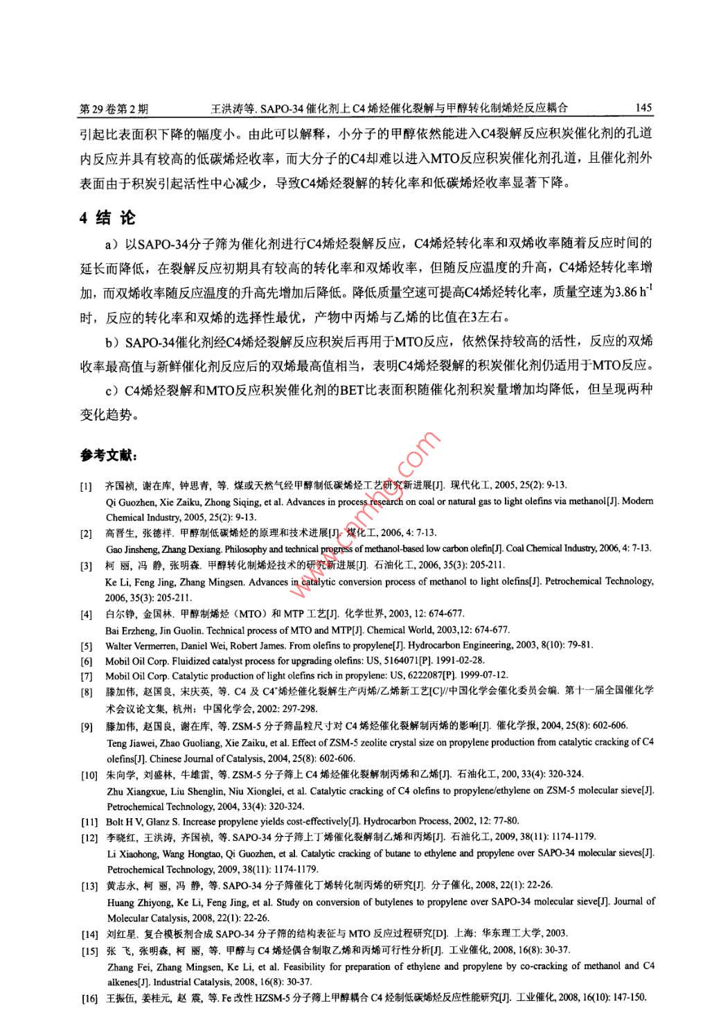 第29卷第2期化學反應(yīng)工程與工藝Vol 29, No 22013年4月Chemical Reaction Engineering and TechnologyApr. 2013文章編號: 1001- -7631 (2013)02- -0140- -07SAPO-34催化劑上C4烯烴催化裂解與甲醇轉(zhuǎn)化制烯烴反應(yīng)耦合王洪濤,齊國禎,李曉紅,王莉(中國石油化工股份有限公司上海石油化工研究院,上海201208)摘要;采用SAPO-34催化劑,在流化床裝置上考察了甲醇制烯烴(MTO)副產(chǎn)C4烯烴催化裂解制乙烯和丙烯的反應(yīng)行為,分析了C4烯烴轉(zhuǎn)化率、產(chǎn)物收率等主要指標隨I藝參數(shù)的變化規(guī)律,對比了C4烯烴催化裂解和MIO反應(yīng)積炭催化劑的差異,提出了C4烯烴催化裂解適宜的關(guān)鍵工藝條件.C4烯烴催化裂解對比MTO反應(yīng)需要較高的反應(yīng)溫度和催化劑活性。結(jié)果表明,C4烯烴裂解反應(yīng)過程形成的積炭催化劑仍可用于MTO反應(yīng),并且具有較高的甲醇轉(zhuǎn)化率和低碳烯烴選擇性,因此可以采用SAPO-34催化劑把兩個獨立的反應(yīng)串聯(lián)耦合在一起。關(guān)鍵詞:碳四烯烴甲醇制烯烴催化裂解耦合中圖分類號: 0643.32文獻標識碼: A工業(yè)生產(chǎn)中的乙烯和丙烯主要是通過石油路線獲得。近年來,隨著石油資源8益枯竭,通過煤或天然氣為原料經(jīng)由甲醇或二甲醚制乙烯和丙烯等低碳烯烴工藝受到廣泛關(guān)注1.21。甲醇制低碳烯烴研究主要包括以乙烯和丙烯為主要產(chǎn)物的MTO (Methanol to Olefins) 技術(shù)和以丙烯為主要產(chǎn)物的MTP(Methanol to Propylene)技術(shù)234。MTO技術(shù)主要采用SAPO-34分子篩催化劑,MTP技術(shù)催化劑主要采用ZSM-5分子篩。SAPO-34分 子篩具有8元環(huán)構(gòu)成的橢圓球形籠和3維孔道結(jié)構(gòu),孔徑為0.43 ~0.50 nm。與ZSM-5分子篩相比,SAPO-34分 子篩的孔徑小,使其在催化反應(yīng)過程中更容易生成動力學直徑較小的乙烯和丙烯等產(chǎn)物,而且SAPO-34分子篩的水熱穩(wěn)定性也比較好。在MTO反應(yīng)過程中,混合C4是主要的副產(chǎn)物,烯烴質(zhì)量分數(shù)約占90%,綜合利用這部分混合C4是提高MTO經(jīng)濟技術(shù)指標的途徑之一。國內(nèi)外多家公司開發(fā)了C4烯烴催化裂解制乙烯和丙烯的技術(shù)51,如Atofina 公司和UOP公司聯(lián)合開發(fā)的OCP工藝圖, Lurgi公 司的Propylur技術(shù)"和中國石油化工股份有限公司的S_OCCI藝18.9]等。這些技術(shù)都以ZSM-5分子篩作為催化劑,一般采用固定 床反應(yīng)器。ZSM-5分子篩催化劑具有良好的穩(wěn)定性與較高的丙烯選擇性,但水熱穩(wěn)定性和擇形性相對較差。李曉紅等[2,13]以SAPO-34分 子篩為催化劑考察了丁烯裂解反應(yīng)規(guī)律,與ZSM-5分 子篩相比,SAPO-34分 子篩水熱穩(wěn)定性較好,初始反應(yīng)時雙烯收率較高,更適合作為流化床催化劑。S-MTO技術(shù)4采用SAPO-34分子篩催化劑催化裂解MTO副產(chǎn)C4,并有效地將C4催化裂解技術(shù)與MTO技術(shù)進行耦合,對于進一-步 提高低碳烯烴收率具有重要的意義。本工作采用小型固定流化床裝置,以SAPO-34分 子篩為催化劑,考察了MTO副產(chǎn)C4烯烴催化裂解制乙烯和丙烯的反應(yīng)性能,并對比C4烯烴裂解與MTO反應(yīng)積炭催化劑的區(qū)別,分析了C4烯烴催化裂解與MTO反應(yīng)耦合的可行性。收稿日期: 2013-02-20; 修訂日期: 2013-03-21. .作者簡介:王洪濤(1980 -), 男,工程師。E-mail: wanght. shysinopec. com。.第29卷第2期王洪濤等. SAPO-34催化劑上C4烯烴催化裂解與甲醇轉(zhuǎn)化制烯烴反應(yīng)耦合1411實驗部分1.1實驗流程采用小型固定流化床裝置,其反應(yīng)器由密相段(30 mmX 560 mm)和稀相段(80 mmX 200 mm)構(gòu)成,實驗裝置分3部分:進料部分、反應(yīng)部分和分9離部分。實驗流程見圖1。實驗采用SAPO-34型MTO10催化劑4。C4原料(來自中國石化中原石油化工有限公司,組成如表1所示)經(jīng)泵送入預(yù)熱器,甲醇(工業(yè)級)經(jīng)泵先送入甲醇預(yù)熱器預(yù)熱后再進入預(yù)熱器;原料經(jīng)預(yù)熱器進入反應(yīng)器,使反應(yīng)器內(nèi)的催化劑流化并進行反應(yīng),反應(yīng)產(chǎn)物經(jīng)一級冷凝管冷凝后進入氣液圖1實驗流程分離罐,氣相再經(jīng)二級冷凝管、冷阱冷凝后得到最終Fig.1 Experimental flow1- C4 pump; 2- C4 feed; 3- methanol feed; 4- methanol pipe;氣相產(chǎn)物,通過取樣口進行氣相取樣分析,液相產(chǎn)物S- methanol preheater; 6- N2; 7- preheater; 8- primary condenser;9- air vent; 10- sample point; 11- cold trap; 12- secondary condenser;在氣液分離罐和冷阱中收集。13- gas-liquid separator; 14- reactor表1 C4原料組成Table 1 Composition of C4 feedCompositionC4HIo1-C4Hs2-C.Hgi-C.HgOthersMass fraction, %26.2858.634.955.271.2產(chǎn)物分析采用Agilent公司7890型氣相色譜儀分析氣相產(chǎn)物的組成,色譜柱為HP-AL/S的Al2O3毛細管柱(50 mX0.53 mmX15 um),F(xiàn)ID檢測器,載氣為N2。采用無錫高速分析儀器廠HIR-944B型紅外碳硫分析儀測催化劑積炭量(積炭量通過測積炭中的碳元素含量來計算的)。試樣比表面積采用Digisorb-2600型吸附儀( Micrometrics公司)測定。采用天津鵬翔科技有限公司PX-200A型氨氣-程序升溫脫附(NH3-TPD)裝置上測催化劑的酸性,氦氣為載氣,流量30 mL/min.2結(jié)果與討論2.1進料時間對C4烯烴裂解反應(yīng)的影響在常壓,反應(yīng)溫度650 C和質(zhì)量空速(以丁烯計)為3.86 h'條件下,考察了反應(yīng)時間對C4烯烴催化裂解反應(yīng)的影響,結(jié)果見圖2。由圖可知,反應(yīng)初期(