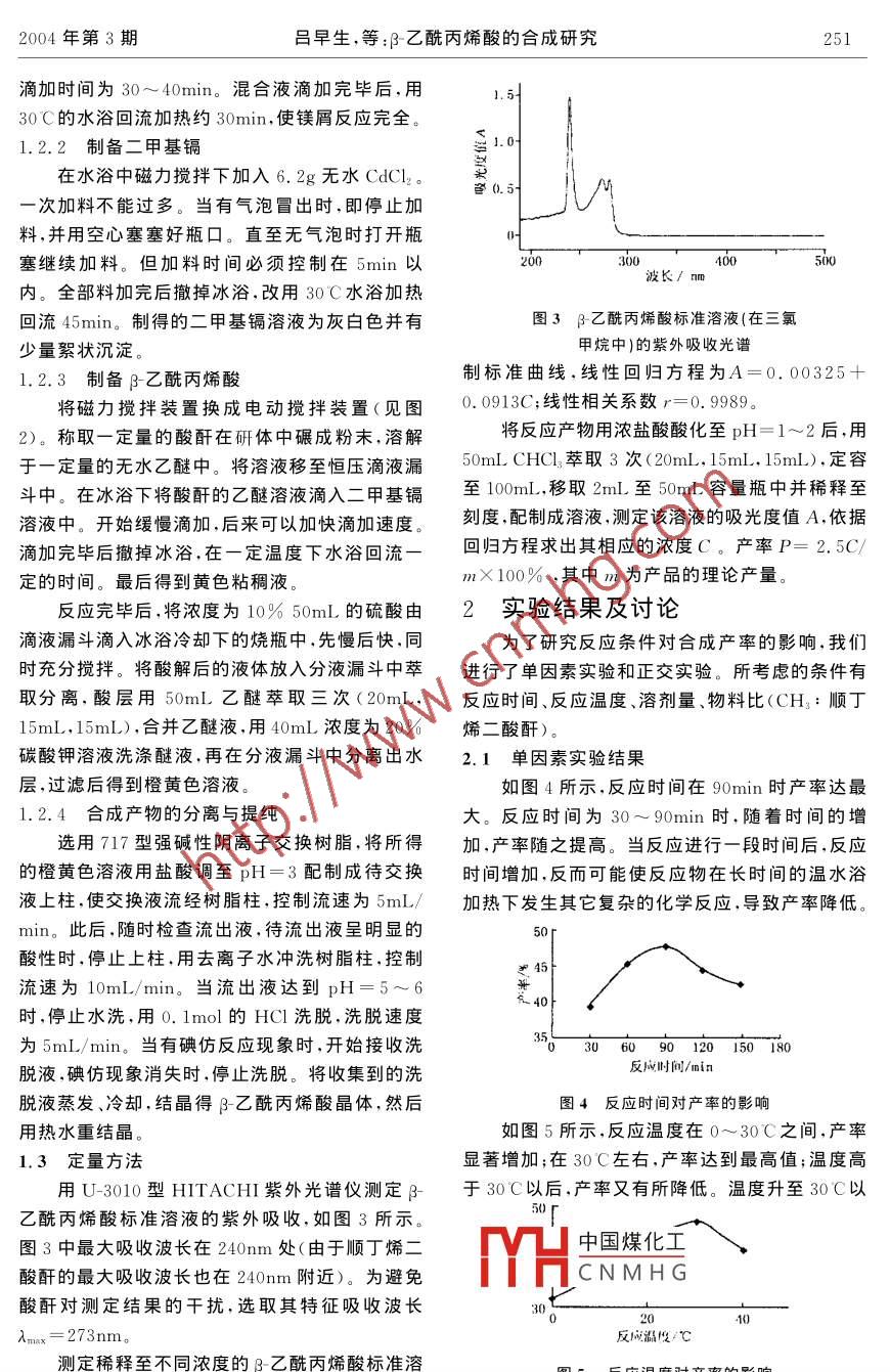 第27卷第3期武漢科技大學(xué)學(xué)報(自然科學(xué)版)Vol. 27. No. 32004年9月I. of Wuhan Uni. of Sci. & Tech. Natural Science Edition)Sep.2004β-乙酰丙烯酸的合成研究呂早生,陳冬冬(武漢科技大學(xué)化工與資源環(huán)境學(xué)院,湖北武漢,430081)摘要:采用有機金屬化合物二甲基鎘與順丁烯二酸酐的開環(huán)反應(yīng),合成原白頭翁素的重要中間體β乙酰丙烯酸。通過FTIR和HNMR確證了產(chǎn)品的結(jié)構(gòu),采用正交實驗系統(tǒng)研究反應(yīng)的溫度、時間、溶劑量和物料比對合成反應(yīng)產(chǎn)率的影響,確定了最佳反應(yīng)條件為反應(yīng)時間90min,反應(yīng)溫度30℃,溶劑量50mL,反應(yīng)物摩爾比1。結(jié)果表明,溫度是影響該反應(yīng)的最重要因素關(guān)鍵詞:原白頭甕素;馬來酸酐;β乙酰丙烯酸;二甲基鎘中圖分類號:TQ031.2文獻標(biāo)識碼:A文章編號:1672-3090(2004)03-0250-04原白頭翁素,學(xué)名4亞甲基-2-丁烯-4-內(nèi)脂(4- methylenebut--2-en-4- glide),是來自植物的抗菌素,對微生物有毒,具有一定的生物生理活性。最近的研究表明,它是一些氯化物通過水解酶產(chǎn)生的有毒代謝物,會降低細胞的生命力3乙酰丙烯酸作為合成原自頭翁素的重要中間體2:3,具有一定的研究降解機理的價值。自1891年L.Wolf首次通過溴代乙酰丙烯酸的脫溴制備了這個有機物后,已有不少的合成方圖2電動攪拌的回流冷凝裝置法4:。但它們都有不足之處,即存在如何控制—恒壓滴液漏斗;2—三口燒瓶;順式生成物、順反異構(gòu)體的分離等問題。本研究3—球形冷凝管;4一無水CaCl2;5—磁力攪拌器;利用順丁烯二酸酐與二甲基鎘開環(huán)反應(yīng)直接生成6—電機;7—機械攪拌器3乙酰丙烯酸,以避免順反異構(gòu)體產(chǎn)生分離。1.2實驗1實驗裝置與實驗實驗反應(yīng)式如下實驗裝置CH, I-Mg+CH, Mg I Cdcl,ca(CH,)實驗裝置如圖1、圖2所示。cd(CH,)2CCH2.1制備d試劑所有玻璃儀器在實驗前都在烘箱中干燥后(見圖1),安裝好磁力攪拌回流裝置。將1.5g鎂條剪成長條狀細小的鎂片和15mL的無水乙醚放入250mnL的三囗燒瓶,使乙醚浸沒鎂片,用磁力攪拌器攪拌。接好回流冷凝裝置,將5mL.CH3I與20mL的乙醚混和液由恒壓滴液漏斗滴入。先圖1磁力攪拌的回流冷凝裝置滴入幾滴,并用手捂熱燒瓶,觀察燒瓶內(nèi)有無反應(yīng)1—恒壓滴液漏斗;2—三口燒瓶;3—球形冷凝管中國煤化工入一小粒碘,此時溶液4—無水CaCl2;5—磁力攪拌器CNMHG混和液,滴入的速度控制在使乙醚保持輕微的沸騰狀態(tài),并保持回流。作者簡禿肯數(shù)據(jù)1961-),男,武漢科技大學(xué)化工與資源環(huán)境學(xué)院副教授,博士2004年第3期呂早生,等:β乙酰丙烯酸的合成研究251滴加時間為30~40min。混合液滴加完畢后,用30℃的水浴回流加熱約30min,使鎂屑反應(yīng)完全1.2.2制備二甲基鎘在水浴中磁力攪拌下加入6.2g無水CdCl2。0.5次加料不能過多。當(dāng)有氣泡冒出時,即停止加料,并用空心塞塞好瓶口。直至無氣泡時打開瓶塞繼續(xù)加料。但加料時間必須控制在5min以波長/mm內(nèi)。全部料加完后撤掉冰浴,改用30℃水浴加熱回流45min。制得的二甲基鎘溶液為灰白色并有圖3β乙酰丙烯酸標(biāo)準(zhǔn)溶液(在三氯少量絮狀沉淀甲烷中)的紫外吸收光譜1.2.3制備β乙酰丙烯酸制標(biāo)準(zhǔn)曲線,線性回歸方程為A=0.00325+將磁力攪拌裝置換成電動攪拌裝置(見圖0.0913C;線性相關(guān)系數(shù)r=0.9892)。稱取一定量的酸酐在硏體中碾成粉末,溶解將反應(yīng)產(chǎn)物用濃鹽酸酸化至pH=1~2后,用于一定量的無水乙醚中。將溶液移至恒壓滴液漏 mL CHCI3萃取3次(20ml,15ml,15mL),定容斗中。在冰浴下將酸酐的乙醚溶液滴入二甲基鎘至10ml,移取2mL至50mL容量瓶中并稀釋至溶液中。開始緩慢滴加,后來可以加快滴加速度??潭?配制成溶液,測定該浴液的吸光度值A(chǔ),依據(jù)滴加完畢后撒掉冰浴,在一定溫度下水浴回流回歸方程求出其相應(yīng)的濃度C。產(chǎn)率P=2.5C定的時間。最后得到黃色粘稠液m×100%,其中m為產(chǎn)品的理論產(chǎn)量反應(yīng)完畢后,將濃度為10%50mL的硫酸由2實驗結(jié)果及討論滴液漏斗滴入冰浴冷卻下的燒瓶中,先慢后快,同為了研究反應(yīng)條件對合成產(chǎn)率的影響,我們時充分攪拌。將酸解后的液體放入分液漏斗中萃進行了單因素實驗和正交實驗。所考慮的條件有取分離,酸層用50mL乙醚萃取三次(20m反應(yīng)時間、反應(yīng)溫度、溶劑量、物料比(CH3:順丁15mL,15mL),合并乙醚液,用40mL濃度為20%烯二酸酐)碳酸鉀溶液洗滌醚液,再在分液漏斗中分離岀水2.1單因素實驗結(jié)果層,過濾后得到橙黃色溶液如圖4所示,反應(yīng)時間在90min時產(chǎn)率達最2.4合成產(chǎn)物的分離與提純大。反應(yīng)時間為30~90min時,隨著時間的增選用717型強堿性陰離子交換樹脂,將所得加,產(chǎn)率隨之提高。當(dāng)反應(yīng)進行一段時間后,反應(yīng)的橙黃色溶液用鹽酸調(diào)至pH=3配制成待交換時間增加,反而可能使反應(yīng)物在長時間的溫水浴液上柱,使交換液流經(jīng)樹脂柱,控制流速為5mL/加熱下發(fā)生其它復(fù)雜的化學(xué)反應(yīng),導(dǎo)致產(chǎn)率降低。min。此后,隨時檢查流出液,待流出液呈明顯的酸性時,停止上柱,用去離子水沖洗樹脂柱,控制流速為10mL/min。當(dāng)流出液達到pH時,停止水洗,用0.1mol的HCl洗脫,洗脫速度為5mL/min。當(dāng)有碘仿反應(yīng)