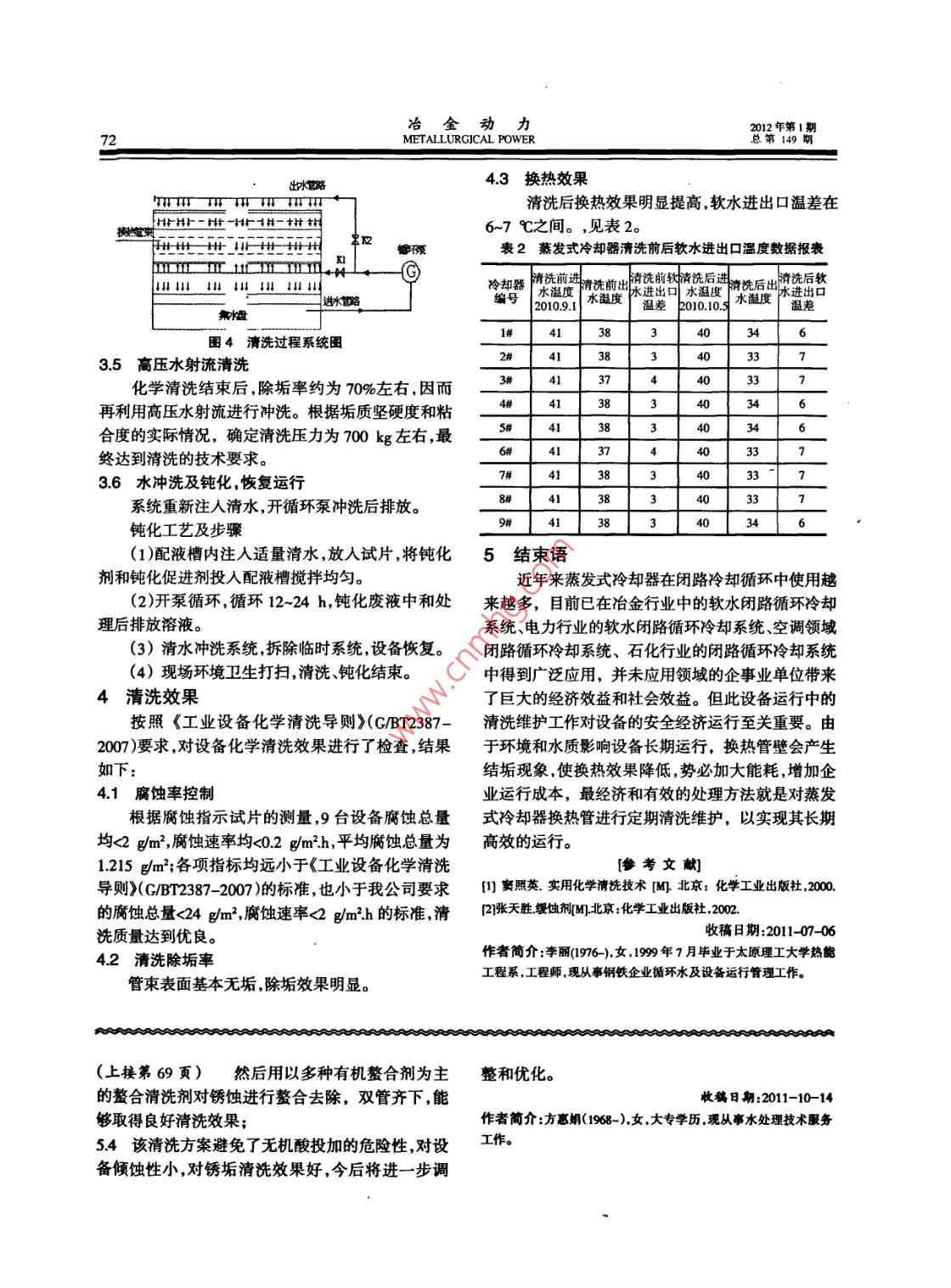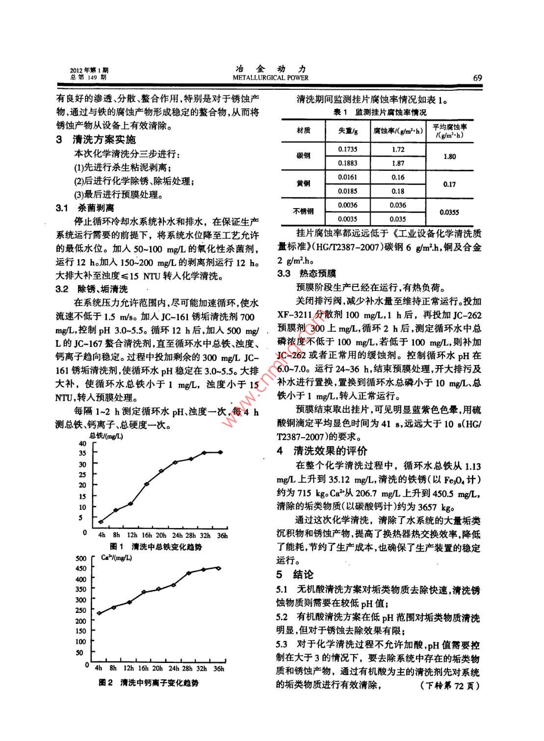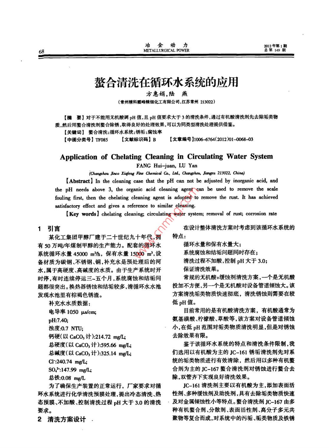 冶金動(dòng)力2012年第METALLURGICAL POWER總第149螯合清洗在循環(huán)水系統(tǒng)的應(yīng)用方惠娟,陸燕(常州精科霞峰精細(xì)化工有限公司江蘇常州21302)【摘要】對(duì)于不能用無(wú)機(jī)酸調(diào)pH值且pH值要求大于3的清洗條件,通過(guò)有機(jī)酸清洗劑先去除垢類(lèi)物質(zhì),然后用鳘合清洗劑鰲合除銹取得良好的處理效果,可以為同類(lèi)型清洗處理提供借鑒?!娟P(guān)鍵詞】鰲合清洗;循環(huán)水系統(tǒng);銹垢;腐蝕率【中圖分類(lèi)號(hào)】T085【文獻(xiàn)標(biāo)識(shí)碼】B【文章編號(hào)】006-6764(2012)01-0068-03Application of Chelating Cleaning in Circulating Water SystemFANG Hui-juan, LU Ya(Changzhou Jinco Xiafeng Fine Chemica Co, Lid, Changzhou, Jiangsu 213022, Chin[Abstract] In the cleaning case that the ph can not be adjusted by inorganic acid, andthe ph needs above 3, the organic acid cleaning agent can be used to removee scalefouling first, then the chelating cleaning agent is adopted to remove the rust. It has achievedsatisfactory effect and gives a reference to similar cleaning.I Key words] chelating cleaning; circulating water system; removal of rust; corrosion rate1引言在設(shè)計(jì)整體清洗方案時(shí)考慮到該循環(huán)水系統(tǒng)的某化工集團(tuán)甲醇廠建于二十世紀(jì)九十年代,擁特點(diǎn)有50萬(wàn)噸年煤制甲醇的生產(chǎn)能力。配套的循環(huán)水循環(huán)水量和保有水量大;系統(tǒng)循環(huán)水量45000m}/h,保有水量15000m3,設(shè)系統(tǒng)腐蝕和結(jié)垢問(wèn)題同時(shí)存在;備材質(zhì)為碳鋼、不銹鋼、銅補(bǔ)充水是預(yù)處理后的河清洗過(guò)程不加酸控制pH大于3.0;水,屬于高硬度、高堿度的水質(zhì)。由于生產(chǎn)系統(tǒng)時(shí)開(kāi)保證清洗效果。時(shí)停,有時(shí)連續(xù)停運(yùn)三~五個(gè)月,系統(tǒng)腐蝕和結(jié)垢問(wèn)常規(guī)的無(wú)機(jī)酸+緩蝕劑清洗方案,一個(gè)是無(wú)機(jī)酸題都很突出換熱器銹蝕和結(jié)垢較多清循環(huán)水水池投加不方便另一個(gè)是無(wú)機(jī)酸對(duì)設(shè)備管道傾蝕大。該發(fā)現(xiàn)水池里有棕褐色銹渣。方案清洗垢類(lèi)物質(zhì)快速?gòu)氐?清洗銹蝕則需要在較補(bǔ)充水水質(zhì)數(shù)據(jù):低p值。電導(dǎo)率1050μsem目前常用的是有機(jī)酸清洗方案,有機(jī)酸通常為pH:740;氨基磺酸、檸檬酸、草酸等,該方案對(duì)設(shè)備管道傾蝕濁度07NTU小,在低pH范圍對(duì)垢類(lèi)物質(zhì)清洗明顯但是對(duì)銹蝕鈣硬〔以CaCO3計(jì))21472mg/去除效果有限。總硬度(以CaCO3計(jì):59566mg/L鑒于該循環(huán)水系統(tǒng)的特點(diǎn)和清洗條件限制,我總堿度(以CaCO3計(jì)):32514mg/L們選用以有機(jī)酸為主的JC-161銹垢清洗劑先對(duì)系Ch:240.74mg/L統(tǒng)的垢類(lèi)物質(zhì)進(jìn)行有效清除,然后用以多種有機(jī)鰲SO2:14799mg/合劑為主的C-167鰲合清洗劑對(duì)銹蝕進(jìn)行螯合去總鐵008mg/L除,雙管齊下實(shí)現(xiàn)良好清洗效果。為了確保生產(chǎn)裝置的正常運(yùn)行,廠家要求對(duì)循JC-161清洗劑主要以有機(jī)酸為主,添加表面活環(huán)水系統(tǒng)進(jìn)行化學(xué)清洗預(yù)膜處理,提出冷態(tài)清洗、熱性劑、多種緩蝕劑及助洗劑,具有去除垢類(lèi)物質(zhì)快速態(tài)預(yù)膜、不加酸控制清洗過(guò)程pH大于30的清洗·及對(duì)金屬傾蝕性小等特點(diǎn)整合清洗劑JC-167由多要求。種有機(jī)螯合劑、分散劑、表面活性劑、高分子多元共2清洗方案設(shè)計(jì)聚物等復(fù)合而成,對(duì)系統(tǒng)中的污垢、垢類(lèi)物質(zhì)及鐵銹2012年第1期冶金動(dòng)力總第149期METALLURGICAL POWER有良好的滲透、分散、螯合作用,特別是對(duì)于銹蝕產(chǎn)清洗期間監(jiān)測(cè)掛片腐蝕率情況如表1。物通過(guò)與鐵的腐蝕產(chǎn)物形成穩(wěn)定的螯合物,從而將衰1監(jiān)測(cè)掛片腐蝕率情況銹蝕產(chǎn)物從設(shè)備上有效清除。材質(zhì)3清洗方案實(shí)施失重|腐蝕率/(bmh)平均腐蝕率本次化學(xué)清洗分三步進(jìn)行:0.17351.72碳鋼180(1)先進(jìn)行殺生粘泥剝離;0.18831.87(2)后進(jìn)行化學(xué)除銹除垢處理;001610.16黃銅0.17(3)最后進(jìn)行預(yù)膜處理。001850.183.1殺菌剝離不銹鋼00355停止循環(huán)冷卻水系統(tǒng)補(bǔ)水和排水,在保證生產(chǎn)000350035系統(tǒng)運(yùn)行需要的前提下,將系統(tǒng)水位降至工藝允許掛片腐蝕率都遠(yuǎn)遠(yuǎn)低于《工業(yè)設(shè)備化學(xué)清洗質(zhì)的最低水位。加入50-100mgL的氧化性殺菌劑,量標(biāo)準(zhǔn)》(HGT2387-200)碳鋼6gm3h,銅及合金運(yùn)行12h加入150-200mg的剝離劑運(yùn)行12h。2gm2h大排大補(bǔ)至濁度≤15NTU轉(zhuǎn)入化學(xué)清洗。33熱態(tài)預(yù)膜32除銹、垢清洗預(yù)膜階段生產(chǎn)已經(jīng)在運(yùn)行,有熱負(fù)荷。在系統(tǒng)壓力允許范圍內(nèi),盡可能加速循環(huán),使水關(guān)閉排污閥減少補(bǔ)水量至維持正常運(yùn)行。投加流速不低于1.5m/s。加入JC-161銹垢清洗劑700XF-32l1分散劑100mg,1h后,再投加Jc-262mgL,控制pH30-55循環(huán)12h后加入500mg/.預(yù)膜劑300上mgL,循環(huán)2h后測(cè)定循環(huán)水中總L的JC-167整合清洗劑,直至循環(huán)水中總鐵、濁度、磷濃度不低于100mgL,若低于100mg/L,則補(bǔ)加鈣離子趨向穩(wěn)定。過(guò)程中投加剩余的300 mg/L JC-JC-262或者正常用的緩蝕劑??刂蒲h(huán)水pH在161銹垢清