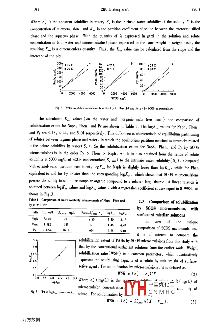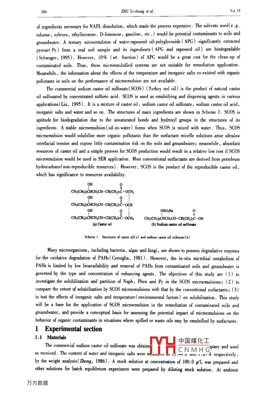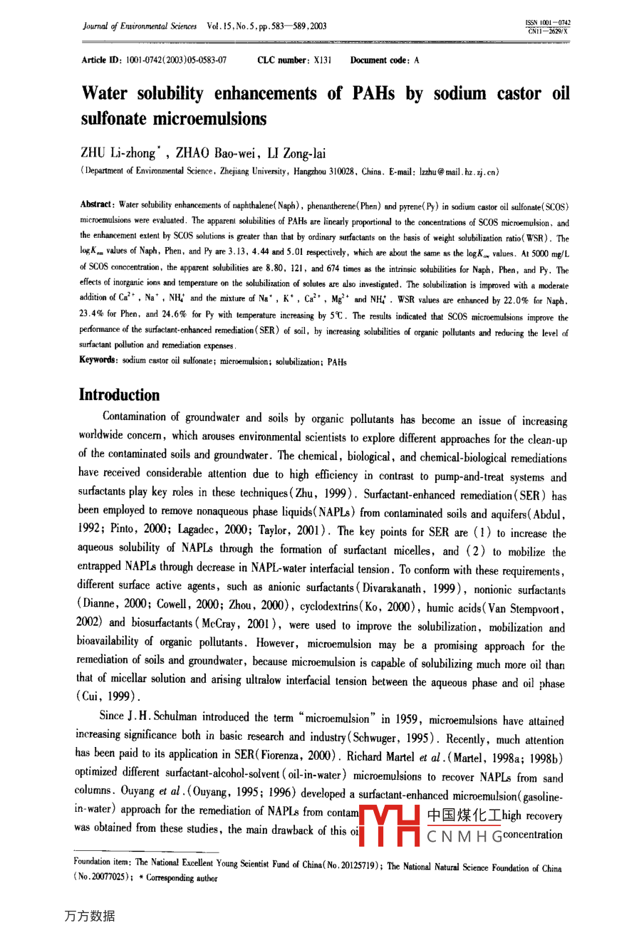 5001-022Journal of Enmaionmental SciencesVdl.IS,No.5.pp.583- -589 ,2003C011-5689XArticle ID: 101-0742(2003)05-0583-07CLC number: XI31Document code: AWater solubility enhancements of PAHs by sodium castor oilsulfonate microemulsionsZHU Li-zhong', ZHAO Bao-wei, LI Zong-lai(Dpartment o Enionental Science. Zhejiang Univenity, Hanghou 310028. Chin. E-mal: lzhu@ mil.h2. zj.cn)microemulsions were evaluated. The apparent slubities of PAHs are linearly proportional to the concentations of sCOS micremulsion, andthe enhancement etent by scOS slutions is greater than that by ordiny sufecants on the basis of weight slbilizainin ratio( WSR). TheogK. values of Naph, Phen, and Py are 3.13, 4.44 and 5.01 repecivedy, which are sbout the same 斯the logKw_ volues. AI 5000 Lof scos cncentation, the aparent slubities are 8.80, 121, and 674 times as the itinsic soubiti for Naph, Phen, and Py. Theefects of inorganic ioon and temperaure on the slbiliation of solutes are also ivestigted. The soubilizain is improved wih a moderaleaditionoCe2+.Na' . NH: and the mitureofNa* , K* ,Ca*, Mg* and NHL: . WSR values are cnhanced by 22.0% for Napb.23.4% for Phen, and 24.6% for Py with lempernture increasing by 5C . The results idicated that SCOS microemulsions improve thepefornmance of the sufoctant enhanced rediation(SER) of soil, by inereasing slubilitis of organie plulants and reducing the level afsurfactant pollution and remediation expenses.Keywords: sodium castor oil slfonate; microemulsion; slubilizationi PAHsIntroductionContamination of groundwater and soils by organic pollutants has become an issue of increasingworldwide concerm, which arouses environmental scientists to explore different approaches for the clean-upof the contaminated soils and groundwater. The chemical , biological ,and chemical-biological remediationshave received considerable atention due to high eficiency in contrast to pump-and-treat systems andsurfactants play key roles in these techniques( Zhu,1999). Surfactant enhanced remediation( SER) hasbeen employed to remove nonaqueous phase liquids( NAPLs) fom conlaminated soils and aquifers( Abdul,1992; Pinto, 2000; Lagade, 2000; Taylor, 2001). The key points for SER are (1) to increase theaqueous solubility of NAPLs through the formation of surfactant micelles, and (2) to mobilize theentrapped NAPIs through decrease in NAPL- water interfacial tension. To conform with these requirements,different surface active agents, such as anionic surfactants ( Divarakanath, 1999), nonionic surfactants(Dianne, 2000; Cowell, 2000; Zhou, 2000) ,cyclodextrins( Ko, 2000), humic acids( Van Stempoot,002) and biosurfactants( McCray, 2001), were used to improve the solubilzation, mobilization andbioavailability of organic pollutants. However, microemulsion may be a promising approach for theremediation of soils and groundwater, because microemulsion is capable of solubilizing much more oil thanthat of micellar solution and arising ultralow interfacial tension between the aqueous phase and oil phase(Cui, 1999).Since J. H. Schulman introduced the term“microemulsion" in 1959 , microemulsions have atainedincreasing significance both in basic research and industry ( Schwuger, 1995). Recently, much attentionhas been paid to its application in SER( Fiorenza, 2000). Richard Martel et al . (Martel, 1998a; 1998b)optimized different surfactant-alcohol-solvent ( oil- in- water ) microemulsions to recover NAPLs from sandcolumns. Ouyang et al .(Ouyang, 1995; 1996) developed a surfactant- enhanced microemulsion( gasoline-in- water) approach for the remediation of NAPLs from contam中國煤化工high recoverywas obtained from these studies , the main drawback of this:MYHC N M H GconcentationFoundalion ite: The Nationl Exellent Young Seientint Fund d Chin(No. 20125719); The National Natuni Science Foundeion odf China(No20077025); * Corespnding suthor584ZHU Lizhong et al .Vol. 15of ingrediens necessary for NAPL disolution, which made the process expensive. The solvents used(e.g.toluene, xyenes, ethybenzene, D-limonene, gasoline, etc. ) would be potential contaninants to soils andgroundwater. A temary microemulsion of water-rapeseed oil-polyglycoside ( APG) significantly extractedpyrene(Py) from a real soil sample and its ingredients (APG and rapeseed oil ) are bioderadable(Schwuger, 1995). However, 10% (wt. fraction) of APG would be a great cost for the clean-up ofcontaminated soils. Thus, these microemulsified systems are not suitable for remediation application.Meanwhile , the information about the efects of the temperature and inorganic salts co-existed with organicpollutants in soils on the performance of microemulsion are not available .The conmercial sodium castor oil sulfonate(SCOS) (Turkey red oil) is the product of natural castoroil sulfonated by concentrated sulfuric acid. SCOS is used as emulsifying and dispersing agents in variousapplications(Liu, 1995). It is a mixture of castor oil, sodium castor oil sulfonate , sodium castor oil acid,inorganic salts and water and so on. The structures of main ingredients are shown in Scheme 1. SC0S isaptitude for biodegradation due to the unsaturated bonds and hydroxyl groups in the structures of itsingredients. A stable microemulsion( oil-in-water) forms when SCOS is mixed with water. Thus, SCOSmicroemulsion would solubilize more organic pollutants than the surfactant micelle solutions arise ultralowinterfacial tension and expose litle contamination risk on the soils and groundwater; meanwhile, abundantresources of castor oil and a simple process for SCOS production would result in a relative low cost if SCOSmicroemulsion would be used in SER application. Most conventional surfactants are derived from petroleumhydrocarbans( non-reproducible resources). However, SCOS is the product of the reproducible castor oil,which has significance to resources availability .)HCH:(CH)xCHCH2CH=CH(CH)C-OCH2CH2(CH)CHCH2CH-CH(CH)C-OCHOSO)Na0CH2(CH2)CHCH2CH=CH(CH2)C-0CH2CH;(CH2)sCHCH2CH=CH(CH)C-OI(@)Casto