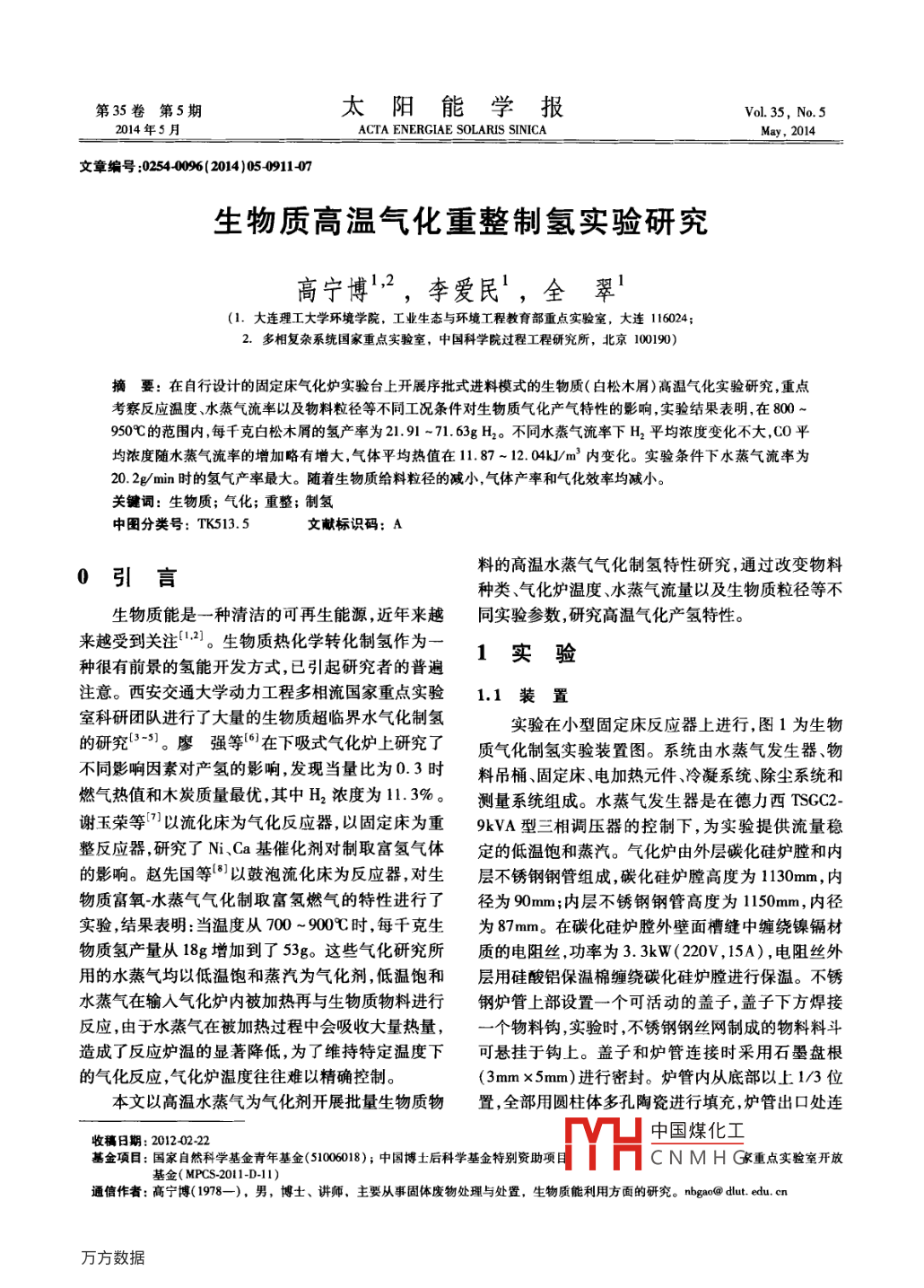 生物質(zhì)高溫氣化重整制氫實(shí)驗(yàn)研究