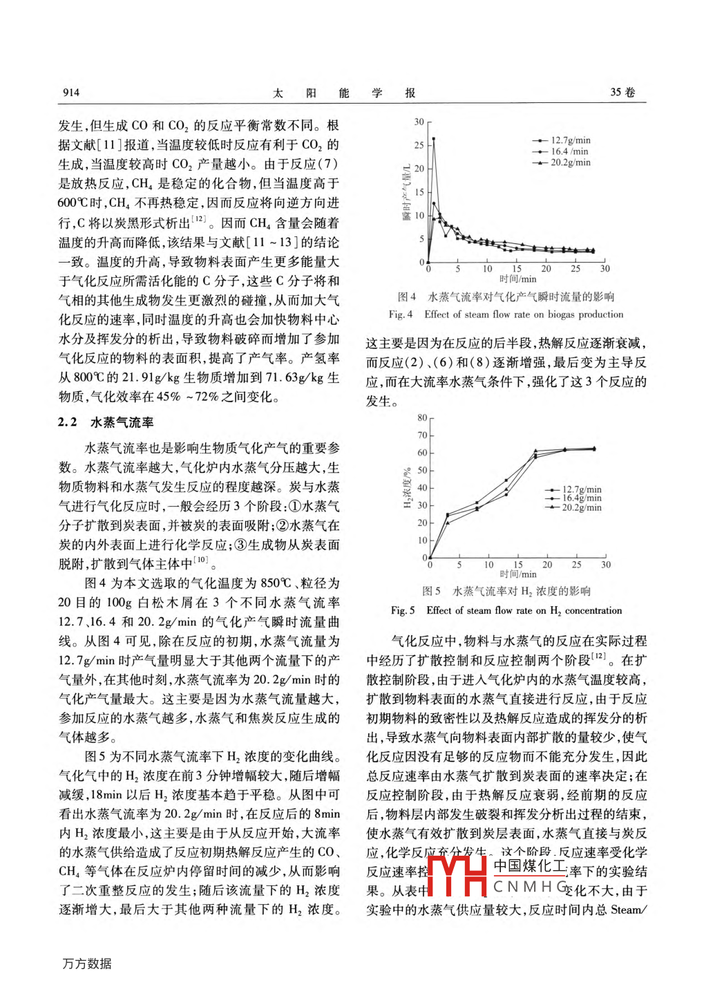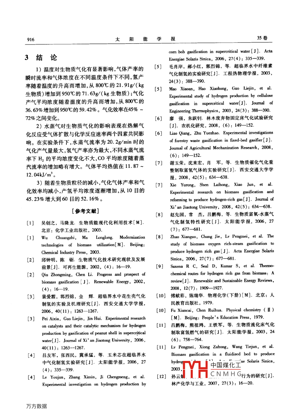 第35卷第5期太陽(yáng)能學(xué)報(bào)Vol 35. No 52014年5月ACTA ENERGIAE SOLARIS SINICAMay,2014文章編號(hào):0254006(2014)0509110生物質(zhì)高溫氣化重整制氫實(shí)驗(yàn)研究高寧博12,李愛(ài)民1,全翠(1.大連理工大學(xué)環(huán)境學(xué)院,工業(yè)生態(tài)與環(huán)境工程教育部重點(diǎn)實(shí)驗(yàn)室,大連116024;2.多相復(fù)雜系統(tǒng)國(guó)家重點(diǎn)實(shí)驗(yàn)室,中國(guó)科學(xué)院過(guò)程工程研究所,北京100190)摘要:在自行設(shè)計(jì)的固定床氣化爐實(shí)驗(yàn)臺(tái)上開(kāi)展序批式進(jìn)料模式的生物質(zhì)(白松木屑)高溫氣化實(shí)驗(yàn)研究,重點(diǎn)考察反應(yīng)溫度、水蒸氣流率以及物料粒徑等不同工況條件對(duì)生物質(zhì)氣化產(chǎn)氣特性的影響,實(shí)驗(yàn)結(jié)果表明,在800950℃的范圍內(nèi),每千克白松木屑的氫產(chǎn)率為2191-71.63gH2。不同水蒸氣流率下H2平均濃度變化不大C0平均濃度隨水蒸氣流率的增加略有增大,氣體平均熱值在11.87~12.04kJ/m3內(nèi)變化。實(shí)驗(yàn)條件下水蒸氣流率為20.2g/min時(shí)的氫氣產(chǎn)率最大。隨著生物質(zhì)給料粒徑的減小,氣體產(chǎn)率和氣化效率均減小。關(guān)鍵詞:生物質(zhì);氣化;重整;制氫中圖分類號(hào):TK513.5文獻(xiàn)標(biāo)識(shí)碼:A0引言料的高溫水蒸氣氣化制氫特性研究,通過(guò)改變物料種類、氣化爐溫度、水蒸氣流量以及生物質(zhì)粒徑等不種很有前景的氫能開(kāi)發(fā)方式已引起研究者的群1實(shí)分高溫氣化產(chǎn)氫特性。生物質(zhì)能是一種清潔的可再生能源,近年來(lái)越同實(shí)驗(yàn)參數(shù),研來(lái)越受到關(guān)注2。生物質(zhì)熱化學(xué)轉(zhuǎn)化制氫作為注意。西安交通大學(xué)動(dòng)力工程多相流國(guó)家重點(diǎn)實(shí)驗(yàn)1.1裝置室科研團(tuán)隊(duì)進(jìn)行了大量的生物質(zhì)超臨界水氣化制氫實(shí)驗(yàn)在小型固定床反應(yīng)器上進(jìn)行,圖1為生物的研究-”)。廖強(qiáng)等“在下吸式氣化爐上研究了質(zhì)氣化制氫實(shí)驗(yàn)裝置圖。系統(tǒng)由水蒸氣發(fā)生器物不同影響因素對(duì)產(chǎn)氫的影響,發(fā)現(xiàn)當(dāng)量比為0.3時(shí)料吊桶、固定床、電加熱元件、冷凝系統(tǒng)、除塵系統(tǒng)和燃?xì)鉄嶂岛湍咎抠|(zhì)量最優(yōu),其中H2濃度為13%。測(cè)量系統(tǒng)組成。水蒸氣發(fā)生器是在德力西TSGC2謝玉榮等以流化床為氣化反應(yīng)器以固定床為重9kVA型三相調(diào)壓器的控制下,為實(shí)驗(yàn)提供流量穩(wěn)整反應(yīng)器研究了N、Ca基催化劑對(duì)制取富氫氣體定的低溫飽和蒸汽。氣化爐由外層碳化硅爐膛和內(nèi)的影響。趙先國(guó)等以鼓泡流化床為反應(yīng)器,對(duì)生層不銹鋼鋼管組成,碳化硅爐膛高度為1130m,內(nèi)物質(zhì)富氧水蒸氣氣化制取富氫燃?xì)獾奶匦赃M(jìn)行了徑為90mm;內(nèi)層不銹鋼鋼管高度為1150mm,內(nèi)徑實(shí)驗(yàn),結(jié)果表明:當(dāng)溫度從700~900℃時(shí),每千克生為87mm。在碳化硅爐膛外壁面槽縫中纏繞鎳鎘材物質(zhì)氫產(chǎn)量從18g8增加到了53g。這些氣化研究所質(zhì)的電阻絲,功率為3.3kW(220V,15A),電阻絲外用的水蒸氣均以低溫飽和蒸汽為氣化劑,低溫飽和層用硅酸鋁保溫棉纏繞碳化硅爐膛進(jìn)行保溫。不銹水蒸氣在輸入氣化爐內(nèi)被加熱再與生物質(zhì)物料進(jìn)行鋼爐管上部設(shè)置一個(gè)可活動(dòng)的蓋子,蓋子下方焊接反應(yīng),由于水蒸氣在被加熱過(guò)程中會(huì)吸收大量熱量個(gè)物料鉤,實(shí)驗(yàn)時(shí),不銹鋼鋼絲網(wǎng)制成的物料料斗造成了反應(yīng)爐溫的顯著降低,為了維持特定溫度下可懸掛于鉤上。蓋子和爐管連接時(shí)采用石墨盤根的氣化反應(yīng),氣化爐溫度往往難以精確控制(3mm×5mm)進(jìn)行密封。爐管內(nèi)從底部以上1/3位本文以高溫水蒸氣為氣化劑開(kāi)展批量生物質(zhì)物置,全部用圓柱體多孔陶瓷進(jìn)行填充,爐管出口處連收稿日期:20120222H中國(guó)煤化工基金項(xiàng)目:國(guó)家自然科學(xué)基金青年基金(51006018);中國(guó)博土后科學(xué)基金特別資助項(xiàng)CNMH重點(diǎn)實(shí)驗(yàn)室開(kāi)放基金(MPCS2011-D-11)通信作者:高寧博(1978-),男,博士、講師,主要從事固體廢物處理與處置,生物質(zhì)能利用方面的研究。nagao@dut.edu.cn912太陽(yáng)能學(xué)報(bào)35卷接一個(gè)進(jìn)氣管,水蒸氣從進(jìn)氣管輸入不銹鋼爐管。氣化爐溫度達(dá)到設(shè)定溫度后,將物料斗放人氣化爐不銹鋼爐管頂部向下100mm處開(kāi)有一個(gè)30mm的迅速將氣化爐的蓋子扣上,確保接口處不漏氣。同排氣孔,反應(yīng)產(chǎn)生的氣體通過(guò)此孔進(jìn)入保溫管中,保時(shí)將水蒸氣通入氣化爐底部。溫管和重整室相連接,重整室是和氣化爐結(jié)構(gòu)相同氣化產(chǎn)生的氣體從重整室排出后,先通過(guò)一個(gè)的圓柱形爐膛,爐膛內(nèi)部全部填充有多孔陶瓷體,在球形水冷凝器,冷凝下來(lái)的焦油通過(guò)牛角彎管流入重整室的下部,裝有排氣孔,反應(yīng)產(chǎn)生的氣體最終從接液瓶中。未冷凝的氣體接著通過(guò)水洗瓶,以去除這里排出。重整室和冷凝管相連接,實(shí)驗(yàn)時(shí),水泵將氣化氣中攜帶的煙塵、未被冷凝的焦油以及氣化氣0℃的水打入冷凝管進(jìn)水口,對(duì)