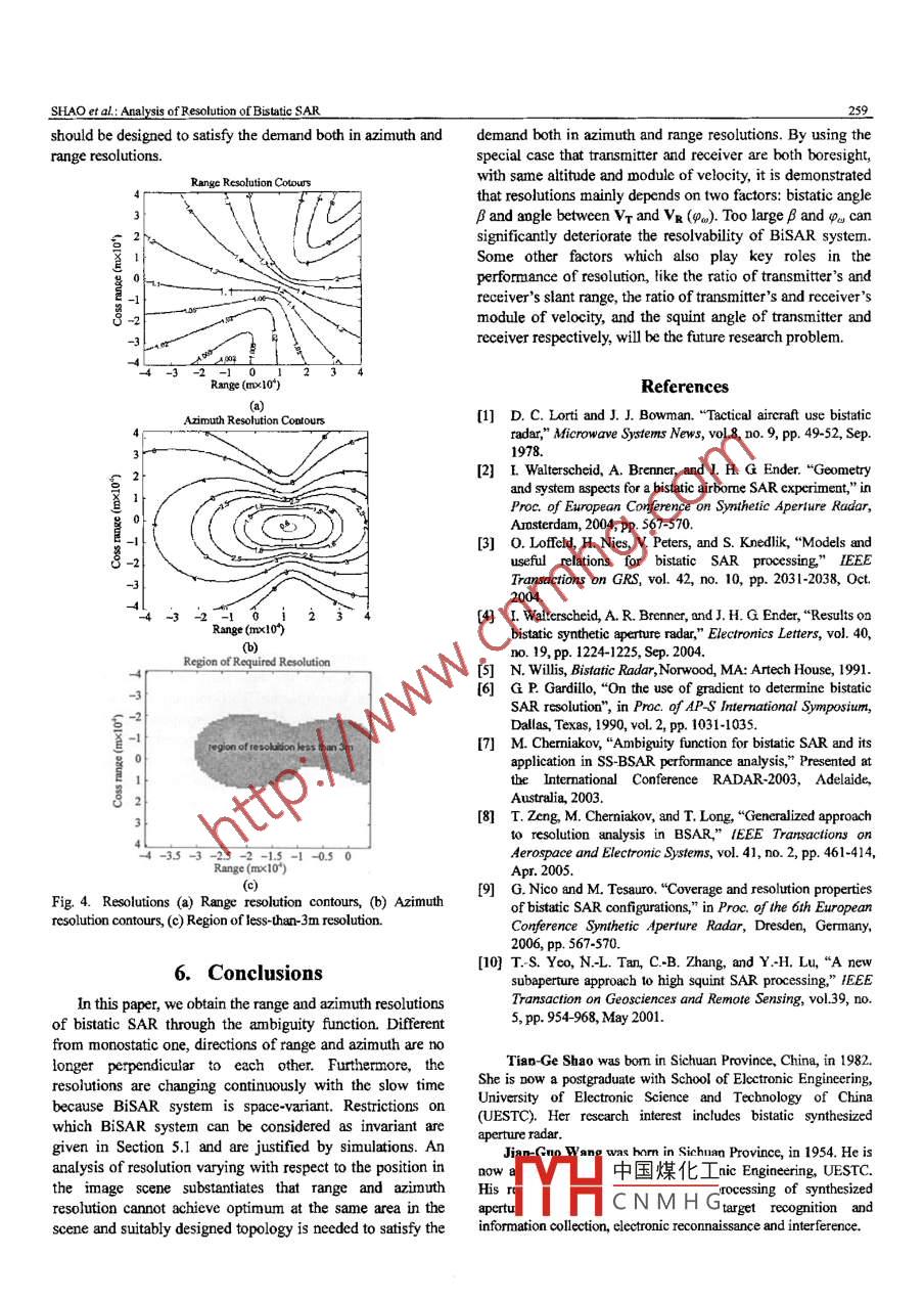 JOURNAL OF BLECTRONIC SCIENCBAND TECHINOLOGY OF CHINA VoL. 5, NO.3, SEPTEMBER 2007.255Analysis of Resolution of Bistatic SARTian-Ge Shao and Jian-Guo WangAbstract - - In this paper, the spatial resolutions at2. Bistatic SAR Geometrydifferent directions of bistatic synthetic aperture radarThe geometrical situation of BiSAR is sketched in Fig. 1.(BiSAR) bave been derived from the ambiguity function.Coapared wit monostaic sigal to noise rnto BiSAR's In retanglar cordinate %, VT and Vk represes theresolutions of a fixed point target are varying with slowvelocity vector of the transmitter and receiver respectively,time since BiSAR system is space-variant. Constraints forUr and URo are the position vectors of transmitter andthe assumption of space-invariant bistatic topology arereceiver, respectively, pointing to the center of the aperture. Pproposed in the paper. Moreover, under the assumption ofrepresents the position of the target point of interest.invariance, the chaoge of resolutions at different point inthe image scene is taken into account, and we havespecified two key parameters that affect resolutionsUnpVdirectly and analyzed the way how they infuence on theresolutions.Uan↑Index Terms- Ambiguity function, bistatic SAR,resolution.1. IntroductionThe rescarches of bistatic synthetic aperture radar(BiSAR) in last decade have attracted more and moreFig 1. Bistatic SAR geometry.attentions over the world, due to its predominant advantagesto monostatic one. Spatial resolution, as one of the crucialAccording to the stop-and-go approximation, the pointparameters of bitatic signal t如o noise ration sytem, is target response can be dsecried by slow time u and fast timediscussed in []-[4]. In [S], the resolution of BiSAR ist. Similarly, for the veiocities of transmitters and receiversdescribed with a simple geometry, which is only applicableare far smaller than the electronic propagation speed, Ur andfor the stationary or parallel mode. In [6], a method on theUr, which is the instantaneous position of transmitter anduse of gradient is brought out and can be applied to thereceiver with respect to slow time, can be represented asgeneral configurations. In [7] and [8], radar function andfollows:ambiguity function for BiSAR has been discussed. OpposedUr(u)=Uro(u)+uVx, Ux(u)=Uqo(u)+tuVx .to monostatic one, BiSAR configuration is spatially shiftedLet the transmitted signal be s(t)=H()exp(2x[2), fc beand its resolution is correspondingly space-shifted and time-carrier frequency, h([) be the complex envelope and theshifted. In this paper, spatial resolutions are deduced fromreceived signal from the point P can be expressed as:ambiguity function and a comprehensive insight into theproblem of resolutions is obtained through deep researchesf(t,u)= h(t-Fp)exp( -j2ttp).1)on the most influential factors of resolution. Firstly, thewhereresolutions at different directions are derived from ambiguityr,(1)==|p - U(2)+|P -U(a).function. Then the constraints for assumption of invariantsystem are put forward and region of required resolution inDoppler frequency without expansion is represented as:the image scene is demonstrated to tally depend on BiSARUro-PURo-P ]topology. Finally, the paper has specified the key parametersthat afect the resolution diretly and the way in which theyUro-P|VR Uo-」infuence on the resolution.中國煤化工Manuscript received July 2, 2006, revised October 10, 2006.The authorsare 、; School of Electronic Enginoering, University ofYHCNMHdyFunctionTheAccording to the definition of ambiguity function in [3],Electronic Science and Technology of China (UESTC), Chengdu, 610054,China. (-mails: swectpigeon@163 .com, jgwang@uestc .edu .cn).we can get expression of ambiguity function:JOURNAL OF ELECTRONIC SCIENCE AND TECHNOLOGY OF CHINA, VOL. s, NO.3, SEPTEMBER 2007g(a) is used to note the integral in (8), thenx(P,P)=-小]IGC.N dJJjCn dug(J)= Jexp[2nJju]du = sinc(rLf).(9Suppose (-Lew2|Vzl, Lex/2|VR|) to be the range of(3)integrating and Ler be the effective coherent integration time,determined by bistatic configuration, including the aperturelength and velocities of both transmitter and receiver.where P is an arbitrary point near the point P. fe(,u) andDifferent situations lead to different Ler which are cormplexfr(,u) are the received signals from P and P, respectively.and discussed as a separate problem in [9].Equation (3) shows that the ambiguity function is theAssume that transmitted signal is a narrow band signalcorrelation coefficient of the response of two point targets.and the frequency spectrum is narrow enough for P() toIn frequency domain, ambiguity function can be describedsuppose the first integral in (4) can be approximated as:asx(P,P)=2PC)xp[j2nf(r(u)-T(u){(國) is used to note the integral in (10), thenP()= jP(/)exp[j2nftJ]df.(11)xJexp[j2rf(Tp(2)- T(u)]du(4)Obviously, the first integral in (4) can be considered as thewhere PO) is the power spectrum of the transmitted signal.inverse Fourier transform of p(a) In other words, becauseThe first integral in (4) is caused by the complex envelope ofP(f) is the frequency spectrum of transmitted signals, p(a) istransmitted signal, while the latter integral is caused by thethe auto correlation of the complex envelope of thecarrier fequency. To simplify the ambiguity function, severaltransmitted signal H().From the above analysis, we can obtain the followassumptions can be made as follows on which all theequation as simplified bistatic ambiguity function:first-order Taylor expansion in the following text are based on|P|<|Uro|,|P|<|URo|, Lp<|Uxo| and L <|Uol.x(P,P)=. p()8UfJ)exp[j2nftJ].(12)LR and LT are the length of transmiting and receivingThe spatial resolution is mainly determined by the amplitudeantenna apertures, respectively.factor in (12).For convenience of expression, several definitions aremade.4. Bistatic SAR Resolution1) u is the time delay diference between two target pointsFrom (12), it is obviously that p(國) corresponds to t