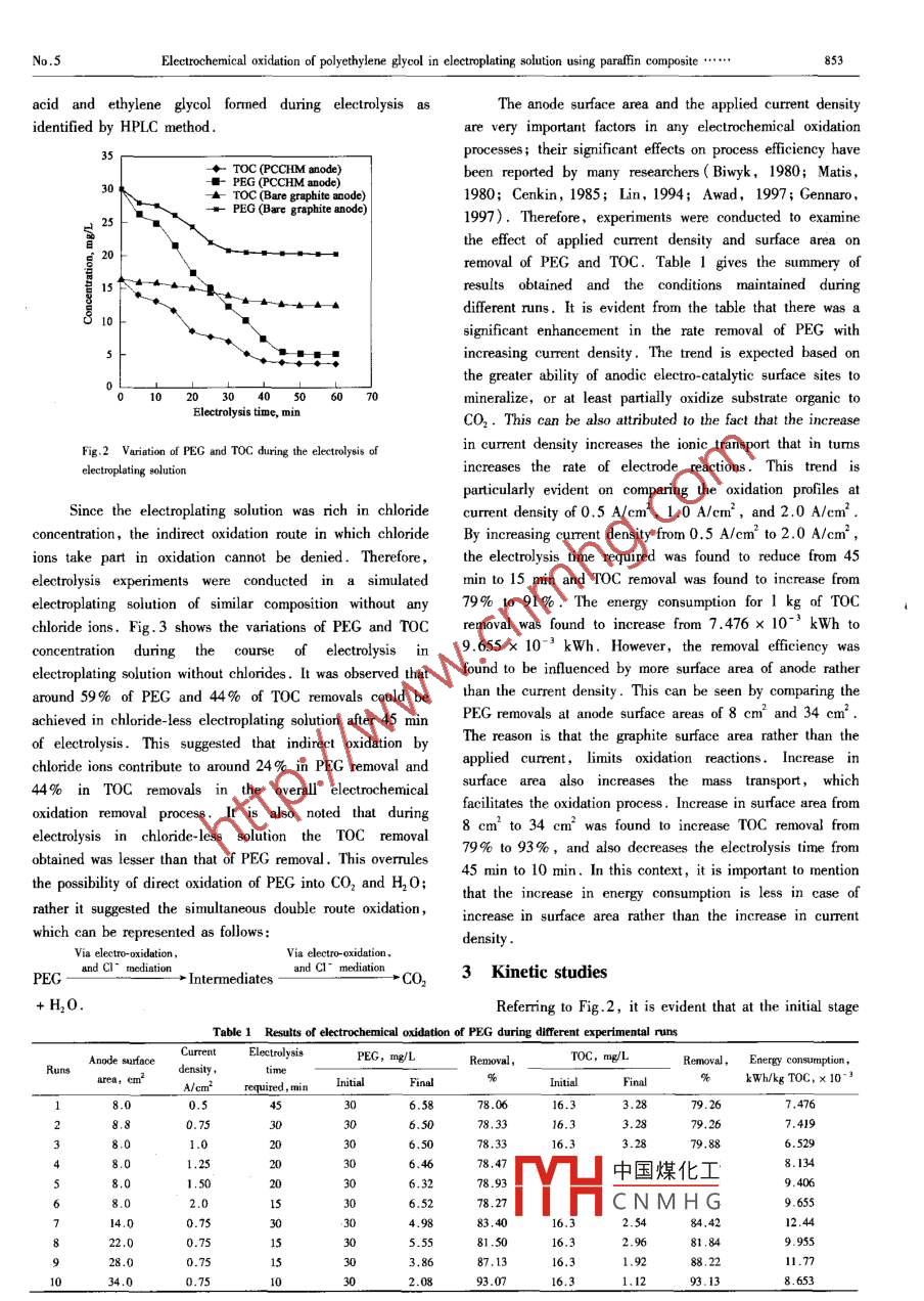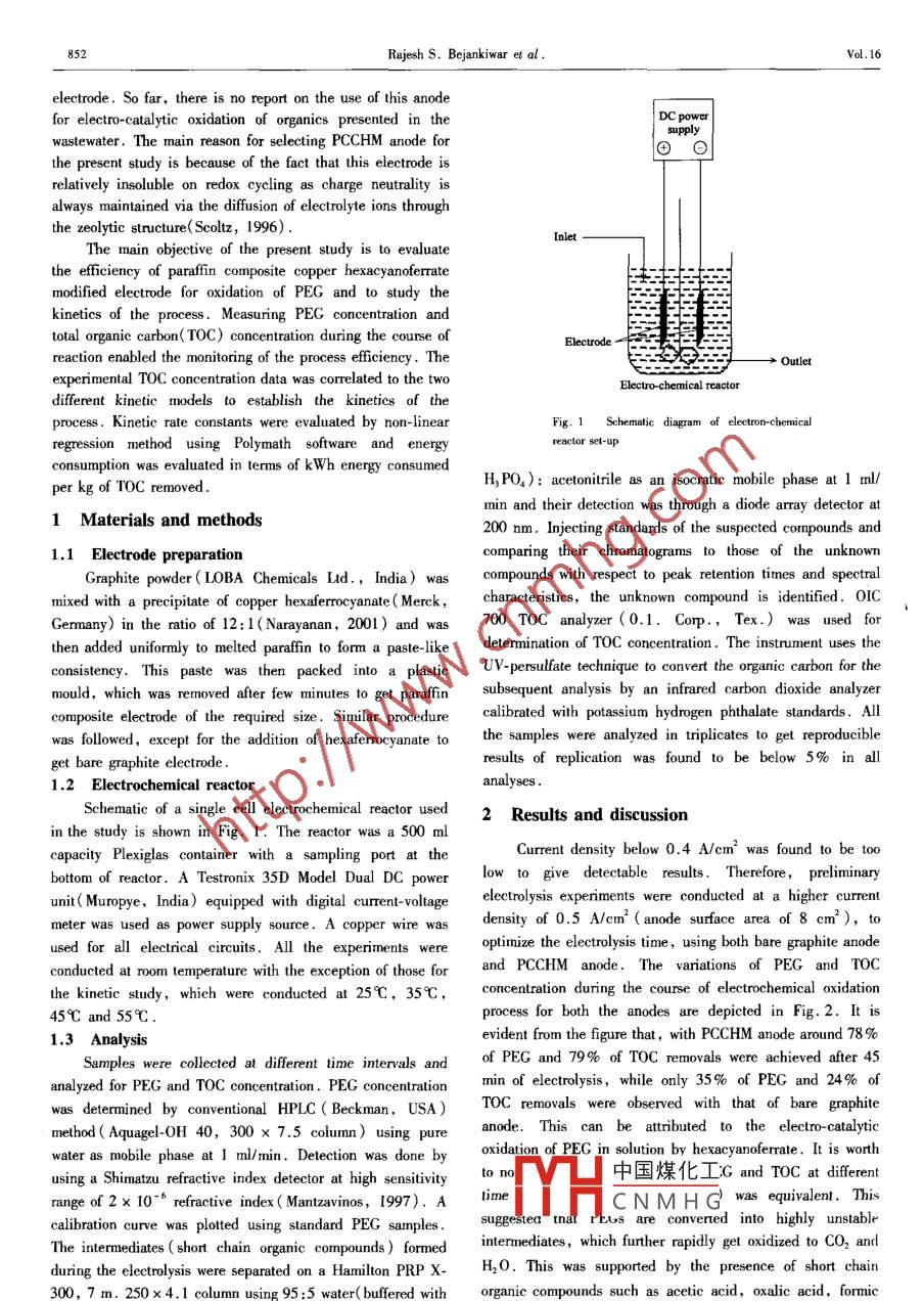 Jounal of Enirormental Sciences Vol. 16, No.5,pp. 851- 855 ,2004ISN 100742Article ID: 101-0742(2004)05-0851-05CLC number: X131Document code: AElectrochemical oxidation of polyethylene glycol in electroplating solution usingparafin composite copper hexacyanoferrate modified ( PCCHM) anodeRajesh S. Bejankiwar ”,Abir Basu, Max Cementi(Department of Civil and Environmental Engineering, University of Windsor, Windsor, Ontario N9B 3P4, Canada. E mail: bejanki @ uwindsor . ca)Abstract: Electrochemical oxidation of polyethylene glycol(PEG) in an acidic(pH 0.18 to 0.42) and high ionicstrength electroplating solution was investigated. The electroplating solution is a major source of wastewater in theprinting wiring board industry. A paraffin composite copper hexacyanoferrate modified( PCCHM) electrode was usedas the anode and a bare graphite electrode was used as the cathode . The changes in PEG and total organic carbon(TOC) concentrations during the course of the reaction were monitored. The efciency of the PCCHM anode wascompared with bare graphite anode and it was found that the former showed significant electrocatalytic property ftorPEG and TOC removal . Chlorides present in the solution were found to contribute significantly in the overall organicremoval process. Short chain organic compounds like acetic acid, oxalic acid, formic acid and ethylene glycolformed during electrolysis were identified by HPLC method. Anode surface area and applied current density werefound to infuence the electro- oxidation process, in which the former was found to be dominating. Investigations ofthe kinetics for the present electrochemical reaction suggested that the two stage first-order kinetic model provides amuch better representation of the overall mechanism of the process if compared to the generalized kinetic model .Keywords: polyethylene glycol( PEG ); paraffin composite copper hexacyanoferrate modified( PCCHM) electrode;electroplating solution; two stage first order kinetic model; generalized kinetic modelozone/UV radiation has been reported ( Chang, 2001 ),butIntroductionthis method appears to be uneconomical in both installationA highly acidic electroplating solution (pH 0.18 tond operation. Also, other advanced oxidation processes0.42) with high ionic strength is a major wastewater source in(AOP's) like Fenton's reagent, H202/03 and H2O2/UVthe printing wiring board ( PWB) industry. The chemicaloxidation, photocatalytic oxidation, gamma iradiation andcomposition of the recipe solution ( sulfuric acid of 60 g/L,ultrasound technique though scienifically feasible are noCuSO, .5H20 of 200 g/L and 0.03 g/L of chlorides) makes iteconomicaly suitable for wastewater treatment ( Gulyas ,difficult to treat with conventional treatment processes1997). The limiting factors for using conventional treatment(Suzuki,1976; Andreozi, 1996a). Also, the chemicalmethods, namely, high acidity and ionic strength can becoagulation method, presently adopted by the industries is notadvantageous for the electrochemical oxidation method. Ina viable method due to a large amount of hazardous chemicalsuch situations electrochemical oxidation technique appears tosludge ( containing very high concentration of Cu2* ions )be an ideal method for decomposition of PEG in electroplatingproduced during the treatment. Recycling or reuse of thesolution. A high salinity wastewater with 5% w/w chloridessolution is inhibited because of the low quality of organicswas treated electrochemically to remove organie pollutantspresent after electroplating and electrophoresis . Therefore,( Sheng,1998). Also, high strength wastewaters fromremoval of spent organics in order to add new additives is onedifferent industries were treated successfully at lab scale byof the very important steps for the neutralization processresearchers( Vlyssides,1997;Canozares,2002; .(Chang, 2001).Bejankiwar, 2003; Bunce, 2003 )Polyethylene glycols ( PEG: H-( 0CH2CH2).-0H) areIn this study, we have carried out the electrochemicalmajor organic compounds used as brightening and stabilizingoxidation of PEG in a simulated solution( similar to the recipeagent during eletroplating process(Fang,1996). It is anof electroplating solution of PWB industry ) using parafnimportant group of non-ionic synthetic water-soluble polymerscomposite copper hexacyanoferrate modified ( PCCHM )of ethylene oxide. Several studies have been performed on theelectrode. PCCHM anode has been used extensively in electrobiodegradability of PEC' s in water since biological oxidationchromic devices, power sources, ion-selective electrodes anis generally considered the most environmentally friendly andelectro catalysis . Composite electrodes comprising of graphitecheapest method of wastewater treatment ( Haines,1975;powder中國(guó)煤化工hexaerocyanoferatesWatson, 1976, Dwyer, 1983). However, as mentionedhave alsletermination of alkaliFYHCNMH Gearlier,biological treatment cannot work in such highly acidicmetalionsand for pHand high ionic strength solutions .measurements. Narayanan and Deepa ( Narayanan,2001 )Decomposition of PEC in electroplating solution byhave explained in detail the widespread use of PCCHM* Corresponding author852Rajesh s. Bejankiwar et al .Vol. 16electrode. So far, there is no report on the use of this anodefor electro-catalytic oxidation of organics presented in theDC powersupplywastewater. The main reason for selecting PCCHM anode for田日the present study is because of the fact that this electrode isrelatively insoluble on redox cycling as charge neutrality isalways maintained via the diffusion of electrolyte ions throughthe zeolytic structure( Scoltz, 1996) .InletThe main objective of the present study is to evaluatethe eficiency of paraffin composite copper hexacyanoferratemodified electrode for oxidation of PEG and to study thekinetics of the process . Measuring PEG concentration andtotal organic carbon(TOC) concentration during the course ofElectrodereaction enabled the monitoring 