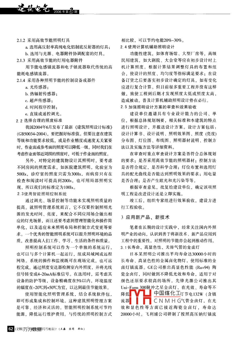摘要闡述了綠色照明的理建筑照明與節(jié)能設(shè)計那棵行了工程實(shí)例的分析。王鑫張萌席紅(北京堿建設(shè)計研究總院100037)關(guān)鍵詞綠色照明節(jié)能照度照明控制隨著照明技術(shù)的進(jìn)步和變革,以及人們對物質(zhì)2.1節(jié)能燈具的使用生活需要的不斷增長,對電氣照明的要求也越來越節(jié)能燈具指消耗較少的電能而達(dá)到較高的光照嚴(yán)格。我國照明標(biāo)準(zhǔn)也隨之變化。適當(dāng)提高原標(biāo)準(zhǔn)效果的照明產(chǎn)品,如直管型熒光燈、緊湊型熒光燈的照度水平,與國際標(biāo)準(zhǔn)接軌;提高照明質(zhì)量,采等。用國際上先進(jìn)的照明質(zhì)量指標(biāo)等措施,總之力求技術(shù)光通維持率是指燈在規(guī)定的條件下燃點(diǎn),燈在先進(jìn)、經(jīng)濟(jì)合理、使用安全和維護(hù)方便,達(dá)到節(jié)約能壽命期間內(nèi)特定時間的光通量與該燈的初始光通量源、保護(hù)環(huán)境和提高照明環(huán)境質(zhì)量水平的目的。之比,以百分?jǐn)?shù)來表示。國標(biāo)要求:2000h不小于78%;國際先進(jìn)水平:2000h不小于90%;美國能源1綠色照明的理念之星:40%額定壽命時不小于80%。綠色照明是指通過科學(xué)的照明設(shè)計,采用效率從理論上講,照明用電量(L)可用下式表示高、壽命長、安全和性能穩(wěn)定的照明電器產(chǎn)品(電L=WTx(EA/FK)= EAT/(Km)光源、燈用電器附件、燈具、配線器材,以及調(diào)光式中:W——每一臺燈具消耗的電功率,kW/臺控制器和控光器件),改善提高人們工作、學(xué)習(xí)、生T—開燈時間,h;活的條件和質(zhì)量,從而創(chuàng)造一個高效、舒適、安全、E—平均設(shè)計照度,lx經(jīng)濟(jì)、有益的環(huán)境并充分體現(xiàn)現(xiàn)代文明的照明。A—地板面積美國于1991年1月首先提出綠色照明計劃,美每臺燈具的燈泡流明,lm國環(huán)保署的目標(biāo)是通過照明效率,減少一半照明電K—維護(hù)系數(shù);量,減少空氣污染。同時在稅收上對促進(jìn)節(jié)能設(shè)施T燈泡的綜合效率(F/W)。的投資采取優(yōu)惠措施?!熬G色照明工程( Green因此,欲降低照明電耗,必須設(shè)法使用高效燈Lights Program)”的概念,很快得到聯(lián)合國的支持泡,提高燈具的維護(hù)率;或者減少開燈吋間、保持和許多國家的重視,并積極制定相應(yīng)的政策和技術(shù)適當(dāng)?shù)恼斩群捅M量采用局部照明等。但是,照明節(jié)措施,推進(jìn)綠色照明工程的實(shí)施和發(fā)展。1993年11能的原則是在保證足夠的照明亮度和質(zhì)量的前提下月我國國家經(jīng)貿(mào)委開始啟動中國綠色照明工程,并于節(jié)約能源。所以,選擇合理照度(E)、高效燈泡流1996年正式列入國家計劃。自1996年中國綠色照明明(F)和提高綜合效率(η)、加強(qiáng)運(yùn)行管理等期工程實(shí)施以來,高效照明產(chǎn)品正在被越來越多的對于建筑照明節(jié)能具有非常重要的意義。人所認(rèn)識,特別是在商貿(mào)、服務(wù)行業(yè),如大型公共場2.1.采用高效節(jié)能的電光源所、賓館飯店、大型寫字樓、政府辦公樓等得到了廣a.用鹵鎢燈取代普通照明白熾燈(節(jié)電50%~泛的使用,取得了良好的節(jié)能環(huán)保效益和社會效益。60%);2照明節(jié)能的具體方案b.用自鎮(zhèn)流單端熒光燈取代白熾燈(節(jié)電70%80%);照明節(jié)能的原則是,必須在保證照明數(shù)量和質(zhì)扛A宀如燈和直管型熒光燈量的前提下,盡可能節(jié)約照明用電。的升中國煤化工遵循這一原則,筆者在長期的設(shè)計、施工配合工CNMHG化物燈的應(yīng)用作中,積累了一定的經(jīng)驗(yàn),總結(jié)了幾點(diǎn)切實(shí)可行的措e.低壓鈉燈的應(yīng)用;施與方案,可較好地解決照明節(jié)能問題,現(xiàn)介紹如下。f.推廣高效發(fā)光二極管(LED)的應(yīng)用鍵我照明與節(jié)能沒計(王各張席紅)(157)61電2006年第)期1212采用高效節(jié)能照明燈具相比較,可以節(jié)約電能20%-30%,a.選用高反射率高純電化鋁制底反射器的燈具;2.4使用計算機(jī)輔助照明設(shè)計b.選用與光源、電器附件協(xié)調(diào)配套的燈具功能性建筑,如體育場館、大型廠房等,高級2.1.3采用高效節(jié)能的燈用電器附件民用建筑,如大劇院、大會堂等應(yīng)在初步設(shè)計時上用節(jié)能電感鎮(zhèn)流器和電子鎮(zhèn)流器取代傳統(tǒng)的高機(jī)計算照度。根據(jù)計算結(jié)果調(diào)整燈具的布置和組能耗電感鎮(zhèn)流器。合,使設(shè)計的照度、均勻度等指標(biāo)滿足要求;在設(shè)采用各種照明節(jié)能的控制設(shè)備或器件備訂貨之后要落實(shí)初步設(shè)計確定的燈具,如有變化a.光傳感器應(yīng)進(jìn)行復(fù)合計算。但目前很多重要工程并沒有這樣b.熱輻射傳感器;做,致使工程到后期才發(fā)現(xiàn)照度太低或照度太高,C.超聲傳感器造成被動。普及計算機(jī)輔助照明設(shè)計勢在必行。d.時間程序控制2.5加強(qiáng)照明設(shè)計方案的審查和效果驗(yàn)收e.直接或遙控調(diào)光。建設(shè)單位邀請具有專業(yè)設(shè)計能力的公司、單2.2選擇合理的照度標(biāo)準(zhǔn)位,根據(jù)總體規(guī)劃綱要,相關(guān)標(biāo)準(zhǔn)和本建筑的特點(diǎn)我國2004年6月發(fā)布了最新《建筑照明設(shè)計標(biāo)準(zhǔn)》進(jìn)行照明設(shè)計,并報送設(shè)計方案
