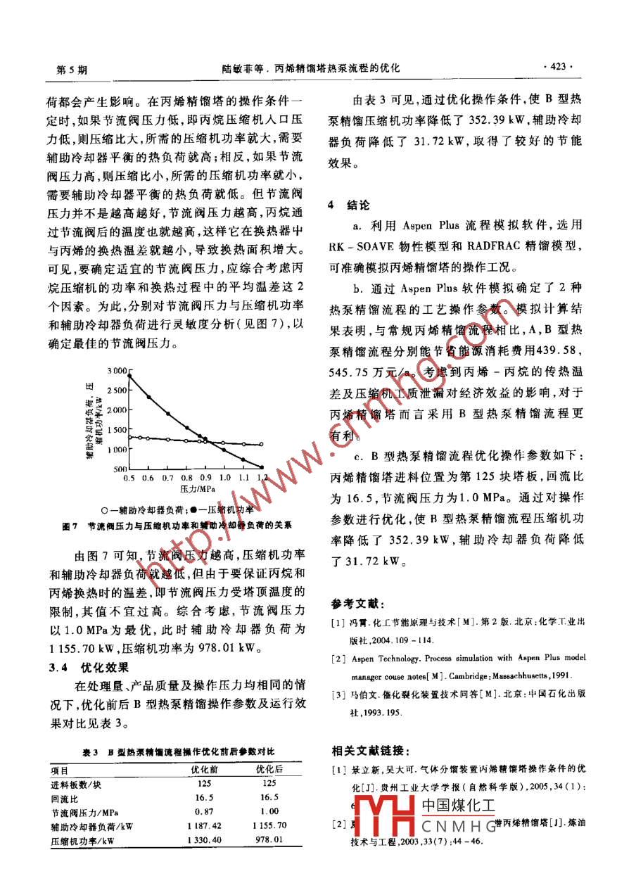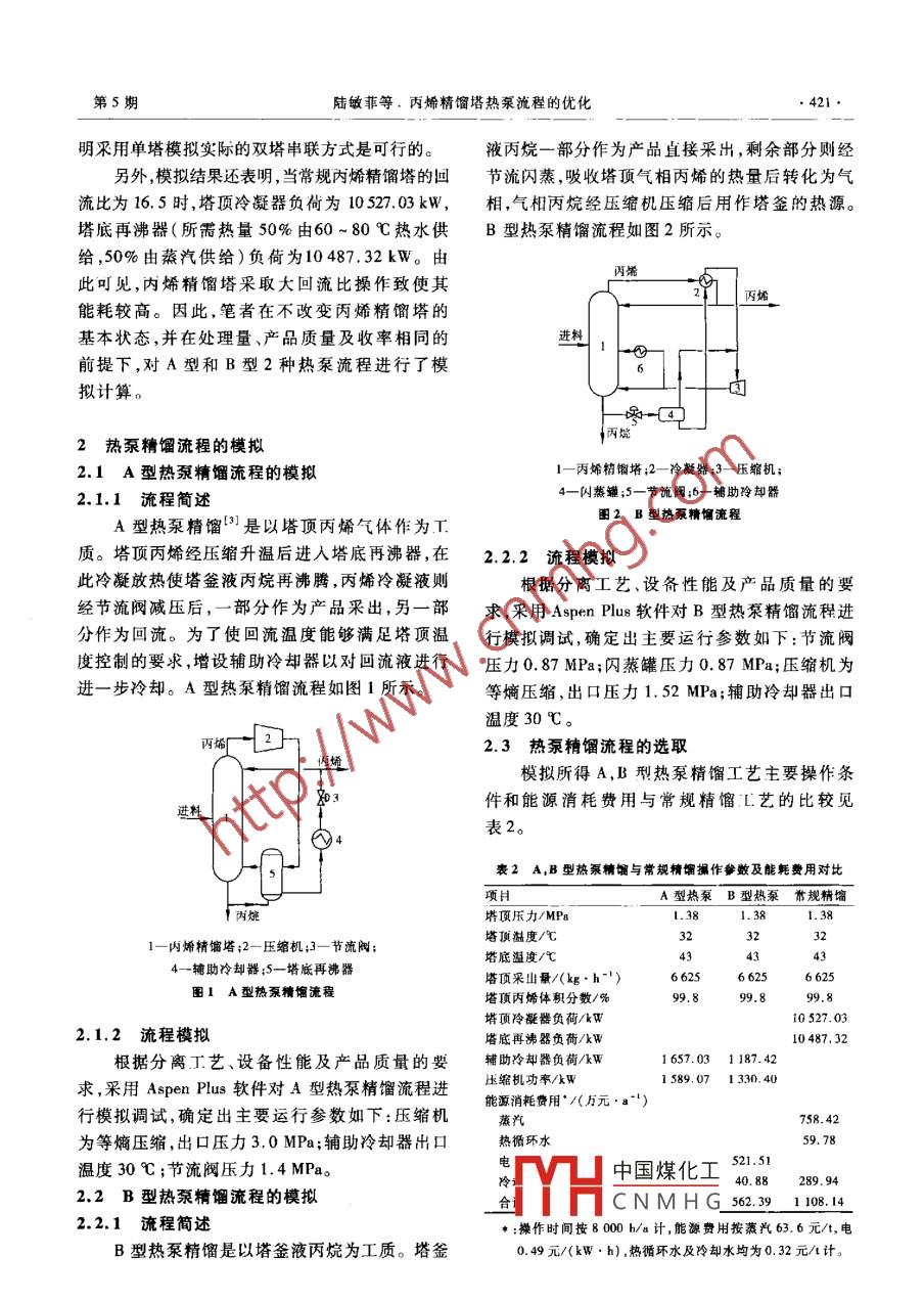 第25卷第5期石化技術與應用Vol 25 No 52007年9月Petrochemical Technology ApplicationSep.2007工業(yè)技術(420~424)丙烯精餾塔熱泵流程的優(yōu)化陸敏菲,馮霄(西安交通大學化學工程系,陜西西安710049)摘要:利用 Aspen Plus流程模擬軟件,選用RK-S0AVE物性模型和 RADFRAC精餾模型,對常規(guī)丙烯精餾塔的操作工況進行了模擬。在此基礎上,對丙烯精餾塔的2種熱泵流程即塔頂蒸汽直接壓縮式熱泵流程和塔釜液閃燕再沸式熱泵流程進行了模擬計算。結(jié)果表明,對于丙烯精餾塔而言采用塔釜液閃蒸再沸式熱泵流程吏有利。所選熱泵精餾流程優(yōu)化操作參數(shù)如下:丙烯精餾塔進料佗置為第125塊塔板,回流比為16.5,節(jié)流閥壓力為10MPa。通過對操作參數(shù)進行優(yōu)化,在處理量相同的情況下,可使塔釜液閃蒸再沸式熱泵精餾流程壓縮機功率降低352.39kW,輔助冷卻器負荷降低31.72kW。關鍵詞:丙烯;精餾;熱泵;精餾塔;內(nèi)烷; Aspen Plus軟件;流程模擬中圖分類號:TQ221.212文獻標識碼:B文章編號:1009-0045(2007)05-0420-05在氣體分餾裝置的丙烯精餾塔中,由于丙烯從丙烯精餾塔第125塊塔板進入,其所含丙烷、丙和丙烷的沸點非常接近,當采用常規(guī)丙烯-丙烷烯、異丁烯的質(zhì)量分數(shù)介別為2218%,779%精餾流程對二者加以分離時,通常都要求精餾塔70.03%。產(chǎn)品中丙烯體積分數(shù)要求不低于99.6%控制較大回流比以保證產(chǎn)品純度,而這卻使得丙1.2模擬結(jié)果烯精餾單元在整個氣體分餾裝置中的能耗比例利用 Aspen Plus軟件12,采用 RADFRAC(嚴偏高。因此,如何降低丙烯精餾塔的能耗就成為格精餾/吸收)模型模擬丙烯塔(采用單塔模氣體分餾裝置節(jié)能的關鍵。擬),選用RK-SOAⅤE物性集計算汽液相平衡熱泵是在精餾過程中通常采用的一種有效及焓。的節(jié)能技術。采用熱泵工藝,不僅可使生產(chǎn)能耗將裝置基礎工藝數(shù)據(jù)和物性計算模型輸入大幅降低,而且叮使冷卻介質(zhì)的溫度在生產(chǎn)操作軟件進行模擬計算,所得結(jié)果與實際數(shù)據(jù)的比中不再具有決定性的作用。因此,該工藝非常適較見表1。合丙烯-丙烷這種沸點非常接近的精餾系統(tǒng)"。表1丙烯精餾塔模擬結(jié)果與實際數(shù)據(jù)的比較常用的熱泵精餾流程有2種類型,即塔頂蒸汽直模擬值實測值接壓縮式(以下簡稱為A型熱泵流程)和塔釜液塔頂壓力/MPa閃燕冉沸式(以下簡稱為B型熱泵流程)。塔頂溫度/℃32.0塔底溫度/℃43.0筆者從節(jié)能的角度出發(fā),運用 Aspen Plus流塔頂采出量(kg,b-")66256580程模擬軟件,確定出適合內(nèi)烯-內(nèi)烷常規(guī)精餾分塔頂丙烯體積分數(shù)/%998離要求的熱泵流程,并對熱泵精餾的操作參數(shù)進行了優(yōu)化。由表1可見,模擬值與實測值非常接近。這表I常規(guī)丙烯精餾塔的模擬1.1甚礎數(shù)據(jù)常規(guī)內(nèi)烯精餾塔共設有200塊塔板,采用雙塔TH中國煤化工CNMH G(20436040中聯(lián)方式,操作壓力1.38MPa,回流比16.5。溫度作者簡介:陸敏菲(1982一),女,江蘇常州人,碩士研究生。研究方向為過程系統(tǒng)工程。為40℃、壓力為20MPa、流量為8500kg/h的進料通訊聯(lián)系人。第5期陸敏菲等,丙烯精餾塔熱泵流程的優(yōu)化421明采用單塔模擬實際的雙塔串聯(lián)方式是可行的。液丙烷一部分作為產(chǎn)品直接采出,剩余部分則經(jīng)另外,模擬結(jié)果還表明,當常規(guī)內(nèi)烯精餾塔的回節(jié)流閃蒸,吸收塔頂氣相丙烯的熱量后轉(zhuǎn)化為氣比為16.5時,塔頂冷凝器負荷為10527.03kW,相,氣相丙烷經(jīng)壓縮機壓縮后用作塔釜的熱源。塔底再沸器〔所需熱量50%由60~80℃熱水供B型熱泵精餾流程如圖2所示。給,50%由蒸汽供給)負荷為10487.32kW。由丙烯此可見,內(nèi)烯精餾塔采取大回流比撅作致使其能耗較高。因此,筆者在不改變丙烯精餾塔的基本狀態(tài),并在處理量、產(chǎn)品質(zhì)量及收率相同的進料前提下,對A型和B型2種熱泵流程進行了模擬計算。2熱泵精餾流程的模擬2.1A型熱泵精餾流程的模擬1—丙烯精餾塔;2-冷凝器;3一壓縮機;2.1.1流程簡述4一閃蒸;5一節(jié)流閥;6一輔助冷卻器A型熱泵精餾'是以塔頂丙烯氣體作為T圖2B型熱泵精流程質(zhì)。塔頂丙烯經(jīng)壓縮升溫后進入塔底再沸器,在2.2.2流程模擬此冷凝放熱使塔釜液丙烷再沸騰,丙烯冷凝液則根據(jù)分離工藝、設備性能及產(chǎn)品質(zhì)量的要經(jīng)節(jié)流閥減壓后,一部分作為產(chǎn)品采出,另一部求,采用 Aspen Plus軟件對B型熱泵精餾流程進分作為回流。為了使回流溫度能夠滿足塔頂溫行模擬調(diào)試,確定出主要運行參數(shù)如下:節(jié)流閥度控制的要求,增設輔助冷卻器以對回流液進行壓力0.87MPa;閃蒸罐壓力0.87MPa;壓縮機為進一步冷卻。A型熱泵精餾流程如圖1所示。等熵壓縮,出口壓力1.52MPa;輔助冷卻器出口溫度30℃。2.3熱泵精餾流程的選取模擬所得A,B型熱泵精餾工藝主要操作條件和能源消耗費用與常規(guī)精餾L藝的比較見進料表2。4表2AB型熱泵精與常規(guī)精餾捐作參數(shù)及能耗費用對比A型熱泵B型熱泵常規(guī)精餾塔頂壓力/MPa1.38L.38塔頂溫度/℃32丙烯精餾塔;2-壓縮機;3—節(jié)流閥塔底溫度/℃4一輔助冷卻器;5一塔底再沸器塔頂采出量/(kg·h-)1A型熱泵精餾流程塔頂丙烯體積分數(shù)/%99.8塔頂冷凝器負荷/kWt0527.032.1.2流程模擬塔底再沸器負荷/kW10487.32根據(jù)分離工藝、設備性能