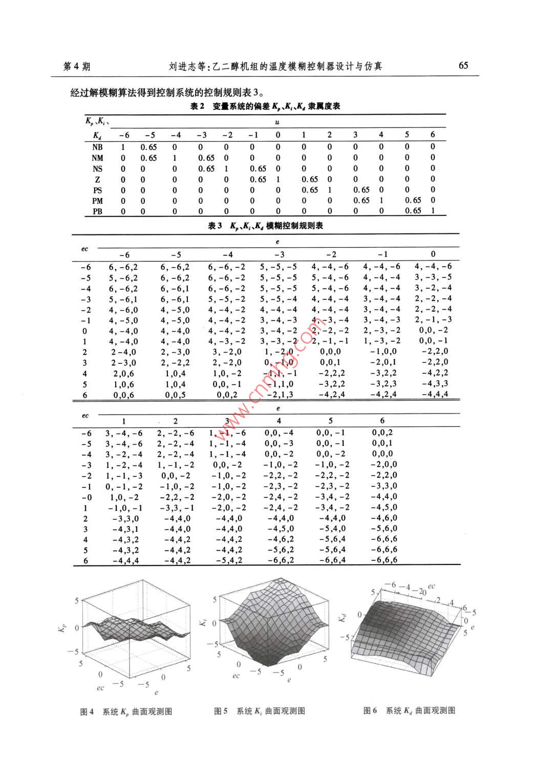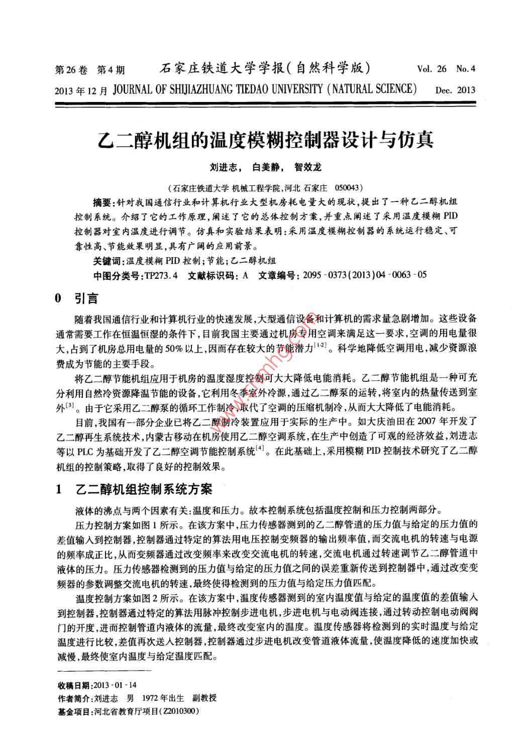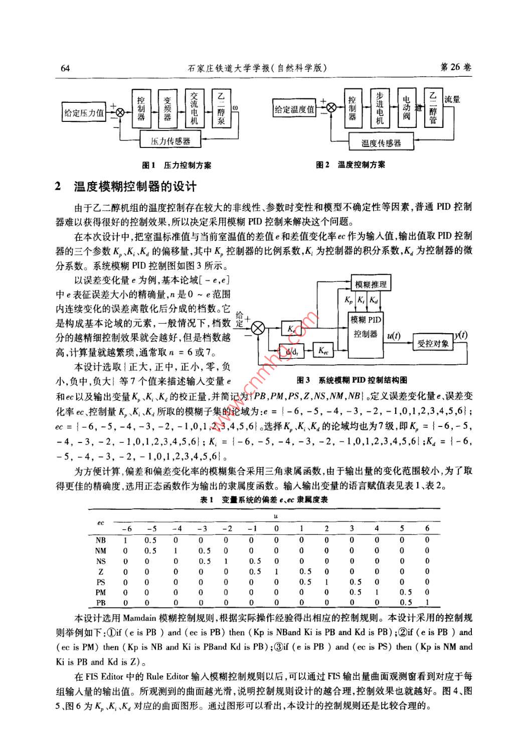 第26卷第4期石家莊鐵道大學(xué)學(xué)報(bào)(自然科學(xué)版)Vol. 26 No 42013 4F 12 A JOURNAL OF SHLJIAZHUANG TIEDAO UNIVERSITY(NATURAL SCIENCE)Dec.2013乙二醇機(jī)組的溫度模糊控制器設(shè)計(jì)與仿真劉進(jìn)志,白美靜,智效龍(石家莊鐵道大學(xué)機(jī)械工程學(xué)院河北石家莊050043摘要:針對(duì)我國通信行業(yè)和計(jì)算機(jī)行業(yè)大型機(jī)房耗電量大的現(xiàn)狀,提出了一種乙二醇機(jī)組控制系統(tǒng)。介紹了它的工作原理,闡述了它的總體控制方案,并重點(diǎn)闡述了采用溫度模糊PID控制器對(duì)室內(nèi)溫度進(jìn)行調(diào)節(jié)。仿真和實(shí)驗(yàn)結(jié)果表明:采用溫度模糊控制器的系統(tǒng)運(yùn)行穩(wěn)定、可靠性高、節(jié)能效果明顯,具有廣闊的應(yīng)用前景。關(guān)鍵詞:溫度模糊PD控制;節(jié)能;乙二醇機(jī)組中圖分類號(hào):TP273.4文獻(xiàn)標(biāo)識(shí)碼:A文章編號(hào):2095-0373(2013)04-0063050引言隨著我國通信行業(yè)和計(jì)算機(jī)行業(yè)的快速發(fā)展,大型通信設(shè)備和計(jì)算機(jī)的需求量急劇增加。這些設(shè)備通常需要工作在恒溫恒濕的條件下,目前我國主要通過機(jī)房專用空調(diào)來滿足這一要求,空調(diào)的用電量很大,占到了機(jī)房總用電量的50%以上,因而存在較大的節(jié)能潛力12。科學(xué)地降低空調(diào)用電減少資源浪費(fèi)成為節(jié)能的主要手段。將乙二醇節(jié)能機(jī)組應(yīng)用于機(jī)房的溫度濕度控制可大大降低電能消耗。乙二醇節(jié)能機(jī)組是一種可充分利用自然冷資源降溫節(jié)能的設(shè)備,它利用冬季室外冷源,通過乙二醇泵的運(yùn)轉(zhuǎn)將室內(nèi)的熱量傳送到室外3。由于它釆用乙二醇泵的循環(huán)工作制冷,取代了空調(diào)的壓縮機(jī)制冷,從而大大降低了電能消耗。目前,我國有一部分企業(yè)已將乙二醇制冷裝置應(yīng)用于實(shí)際的生產(chǎn)中。如大慶油田在2007年開發(fā)了乙二醇再生系統(tǒng)技術(shù),內(nèi)蒙古移動(dòng)在機(jī)房使用乙二醇空調(diào)系統(tǒng),在生產(chǎn)中創(chuàng)造了可觀的經(jīng)濟(jì)效益,劉進(jìn)志等以PLC為基礎(chǔ)開發(fā)了乙二醇空調(diào)節(jié)能控制系統(tǒng)。在此基礎(chǔ)上,采用模糊PID控制技術(shù)研究了乙二醇機(jī)組的控制策略,取得了良好的控制效果。1乙二醇機(jī)組控制系統(tǒng)方案液體的沸點(diǎn)與兩個(gè)因素有關(guān)溫度和壓力。故本控制系統(tǒng)包括溫度控制和壓力控制兩部分。壓力控制方案如圖1所示。在該方案中,壓力傳感器測到的乙二醇管道的壓力值與給定的壓力值的差值輸入到控制器,控制器通過特定的算法用電壓控制變頻器的輸出頻率值,而交流電機(jī)的轉(zhuǎn)速與電源的頻率成正比,從而變頻器通過改變頻率來改變交流電機(jī)的轉(zhuǎn)速,交流電機(jī)通過轉(zhuǎn)速調(diào)節(jié)乙二醇管道中液體的壓力。壓力傳感器檢測到的壓力值與給定的壓力值之間的誤差重新傳送到控制器中,通過改變變頻器的參數(shù)調(diào)整交流電機(jī)的轉(zhuǎn)速,最終使得檢測到的壓力值與給定壓力值匹配。溫度控制方案如圖2所示。在該方案中,溫度傳感器測到的室內(nèi)溫度值與給定的溫度值的差值輸入到控制器,控制器通過特定的算法用脈沖控制步進(jìn)電機(jī),步進(jìn)電機(jī)與電動(dòng)閥連接,通過轉(zhuǎn)動(dòng)控制電動(dòng)閥閥門的開度,進(jìn)而控制管道內(nèi)液體的流量,最終改變室內(nèi)的溫度。溫度傳感器將檢測到的實(shí)時(shí)溫度與給定溫度進(jìn)行比較,差值再次送入控制器,控制器通過步進(jìn)電機(jī)改變管道液體流量,使溫度降低的速度加快或減慢,最終使室內(nèi)溫度與給定溫度匹配。收稿日期:2013-01-14作者簡介:劉進(jìn)志男1972年出生副教授基金項(xiàng)目:河北省教育廳項(xiàng)目(Z2010300石家莊鐵道大學(xué)學(xué)報(bào)(自然科學(xué)版)第26卷流量制電給定壓力值器∏器機(jī)」泵給定溫度值⑧制壓力傳感器溫度傳感器圖1壓力控制方案圖2溫度控制方案2溫度模糊控制器的設(shè)計(jì)由于乙二醇機(jī)組的溫度控制存在較大的非線性、參數(shù)時(shí)變性和模型不確定性等因素,普通PD控制器難以獲得很好的控制效果,所以決定釆用模糊PD控制來解決這個(gè)問題。在本次設(shè)計(jì)中把室溫標(biāo)準(zhǔn)值與當(dāng)前室溫值的差值e和差值變化率e作為輸入值輸出值取PD控制器的三個(gè)參數(shù)K、K、K4的偏移量,其中K,控制器的比例系數(shù),K為控制器的積分系數(shù),K4為控制器的微分系數(shù)。系統(tǒng)模糊PD控制圖如圖3所示。以誤差變化量e為例,基本論域[-e,e模糊推理中e表征誤差大小的精確量,n是0~e范圍內(nèi)連續(xù)變化的誤差離散化后分成的檔數(shù)。它是構(gòu)成基本論域的元素,一般情況下,檔數(shù)定⑧8-[k模糊PI控制器以)控對(duì)象高,計(jì)算量就越繁瑣,通常取n=6或7。本設(shè)計(jì)選取{正大,正中,正小,零,負(fù)小,負(fù)中,負(fù)大}等7個(gè)值來描述輸入變量圖3系統(tǒng)模糊PID控制結(jié)構(gòu)圖和cc以及輸出變量K、K、K的校正量,并簡記為PB,PM,PS,Z,NS,M,NB}定義誤差變化量e誤差變化率e、控制量KK、K所取的模糊子集的論域?yàn)?e={-6,-5,-4,-3,-2,-1,0,1,2,3,4,55};ec={-6,-5,-4,-3,-2,-1,0,1,2,3,4,5,6}選擇