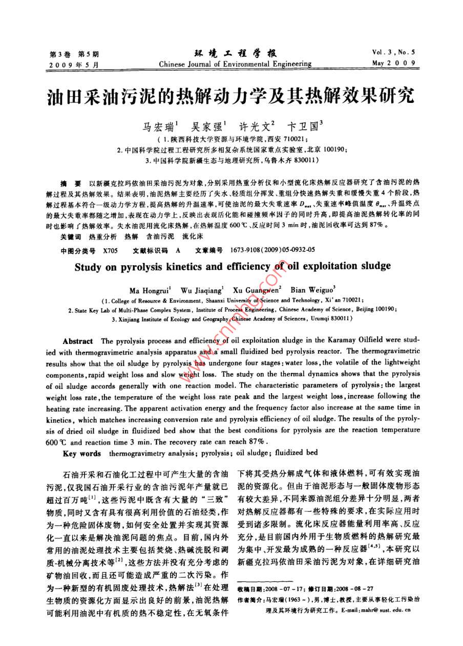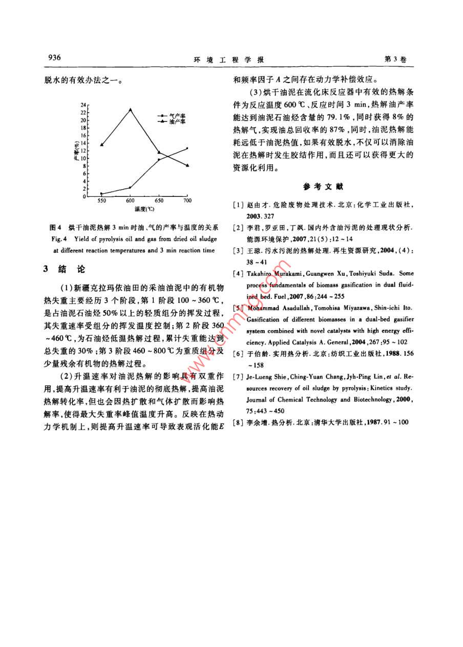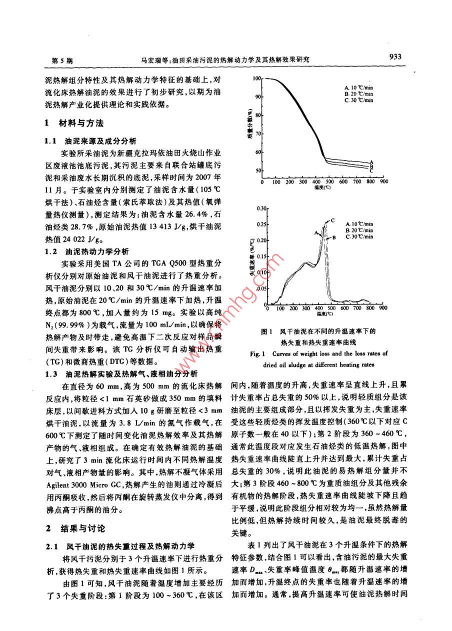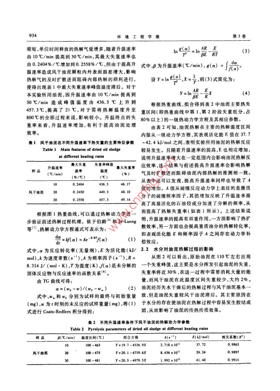 第3卷第5期環(huán)境工程學(xué)報Vol. 3,No.52009年5月Chinese Journal of Environmental EngineeringMay2009油田采油污泥的熱解動力學(xué)及其熱解效果研究馬宏瑞’吳家強'許光文2卞衛(wèi)國”( 1. 陜西科技大學(xué)資源與環(huán)境學(xué)院.西安710021;2.中國科學(xué)院過程工程研究所多相復(fù)雜系統(tǒng)國家重點實驗室,北京100190;3.中國科學(xué)院新疆生態(tài)與地理研究所,烏魯木齊830011)摘要以新疆克拉瑪依油田采油污泥為對象,分別采用熱重分析儀和小型流化床熱解反應(yīng)器研究了含油污泥的熱解過程及其熱解效果。結(jié)果表明,油泥熱解主要經(jīng)歷了失水、輕質(zhì)組分揮發(fā)、重組分快速熱解失重和緩饅失重4個階段,熱解過程基本符合一級動力學(xué) 方程,提高熱解的升溫速率.可使油泥的最大失重速率D....、失重速嘞蜂值溫度0... 、升溫終點的最大失重率都隨之增加,表現(xiàn)在動力學(xué)上.反映出表觀活化能和碰撞頻單因子的同時升高,即提高油泥熱解轉(zhuǎn)化率的同時也影響5熱解效率。失水油泥用流化床熱解,在熱解溫度600C、反應(yīng)時間3min時,油泥回收率可達到87%。關(guān)鍵詞熱重分析熱解含油污泥流化床中團分類號X705文獻標(biāo)識碼I文章編號1673-9108(2009)05 0932-05Study on pyrolysis kinetics and efficiency of oil exploitation sludgeMa Hongrui'Wu Jiaqiang'Xu Guangwen' Bian Weiguo'(1. Cllege of Reoure & Environment, Shaanxi Univenity of Seience and Technology, Xi' an 710021; .2. Slute Key Lab of Multi-Phase Complex Sylem, Institute of Proce Engineering, Chinese Academy of Science, Beiig 100190;3. Xinjiang Insiute of Eeology and Ceogaphy ,Chinese Aceademy of Sciences, Urumqi 83011)Abstract The pyrolysis process and eficiency of oil exploitation sludge in the Karamay Oifield were stud-ied with thermogravimetric analysis apparatus and a small fluidized bed pyrolysis reactor. The thermogravimetrieresults show that the oil sludge by pyrolysis has undergone four stages : water loss , the volatile of the lightweightcomponents, rapid weight loss and slow weight loss. The study on the thermal dynamics shows that the pyrolysisof oil sludge accords generally with one reaction model. The characteristic parameters of pyrolysis: the largestweight loss rate, the temperature of the weight loss rate peak and the largest weight lo88 ,increase fllowing theheating rate increasing. The apparent activation energy and the frequency factor also increase at the same time inkinetics, which matches increasing conversion rate and pyrolysis efficiency of oil sludge. The results of the pyroly-sis of dried oil sludge in fluidized bed show that the best conditions for pyrolysis are the reaction temperature600C and reaction time 3 min. The recovery rate can reach 87%.Key words thermogravimetry analysis; pyrolysis; oil sludge; fluidized bed石油開采和石油化工過程中可產(chǎn)生大量的含油下將其受熱分解成氣體和液體燃料,可有效實現(xiàn)油污泥,僅我國石油開采行業(yè)的含油污泥年產(chǎn)量就已泥的資源化。 但由于油泥形態(tài)與一般固體廢物形態(tài)超過百萬噸",這些污泥中既含有大量的“三致”有較大差異 ,不同來源油泥組分差異十分明顯,兩者物質(zhì),同時又含有具有很高利用價值的石油烴類,作對熱解反應(yīng)器都有-些特殊的要求,在實際應(yīng)用時為一種危險固體廢物,如何安全處置并實現(xiàn)其資源受到諸 多限制。流化床反應(yīng)器能量利用率高、反應(yīng)化一直以來是解決油泥問題的焦點。目前,國內(nèi)外充分 ,是目前國內(nèi)外用于生物質(zhì)燃料的熱解研究最常用的油泥處理技術(shù)主要包括焚燒、熱堿洗脫和調(diào)為集中、開發(fā)最為成熟的-種反應(yīng)器'.1) ,本研究以質(zhì)機械分離技術(shù)等121 ,這些方法并沒有充分考慮的新疆 克拉瑪依油田采油污泥為對象,在詳細研究油礦物油回收,而且還可能造成嚴重的二次污染。作為一種新型的有機固廢處理技術(shù),熱解法['1在處理收稿日期:2008 -07 -17;修訂日期:2008 -08-27生物質(zhì)的資源化方面顯示出良好的前景,油泥熱解作者簡介:馬宏響(1963 - ).男,博士,教授,主要從事輕化工污染拍可能利用油泥中有機質(zhì)的熱不穩(wěn)定性,在無氧條件理及其環(huán)境行為研究工作。E-mail: mahr@ sust. edu. cn933第5期馬宏瑞等:油田采油污泥的熱解動力學(xué)及其熱解效果研究泥熱解組分特性及其熱解動力學(xué)特征的基礎(chǔ)上,對10A 10 C/min流化床熱解油泥的效果進行了初步研究,以期為油B 20 CminC.30 C/min泥熱解產(chǎn)業(yè)化提供理論和實踐依據(jù)。1材料與方法1.1油泥來源及成分分析實驗所采油泥為新疆克拉瑪依油田火燒山作業(yè)區(qū)廢液池池底污泥,其污泥主要來自聯(lián)合站罐底污泥和采油廢水長期沉積的底泥,采樣時間為2007年010020030040050060070080090011月。于實驗室內(nèi)分別測定了油泥含水量(105 C檻度(C)烘千法)、石油烴含量(索氏萃取法)及其熱值(氧彈0.30r量熱儀測量),測定結(jié)果為:油泥含水量26.4% ,石油烴類28. 7% ,原始油泥熱值13 413 J/g,烘干油泥)25A 10C/minB 20C/min熱值24 022 J/go3 C.30C/min1.2 油泥熱動力學(xué)分析實驗采用美國TA公司的TCAQ500型熱重分析儀分別對原始油泥和風(fēng)干油泥進行了熱重分析。風(fēng)干油泥分別以10、20和30C/min的升溫速率加0.05-熱,原始油泥在209/min的升溫速率下加熱,升溫020500000900終點都為800心,加入量約為15 mg。實驗以高純40050N2(99.99%)為載氣,流量為100mLmin,以確保將熱解產(chǎn)物及時帶