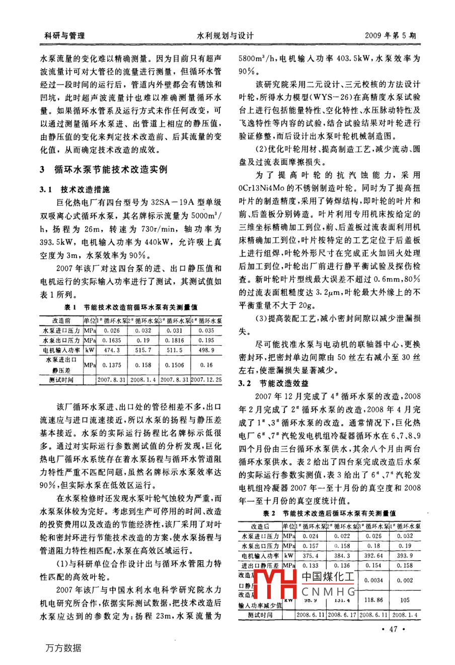 科研與管理水利規(guī)劃與設(shè)計2009年第5期循環(huán)水泵的節(jié)能技術(shù)改造蔣雪芬巨化集團公司熱電廠浙江衢州324004)【摘要】循環(huán)水泵是發(fā)電廠用電量較大的輔機之一,對其進(jìn)行節(jié)能技術(shù)分析與改造,有著顯著的經(jīng)濟和社會效益。在此從水泵與管路的匹配、葉輪材質(zhì)、密封裝置以及葉輪水力流道等多方面分析了循環(huán)水泵節(jié)能改造的技術(shù)途徑,并通過實例進(jìn)行了驗證?!娟P(guān)鍵詞】循環(huán)水泵技術(shù)改造節(jié)能葉輪【中圖分類號】TH31【文獻(xiàn)標(biāo)識碼】B【文章編號】1672-2469(2009)05-0046-03大流量低揚程高比轉(zhuǎn)速的單級雙吸離心水泵在相結(jié)合的制造工藝生產(chǎn)葉輪,可有效提高水泵的運工業(yè)上廣泛應(yīng)用,特別是火力發(fā)電廠常選用此類泵行效率和葉輪的使用壽命。作為汽輪機排汽冷凝用的冷卻水泵,并稱之為循環(huán)1.3優(yōu)化密封裝置,減少容積損失水泵。循環(huán)水泵是發(fā)電廠用電量較大的輔機之一,對單級雙吸離心泵而言,容積損失主要為葉輪對其進(jìn)行節(jié)能技術(shù)分析與改造,有著顯著的經(jīng)濟和進(jìn)口處的密封環(huán)泄漏損失,顯然在兩側(cè)壓力差一定社會效益。時,增加間隙長度和減少間隙寬度能使泄漏量減少1循環(huán)水泵節(jié)能途徑的分析1.4優(yōu)化葉輪水力流道,減少流動損失流動損失發(fā)生在吸入室、葉輪流道、導(dǎo)葉和殼1.1使循環(huán)水管路水力阻力特性與循環(huán)水泵的揚體中。流體和各部分流道壁面摩擦?xí)a(chǎn)生摩擦損程相匹配失;流道斷面變化、轉(zhuǎn)彎等會使邊界層分離、產(chǎn)生每個火力發(fā)電廠因廠址地理環(huán)境的不同,循環(huán)二次流而引起擴散損失;由于工況改變,流量偏離水管路的布置也不盡相同,而在循環(huán)水泵的選用上設(shè)計流量時,入口流動角與葉片安裝角不一設(shè)計單位往往是根據(jù)發(fā)電容量的大小套用水泵廠現(xiàn)引起沖擊損失有水泵型號選取,因而許多電廠或多或少地存在著減少流動損失一般發(fā)電廠自身的技術(shù)力量難以管路阻力特性與水泵揚程不相匹配的現(xiàn)象,使水泵解決,可與研究單位和水泵制造單位合作,依據(jù)每在低效區(qū)運行。如果對水泵的實際運行揚程和流量個電廠循環(huán)水泵的實際運行參數(shù),運用計算機技術(shù)進(jìn)行實測,通過對水泵的葉輪作相應(yīng)的技術(shù)改造,采用二元設(shè)計,三元校核的方法設(shè)計出具有個性化改造后的水泵流量保持不變的前提條件下使揚程與的水泵水力模型,并經(jīng)高精度水泵試驗臺對水泵的管路阻力特性相匹配,水泵就可在高效區(qū)域運行,能量特性、空化特性、水壓脈動特性及飛逸特性等以降低循環(huán)水泵的電耗進(jìn)行驗證試驗和修整,同時改進(jìn)水泵材料和制造工1.2改進(jìn)葉輪材質(zhì)提高制造精度藝從而設(shè)計和制造出符合實際運行要求、具有個性水泵葉輪的圓盤摩擦損失約占軸功率的2%~化性能要求的高效循環(huán)水泵。10%,主要與葉輪的表面粗糙度成正比。而循環(huán)水泵的葉輪一般都采用鑄鐵或鑄鋼材料整體鑄造而2循環(huán)水泵節(jié)能改造成效的驗證成,葉輪過流表面較為粗糙,會產(chǎn)生較大的圓盤損失。同時高比轉(zhuǎn)速離心泵的葉片為扭葉片,整體鑄泵的中國煤化工耗用的電功率和水容易精確測量,但造葉輪會與設(shè)計值產(chǎn)生較大的偏差,此偏差又會使CNMHG水泵產(chǎn)生一定的流動損失。如果能用表面既光滑抗作者簡介:蔣雪芬(1957年一),女,總工程師,教授級高級汽蝕能力又強的不銹鋼材料采用鑄焊與機械精加工工程師·46科研與管理水利規(guī)劃與設(shè)計2009年第5期水泵流量的變化難以精確測量。因為目前只有超聲5800m23/h,電機輸入功率403.5kW,水泵效率為波流量計可對大管徑的流量進(jìn)行測量,但循環(huán)水管90%經(jīng)過一段時間的運行后,管道內(nèi)外壁都會有銹蝕和該研究院采用二元設(shè)計、三元校核的方法設(shè)計凹坑,此時超聲波流量計也難以準(zhǔn)確測量循環(huán)水葉輪,所得水力模型(WYS-26)在高精度水泵試驗量。如果循環(huán)水管系及運行方式未作任何改變,可臺上進(jìn)行包括能量特性、空化特性、水壓脈動特性及以通過測量循環(huán)水泵進(jìn)、出管道上相應(yīng)的靜壓值,飛逸特性等內(nèi)容的試驗,結(jié)合試驗結(jié)果對葉輪進(jìn)行由靜壓值的變化來判定技術(shù)改造前、后其流量的變驗證修整,而后設(shè)計出水泵葉輪機械制造圖。化值,從而確定技術(shù)改造的成效。(2)優(yōu)化葉輪用材、提高制造工藝,減少流動、圓盤及過流表面摩擦損失。3循環(huán)水泵節(jié)能技術(shù)改造實例為了提高葉輪的抗汽蝕能力,采用3.1技術(shù)改造措施0Cr13Ni4Mo的不銹鋼制造葉輪。同時為了提高扭巨化熱電廠有四臺型號為32SA-19A型單級葉片的制造精度,釆用了鑄焊結(jié)構(gòu),即葉輪的葉片和雙吸離心式循環(huán)水泵,其名牌標(biāo)示流量為500m。/前,后蓋板分別鑄造。葉片利用專用機床按給定的h,揚程為26m,轉(zhuǎn)速為730r/min,軸功率為三維坐標(biāo)精確加工到位,前、后蓋板過流表面利用機393.5kW,電機輸入功率為440kW,允許吸上真床精確加工到位,葉片按特定的工藝定位于后