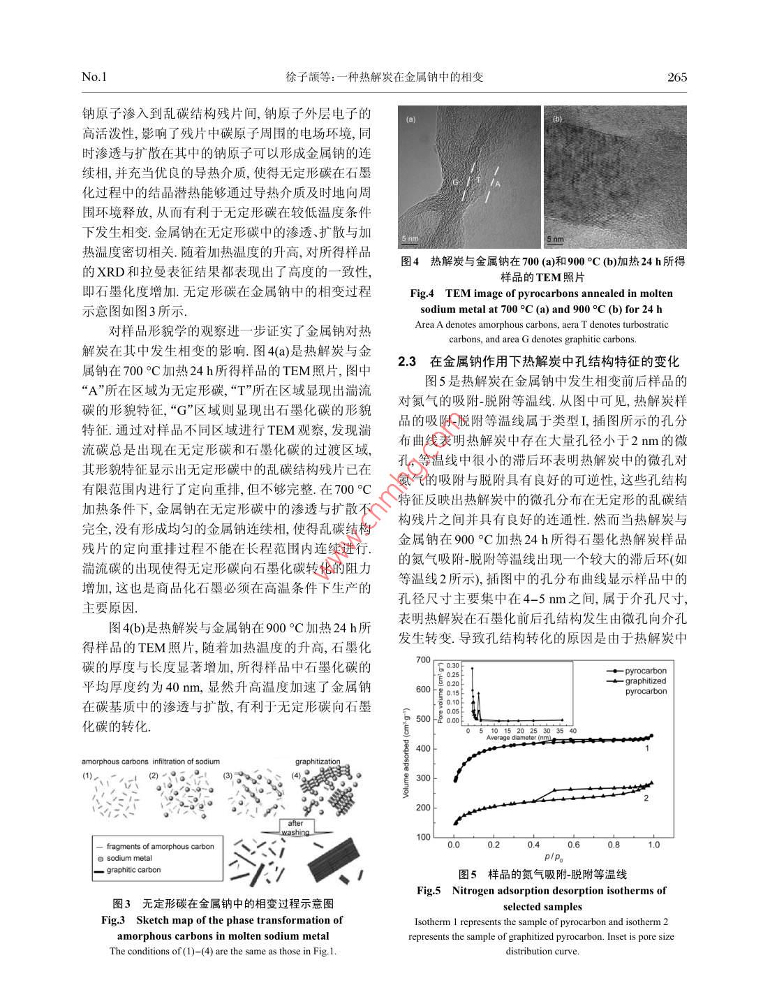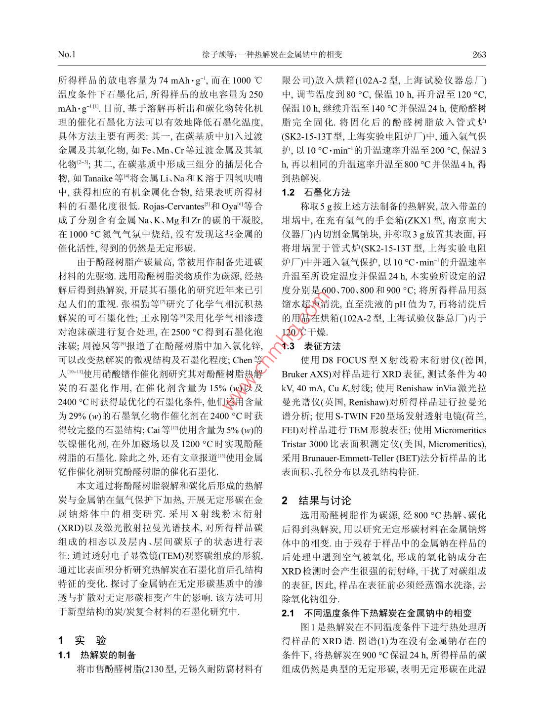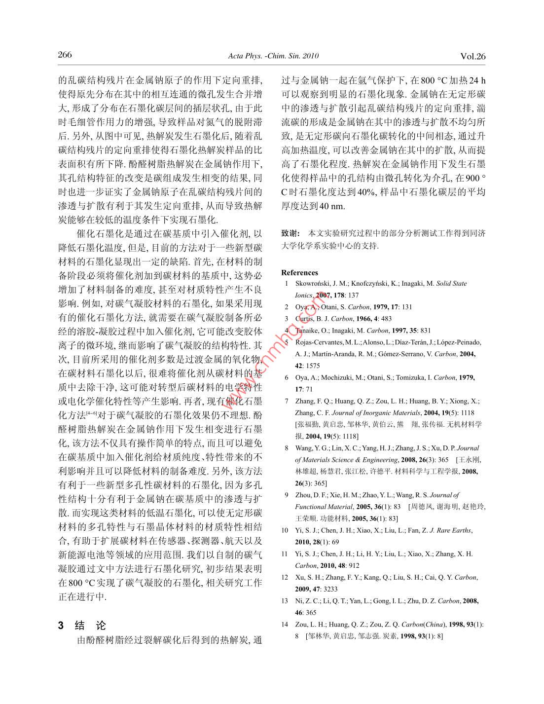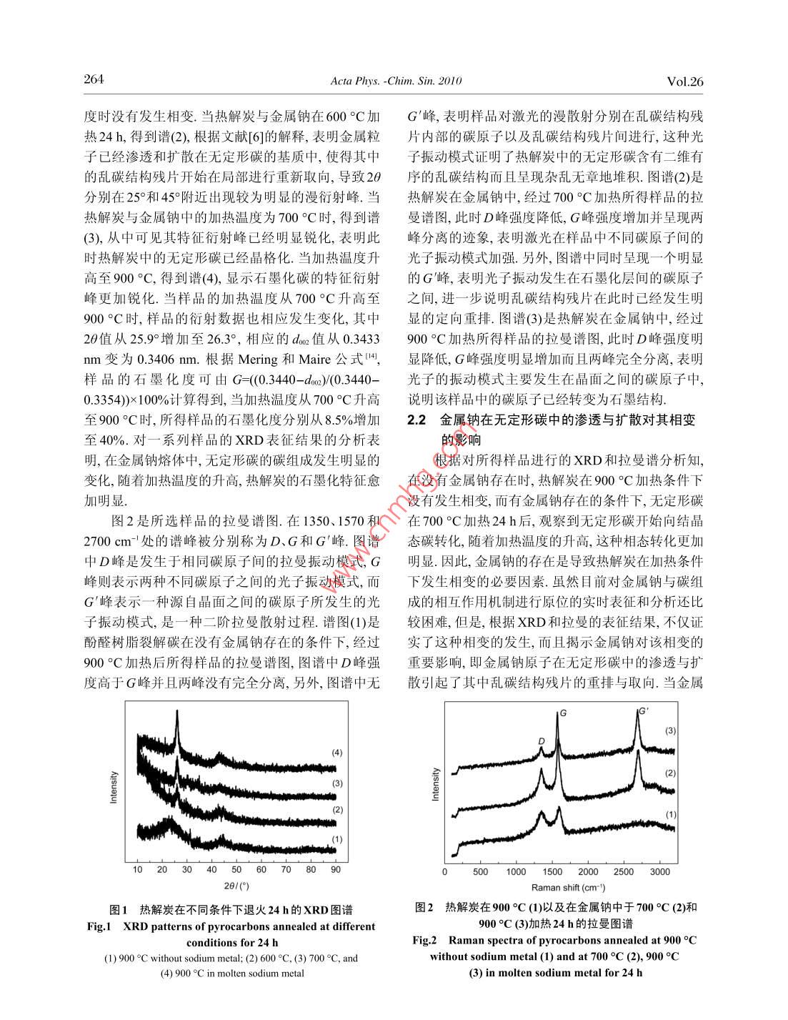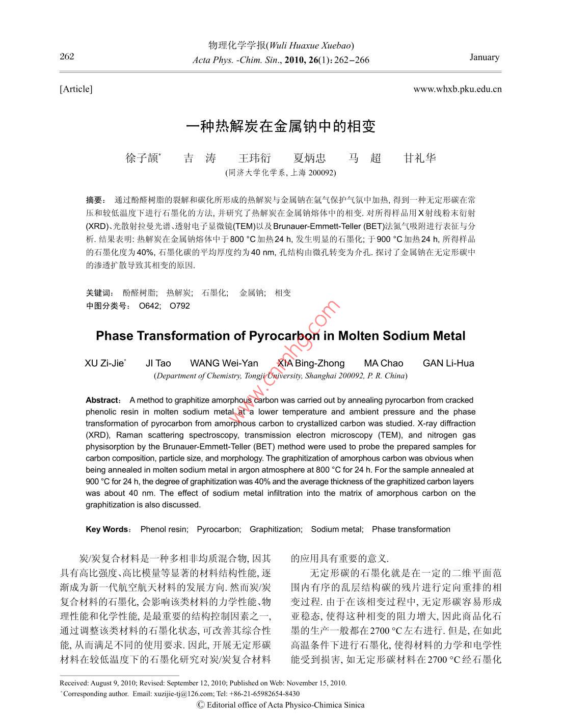 物理化學(xué)學(xué)報(bào)( Wuli Huaxue Xuebao)262,Acta Phys. -Chim. Sin, 2010, 26(1): 262-266January[Article]www.whxb.pku.edu.cn一種熱解炭在金屬鈉中的相變徐子頡”吉濤王瑋衍夏炳忠馬超甘禮華(同濟(jì)大學(xué)化學(xué)系,上海200092)滴要:通過(guò)酚醛樹(shù)脂的裂解和碳化所形成的熱解炭與金屬鈉在氬氣保護(hù)氣氛中加熱,得到一-種無(wú)定形碳在常壓和較低溫度下進(jìn)行石墨化的方法,并研究了熱解炭在金屬鈉熔體中的相變.對(duì)所得樣品用X射線粉末衍射(XRD)、光散射拉曼光譜、透射電子顯微鏡(TEM)以及Brunauer Emmett- Tller (BET)法氮' (吸附進(jìn)行表征與分析.結(jié)果表明:熱解炭在金屬鈉熔體中于800。C加熱24h,發(fā)生明顯的石墨化;于900。C加熱24h,所得樣品的石墨化度為40%,石墨化碳的平均厚度約為40nm,孔結(jié)構(gòu)由微孔轉(zhuǎn)變?yōu)榻榭?探討了金屬鈉在無(wú)定形碳中的滲透擴(kuò)散導(dǎo)致其相變的原因.關(guān)鍵詞:酚醛樹(shù)脂; 熱解炭;石墨化;金屬鈉; 相變中圖分類(lèi)號(hào): 0642; 0792Phase Transformation of Pyrocarbon in Molten Sodium MetalXU Zi-Jjie'JI TaoWANG Wei-YanXIA Bing-ZhongMA ChaoGAN Li-Hua(Department of Chemistry, Tongji Universit, Shanghai 200092, P. R. China)phenolic resin in molten sodium metal at a lower temperature and ambient pressure and the phasetransformation of pyrocarbon from amorphous carbon to crysalized carbon was studied. X-ray diffraction(XRD), Raman scattering spectroscopy, transmission electron microscopy (TEM), and nitrogen gasphysisorption by the Brunauer- Emmett- Teller (BET) method were used to probe the prepared samples forcarbon composition, particle size, and morphology. The graphitization of amorphous carbon was obvious whenbeing annealed in molten sodium metal in argon atmosphere at 800。C for 24 h. For the sample annealed at900。C for 24 h, the degree of graphitization was 40% and the average thickness of the graphitized carbon layerswas about 40 nm. The effect of sodium metal infiltration into the matrix of amorphous carbon on thegraphitization is also discussed.Key Words: Phenol resin; Pyrocarbon; Graphitization; Sodium metal; Phase transformation炭/炭復(fù)合材料是一種多相非均質(zhì)混合物,因其的應(yīng)用具有重要的意義.具有高比強(qiáng)度、高比模量等顯著的材料結(jié)構(gòu)性能,逐無(wú)定形碳的石墨化就是在一定的二維平面范漸成為新- -代航空航天材料的發(fā)展方向.然而炭/炭圍內(nèi)有序的亂層結(jié)構(gòu)碳的殘片進(jìn)行定向重排的相復(fù)合材料的石墨化,會(huì)影響該類(lèi)材料的力學(xué)性能、物變過(guò)程.由于在該相變過(guò)程中,無(wú)定形碳容易形成理性能和化學(xué)性能,是最重要的結(jié)構(gòu)控制因素之一,亞穩(wěn)態(tài),使得這種相變的阻力增大,因此商品化石通過(guò)調(diào)整該類(lèi)材料的石墨化狀態(tài),可改善其綜合性墨的生產(chǎn)--般都在2700°C左右進(jìn)行.但是,在如此能,從而滿(mǎn)足不同的使用要求.因此,開(kāi)展無(wú)定形碳高溫條件下進(jìn)行石墨化,使得材料的力學(xué)和電學(xué)性材料在較低溫度下的石墨化研究對(duì)炭/炭復(fù)合材料能受到損害,如無(wú)定形碳材料在2700°C經(jīng)石墨化Received: August 9, 2010; Revised: September 12, 2010; Published on Web: November 15, 2010.Corresponding author. Email: xuzjjie-tj@126.com; Tel: +86-21-65982654-8430◎Editorial office of Acta Physico-Chimica SinicaNo.1徐子頡等:-一種熱解炭在金屬鈉中的相變263所得樣品的放電容量為74mAh.g",而在1000°C限公司)放入烘箱(102A-2型,上海試驗(yàn)儀器總廠)溫度條件“下石墨化后,所得樣品的放電容量為250中,調(diào)節(jié)溫度到80°C,保溫10h,再升溫至120°C,mAh.g-".目前,基于溶解再析出和碳化物轉(zhuǎn)化機(jī)保溫10h,繼續(xù)升溫至140°C并保溫24h,使酚醛樹(shù)理的催化石墨化方法可以有效地降低石墨化溫度,脂完全固化.將固化后的酚醛樹(shù)脂放入管式爐具體方法主要有兩類(lèi):其一,在碳基質(zhì)中加入過(guò)渡(SK2-15-13T型,上海實(shí)驗(yàn)電阻爐廠)中,通入氬氣保金屬及其氧化物,如Fe.Mn、Cr等過(guò)渡金屬及其氧護(hù),以10 °C.min-'的升溫速率升溫至200°C,保溫3化物1-3;其二,在碳基質(zhì)中形成三組分的插層化合h,再以相同的升溫速率升溫至800。C并保溫4h,得物,如Tanaike等I將金屬Li.Na和K溶于四氫呋喃到熱解炭.中,獲得相應(yīng)的有機(jī)金屬化合物,結(jié)果表明所得材1.2石墨化方法料的石墨化度很低. Rojas-Cervantes'1 和Oyal9等合稱(chēng)取5 g按上述方法制備的熱解炭,放入帶蓋的成了分別含有金屬Na、K、Mg和Zr的碳的干凝膠,坩堝中,在充有氬氣的手套箱(ZKX1型,南京南大在1000°C氮?dú)鈿夥罩袩Y(jié),沒(méi)有發(fā)現(xiàn)這些金屬的儀器廠)內(nèi)切割金屬鈉塊,并稱(chēng)取3g放置其表面,再催化活性,得到的仍然是無(wú)定形碳.將坩堝置于管式爐(SK2-15-13T型,上海實(shí)驗(yàn)電阻由于酚醛樹(shù)脂產(chǎn)碳量高,常被用作制備先進(jìn)碳爐廠)中并通入氬氣保護(hù),以10 °C.min'的升溫速率材料的先驅(qū)物.選用酚醛樹(shù)脂類(lèi)物質(zhì)作為碳源,經(jīng)熱升溫至所設(shè)定溫度并保溫24h,本實(shí)驗(yàn)所設(shè)定的溫解后得到熱解炭,開(kāi)展其石墨化的研究近年來(lái)已引度分別是600、700、800和900°C;將所得樣品用蒸起人們的重視.張福勤等研究了化學(xué)氣相沉積熱餾水超聲清洗,直至洗液的pH值為7,再將清洗后解炭的可石墨化性;王
