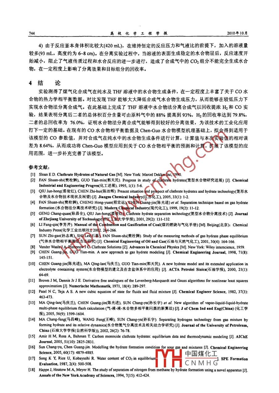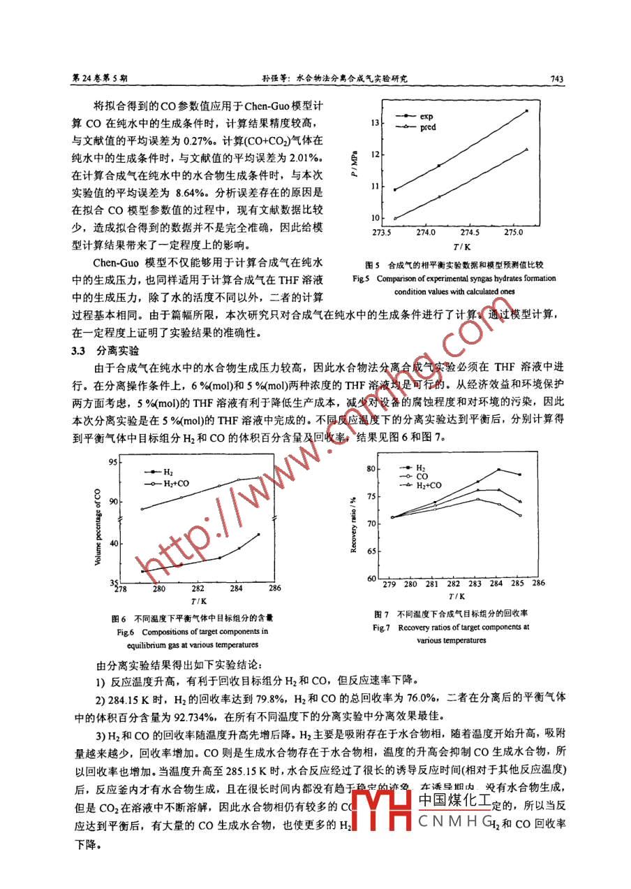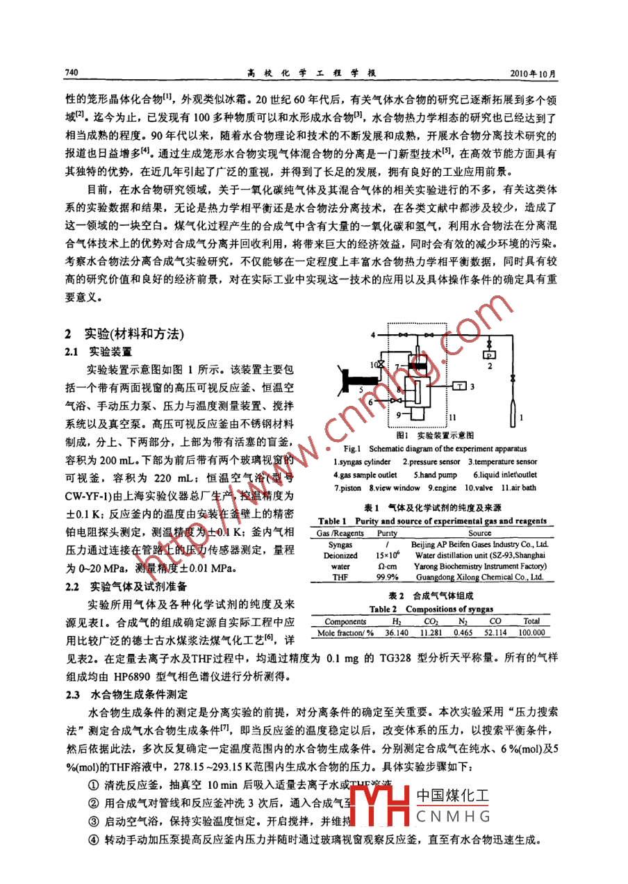 第24卷第5期高?;瘜W(xué)工程學(xué)報(bào)No 5 vol 242010年10月Journal of Chemical Engineering of Chinese Universitiesct.2010文章編號(hào):10039015(2010)05-07906水合物法分離合成氣實(shí)驗(yàn)研究孫強(qiáng),劉愛(ài)賢,郭緒強(qiáng)(中國(guó)石油大學(xué)(北京)化學(xué)工程學(xué)院,北京102249)摘要:分別測(cè)定了煤氣化合成氣在純水以及兩種不同濃度(6%m)和5%mo)的四氫呋喃(THF)水溶液中的水合物生成條件,實(shí)驗(yàn)結(jié)果表明THF的加入可以大大降低合成氣生成水合物的壓力,使合成氣能夠在較低的壓力下通過(guò)生成水合物的方法得到分高,同時(shí)也為該分離方法應(yīng)用于實(shí)際工業(yè)裝置提供了可行性。研究還成功地將 Chen-Guo水合物熱力學(xué)模型應(yīng)用到含有一氧化碳?xì)怏w的水合物生成條件的預(yù)測(cè),并對(duì)合成氣在純水中不同溫度下生成水合物的壓力進(jìn)行了計(jì)算,與本次實(shí)驗(yàn)值比較,得到平均誤差為864%,肯定了實(shí)驗(yàn)結(jié)果的準(zhǔn)確性。在此基礎(chǔ)上,選定在5% molTHF水溶液中,氣液比為100:1,反應(yīng)壓力為5MPa(絕)的條件下,分別進(jìn)行反應(yīng)溫度為27915K、281.15K、28315K、28415K和28515K的水合物法分離合成氣實(shí)驗(yàn),提濃其中的氫氣和一氧化碳。實(shí)驗(yàn)結(jié)果表明,28415K時(shí),氫氣的回收率到798%,氫氣和一氧化碳的總回收率為760%,分離后二者總的體積百分含量由原料氣中的88%提高到93%,分離效果較為滿意關(guān)鍵詞:水合物:合成氣:生成條件;熱力學(xué)模型;分離中圖分類號(hào):TQ0288;TQ028I文獻(xiàn)標(biāo)識(shí)碼:AExperimental Study on Separation of Syngas via Hydrate FormationSUN Qiang, LIU Ai-xian, GUo Xu-qiangCollege of Chemical Engineering, China University of Petroleum(Beijing), Beijing 102249, China)Abstract: The formation conditions of syngas hydrates in pure water and in tetrahydrofuran(THF) solutionswith different concentrations(6%(mol)and 5%(mol)) were determined respectively. The results show that theTHF can reduce the formation pressure of he syngas hydrates dramatically. It ensures that the syngas can beseparated via hydrate formation under low pressure, which offers the availableness of using this separationmethod to the real industrial device. The Chen-Guo hydrate thermodynamic model was used to calculate thformation pressure of syngas hydrates formed in pure water at different temperatures, and the average deviationfrom the experimental values is 8.64%, which also indicates that the accuracy of the experimental data issatisfactory. It was also found that the Chen-Guo hydrate thermodynamic model cab be successfully applied topredict the hydrate formation conditions of the CO containing gas. On this basis, a reaction system with 5%(mol)THF solution, the vapor-to-water ratio of 100 I and the reaction pressure of 5.0 MPa was selected; theseparation experiments were conducted orderly at 279. 15-285 15 K, and the H2 and Co in syngas were meantto be condensed. The results show that, at 284. 15 K, the recovery ratio of H2, both H2 and Co are respectively79.8%and 76.0%, and their volume percentage after separation increases from 88%(in raw gas)to 93%, whichreflects a satisfactory separation effect.Key words: hydrate; syngas; formation conditions; thermodynamic model; separation水合物是水和小分子氣體(CH4、C2H6、CO2、N2等)在力各件下形成的一種非化學(xué)計(jì)量中國(guó)煤化工收稿日期:200903-19:修訂日期:20090621基金項(xiàng)目:國(guó)家自然科學(xué)基金委項(xiàng)目(20476058,20676146):國(guó)家科技部(2006AA09A208CNMHG作者簡(jiǎn)介:孫強(qiáng)(1981-)男,山東煙臺(tái)人,中國(guó)石油大學(xué)(北京)博士生通訊聯(lián)系人:郭緒@cup.edu.cn高?;瘜W(xué)工程學(xué)報(bào)010年10月性的籠形晶體化合物叫,外觀類似冰霜。20世紀(jì)60年代后,有關(guān)氣體水合物的研究已逐漸拓展到多個(gè)領(lǐng)域。迄今為止,已發(fā)現(xiàn)有100多種物質(zhì)可以和水形成水合物,水合物熱力學(xué)相態(tài)的研究也已經(jīng)達(dá)到了相當(dāng)成熟的程度。90年代以來(lái),隨著水合物理論和技術(shù)的不斷發(fā)展和成熟,開(kāi)展水合物分離技術(shù)研究的報(bào)道也日益增多。通過(guò)生成籠形水合物實(shí)現(xiàn)氣體混合物的分離是一門新型技術(shù),在高效節(jié)能方面具有其獨(dú)特的優(yōu)勢(shì),在近幾年引起了廣泛的重視,并得到了長(zhǎng)足的發(fā)展,擁有良好的工業(yè)應(yīng)用前景目前,在水合物研究領(lǐng)域,關(guān)于一氧化碳純氣體及其混合氣體的相關(guān)實(shí)驗(yàn)進(jìn)行的不多,有關(guān)這類體系的實(shí)驗(yàn)數(shù)據(jù)和結(jié)果,無(wú)論是熱力學(xué)相平衡還是水合物法分離技術(shù),在各類文獻(xiàn)中都涉及較少,造成了領(lǐng)域的一塊空白。煤氣化過(guò)程產(chǎn)生的合成氣中含有大量的一氧化碳和氫氣,利用水合物法在分離混合氣體技術(shù)上的優(yōu)勢(shì)對(duì)合成氣分離并回收利用,將帶來(lái)巨大的經(jīng)濟(jì)效益,同時(shí)會(huì)有效的減少環(huán)境的污染??疾焖衔锓ǚ蛛x合成氣實(shí)驗(yàn)研究,不僅能夠在一定程度上豐富水合物熱力學(xué)相平衡數(shù)據(jù),同時(shí)具有較高的研究?jī)r(jià)值和良好的經(jīng)濟(jì)前景,對(duì)在實(shí)際工業(yè)中實(shí)現(xiàn)這一技術(shù)的應(yīng)用以及具體操作條件的確定具有重要意義。2實(shí)驗(yàn)(材料和方法)21實(shí)驗(yàn)裝置實(shí)驗(yàn)裝