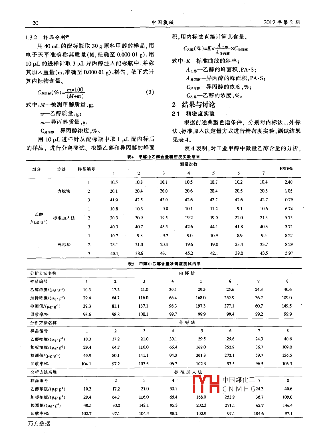 第2期中國(guó)氯堿No. 22012年2月China chlor-AlkaliFeb.2012工業(yè)甲醇中微量乙醇定量測(cè)定方法的探索何紅蓮,沈治榮,龔聯(lián)軍(自貢?shū)欪Q化工股份有限公司,四川自貢643000摘要:應(yīng)用帶分流/不分流進(jìn)樣口和氨火焰檢測(cè)器的氣相色譜儀(GC-6890N),以 PoraPloT-U毛細(xì)管柱為分離柱,對(duì)工業(yè)甲醇中微量乙醇的分離測(cè)試方法進(jìn)行了探索研究。確立的測(cè)定方法具有精密度好、準(zhǔn)確度高、操作性強(qiáng)等特點(diǎn),有很高的推廣價(jià)值。關(guān)鍵詞:分流/不分流進(jìn)樣口;氫火焰檢測(cè)器;氣相色譜;毛細(xì)管柱;甲醇中圖分類(lèi)號(hào):TQ075:3文獻(xiàn)標(biāo)識(shí)碼:B文章編號(hào):1009-1785(2012020018-04Research for quantitative determination method of trace ethanolin methanol for industrialHE Hong-lian, SHEN Zhi-rong, GONG Lian-jun(Zigong Honghe Chemical Co., Ltd, Zigong 643000, China)Abstract: This article focused on the application with gas chromatography (GC-6890N) with split/splitlessnlet and hydrogen flame detector(FID), with PoraPLoT-U (provided by Varian) for the capillary columncarried out extensive exploration and research methods of testing trace ethanol in methanol. Finally, themethod which has been explored has good precision, high accuracy, easy to operate, a lot of promotionalKey words: split/splitless inlet; hydrogen flame detector; gas chromatography; capillary column; methanol隨著化工行業(yè)的高速發(fā)展,各行業(yè)對(duì)原料和產(chǎn)C2以上的有機(jī)雜質(zhì)保證甲烷氯化物產(chǎn)品質(zhì)量(二氯品質(zhì)量的要求越來(lái)越高。工業(yè)甲醇是重要的化工原甲烷主含量999%、三氯甲烷主含量為999%),料,其用途廣泛,是基礎(chǔ)的有機(jī)化工原料和優(yōu)質(zhì)燃對(duì)其原料甲醇中乙醇含量必須嚴(yán)格控制(≤50×106)。料。工業(yè)甲醇(沸點(diǎn)647℃)中主要的有機(jī)雜質(zhì)為乙但乙醇含量的指標(biāo)在工業(yè)甲醇的國(guó)家標(biāo)準(zhǔn)中沒(méi)有列醇(沸點(diǎn)784℃),在多數(shù)精細(xì)化工的應(yīng)用中均對(duì)甲人,檢測(cè)方法局限性較大。為了保證原料甲醇的質(zhì)醇中的乙醇含量有一定的要求。如甲醇法工藝生產(chǎn)量,滿(mǎn)足甲醇法氯甲烷工藝的生產(chǎn)要求,必須建立行的氯甲烷產(chǎn)品,要求產(chǎn)品純度高,雜質(zhì)種類(lèi)少,且含之有效的檢測(cè)方法,嚴(yán)格控制甲醇中乙醇含量。本量低。由于該工藝的特殊性,要減少甲烷氯化物中文以 PoraPLOt-U(25m×0.53mmx20um)毛細(xì)柱為爐的供水泵功率55kW就可完全滿(mǎn)足,每年單臺(tái)蒸的氯化氫合成爐,既可解決氯堿聯(lián)產(chǎn)中物料與熱量汽爐節(jié)省的電費(fèi)高達(dá)23萬(wàn)元,另一方面,蒸汽爐使的平衡用后的蒸汽冷凝液還可以回收再利用。中國(guó)煤化工損失,降低生產(chǎn)成本。副氯堿行業(yè)中的使用CNMHG6結(jié)束語(yǔ)有很好的Ha氯堿行業(yè)中氯化氫合成工段適當(dāng)增加副產(chǎn)蒸汽收稿日期:2011-09-15作者簡(jiǎn)介]何紅蓮(1976),女,高級(jí)工程師,大學(xué)本科,工作單位:自貢?shū)欪Q化工股份有限公司。第2期何紅蓮,等:工業(yè)甲醇中微量乙醇定量測(cè)定方法的探索19分離柱4,氫火焰檢測(cè)器(FID)檢測(cè)為探索方向,來(lái)1.3分析步驟尋求解決甲醇中乙醇含量的測(cè)試方法。13.1標(biāo)準(zhǔn)曲線的建立671實(shí)驗(yàn)部分配制標(biāo)準(zhǔn)溶液。在4個(gè)配標(biāo)瓶中分別加入30mL1.1儀器設(shè)備和試劑去離子水,并準(zhǔn)確稱(chēng)量其質(zhì)量(M,準(zhǔn)確至000001g),1.1.1儀器設(shè)備用10μ進(jìn)樣針?lè)謩e取1μL、2μ、6μL、8μL乙醇?xì)庀嗌V儀(GC-6890N):分流/不分流毛細(xì)管注入4個(gè)配標(biāo)瓶中,在各配標(biāo)瓶中分別加入3μ異進(jìn)樣口、氫火焰檢測(cè)器(FID)、色譜工作站( Agilent丙醇作內(nèi)標(biāo)物,并稱(chēng)其加入量(準(zhǔn)確至000001g)Chemstation )并搖勻。其中,加入乙醇的量為w,加入異丙醇的量為進(jìn)樣器:10μL微量注射器;m。其濃度的計(jì)算公式為色譜柱: poraPLOT-U(25mx0.53mm×20μm,瓦C乙醇(%)=u×100里安提供);(M+m+w)配標(biāo)瓶:40mL(安捷倫公司提供);C四m(%)=m×100(2)電子天平(80g0.01mg)式中:M-30mL去離子水質(zhì)量,g;1.1.2試劑m一異丙醇質(zhì)量,g;氮?dú)?999%)氫氣(99%)、臨界空氣、無(wú)水甲醇(AR)、乙醇(AR)、異丙醇(AR)W—乙醇質(zhì)量,g;C乙醇乙醇濃度,%;1.2典型色譜條件岡進(jìn)樣口和檢測(cè)器控制條件見(jiàn)表1。C異丙醇一異丙醇濃度,%。表1進(jìn)樣口和檢測(cè)器控制條件開(kāi)啟氣相色譜儀,按前述典型色譜條件設(shè)定色譜分析控制條件,待儀器平衡時(shí),取1μL標(biāo)液進(jìn)入進(jìn)樣口檢測(cè)器氣相色譜系統(tǒng)進(jìn)行分離測(cè)試。根據(jù)測(cè)試結(jié)果,按內(nèi)標(biāo)進(jìn)樣口溫度/C180檢測(cè)器箱體溫度/℃250法要求建立標(biāo)準(zhǔn)曲線,其數(shù)據(jù)與圖分別見(jiàn)表3、圖2。表3標(biāo)準(zhǔn)曲線數(shù)據(jù)柱流量/( mLmin)40氫氣流量/( mL. minT+)40乙醇異丙醇比值分流比1:1空氣流量/( mL min2)400(PAs)含量%峰面積含量/%峰面積/(PA·S)濃度比Y峰面積比比紫數(shù)關(guān)載氣種類(lèi)N2尾吹氣(N2)( mL min1)30000147200129464.10.1240310.1016680002580.70013546940.1851850.171843柱箱控制條件見(jiàn)表2。00049137.800133391.50.3684210.352074表2柱箱升溫程序0.0095201.50.013027660.7307690.728730柱箱溫度/℃升溫速