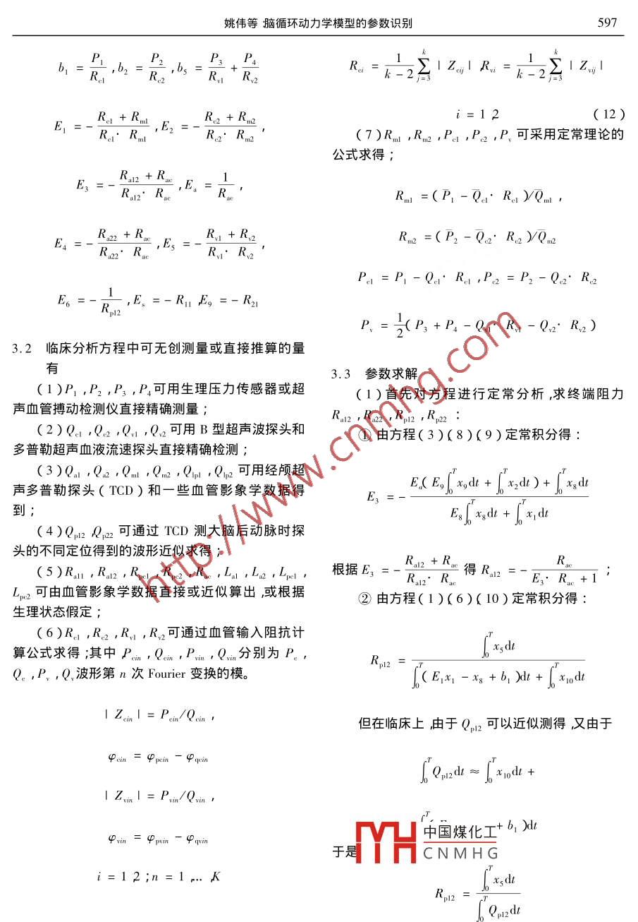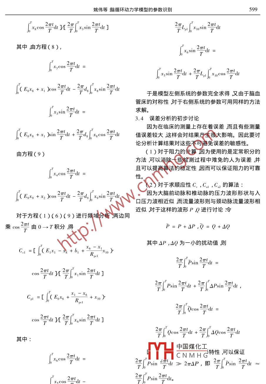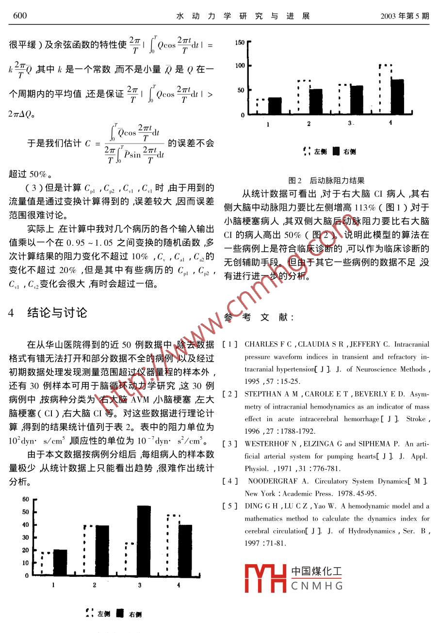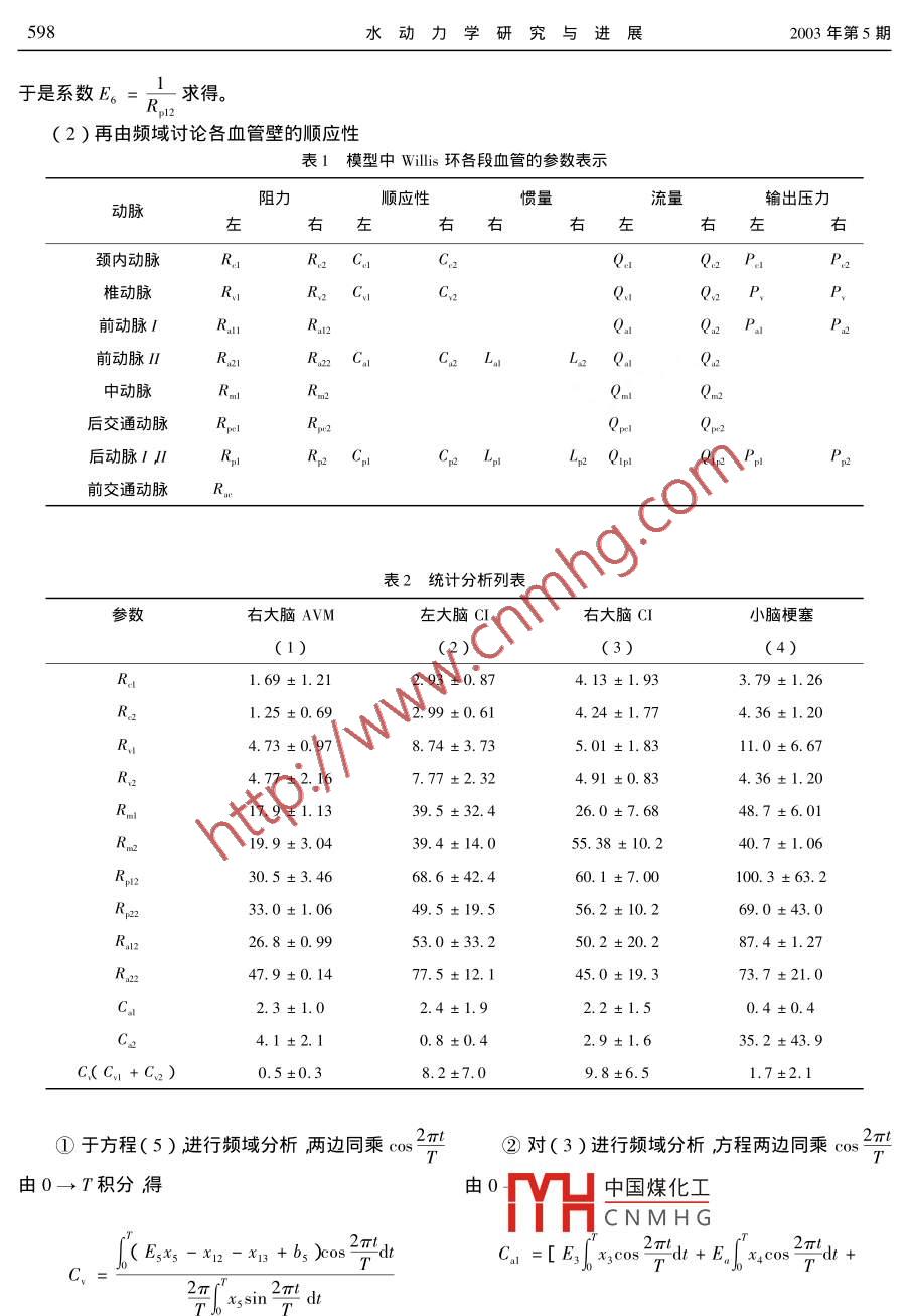 A輯第18卷第5期水動力學(xué)研究與進(jìn)展Ser. A, Vol 18 No 52003年9月JOURNAL OF HYDRODYNAMICSSep.,2003文章編號1000-48742003)5059506腦循環(huán)動力學(xué)模型的參數(shù)識別姚偉,丁光宏2,劉輝王盛章,呂傳真2,陳韶華2(1.復(fù)旦大學(xué)力學(xué)與工程科學(xué)系,上海2004332.華山醫(yī)院上海200040)摘要:本文根據(jù)已建立的腦 Willis環(huán)參數(shù)模型進(jìn)一步簡化并進(jìn)行模型參數(shù)方程的反問題求解通過計(jì)算結(jié)果與實(shí)際結(jié)論對比發(fā)現(xiàn)理值可以反映一些病例的臨床診斷結(jié)果關(guān)鍵詞:集中參數(shù)模型洫血液動力學(xué)脈動流反問題中圖分類號:0368文獻(xiàn)標(biāo)識碼arameter identification of a hydrodynamic modeldescribing the cerebral circulationYAO WeiDING Guang-hongLIU HuiWANG Sheng-zhangLU Chuan-zhenchen Shao-hua1. Department of Mechanics and Engineering Science, Fudan University Shanghai 200433,China2. Hua Shan Hospital, Shanghai 200040, Chinacerebral circulation set up in our previous workd developed a mathematical method to solve the inverse problem and obtained the values of indeces in the model. Compared with theclinical data from Huashang Hospital, most theoretical results agreed with the clinical diagnosesKey words: lumped parameters model hemodynamics pulsatile flow inverse problem引言變13。因此一些學(xué)者開始著手從建立模型的方法來研究腦血管疾病腦血管疾病是危害人類生命的重要疾病之本實(shí)驗(yàn)室根據(jù)腦循環(huán)的特點(diǎn)建立了一個(gè)具有四它不僅發(fā)病率高、死亡率高、并且致殘率復(fù)發(fā)率都很端輸入的腦wlis環(huán)的集中參數(shù)模型模型根據(jù)定高給家庭和社會造成嚴(yán)重的精神和經(jīng)濟(jì)負(fù)擔(dān)。大常流的特點(diǎn)將Wls環(huán)的大血管分成18段每段用量的臨床和動物實(shí)驗(yàn)表明,許多腦血管疾病在發(fā)病dH中國煤化工的特點(diǎn)考慮到血管壁前期腦血管動力學(xué)參數(shù)住往已經(jīng)有顯著改變而且的彈CNMHG分別用8個(gè)流容器這些動力學(xué)改變常常要明顯地早于形態(tài)學(xué)的改(C,C2,C1,C2,C,Ca,Cn,Cg)表示左右*收稿日期:199909-12(2003-03-12修改稿)作者教揖姚偉(1973-)女遼寧朝陽人講師博士596水動力學(xué)研究與進(jìn)展2003年第5期大腦的頸、椎、前、后等血管的順應(yīng)性,用流感器R,+ r(L1,La,La,La)分別表示左右頸動脈系統(tǒng)和椎R、1·R動脈系統(tǒng)的慣量用流感器(L,L2)來表示左右后交通動脈的慣量還有6個(gè)終端阻力分別加入到P, Pa(5)它們各自的動脈血管。由此模型得到的狀態(tài)方程的正問題求解無論是在時(shí)域還是在頻域方面都與生理實(shí)際相符合3PdtOP在對此模型的正、反問題的求解過程中發(fā)現(xiàn)模型的參數(shù)L,L2的變化對理論計(jì)算的結(jié)果影響極微甚至將其置零結(jié)果都不會產(chǎn)生較大的變化因而(6)我們可以認(rèn)為大腦后交通動脈的慣性可以忽略:并且還發(fā)現(xiàn)我們將R置零其值由R1,R2分擔(dān)R置零其值加到Rn2上R2置零其值加到Ra2上OP這樣對理論計(jì)算的結(jié)果影響也很微小于是我們認(rèn)為R,R,Ra的阻力可忽略。由此我們得到相吋簡化的集中參數(shù)模型。R(7)2狀態(tài)方程dt對此模型可用電路分析方法建立狀態(tài)方程IPR1·R.≠、R+rRd Qu(10)PO(1)dQR,·RR方程中的參數(shù)說明列于表1。PPR(2)3參數(shù)求解及誤差分析dPR+R3.1為了方便求解我們將方程中的部分參數(shù)如下dtR12·R(3)Pa中國煤化工R,+CNMHGRPa+q(4)Q1姚偉等腦循環(huán)動力學(xué)模型的參數(shù)識別597PP,b2RR+R(12)(7)Rn,Rn2,P1,P2,P可采用定常理論的公式求得R,2 +rRa1=(P1-Qa·Ra1)Q1,R+rRn2=(P2-Qa·R2)QPa1=P1-Q·RE。=-R1ERP3+ P4-QR、2)3.2臨床分析方程中可無創(chuàng)測量或直接推算的量有3參數(shù)求解(1)P,P2,P3,P4可用生理壓力傳感器或超1)首先對方程進(jìn)行定常分析,求終端阻力聲血管搏動檢測儀直接精確測量;Rp, Rn, rn r(2)Q。,Q。,Q、1,(a可用B型超聲波探頭和①由方程(3)(8)(9)定常積分得多普勒超聲血液流速探頭直接精確檢測(3)Qu,Q2,Qn,Qn,Q1,Q可用經(jīng)顱超聲多普勒探頭(TCD)和一些血管影象學(xué)數(shù)據(jù)得E (EoL xo dt+x,dt)dt到EsI xsdtdt4)Q12Qa2可通過TCD測大腦后動脈時(shí)探頭的不同定位得到的波形近似求得Ra+rR(5)Rall, Ral2,Rpel, Rpe, Rae, Lat根據(jù)E3=-Rn2·R可由血管影象學(xué)數(shù)據(jù)直接或近似算出,或根據(jù)②由方程(1)(6)(10)定常積分得生理狀態(tài)假定(6)R1,R2,R、1,R、2可通過血管輸入阻抗計(jì)算公式求得;其中P,Qm,Pm,Qm分別為PdtRQ。,P、,Q波形第n次 Fourier變換的模。(ExI -x8+b)dt+todtZein I= pen/Qcin I但在臨床上由于Qn12可以近似測得又由于1Z、m=Pmn/Qmφmin=φpwin-9qin中國煤化工+b于是HCNMHGdt2Pldt598水動力學(xué)研究與進(jìn)展2003年第5期于是系數(shù)E求得R(2)再由頻域討論各血管壁的順應(yīng)性表1模型中wlis環(huán)各段血管的參數(shù)表示阻力順應(yīng)性慣量輸出壓力動脈左右左右左右左右頸內(nèi)動脈RR CCC, CP椎動脈R、1前動脈P前動脈I中動脈后交通動脈Rm后動脈HR.前交通動脈R表2統(tǒng)計(jì)分析列表參數(shù)右大腦AVM左大腦CI右大腦CI(1)R1.69±1.212.93±0.873.79±1.261,25±0.692.99±0.614.36±1.204.73±0.978.74±3.735.01±1.8311.0±6.674.77±2.167.77±2.324.91±0.834.36±1.20R17.9±1.1339.5±32.426.0±7.6848.7±6.0119.9±3.0439.4±14.055,38±10.2RR49,5±19.5R53.0±33.22±20.R47,9±0.1477.5±12.145.0±19.373.7±21.02.4±1.92.2±1.54.1±22.9±1.