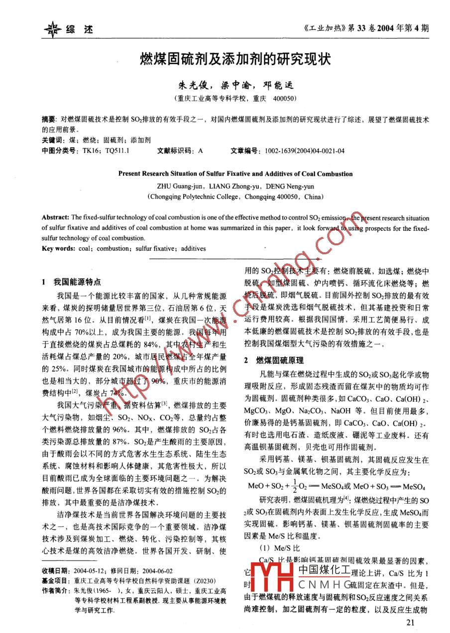 貴綜述《工業(yè)加熱》第33卷2004年第4期燃煤固硫劑及添加劑的研究現(xiàn)狀朱光俊,梁中渝,鄧能運(yùn)(重慶工業(yè)高等??茖W(xué)校,重慶400050)摘要:對(duì)燃煤固硫技術(shù)是控制SO排放的有效手段之-,對(duì)國(guó)內(nèi)燃煤固硫劑及添加劑的研究現(xiàn)狀進(jìn)行了綜述,展望了燃煤固硫技術(shù)的應(yīng)用前景.關(guān)鍵詞:煤;燃燒;固硫劑;添加劑中圖分類號(hào): TK16; TQ511.1文獻(xiàn)標(biāo)識(shí)碼: A文章編號(hào): 1002-1639200)04-0021-04Present Research Situation of Sulfur Fixative and Additives of Coal CombustionZHU Guang-jun, LIANG Zhong-yu, DENG Neng-yun(Chongqing Polytechnic College, Chongqing 400050, China)Abstract: The fixed-sulfur technology of coal combustion is one of the efective method to control SO2 emission, the present research situationof sulfur fixative and additives of coal combustion at home was summarized in this paper, it look forward to using prospects for the fixed-sulfur technology of coal combustion.Key words: coal; combustion; sulfur fixative; additives用的SO2控制技術(shù)主要有:燃燒前脫磽,如選煤;燃燒中1我國(guó)能源特點(diǎn)脫硫,如型煤固硫、爐內(nèi)噴鈣、循環(huán)流化床燃燒等;燃我國(guó)是-個(gè)能源比較豐富的國(guó)家,從幾種常規(guī)能源燒后脫硫,即煙氣脫硫.目前國(guó)外控制SO.排放的最有效來(lái)看,煤炭的探明儲(chǔ)量居世界第三位,石油居第6位,天手段是煤炭洗選和煙氣脫硫技術(shù),但其基建投資和日常然氣居第16位。從目前情況看",煤炭在我國(guó)一次能源運(yùn)行費(fèi)用較高。根據(jù)我國(guó)國(guó)情,采用工藝簡(jiǎn)便易行、成構(gòu)成中占70%以上,成為我國(guó)主要的能源。我國(guó)每年用本低廉的燃煤固硫技術(shù)是控制SO2排放的有效手段,也是于直接燃燒的煤炭占總煤耗的84%,其中農(nóng)村生產(chǎn)和生控制我國(guó)煤煙型大氣污染的有效措施之- - .活耗煤占煤總產(chǎn)量的20%,城市居民燃煤占全年煤產(chǎn)量2燃煤固硫原理的25%。同時(shí)煤炭在我國(guó)城市的能源構(gòu)成中所占的比例凡能與煤在燃燒過(guò)程中生成的SO2或SOz起化學(xué)或物也是相當(dāng)大的,部分城市超過(guò)了90%,重慶市的能源消理吸附反應(yīng),形成固態(tài)殘?jiān)粼诿夯抑械奈镔|(zhì)均可作費(fèi)結(jié)構(gòu)中2,煤炭占74%.我國(guó)大氣污染嚴(yán)重,據(jù)資料估算B),燃煤排放的主要為固硫劑.固硫劑種類很多,如CaCO3. CaO、Ca(OH) 2.大氣污染物,如煙塵、SO2、 NOx. CO2等, 總量約占整MgCO3、MgO、Na2CO3、 NaOH等。但目前使用最多,個(gè)燃料燃燒排放量的96%.其中,燃煤排放的SO2占 各價(jià)廉易得的是鈣基固硫劑,即CaCO3、CaO、Ca(OH) 2.類污染源總排放量的87%。SO2是產(chǎn)生酸雨的主要原因,有時(shí)也選用電石渣、造紙廢液、硼泥等工業(yè)廢料。還有由于酸雨會(huì)以不同的方式危害水生生態(tài)系統(tǒng)、陸生生態(tài)高溫鋇基固硫劑,貝殼也可用作固硫劑。系統(tǒng)、腐蝕材料和影響人體健康,其危害性極大,所以采用鈣基、鎂基、鋇基固硫劑,其固硫反應(yīng)發(fā)生在目前酸雨已成為全球面臨的主要環(huán)境問(wèn)題之一。為解決SO2或SO3與金屬氧化物之間,其主要化學(xué)反應(yīng)為:酸雨問(wèn)題,世界各國(guó)都在采取切實(shí)有效的措施控制SO2的MeO + SO2+ -02 - MeSO4或MeO + SO3一MeSO4排放,其中最重要的是潔凈煤技術(shù).研究表明,燃煤固硫機(jī)理為":煤燃燒過(guò)程中產(chǎn)生的so潔凈煤技術(shù)是當(dāng)前世界各國(guó)解決環(huán)境問(wèn)題的主要技z或SO,在固硫劑內(nèi)外表面上發(fā)生化學(xué)反應(yīng),生成MeSO.而術(shù)之一,也是高技術(shù)國(guó)際競(jìng)爭(zhēng)的一個(gè)重要領(lǐng)域。潔凈煤實(shí)現(xiàn)固硫.影響鈣基、鎂基、鋇基固硫劑固硫率的主要技術(shù)涉及到煤炭加工、燃燒、轉(zhuǎn)化、污染控制等,其核因素是Me/S比和溫度.心技術(shù)是煤的高效潔凈燃燒。世界各國(guó)開(kāi)發(fā)、研制、(1) Me/S比CalS比是影響鈣基固硫劑固硫效果最顯著的因素,收稿日期: 2004-05-12; 修回日期: 2004-06-02中國(guó)煤化工理論上講,CalS 比為1基金項(xiàng)目:重慶工業(yè)高等專科學(xué)校自然科學(xué)資助課題(Z0230)!Y片CNMHG硫固定在灰渣中。但是,作者簡(jiǎn)介:朱光俊(1965- ), 女,重慶云陽(yáng)人,碩士,重慶工業(yè)高由于燃煤硫的釋放速度與固硫劑和SO2反應(yīng)速度之間關(guān)系等??茖W(xué)校材料工程系副教授.現(xiàn)主要從事能源環(huán)境教學(xué)與研究工作.尚難控制,加之固硫劑有-定的粒度,以及反應(yīng)生成物21資綜述《工業(yè)加熱》第33卷2004年第4期對(duì)SO擴(kuò)散影響等,降低鈣的利用率,因此必須加過(guò)量固出H2O,其生成的CaO顆粒的空隙多,比表面積大,和硫劑才可達(dá)到較好固硫效果.SO2反應(yīng)速率高,所以Ca(OH)2固硫效果好于CaO,其最在燃煤過(guò)程中,Ca/S比反映了固硫劑用量的大小,佳固硫溫度是800~ 1000 C.Ca/S比越大,固硫劑用量越大。固硫劑用量大小,對(duì)固在煤燃燒過(guò)程中,CaCO3首先煅燒分解成CaO, 然硫效果有著決定性的影響。固硫劑用量不足,就不能有后CaO與SO,進(jìn)行反應(yīng),從而達(dá)到固硫目的.研究表明,效控制氣體硫化物的排放;但用量過(guò)多,則增加成本并CaO的最佳固硫溫度為800 C左右,固硫率可達(dá)82%,導(dǎo)致?tīng)t內(nèi)結(jié)渣。在