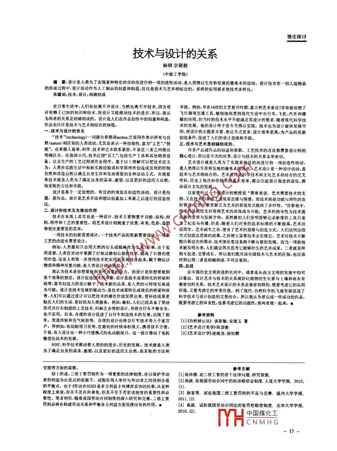 理論探討技術(shù)與設(shè)計(jì)的關(guān)系楊鋼宗硯毅.(中原工學(xué)院)摘要:設(shè)計(jì)是人類(lèi)為了實(shí)現(xiàn)某種特定的目的而進(jìn)行的一項(xiàng)創(chuàng)造性活動(dòng),是人類(lèi)得以生存和發(fā)展的最基本的活動(dòng)。設(shè)計(jì)包含在一切人造物品的形成過(guò)程中,設(shè)計(jì)活動(dòng)作為人工制品的創(chuàng)意和構(gòu)思,往往是技術(shù)與藝術(shù)相結(jié)合的。多樣的實(shí)用要求使技術(shù)多樣化。關(guān)鍵詞:技術(shù);設(shè)計(jì):相輔相成在日常生活中,人們處處離不開(kāi)設(shè)計(jì),當(dāng)然也離不開(kāi)技術(shù),因?yàn)樵O(shè)手段。例如:早在16世紀(jì)文藝復(fù)興時(shí)期,意大利藝術(shù)家達(dá)?芬奇就設(shè)想了計(jì)依賴(lài)于已知的知識(shí)和技術(shù),而設(shè)計(jì)又能推動(dòng)技術(shù)的進(jìn)步,所以,我認(rèn)飛行器等交通工具,地洞悉到現(xiàn)代生活中自行車(chē)、飛機(jī)、汽車(chē)和潛為兩者的關(guān)系是相輔相成的。設(shè)計(jì)是人們?cè)谧髌穭?chuàng)作中的創(chuàng)意和構(gòu)思,艇的應(yīng)用,但當(dāng)時(shí)的技術(shù)水平不能滿(mǎn)足其設(shè)計(jì)的要求,隨著現(xiàn)代科學(xué)技作品也往往是技術(shù)與藝術(shù)相結(jié)合的體現(xiàn)。術(shù)的發(fā)展,他的設(shè)計(jì)終于在今天得以實(shí)現(xiàn)。技術(shù)也為設(shè)計(jì)提供發(fā)展空一、技術(shù)與設(shè)計(jì)的含義間,使設(shè)計(jì)的主題更豐富、表達(dá)方式更多、設(shè)計(jì)效率更高,為產(chǎn)品的更新“技術(shù)"(echnology)-詞源 自希臘語(yǔ)techne,它原用作表示所有與自創(chuàng)造 條件,促進(jìn)了人們的設(shè)計(jì)思維和手段。然(nature)相區(qū)別的人類(lèi)活動(dòng),尤其是表示-種技能性,意為“ 工藝”、“技三 、技術(shù)與藝術(shù)是相輔相成的。能"。在希臘人看來(lái),科學(xué)技術(shù)和藝術(shù)聯(lián)系緊密,不易在三者之間做出許多產(chǎn)品或作品的創(chuàng)意和革新,工藝技術(shù)的改良都需要設(shè)計(jì)師的明確區(qū)分。在我國(guó)古代,技術(shù)泛指“百工”,包括生產(chǎn)工具和其他物質(zhì)設(shè)精心設(shè)計(jì),所以在今天的世界,設(shè)計(jì)與技術(shù)的關(guān)系非常密切。備,以及生產(chǎn)的工藝過(guò)程或作業(yè)程序?;谝陨?理解可以把技術(shù)定義藝術(shù)設(shè)計(jì)就是人類(lèi)為了實(shí)現(xiàn)某種目的而進(jìn)行的項(xiàng)創(chuàng)造性活動(dòng),為:人類(lèi)在實(shí)踐生活中根據(jù)實(shí)賤經(jīng)驗(yàn)或科學(xué)原理所創(chuàng)造或發(fā)明的控制是人類(lèi)得以生存和發(fā)展的最基 本的活動(dòng)。藝術(shù)設(shè)計(jì)是一-種設(shè)計(jì)活動(dòng),是.自然和改造自然以滿(mǎn)足自身生存和發(fā)展需要的各種活動(dòng)方式。在我看技術(shù)與藝術(shù)相結(jié)合的。 藝術(shù)設(shè)計(jì)是科學(xué)技術(shù)和文化藝術(shù)相結(jié)合的交叉來(lái)技術(shù)就是人類(lèi)為了滿(mǎn)足自身的需求,愿望,以及更好的適應(yīng)大自然,學(xué)科, 歷史上每次科學(xué)技術(shù)的重大變革,都會(huì)引起設(shè)計(jì)觀(guān)念的進(jìn)化,推而采取的方法和手段。動(dòng)設(shè)計(jì)文化的發(fā)展。設(shè)計(jì)是基于- -定設(shè)想的,有目的的規(guī)劃及創(chuàng)造性活動(dòng),設(shè)計(jì)是溝以前曾聽(tīng)過(guò)一-個(gè)搞設(shè)計(jì)的教授說(shuō)“簡(jiǎn)單來(lái)說(shuō),藝術(shù)需要技術(shù)的支通,是傳達(dá)。設(shè)計(jì)是藝術(shù)手法和想法創(chuàng)意加工革新之后進(jìn)行的信息傳持, 又在技術(shù)的基礎(chǔ)上表現(xiàn)著思維與情感。而技術(shù)則是功能與理性的良大。好表述,它的不斷更新又為藝術(shù)的表現(xiàn)形式提供了多樣性。"在影視中,二、設(shè)計(jì)和技術(shù)互為推動(dòng)作用技術(shù)的基礎(chǔ)性支持使得藝術(shù)的表現(xiàn)成為可能;藝術(shù)的指導(dǎo)性為技術(shù)提技術(shù)在本質(zhì)上其實(shí)也是-種設(shè)計(jì),技術(shù)主要側(cè)重于功能、結(jié)構(gòu)、材出新的要求 與發(fā)展方向。雖然最初人們發(fā)明能夠記錄影像的工具只是料,程序和T.藝的重要性。而藝術(shù)設(shè)計(jì)則側(cè)重于欣賞,審美,色彩,造型為了紀(jì)實(shí)與傳播, 但是,隨著人們對(duì)美的追求標(biāo)準(zhǔn)的不斷提高,藝術(shù)應(yīng)等更注重感覺(jué)的需求。運(yùn)而生。藝術(shù)誕生之后,便有了藝術(shù)的思維與創(chuàng)造式。人們運(yùn)用這些一項(xiàng)技 術(shù)的創(chuàng)新需要設(shè)計(jì),一個(gè)技術(shù)產(chǎn)品的更新需要設(shè)計(jì),一-項(xiàng)新方 式創(chuàng)造出思維的成果,之后便又需要技術(shù)去實(shí)現(xiàn)它。藝術(shù)對(duì)技術(shù)不斷工藝的改進(jìn)也需要設(shè)計(jì)。提出新層次的要求,技術(shù)便沿著這條路不斷有新的發(fā)展。而當(dāng)一項(xiàng)新技例如:人類(lèi)最初只會(huì)用天然的石頭或棍棒作為工具,后來(lái),出于實(shí)術(shù)被發(fā)明出來(lái), 人們就會(huì)再次思考它能夠衍生的藝術(shù)成果。二者就著樣用需要,人類(lèi)在勞動(dòng)中掌握了打制及磨制石器的技術(shù)