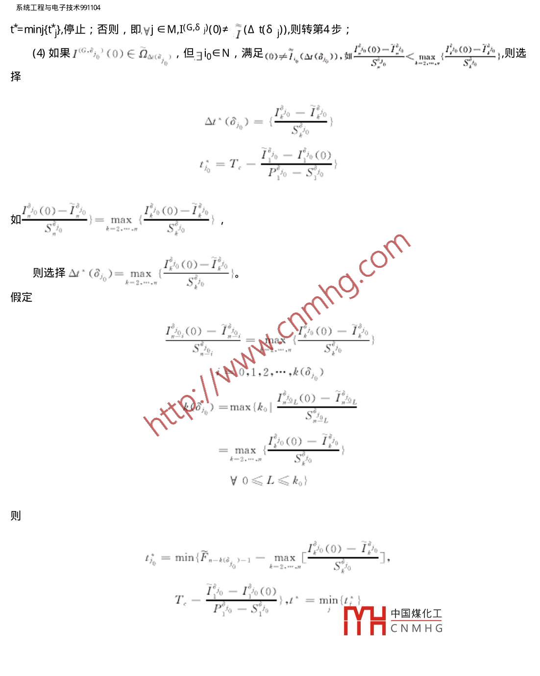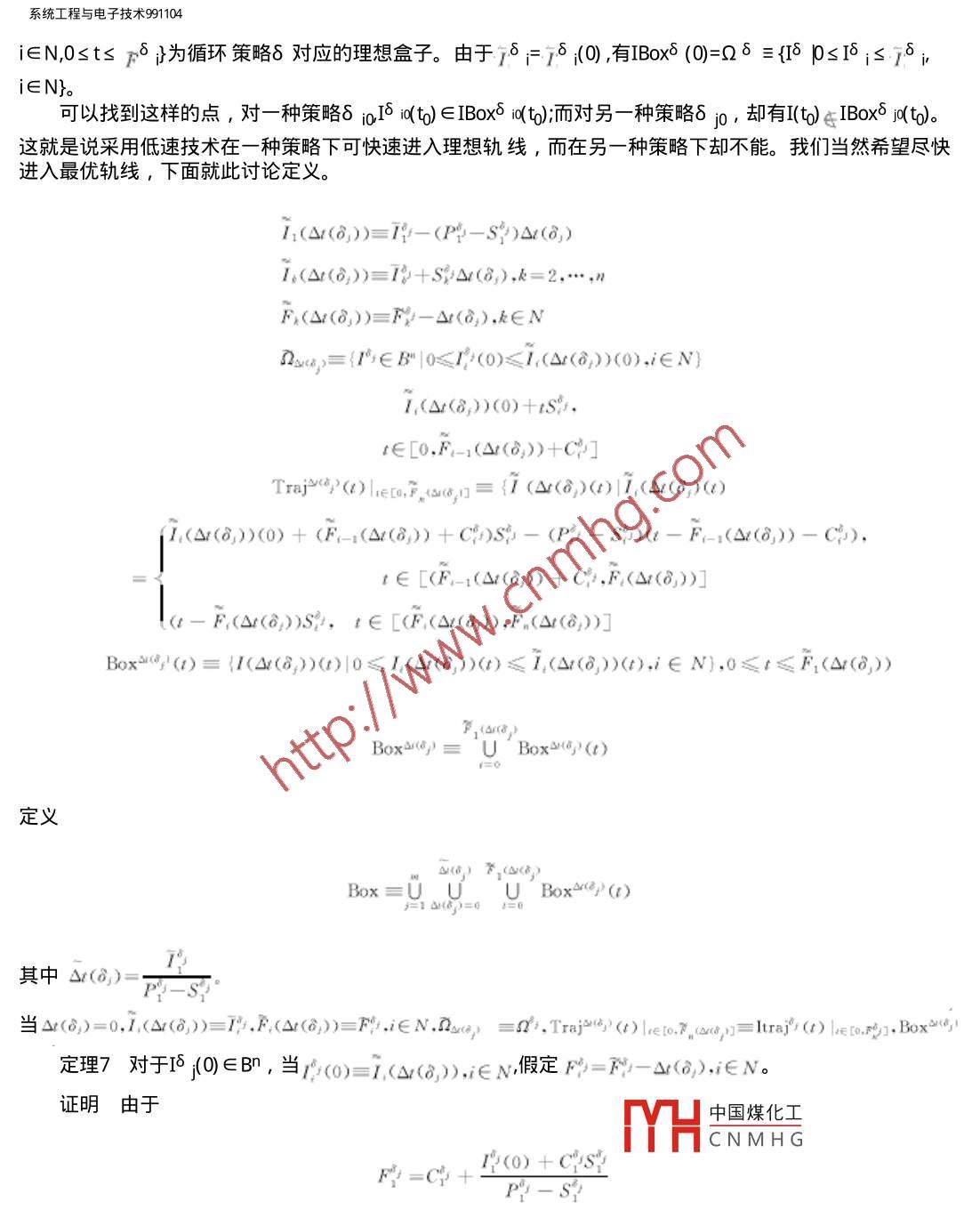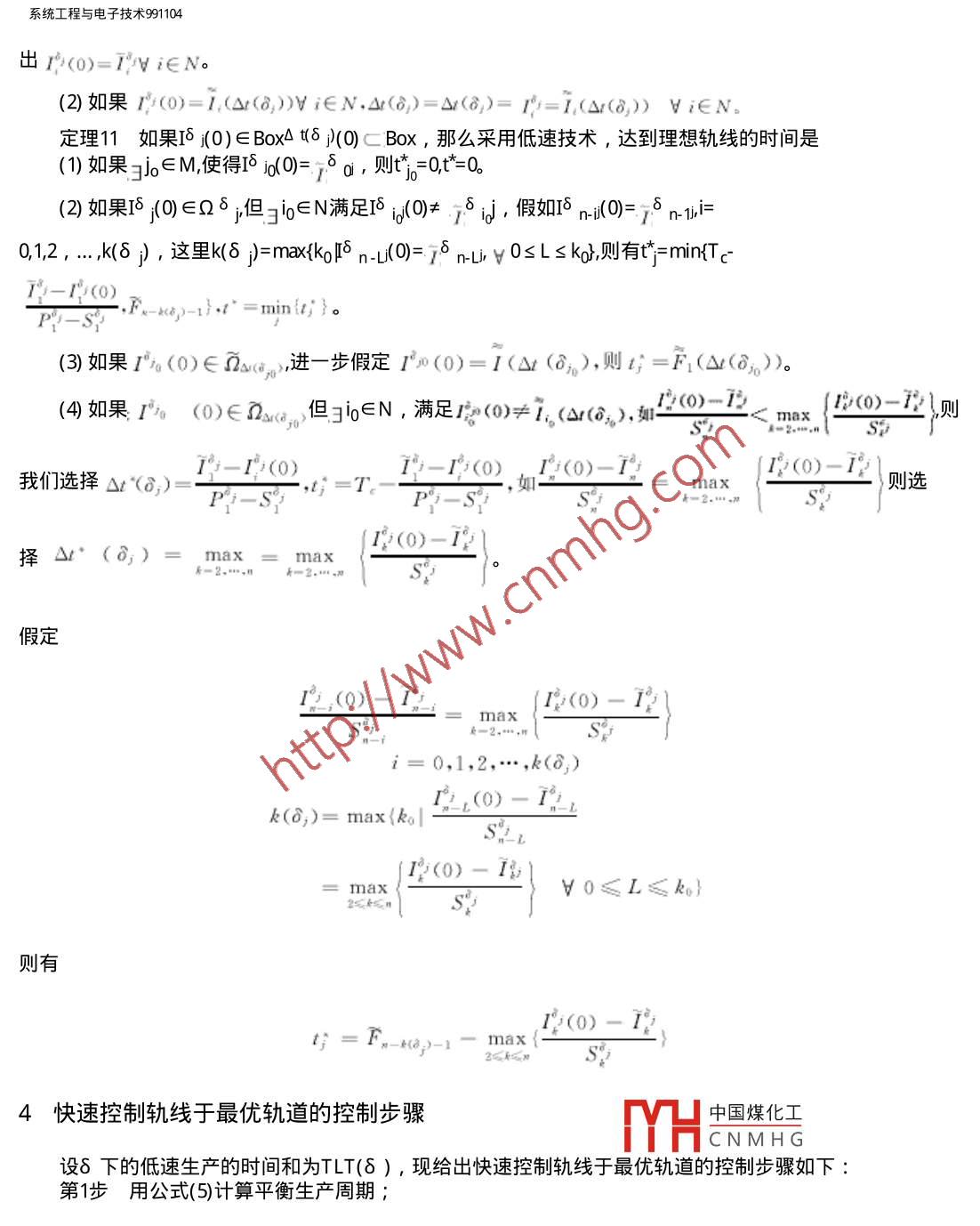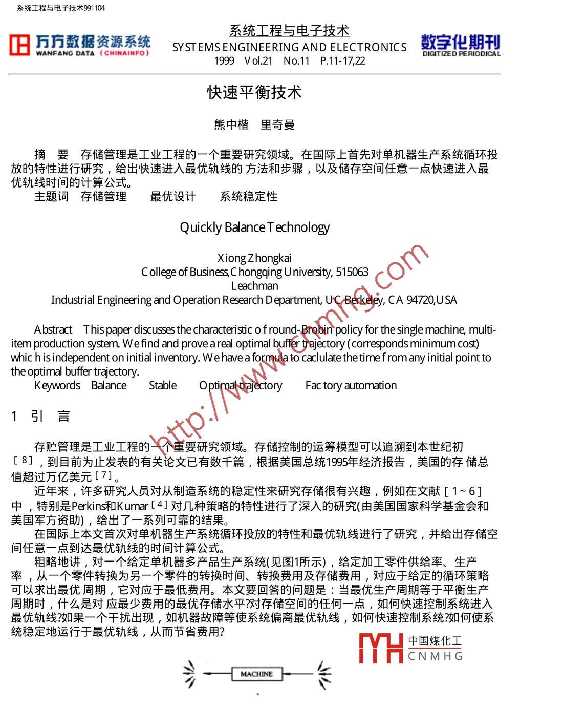系統(tǒng)工程與電子技術(shù)91104日資源系統(tǒng)系統(tǒng)工程與電子技術(shù),數(shù)字化期刊WANFANG DATA ( CHINAINFO)SYST EMS ENGINEERING AND ELECT RONICSDIGI1999 V ol.21No.11P.11-17,22快速平衡技術(shù)熊中楷里奇曼摘要存儲管理是工業(yè)工程的一個重要研究領(lǐng)域。在國際上首先對單機器生產(chǎn)系統(tǒng)循環(huán)投放的特性進行研究,給出快速進入最優(yōu)軌線的方法和步驟,以及儲存空間任意一點快速進入最優(yōu)軌線時間的計算公式。主題詞存儲管理最優(yōu)設(shè)計系統(tǒng)穩(wěn)定性Quickly Balance T echnologyXiong ZhongkaiCollege of Business,Chongqing University, 515063LeachmanIndustrial Engineering and Operation Research Department, UC Berkeley, CA 94720,USAAbstract T his paper discusses the characteristic 0 f round- Brobin policy for the single machine, multi-item production system. We find and provea real optimal buffer trajectory (corresponds minimum cost)whic h is independent on initial inventory. We have a formula to caclulate the time f rom any initial point tothe optimal buffer trajectory. .Keywords BallanceStableOptimal trajectory Fac tory automation1引言存貯管理是工業(yè)工程的一個重要研究領(lǐng)域。存儲控制的運籌模型可以追溯到本世紀初[8],到目前為止發(fā)表的有關(guān)論文已有數(shù)千篇,根據(jù)美國總統(tǒng)1995年經(jīng)濟報告,美國的存儲總值超過萬億美元[7]。近年來,許多研究人員對從制造系統(tǒng)的穩(wěn)定性來研究存儲很有興趣,例如在文獻[1~6]中,特別是Perkins和Kumar [ 4]對幾種策略的特性進行了深入的研究(由美國國家科學(xué)基金會和美國軍方資助) ,給出了-系列可靠的結(jié)果。在國際上本文首次對單機器生產(chǎn)系統(tǒng)循環(huán)投放的特性和最優(yōu)軌線進行了研究,并給出存儲空間任意- -點到達最優(yōu)軌線的時間計算公式。粗略地講,對一個給定單機器多產(chǎn)品生產(chǎn)系統(tǒng)(見圖1所示) ,給定加工零件供給率、生產(chǎn)率,從一個零件轉(zhuǎn)換為另-個零件的轉(zhuǎn)換時間、轉(zhuǎn)換費用及存儲費用,對應(yīng)于給定的循環(huán)策略可以求出最優(yōu)周期,它對應(yīng)于最低費用。本文要回答的問題是:當最優(yōu)生產(chǎn)周期等于平衡生產(chǎn)周期時,什么是對應(yīng)最少費用的最優(yōu)存儲水平?對存儲空間的任何一點,如何快速控制系統(tǒng)進入最優(yōu)軌線?如果-個干擾出現(xiàn),如機器故障等使系統(tǒng)偏離最優(yōu)軌線,如何快速控制系統(tǒng)?如何使系統(tǒng)穩(wěn)定地運行于最優(yōu)軌線,從而節(jié)省費用?中國煤化工MHCNMH G頭MCINE]--一年fle:/// Vqkx99991104.htom(第1/ 18頁) 2010-3-23 12:01:49系統(tǒng)工程與電子技術(shù)991104圖1單機器多產(chǎn)品生產(chǎn)系統(tǒng)2符號與主要結(jié)論我們定義如下符號:i--零件標號, i∈N={,2... ,n};Cδ ir-在采用循環(huán)策略δ j時轉(zhuǎn)換機器,以加工第1種零件所需時間, i∈Nj∈M={1,2, .. ,m}, .m=n!,Cδ ji=C;;p8 i--采用循環(huán)策略δ j時,第i種零件的生產(chǎn)率, Pδ ji=P;i∈Nj∈M ;Sδ i--采用循環(huán)策略δ時,第i種零件的平均供給率, Sδ ji= S;i∈N,j∈M ;I(G,8 }(t)--采用循環(huán)策略δ ;時,第G周期第i種零件在時刻的存儲水平10.)(1)= (19092)(1)Iδ i()--采用循環(huán)策略δ j時,第i種零件在時刻的存儲水平, *()= (p(r)(2(,../(1)”.1,V i∈N .(t)=r'(t);F(G,8 }()--采用循環(huán)策略δ ;時,在第G周期完成零件1到零件i所用的累計時間,本文假定零件不間斷加工, i∈Nj∈M ;Fδ j-采用循環(huán)策略δ ;時,完成零件1倒零件i所用的累計時間;T*-最優(yōu)生產(chǎn)時間;T*S jir采用循環(huán)策略δ ;時,第i種零件的最優(yōu)加工時間;Bn--n維存儲空間;t*--采用循環(huán)策略j時,對給定的初始存儲狀態(tài)到達最優(yōu)軌線的最快時間;t--對給定初始存儲狀態(tài)到達最優(yōu)軌線的最快時間1" = min{t; )h--第i種零件單位時間的存儲費用;A--轉(zhuǎn)換加工零件i所需時間;m:--兩次加工零件i相隔的基本周期數(shù)。在給出本文的定理前,我們還給出一些定義。定義1對一 一個制造系統(tǒng),如果存在常數(shù),整數(shù)m≥0,使得.I:(Ts+mTJ)=I(T),i∈N (1)我們稱這個制造系統(tǒng)是平衡的(從時刻T起) ,稱T是平衡生產(chǎn)周期(如圖2所示)。中國煤化工MHCNM HGfle:/// Vqkxcg9919991104.htm(第2/ 18頁) 2010-3-23 12:01:49系統(tǒng)工程與電子技術(shù)991104圖2理解平衡生產(chǎn)周期定義定義2如果制造系統(tǒng)是平衡的,并且有最低存儲水平,我們稱這個制造系統(tǒng)處于理想平衡,稱點I*∈B^理想存儲點。現(xiàn)在我們給出本文的一些主要結(jié)論。定理1對一個多產(chǎn)品單機器生產(chǎn)系統(tǒng),采用循環(huán)策略的理想平衡條件是習異+2骨=1 (2)其中T*=T*,vi∈N,T*=Tc,并且gj∈M,使得1(0)= 1=Ix-[B,+C]S,i∈N(3)其中...=尚)Ti(P-S/)=則.+C/+[/*(0)+(F 1+C;9S9]/(4)(P%- S°),i∈N階=0證明首先 ,我們證明1≥0oT.(P%-S))-=TSp-2c>+ 2r.JS)=[2c+ 2興T.JS, -六S2.t20+2 r]Sy≥0在時間[0,Tc] , 零件i的總投入量為TSδj,i∈N。其中生產(chǎn)時間為S1m加果機器中國煤化工不饑餓,則產(chǎn)品量應(yīng)為TYHCNM HGfle:/// Vqkxcg9919991104.htim(第3/ 18頁) 2010-3-23 12:01:49系統(tǒng)工程與電子技術(shù)991104(哥T"PI=S!T"這里假設(shè)機器不饑餓,并且19(T)=1<0)= Py,i∈N。.在時刻附,+C/..開始加工零件i ,這-時刻總的零件存儲應(yīng)該為P:+(P.+C)Si=1m=(尚T:(PI,-S%).Sδi在時刻刊9.,零件i的總存儲量正好為0 ,如果不