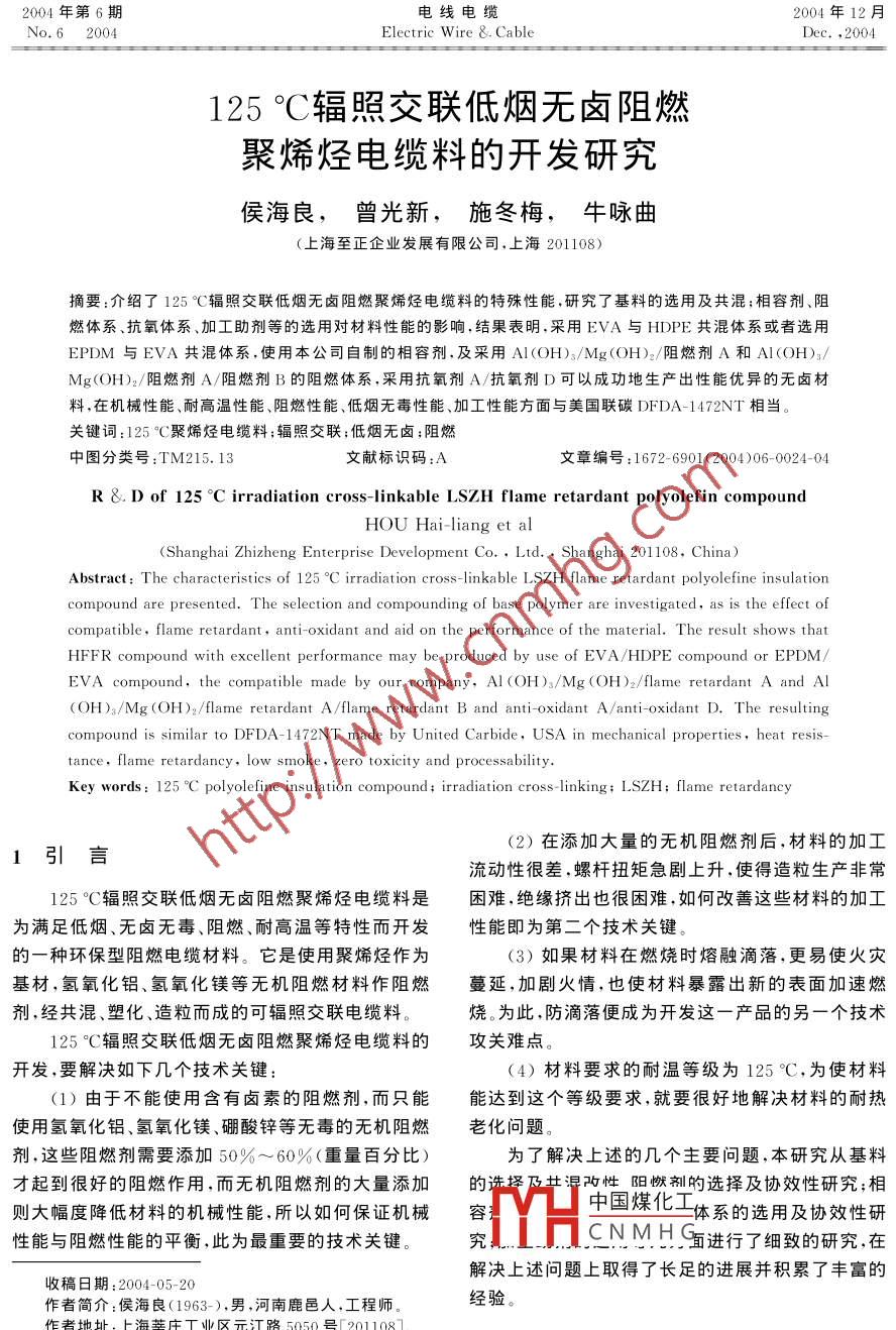 125 C輻照交聯(lián)低煙無鹵阻燃聚烯烴電纜料的開發(fā)研究