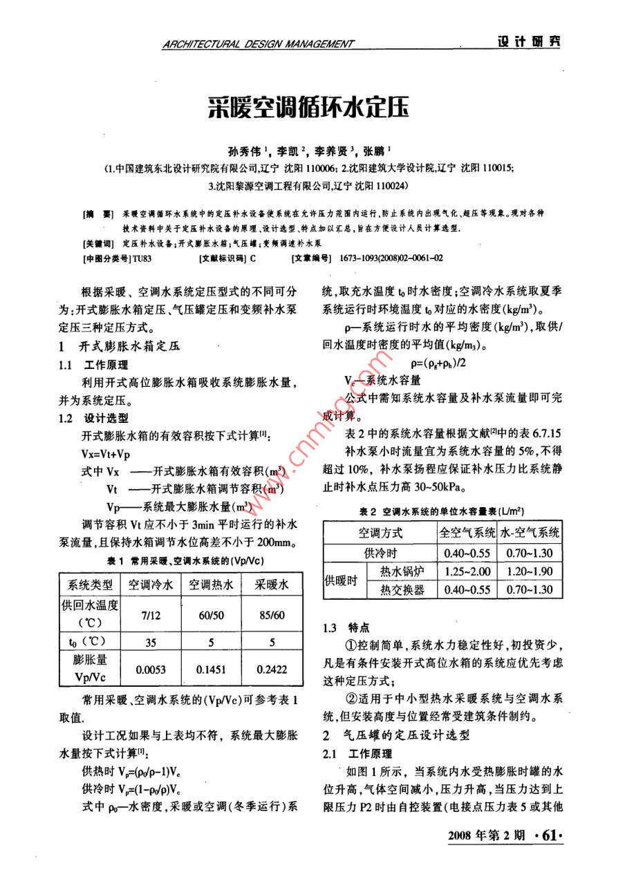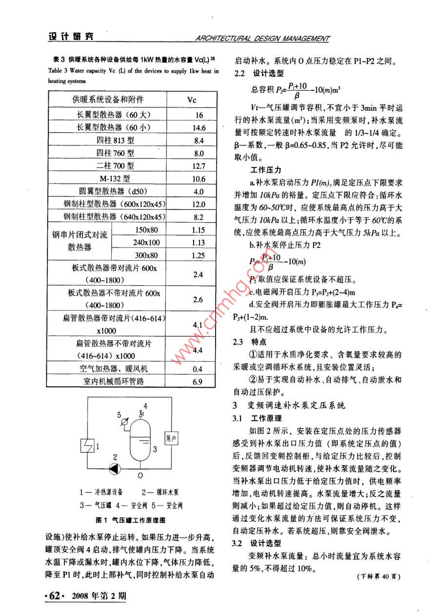 ARCHITECTURAL DESIGN MANAGEMENT設(shè)計研冀采暖空調(diào)循環(huán)水定壓孫秀偉’,李凱2,李養(yǎng)賢,張鵬(1中國建筑東北設(shè)計研究院有限公司遼寧沈陽10006:2沈陽建筑大學(xué)設(shè)計院遼寧沈陽110015;3沈陽黎源空調(diào)工程有限公司遼寧沈陽11004)摘要]果暖空調(diào)循環(huán)水系統(tǒng)中的定壓補水設(shè)備使系統(tǒng)在允許壓力范圍內(nèi)運行防止系統(tǒng)內(nèi)出現(xiàn)氣化超壓等現(xiàn)象?,F(xiàn)對各種技術(shù)資料中關(guān)于定壓補水設(shè)備的原理、設(shè)計選型、特點加以匯總,旨在方便設(shè)計人員計算選型[關(guān)鍵詞]定壓樸水設(shè)備;開式膨脹水箱;氣壓罐;變頻調(diào)速補水泵[中圖分類號]TU83[文獻標(biāo)識碉]C[文章編號]1673-1090200802-0061-02根據(jù)采暖、空調(diào)水系統(tǒng)定壓型式的不同可分統(tǒng)取充水溫度t時水密度;空調(diào)冷水系統(tǒng)取夏季為:開式膨脹水箱定壓、氣壓罐定壓和變頻補水泵系統(tǒng)運行時環(huán)境溫度對應(yīng)的水密度(kg/m3)。定壓三種定壓方式。p一系統(tǒng)運行時水的平均密度(kgm3),取供/1開式膨脹水箱定壓回水溫度時密度的平均值(kg/m3)。11工作原理p=(p2+pA)2利用開式高位膨脹水箱吸收系統(tǒng)膨脹水量,V。系統(tǒng)水容量并為系統(tǒng)定壓。公式中需知系統(tǒng)水容量及補水泵流量即可完1.2設(shè)計選型成計算。開式膨脹水箱的有效容積按下式計算嗎表2中的系統(tǒng)水容量根據(jù)文獻中的表6715Vx=Vt+Vp補水泵小時流量宜為系統(tǒng)水容量的5%,不得式中vx一開式膨脹水箱有效容積(m)超過10%,補水泵揚程應(yīng)保證補水壓力比系統(tǒng)靜開式膨脹水箱調(diào)節(jié)容積(m)止時補水點壓力高30-50kPaVp—一系統(tǒng)最大膨脹水量(m)表2空調(diào)水系統(tǒng)的單位水容量表(Lm2)調(diào)節(jié)容積vt應(yīng)不小于3min平時運行的補水空調(diào)方式全空氣系統(tǒng)水空氣系統(tǒng)泵流量,且保持水箱調(diào)節(jié)水位高差不小于200mm囊1常用采暖、空調(diào)水系統(tǒng)的vpc)供冷時04055070130熱水鍋爐125-200120-190系統(tǒng)類型空調(diào)冷水空調(diào)熱水采暖水供暖時熱交換器「040551070-1301供回水溫度7/1260/5013特點35①控制簡單,系統(tǒng)水力穩(wěn)定性好,初投資少膨脹量000530.14510.2422凡是有條件安裝開式高位水箱的系統(tǒng)應(yīng)優(yōu)先考慮這種定壓方式;常用采暖、空調(diào)水系統(tǒng)的(vpc)可參考表1②適用于中小型熱水采暖系統(tǒng)與空調(diào)水系取值統(tǒng),但安裝高度與位置經(jīng)常受建筑條件制約。設(shè)計工況如果與上表均不符,系統(tǒng)最大膨脹2氣壓罐的定壓設(shè)計選型水量按下式計算嗎21工作原理供熱時vF(pp-1)V如圖1所示,當(dāng)系統(tǒng)內(nèi)水受熱膨脹時罐的水供冷時v=(1-ppV位升高,氣體空間減小,壓力升高,當(dāng)壓力達(dá)到上式中p—水密度,采暖或空調(diào)(冬季運行)系限壓力P2時由自控裝置(電接點壓力表5或其他2008年第2期·61設(shè)計研咒AACHITECTURAL DESGN MANAGEMENT表3供暖系統(tǒng)各種設(shè)備供給每1kW熱量的水容量vcu)啟動補水。系統(tǒng)內(nèi)0點壓力穩(wěn)定在P1-P2之間。Tale3 Water capacity Ve(L) of the devices to supply Ikw heat in2.2設(shè)計選型總?cè)莘eP=P+10-10mm3供暖系統(tǒng)設(shè)備和附件V一氣壓罐調(diào)節(jié)容積,不宜小于3min平時運長翼型散熱器(60大)長翼型散熱器(60小)行的補水泵流量(m3);當(dāng)采用變頻泵時,補水泵流14.6量可按額定轉(zhuǎn)速時補水泵流量的1/3~14確定。四柱813型β一系數(shù),一般β=065-0.85,當(dāng)P2允許時,盡可能四柱760型取小值二柱700型工作壓力M-132型10.6a補水泵啟動壓力Pl(m滿足定壓點下限要求圓翼型散熱器(d50)4.0并增加 10k Pa的裕量。定壓點下限應(yīng)符合:循環(huán)水鋼制柱型散熱器(600x120x45)12.0溫度為60~50℃時,應(yīng)使系統(tǒng)最高點的壓力高于大鋼制柱型散熱器(640x120x45)8.2氣壓力l0kPa以上;循環(huán)水溫度小于等于60℃的系鋼串片閉式對流150x801.15統(tǒng),應(yīng)使系統(tǒng)最高點壓力高于大氣壓力5kPa以上。散熱器240x100b.補水泵停止壓力P2300x80板式散熱器帶對流片600xB24(400-1800P2取值應(yīng)保證系統(tǒng)設(shè)備不超壓。板式散熱器不帶對流片600xc電磁閥開啟壓力P=P2+(2-4m2.6(400~1800)d.安全閥開啟壓力即膨脹罐最大工作壓力P扁管散熱器帶對流片(416-614P+(1-2)mx1000且不應(yīng)超過系統(tǒng)中設(shè)備的允許工作壓力。扁管散熱器不帶對流片23特點44(416-614)x1000①適用于水質(zhì)凈化要求、含氧量要求較高的空氣加熱器、暖風(fēng)機采暖或空調(diào)循環(huán)水系統(tǒng),且安裝位置靈活;室內(nèi)機械循環(huán)管路②易于實現(xiàn)自動補水、自動排氣、自動泄水和自動過壓保護。3變頻調(diào)速補水泵定壓系統(tǒng)3.1工作原理如圖2所示,安裝在定壓點處的壓力傳感器感受到補水泵出口壓力值(即系統(tǒng)定壓點的值后,反饋回變頻控制柜,與給定壓力比較后,控制變頻器調(diào)節(jié)電動機轉(zhuǎn)速,使補水泵流量隨之變化。當(dāng)補水泵出口壓力低于給定壓力值時,供電頻率一冷熱瀑設(shè)備2—循環(huán)水泵增加,電動機轉(zhuǎn)速提高。水泵流量增大;反之流量3一氣壓罐4一安全閥5一安全閥則減小;如果超過給定壓力值,則自動停機。這樣圖1氣壓罐工作原理圖通過變化水泵流量的方法