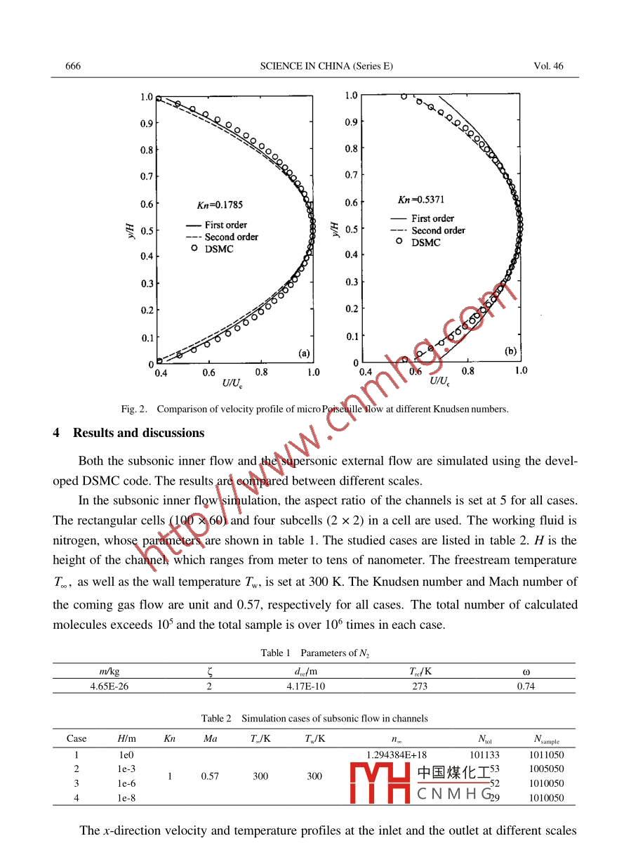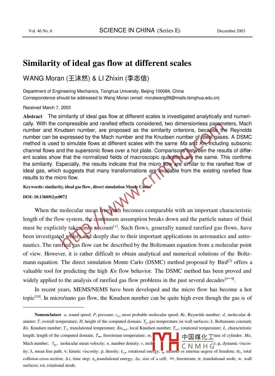 Vol. 46 No. 6SCIENCE IN CHINA(Series E)December 2003Similarity of ideal gas flow at different scalesWANG Moran(王沫然)& LI Zhixin(李志信)Department of Engineering Mechanics, Tsinghua University, Beijing 100084, ChinaCorrespondenceshouldbeaddressedtoWangMoran(email:moralwang99@mails.tsinghua.edu.cn)Received March 7. 2003Abstract The similarity of ideal gas flow at different scales is investigated analytically and numeri-cally. With the compressible and rarefied effects considered, two dimensionless parameters, Machnumber and Knudsen number, are proposed as the similarity criterions, because the Reynoldnumber can be expressed by the mach number and the Knudsen number of ideal gases. A DSMCmethod is used to simulate flows at different scales with the same Ma and Kn, including subsonicchannel flows and the supersonic flows over a hot plate. Comparisons between the results of different scales show that the normalized fields of macroscopic quantities are the same. This confirmsthe similarity. Especially, the results indicate that the micro flow are similar to the rarefied flow ofideal gas, which suggests that many transformations are available from the existing rarefied flowresults to the micro flowKeywords: similarity, ideal gas flow, direct simulation Monte CarloDOI:10.1360/02ye0072When the molecular mean free path becomes comparable with an important characteristiclength of the flow system, the continuum assumption breaks down and the particle nature of fluidmust be explicitly taken into account!. Such flows, generally named rarefied gas flows, havebeen investigated widely and deeply due to their important applications in aeronautics and astronautics. The rarefied gas flow can be described by the Boltzmann equation from a molecular pointof view. However, it is rather difficult to obtain analytical and numerical solutions of the boltz-mann equation. The direct simulation Monte Carlo(DSMC) method proposed by Bird offers avaluable tool for predicting the high Kn flow behavior. The dSMC method has been proved andwidely applied to the analysis of rarefied gas flow problems in the past several decades 3-9In recent years, MEMS/NEMS have been developed and the micro flow has become a hottopic!lo. In micro/nano gas flow, the Knudsen number can be quite high even though the gas is ofNomenclature a, sound speed; P, pressure: Cm, most probable molecular speed; Re, Reynolds number; d, molecular dameter; T, overall temperature; H, height of the computed domain; Tg, gas temperature on wall surfaces; k, Boltamann constant;Kn, Knudsen number; Tin translational temperature; Kn cal, local Knudsen number; Trot, rotational temperature; L, characteristic中國煤化工Mach numbermolecular mean velocity; n, number density; v,moCNMHG;H, dynamic viscosity: 7, mean free path: v, kinetic viscosity; P, density; Erot, rotational energyDer or nternal degree of freedom:or,totalcross-section;At, time step: e, translational energy; Ar, size of a cell; co, freestream; tr, translational mole: w, walot. rotational mode.662SCIENCE IN CHINA (Series E)high density due to the small characteristic length of the micro system. The classical N-s equations are not able to describe the flow accurately, so the dsmc method has been tried and usedto predict micro gas flow and heat transfer since the middle of the 1990s 2-18Since the rarefied gas flows on an original size scale have been investigated maturely and thunderstanding of micro/nano flow mechanism may have a significant bearing on the developmentand design of MEMS/NEMS, the current paper is an attempt to discuss the similarity of ideal gasflow at different scales. Firstly, the similarity is theoretically analyzed. Then, the DSMC method isdeveloped to simulate gas flows and heat transfer at different scales to verify the similarity numericallySimilarity analyIf the traditional incompressible flows in two different-Size systems are considered similarthe dimensionless parameter, Reynolds number, must be equal. For a compressible flow, a moredimensionless parameter, Mach number, plays an important role as well, while in the rarefied ormicro gas flow, the Knudsen number must be also considered since it affects the velocity and tem-perature boundary conditions directly. However, there is a relationship between the three parameters, and one can be expressed in terms of the other twoThe Reynolds number is the ratio of inertial forces to viscous onewhere v is the gas kinetic viscosityThe Mach number is the ratio of flow velocity to the speed of soundwhere a is the sound speed in gasThe Mach number is a dynamic measure of fluid compressibility and may be considered asthe ratio of inertial forces to elastic onesAccording to the molecular theory of gas, for the ideal gas made of smooth rigid elasticherical molecules with a repelling force from each other, the kinematic viscosity is related to themean free path/19)v=P=0.499Xvm≈vmwhere u is the gas dynamic viscosity, i the molecular mean free path and vm the mean molecularspeed, somewhat higher than the sound speed aarhi中國煤化工CNMHGwhere y is the gas specific heat rateNo 6SIMILARITY OF IDEAL GAS FLOW AT DIFFERENT SCALESCombining eqs. (1)-(4), the required relation can be obtainedKn2 ReEq(5)shows that as long as two of the three dimensionless numbers are specific, the third isalso determinate. Then, arbitrary two of the three numbers can be proposed as the similarity criteions In the present paper the Mach number and Knudsen number are selected as the similaritycriterions for ideal gas flow in different-scale systems. That is to say, when the pressure is not toohigh (P< 1000 atm), the temperature is not too high or too low (30 K