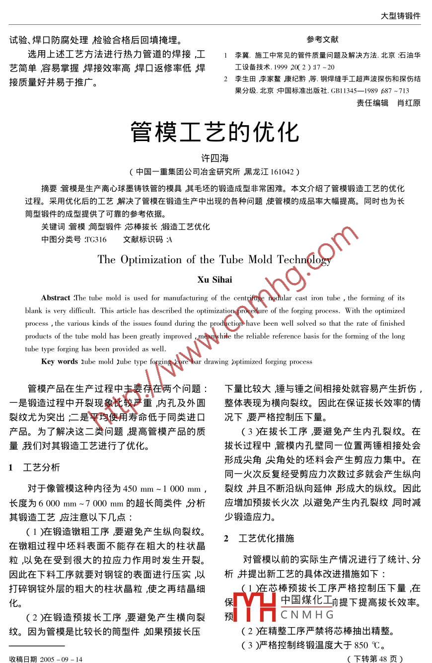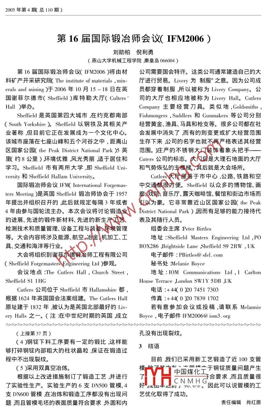 大型鑄鍛件試驗、焊口防腐處理檢驗合格后回填掩埋。參考文獻選用上述工藝方法進行熱力管道的焊接工1李冀.施工中常見的管件質(zhì)量問題及解決方法.北京石油華藝簡單容易掌握焊接效率高焊口返修率低焊工設備技術.1999202)17-20接質(zhì)量好并易于推廣。2李生田李家鰲康紀黔等.鋼焊縫手工超聲波探傷和探傷結(jié)果分級.北京中國標準出版社.GB11345-1989687~713責任編輯肖紅原管模工藝的優(yōu)化許四海中國一重集團公司冶金研究所黑龍江161042)要管模是生產(chǎn)離心球墨鑄鐵管的模具其毛坯的鍛造成型非常困難。本文介紹了管模鍛造工藝的優(yōu)化過程。采用優(yōu)化后的工藝解決了管模在鍛造生產(chǎn)中岀現(xiàn)的各種問題使管模的成品率大幅提髙。同時也為長筒型鍛件的成型提供了可靠的參考依據(jù)。關鍵詞管模筒型鍛件芯棒拔長觳造工藝優(yōu)化中圖分類號TG316文獻標識碼Ahe Optimization of the Tube mold TechnologyXu sihaiAbstract The tube mold is used for manufacturing of the centrifuge nodular cast iron tube, the forming of itsblank is very difficult. This article has described the optimiz ation procedure of the forging process, With the optimizedprocess, the various kinds of the issues found during the production have been well solved so that the rate of finishedproducts of the tube mold has been greatly improved, meanwhile the reliable reference basis for the forming of the longtube type forging has been provided as wellKey words lube mold Jube type forging core bar drawing optimized forging process管模產(chǎn)品在生產(chǎn)過程中主要存在兩個問題:下量比較大錘與錘之間相接處就容易產(chǎn)生折傷一是鍛造過程中開裂現(xiàn)象比較嚴重內(nèi)孔及外圓整體表現(xiàn)為橫向裂紋。因此在保證拔長效率的情裂紋尤為突出二是平均使用壽命低于同類進口況下要嚴格控制壓下量。產(chǎn)品。為了解決這二類問題提高管模產(chǎn)品的質(zhì)(3)在拔長工序要避免產(chǎn)生內(nèi)孔裂紋。在量我們對其鍛造工藝進行了優(yōu)化。拔長過程中管模內(nèi)孔壁同一位置兩錘相接處會形成尖角尖角處的坯料會產(chǎn)生剪應力集中。在1工藝分析同一火次反復經(jīng)受剪應力次數(shù)過多就會產(chǎn)生縱向?qū)τ谙窆苣_@種內(nèi)徑為450mm~1000mm,裂紋并且不斷沿縱向延伸形成大的縱紋。因此長度為6000m~7000mm的超長筒類件分析應增加預拔長火次以避免產(chǎn)生內(nèi)孔裂紋同時減其鍛造工藝應注意以下幾點少鍛造應力。(1)在鍛造鐓粗工序要避免產(chǎn)生縱向裂紋在鐓粗過程中坯料表面不能存在粗大的柱狀孱2工藝優(yōu)化措施粒,以免在受到很大的拉應力作用時發(fā)生開裂。對管模以前的實際生產(chǎn)情況進行了統(tǒng)計、分因此在下料工序就要對鋼錠的表面進行壓實以析并提出新工藝的具體改進措施如下打碎鋼錠外層的粗大的柱狀晶粒使之再結(jié)晶細1)在芯棒預拔長工序嚴格控制壓下量在化中國煤化工的提下提高拔長效率。(2)在鍛造預拔長工序要避免產(chǎn)生橫向裂預CNMHG紋。因為管模是比較長的筒型件如果預拔長壓2庥在精整工序嚴禁將芯棒抽岀精整。3)嚴格控制終鍛溫度大于850℃。收稿日期2005-09-14(下轉(zhuǎn)第48頁)2005年第4期總110期)第16屆國際鍛冶師會議(IFM2006)劉助柏倪利勇燕山大學機械工程學院秦皇島066004)第16屆囯際鍛冾師會ⅸ(IFM2006)將由材公司需要國會特許。這類公司通常建造自己的大料礦產(chǎn)開采研究院 The institute of materials,min-廳進行貿(mào)易。 Livery為制服”"之意。因為公司成erals and mining)于2006年10月15-18日在英員都穿著制服所以被稱為 Livery Company。公囯謝菲爾德市( Sheffield)庫特勒大廳( Culters′司的大廳也相應地被稱為 Livery Hallo CutlersHall)舉辦Company主要經(jīng)營刀具。類似地, GoldsmithsSheffield是英國第四大城市在約克郡南部 Fishmongers, Saddlers和 Gunmakers等公司分別South Yorkshire ) Sheffield以鋼鐵及其相關產(chǎn)經(jīng)營黃金、漁具、馬具和槍支等。很多公司都在社業(yè)著稱但目前它正在發(fā)展成為一個文化中心。會發(fā)展中消失了而有的則變更或擴大經(jīng)營范圍該城市座落在七座山峰和五個河谷之中,距離山生存下來公司的名字也就不再嚴格表述其經(jīng)營區(qū)國家公園( the Peak District National Park)5英范圍。)莊嚴的不銹鋼大門裝飾著象頭把手里(約8公里)環(huán)境優(yōu)雅風光秀麗適于居住和 Cuters公司的標志。大門后是大理石地面的大廳學習。 Sheffield市有兩所大學,即 Sheffield uni-和氣勢恢弘的主樓梯,其后就是大會場所versity FA Sheffield Hallam UniversityCutlers大廳座落于市中心,公路、鐵路和空國際鍛冶師會議IFM( International Forgemas-中交通都很方便。 Sheffield以眾多的博物館、畫ters meeting)是英國 Sheffield鍛冶師協(xié)會于1957廊、戲院、音樂廳、露天咖啡館、餐館和街邊市場而年提出并組織召開的此后就規(guī)定每隔3年或者引以為豪。它非??拷絽^(qū)國家公園( the peak4年由參與國輪流主辦。本次會議將討論鍛造業(yè) District National Park)因而有足夠的能力接待代的進展、先進的鍛件新材料、先進的新生產(chǎn)工藝、表及其隨行人員。檢測技術和質(zhì)量管理、設備工程與裝備、環(huán)境管理組委會主席 eter birtles等。大會內(nèi)容將涉及能源、航空、冶金、機加工、工地址: Sheffield Masters Engineering Ltd,PO具、交通和海洋等