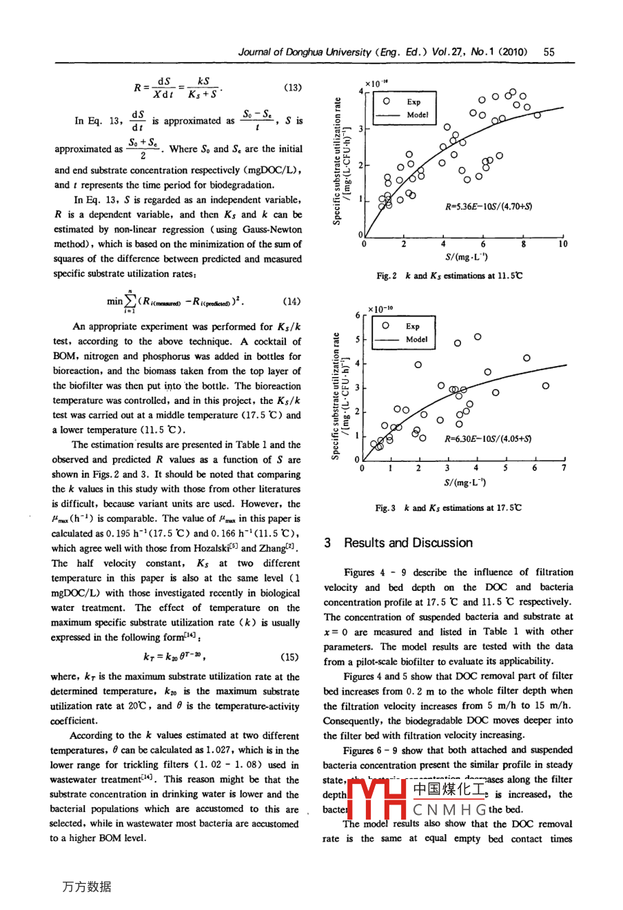 52Jourmal of Donghua University (Eng. Ed.) Vol.27, No. 1 (2010)Modeling of Biofiltration Process in Drinking Water TreatmentCHEN Wei (陳衛(wèi))' , XIA Qiong-qiong (夏瓊瓊)',2*,ZHENG Xing-can (鄭興燦)3College of Enrirorment Science and Engineering,Hohai University, Nanjing 210098, China2 State Key Laboratory of Hydrology Water Resource and Hydraulic Enginering, Nanjing 210098 , China3 National Engineering Research Center for Urban Water and Wastewater, Tianjin 300074, ChinaAbstract: The aim of this research is to develop awhile most research results showed that despite therepresentative model which simulates the performance of aapplication of air scour, the biomass of biofilters would notbiofilter used to treat drinking water. A steady-sate model isbe significantly decreased by backwashing. And accordingapplied. The Monod-type substrate utilization is used, andto these research data, even if the biofilter was backwashedthe extermal and the intermal mass transfer are neglected inwith air, the most significant biomass loss was not morethis model. The model describes the process of substratethan 50%一60%5.刀. This suggested that the effect ofbiodegradation, bacterial attachment onto filter media, andperiodic backwashing on biofilter performance could bedetachment of suspended bacteria. It simulates the naturalneglected. Therefore, steady-state model is moreorganic matter (NOM) and biomass profiles in a biofilter asrepresentative and practical.a function of filter depth and fitration velocity. The keyThe steady-state modei was first introduced bybiokinetic parameters k and Ks are estimated through aRittmann and McCartyC]. It described substrate diffusionspecial experiment. The results of the model testing showwithin the biofilm, substrate utilization in the biofilm andthat the model prediction agrees well with the experimentalthe biofilm growth and decay. Later, Sacz, and Rittmanndata.then developed a pseudo analytical solution for this model,Key words: biodegradable organic matter; biofiter;which helped to work out the substrate flux into a steadydrinking water; modelingstate biofilm and biofilm thickness.CLC namber: TU991.24Document code: ASteady-state biofilm model was developed by ZhangArticle ID: 1672 - 5220(2010)01 - 0052 - 06and Huck[2] to simulate the removal of assimilable organiccarbon (AOC) in deep bed filters. Four parameters of themodel were determined by non-linear regression, thus a lotIntroductionof data was needed, and the precision of the simulationresults was always lower at other sites.In drinking water treatment, biofiltration is aWang and Summer'] developed another model forpromising way to remove natural organic matter anddeep bed filters. In this model, the diffusion of substrateachieve biological stability, thus having attracted greatinto a biofilm was assumed to be neglected because of lowattention in water industry. Since 1980s, many researchesamount of biomass present. However, the concentration ofhave been performed on it. In order to further understandsessile bacteria should be determined in every situation.the chemical and microbiological processes, manyBillen et al.國published the Chabrol model. Theresearchers have made studies of the biodegradationauthors divided biodegradable dissolved organic carbonmechanisms and put forward a lot of biofilter models.(BDOC) into three components and considered the majorThese models can be divided into steady-state[I] andmicrobiological processcs, including hydrolysis andnon-steady-statel5] types. Steady-state models consideredmetabolism of organics, interactions between bacteria andthat the biomass of biofilm were unchanged, while non-solid support, and mortality and grazing of bacteria. Thesteady-state took the sudden loss of attached biomass due tomodel required a large number of parameters which werefilter backwash into account.difficult to determine.The non-steady-state model proposed by Hozalski andThe overall objective of this paper is to develop a moreBouwer()] showed that the average biodegradable organicrepresentative steady-state biofilter model for designingmatter (BOM) removals should not be impacted until thebiofiltration processes in water treatment. The modelamount of biomass lost during backwashing exceeds 60% ,should be able to describe the fundamental bioprocesses in中國煤化工Recived date: 2008-03- 19Foundation items; National Natural Science Foundation of China (No.MYH. CNM H Guio Pa tor GnadureStudents of Jiangsu; Province of China (No. 1061B06013)* Correspondence should be addressed to XIA Qiong-qiong, E-mail: xqqwater@126. comJourmal of Donghua University (Eng. Ed.) Vol.27, No.1 (2010) 5biofilters and simulate the natural organic matter (NOM)to be homogenous and have the same properties. Thconcentration as well as bacterial concentration correctly.external mass transportation and diffusion inside thebiofilm are neglected.1 Experiment and Methods2.1 Biodegradation of substrateAs the concentration of sessile bacteria is much higher1.1 Biofiltration apparatusthan that of suspended bacteria, substrate utilization isNOM in drinking water treatment is composed ofconsidered mainly by the bacteria attached on the fitervarious organic substances, most of which are unknown andmedia. According to Michalis-Menten kinetic, that relatively low concentration. Therefore other method issubstrate utilization rate is:more suitable to determine the concentration of NOM. In-μmx .S.X. _ -k.S. Xm(1this research, dissolved organic carbon (DOC) was used torepresent the NOM.The DOC removal in a biofiltration process waswhere Pam is the maximum specific growth rate of bacteria(h"), Ks is the Monod half velocity constant (mgDOC/L),investigated in a pilot plant, which took the effluent waterk is the maximum specific substrate utilization rate (mgDOC/of a sedimentation tank in a water treatment plant as theCFU/h), Yw/s is the growth yield (CFU/mgDOC).raw water. The experiment was performed in a granularactivated c