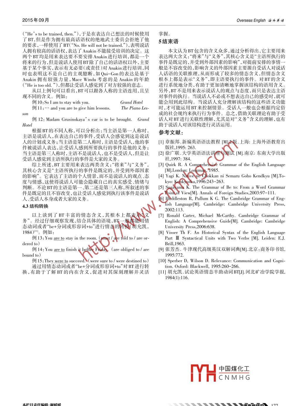 hwsy@overseaen.comISSN 1009- -5039htp://ww.overcaen.comOverseas English海外英語Tel:+86- -551-65690811 65690812“Be To”結(jié)構(gòu)的句法與語義分析樊湘軍(廣東創(chuàng)新科技職業(yè)學(xué)院外語系,廣東東莞523960)摘要:“Be To”結(jié)構(gòu)的含義較多,語法書、詞典以及相關(guān)研究對之都有不少闡述,但是一般都沒有對其諸多含義進(jìn)行系統(tǒng)地分類,也沒有挖掘出其核心含義,致使其內(nèi)在的含義仍然模糊。該文從句法、核心含義、情態(tài)含義、語義關(guān)聯(lián)等方面對該結(jié)構(gòu)進(jìn)行了剖析,探尋出該結(jié)構(gòu)的核心含義,并將其諸多含義分為兩類:將來與義務(wù),為更深刻、系統(tǒng)地認(rèn)識(shí)“Be To”結(jié)構(gòu)提供參考。關(guān)鍵詞:Be To;句法;語義;分析中圖分類號(hào):H313文獻(xiàn)標(biāo)識(shí)碼:A文章編號(hào):1009- -5039(2015)17-0175-03"Be To" the Structure of the Syntactic and Semantic AnalysisFAN Xiang- jun(Guangdong vocational college of science and technology innovation department of foreign languages, Dongguan 523960, China)Abstract: the meaning of "Be To" structure is more, grammar books, dictionaries and related research To have many, but usuallynot for its many meanings systematically classified, no dig up its core meaning, its inner meaning remains ambiguous. This articlestructure, and its many meanings can Be divided into two categories: and obligations in the future, for deeper, the structure of thesystem To know "Be To" To provide the reference.Key words: Be To; syntactic; semantic; analysis語法書、詞典以及相關(guān)研究對“BeTo”結(jié)構(gòu)(以下簡稱BT)上體現(xiàn)了助動(dòng)詞的屬性,如幫助構(gòu)成否定、謂語動(dòng)詞倒置等,但的用法都有不少闡述,收集的含義較多,包括預(yù)先計(jì)劃與安排、是它在此結(jié)構(gòu)中只有一 般現(xiàn)在時(shí) 與- -般過 去時(shí)的形式,完成時(shí)義務(wù)與責(zé)任、能與可能、指示與命令允許與禁止、命運(yùn)、規(guī)章、與被動(dòng)式的表達(dá)體現(xiàn)在不定式符號(hào)“to”后面的動(dòng)詞身上;BT本決定、征求意見后果、假定的將來等,其中對BT含義的理解有身不是一個(gè)情態(tài)結(jié)構(gòu),CambridgeGrammarofEnglish對“情態(tài)其共性,也有差別。那么, BT有沒有一一個(gè)核心含義呢?眾多含( modality)”這樣解釋:“refers to a speaker's or a writer' s atti-義有沒有規(guī)律性呢?另外"章振邦( 1995 )將BT的闡述放在將tude, or point of view about, a state of the world"。它本身并不表來時(shí)間表達(dá)法的章節(jié),2徐廣聯(lián)(1997)將其闡述放在--.般將來示說話人或作者的觀點(diǎn)與態(tài)度的,不屬于情態(tài)動(dòng)詞范疇,但是時(shí)章節(jié),該結(jié)構(gòu)的情態(tài)含義遠(yuǎn)遠(yuǎn)多于表示將來的含義,為什么語言 的沉淀與發(fā)展以及在語用過程中賦予了BT較多的情態(tài)含不將它放在情態(tài)動(dòng)詞章節(jié)呢?這些問題都是本文所關(guān)注的重義,這在語義分析中會(huì)重點(diǎn)闡述。點(diǎn),以下將從句法、核心含義、情態(tài)含義、語義關(guān)聯(lián)等方面對BT 1.2與不定式作表語的區(qū)別進(jìn)行剖析。在BT中,從句法上講,“"be"與“to"是一個(gè)有 機(jī)的統(tǒng)- -體,1句法分析般來說它們是不分開的,但有時(shí)也會(huì)分開,不過比較少見。1.1結(jié)構(gòu)屬性例1:He was definitely to hold the ball.從句法角度來看,不同的研究對BT的解釋也不盡相同,主例1中的definitely將“be"與“to”進(jìn)行分離,但仍然是BT,要有兩種看法:一是Quirk( 1985)與Yagi(996)將之視為-一個(gè)“to” 是不能省略的,分離的原因主要是說話人考慮強(qiáng)調(diào)、節(jié)奏詞匯單位,表達(dá)情態(tài)含義時(shí)。二是Sugayama( 2003 )將之視為兩等因素所致,從根本上,它與"He was to hold definitely the ball."個(gè)獨(dú)立的成分,“be"為表示情態(tài)或類情態(tài)的助動(dòng)詞,“o”的含義的含義沒有差別。再如:取決于整個(gè)句子結(jié)構(gòu)含義,且具有預(yù)測功能。另外, Hud-例2:AlI he needs to do is to have a rest.dleston & Pullum(2002)認(rèn)為“o”是一個(gè)動(dòng)詞短語的從屬連詞例3:His job is really to make the activity a success.( verb phrase subordinator),有時(shí)可以省略間。不同的語言學(xué)家以上兩個(gè)例句都含有“be”與“to”,但不是本文所討論的.對BT有不同的觀點(diǎn),一致性的認(rèn)識(shí)體系還沒建立起來。BT,而是"be+不定式作表語”的情況。辨別的方法可使用“顛倒本文偏向于Quirk的解釋,主要理由是:法”,如將“Ais B."變成“Bis A." ,如果句子成立,則屬于“be+不BT是一個(gè)相對穩(wěn)定的結(jié)構(gòu),已經(jīng)作為一- 個(gè)詞匯單位來使定 式作表語”,否則便是BT。例3為分裂不定式(split infini-用,“to”不能省略;"be”為半助動(dòng)詞(沒有含義),它在- -定程度tive),really 使make的“語義施為性”更為凸顯。另外,“be+不定中國煤化工MYHCNMHG收稿日期:2015-06-20修回日期:2015-07-02作者簡介:樊湘軍(1977-),男,湖南永州人,廣東創(chuàng)新科技職業(yè)學(xué)院外語系講師,碩士,主要從事應(yīng)用語言學(xué)與外語教學(xué)。本欄目責(zé)任編輯:謝嬡嬡X 通孕研曉175Overseas English海外英語2015年09月式作表語”的表達(dá)中,“to”有時(shí)候是可以省略的,如例2,在此就個(gè)事件,但是相關(guān)研究一般并沒有作出詳細(xì)的解