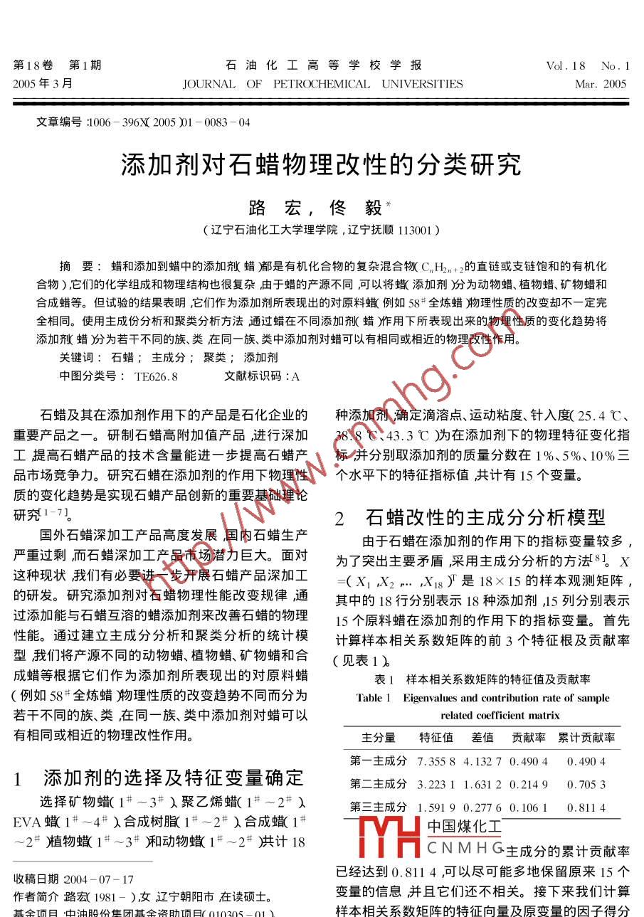 第18卷第1期石油化工高等學(xué)校學(xué)報(bào)Vol. 18 No. 12005年3月JOURNAL OF PETROCHEMICAL UNIVERSITIESMar.2005文章編號(hào):1006 - 396X( 2005 )01 - 0083 -04添加劑對(duì)石蠟物理改性的分類研究路宏,佟毅(遼寧石油化工大學(xué)理學(xué)院,遼寧撫順113001 )摘要:蠟和添加到蠟中的添加劑蠟都是有機(jī)化合物的復(fù)雜混合物(C,H2n+2的直鏈或支鏈飽和的有機(jī)化合物),它們的化學(xué)組成和物理結(jié)構(gòu)也很復(fù)雜,由于蠟的產(chǎn)源不同可以將蠟(添加劑)分為動(dòng)物蠟、植物蠟、礦物蠟和合成蠟等。但試驗(yàn)的結(jié)果表明,它們作為添加劑所表現(xiàn)出的對(duì)原料蠟例如58#全煉蠟)物理性質(zhì)的改變卻不一定完全相同。使用主成份分析和聚類分析方法通過(guò)蠟在不同添加劑(蠟)作用下所表現(xiàn)出來(lái)的物理性質(zhì)的變化趨勢(shì)將添加劑蠟分為若干不同的族、類在同-族、 類中添加劑對(duì)蠟可以有相同或相近的物理改性作用。關(guān)鍵詞:石蠟;主成分;聚類;添加劑中圖分類號(hào): TE626. 8文獻(xiàn)標(biāo)識(shí)碼:A石蠟及其在添加劑作用下的產(chǎn)品是石化企業(yè)的種添加劑;確定滴溶點(diǎn)、運(yùn)動(dòng)粘度、針入度( 25.4 C、重要產(chǎn)品之一。研制石蠟高附加值產(chǎn)品,進(jìn)行深加38.8C、43.3C)為在添加劑下的物理特征變化指工提高石蠟產(chǎn)品的技術(shù)含量能進(jìn)-步提高石蠟產(chǎn)標(biāo)并分別取添加劑的質(zhì)量分?jǐn)?shù)在1%、5%、10%三品市場(chǎng)競(jìng)爭(zhēng)力。研究石蠟在添加劑的作用下物理性個(gè)水平下的特征指標(biāo)值共計(jì)有15 個(gè)變量。質(zhì)的變化趨勢(shì)是實(shí)現(xiàn)石蠟產(chǎn)品創(chuàng)新的重要基礎(chǔ)理論研究1-7。.2石蠟改性的主成分分析模型國(guó)外石蠟深加工產(chǎn)品高度發(fā)展國(guó)內(nèi)石蠟生產(chǎn)由于石蠟在添加劑的作用下的指標(biāo)變量較多,嚴(yán)重過(guò)剩,而石蠟深加工產(chǎn)品市場(chǎng)潛力巨大。面對(duì)為了突出主要矛盾,采用主成分分析的方法8。X這種現(xiàn)狀我們有必要進(jìn)-步開展石蠟產(chǎn)品深加工=(X1.X2..,X18)T是18x15的樣本觀測(cè)矩陣,的研發(fā)。研究添加劑對(duì)石蠟物理性能改變規(guī)律通其中的18行分別表示18種添加劑,15 列分別表示過(guò)添加能與石蠟互溶的蠟添加劑來(lái)改善石蠟的物理15個(gè)原料蠟在添加劑的作用下的指標(biāo)變量。首先性能。通過(guò)建立主成分分析和聚類分析的統(tǒng)計(jì)模計(jì)算樣本相關(guān)系數(shù)矩陣的前3個(gè)特征根及貢獻(xiàn)率型我們將產(chǎn)源不同的動(dòng)物蠟、植物蠟、礦物蠟和合(見(jiàn)表1)成蠟等根據(jù)它們作為添加劑所表現(xiàn)出的對(duì)原料蠟表1 樣本相關(guān)系數(shù)矩陣的特征值及貢獻(xiàn)率(例如58#全煉蠟)物理性質(zhì)的改變趨勢(shì)不同而分為Table 1 Eigenvalues and contribution rate of sample若干不同的族、類,在同--族、類中添加劑對(duì)蠟可以related coefficient matrix有相同或相近的物理改性作用。主分量特征值差值貢獻(xiàn)率累計(jì)貢獻(xiàn)率第一主成分7.3558 4. 13270. 490 40.49041添加劑的選擇及特征變量確定第二主成分3.2231 1.631 20.21490.705 3選擇礦物蠟( 1#~3# )聚乙烯蠟( 1#~2# )第三主成分1.591 90.2776 0.1061 0.811 4EVA蠟1#~4# )合成樹脂(1#~2# )合成蠟1#中國(guó)煤化工~2# )植物蠟1#~3# )和動(dòng)物蠟1#~2# )共計(jì)18TYHcNMHG主成分的累計(jì)貢獻(xiàn)率已經(jīng)達(dá)到0.811 4 ,可以盡可能多地保留原來(lái)15個(gè)收稿日期2004-07- 17變量的信息并且它們還不相關(guān)。接下來(lái)我們計(jì)算作者簡(jiǎn)介路宏( 1981- )女遼寧朝陽(yáng)市在讀碩士。.基金項(xiàng)目:中油股份集團(tuán)基金資助項(xiàng)目( 010305-01 )。樣本相關(guān)系數(shù)矩陣的特征向量及原變量的因子得分*通訊聯(lián)系方數(shù)據(jù)(見(jiàn)表2)84石油化工高等學(xué)校學(xué)報(bào)第18卷由表2可以看出,第一主分量的針入度變量的分量的運(yùn)動(dòng)粘度變量的因子得分都在0.5以上可因子得分多數(shù)都在0.3以上,僅有25 C針入度1%以表征粘度的描述因子;第三主分量的滴熔點(diǎn)變量和37.8 C針入度1%小于0.3 ,說(shuō)明添加量較少且的因子得分都在0.3以上,可以表征溶點(diǎn)的描述因溫度較低時(shí)對(duì)硬度的影響較小,而添加量增大時(shí)對(duì)子。表3給出了18種添加劑的各描述因子得分。硬度的影響較大可以作為硬度的描述因子第二主表2樣本相關(guān)系數(shù)矩陣的特征向量及原變量的因子得分Table 2 Eigenvector sample related coefficient matrix and score of former variable編號(hào)原變量第一主成分得分第二主成分得分 第三主成分得分滴溶點(diǎn)1%-0.1780-0. 19400.3645滴溶點(diǎn)5%-0.204 4- 0.22640.5438滴溶點(diǎn)10%0.2096- 0.222 20.526 2運(yùn)動(dòng)粘度1%- 0.088 70.506 20.195 15運(yùn)動(dòng)粘度 5%- 0.07000.525 80.1749運(yùn)動(dòng)粘度10%-0.065 50.51630.167 325 C針入度1%0.1342-0.006 8- 0.026425C針入度5%0.317 00.066 50.089 8925C針入度10%0.32290.027 4-0.01581037.8 C針入度1%0.233 70.173 10.277 71137.8 C針入度5%0.337 90.047 40.226 21237.8 C針入度10%0.351 2-0.011 60.164513 43.3 C針入度1%0.3492-0.104 3.0.121 71443.3 C針入度5%0.337 8- 0.084 20.101 3I543.3 C針入度10%0.338 5-0.0839.0.0920.注:原變量中1%、5%和10%表示添加劑添加量。表318 種添加劑