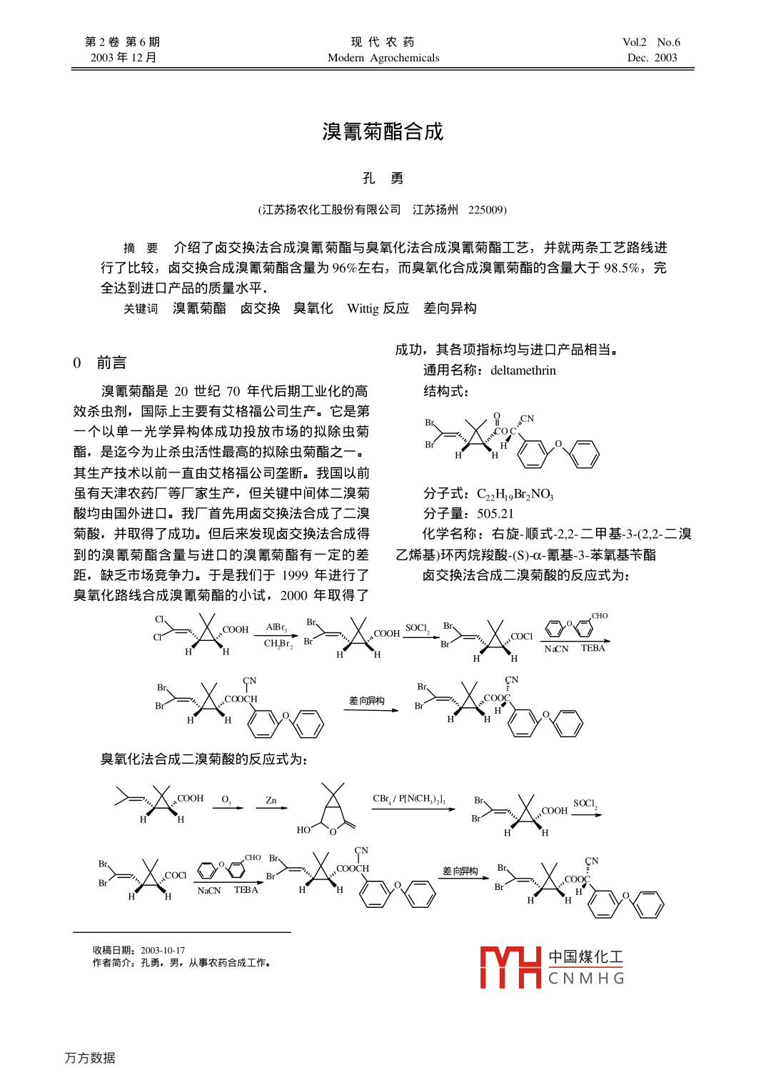 第2卷第6期現(xiàn)代農(nóng)藥Vol.2 No.62003年12月Modern AgrochemicalsDec. 2003溴氰菊酯合成孔勇(江蘇揚農(nóng)化工股份有限公司江蘇揚州 225009)摘要介紹了鹵交換法合成溴氰菊酯與臭氧化法合成溴氰菊酯工藝,并就兩條工藝路線進行了比較,鹵交換合成溴氰菊酯含量為96%左右,而臭氧化合成溴氰菊酯的含量大于98.5%,完全達到進口產(chǎn)品的質(zhì)量水平.關(guān)鍵詞溴氰菊酯 鹵交換臭氧化Wittig 反應(yīng)差向異構(gòu)成功,其各項指標(biāo)均與進口產(chǎn)品相當(dāng)。0前言通用名稱: deltamethrin溴氰菊酯是20世紀(jì)70年代后期工業(yè)化的高結(jié)構(gòu)式:效殺蟲劑,國際上主要有艾格福公司生產(chǎn)。它是第一個以單一光學(xué)異構(gòu)體成功投放市場的擬除蟲菊( Co酯,是迄今為止殺蟲活性最高的擬除蟲菊酯之一。、其生產(chǎn)技術(shù)以前一直由艾格福公司壟斷。我國以前雖有天津農(nóng)藥廠等廠家生產(chǎn),但關(guān)鍵中間體二溴菊分子式: C2H,BrNO3酸均由國外進口。我廠首先用鹵交換法合成了二溴分子量: 505.21菊酸,并取得了成功。但后來發(fā)現(xiàn)鹵交換法合成得化學(xué)名稱:右旋- 順式-2,2-二甲基-3-<2,2-二溴到的溴氰菊酯含量與進口的溴氰菊酯有一定的差乙烯基)環(huán)丙烷羧酸-(S)-0-氰基-3-苯氧基芐酯距,缺乏市場競爭力。于是我們于1999 年進行了鹵交換法合成二溴菊酸的反應(yīng)式為:臭氧化路線合成溴氰菊酯的小試,2000 年取得了、COOHAIBrBi、COOH.SOC1,,COClCH_Br21NaCN TEBACNC.COOCH差向異構(gòu)COOH臭氧化法合成二溴菊酸的反應(yīng)式為:. > =. X.C0oHCBr./ PINCH)2]s..cooHSCL,0H'...HCHO Bt、C0OCH差向異構(gòu)。Br、BB= X.CoCO°C.C0ONaCN TEBA H' H_y⑦收稿日期: 2003-10-17中國煤化工作者簡介:孔勇,男從事農(nóng)藥臺成工作。MHCNMH G.現(xiàn)代農(nóng)藥第2卷第6期加時間1~1.5 h滴畢保溫4 h, 反應(yīng)畢脫溶精餾.1合成方法得二溴酰氯無色液體,含量≥98%,收率≥95%。1.1 原料1.2.2.4溴氰菊酯(原油)合成右旋順式菊酸(本廠生產(chǎn))、 右旋順式二氯菊酸向反應(yīng)瓶中加入一定量的NaCN、間苯氧基苯(本廠生產(chǎn))、Zn粉、CBr4、NaCN、間苯氧基苯甲甲醛及水、催化劑和甲苯,攪拌降溫至0~5C,醛、三乙胺、乙醇、P[N(CH3)2]3、 SOCh、AlBr3、滴加一定量的二溴酰氯,滴加時間2 h, 滴畢保溫CH2Br2、冰醋酸、30%NaOH、THF、HBr和30%HCl6 ho 保溫畢,加入一定量的水,分層,水層用甲1.2 合成方法苯萃取2次,油層合并,水洗3次,負壓脫溶得淡1.2.1 鹵交換法合成棕紅色溴氰菊酯(原油),含量≥96%,收率≥95%。1.2.1.1三溴菊酸合成. 1.2.2.5 差向異構(gòu)向反應(yīng)瓶中加入50 g AlBr;及400 g CH2 Br2,向反應(yīng)瓶中加入200 g溴氰菊酯(原油)、200 g攪拌下降溫至-5"C~- 10C,開始滴加250 g右旋順乙醇及15 g三乙胺,攪拌下控制一定的降溫 速率式二氯菊酸CH2Br2溶液(50 g右旋順式二氯菊酸.降溫,使得溴氰菊酯原粉呈白色晶體析出,終溫0溶于200 g CH,Br2中),同時由導(dǎo)氣管通入干燥的士2C,抽濾,烘干,即得溴氰菊酯白色晶體狀原HBr氣體,控制2 h滴完,滴畢續(xù)通氣體1 h低粉,含量≥98.5%,收率≥95%。溫保溫2 h, 液譜中控至二氯菊酸小于0.5%,合格2結(jié)果與討論后將反應(yīng)液滴入10%的鹽酸中水解,水解溫度25~30C,水解畢分層,水層用CHBr2 萃取一次,合產(chǎn)物為白色晶體狀固體,熔點99~101 .5C,并油層,水洗,脫溶,得三溴菊酸晶體441 g.含幾乎不溶于水。產(chǎn)物的元素分析結(jié)果C: 52.17量94.7%,產(chǎn)率92%。(52.26), H: 3.74(3.76), N: 2.60(2.77), 各元素1.2.1.2二溴菊酸合成的分析結(jié)果與計算一致。 產(chǎn)物質(zhì)譜分析結(jié)果: 505向反應(yīng)瓶中加入80 g三溴菊酸、200 g水和([M] +,45), 297 ( [C;H2O2Br2]+,, 47),253200g甲苯,攪拌下滴加30%液堿至pH=9~10,([C,H,Br,]+,84.3), 208 ([CH,ON]+, 22.7), 181滴畢,保溫1 ho保畢,靜置分層,水層以50 g甲([C13HO]+,100)。 產(chǎn)物紅外分析結(jié)果: 0 /cm':苯萃取一次,合并油層水洗至中性,脫溶,得粗品,1734.7 (C=O), 752.3, 685.9 (苯環(huán)單取代), 3048.5 (三用50%的醋酸水溶液重結(jié)晶得灰白色二溴菊酸晶元環(huán))。結(jié)合以上分析并對照標(biāo)準(zhǔn)物質(zhì),可以確定體58.5g,含量93%,產(chǎn)率91%~92%。我們得到的產(chǎn)物就是目標(biāo)產(chǎn)物。1.2.2臭 氧化法合成從_上述數(shù)據(jù)看出,鹵交換法合成較臭氧法合1.2.2.1臭氧化反應(yīng)成的收率高,且操作方便,成本相對較低。但我們向反應(yīng)瓶內(nèi)加入240 g右旋順式菊酸和240 g用臭氧化法合成的二溴菊酸與用鹵交換法合成的二溶劑,攪拌下通入一定量的O3, 中控至右旋順式溴 菊酸相比,前者合成的溴氰菊酯原粉質(zhì)量得到了菊酸全部反應(yīng),降溫,分批加入120g Zn粉,過顯著的提高,該產(chǎn)品的各項指標(biāo)均已達到國外產(chǎn)品濾除去Zn鹽,水洗,脫溶即得蒈醛酸內(nèi)酯,收率的指標(biāo)。中試證明我們所采用的工藝條件溫和,可80.9%,含量≥95%。操作性強,產(chǎn)品的競爭力明顯提高,目前我公司已1.2.2.2 Wittig 反應(yīng)具備年產(chǎn)100 t溴氰菊酯原粉的能力。向反應(yīng)瓶中加入120 g內(nèi)酯.240 g THF及365gCBr4.低溫下滴加139 g P[N(CH)23,滴加時間2 h,滴畢保溫3 h, 分層,萃取,油層用飽和鹽水洗滌《墾殖與稻作》是遼寧省鹽堿地利用研究所主辦,3次,負壓脫溶即得白色晶體二溴菊酸,收率67%~以反映稻區(qū)經(jīng)濟。稻作科技.稻區(qū)發(fā)展為主的綜合性農(nóng)業(yè)