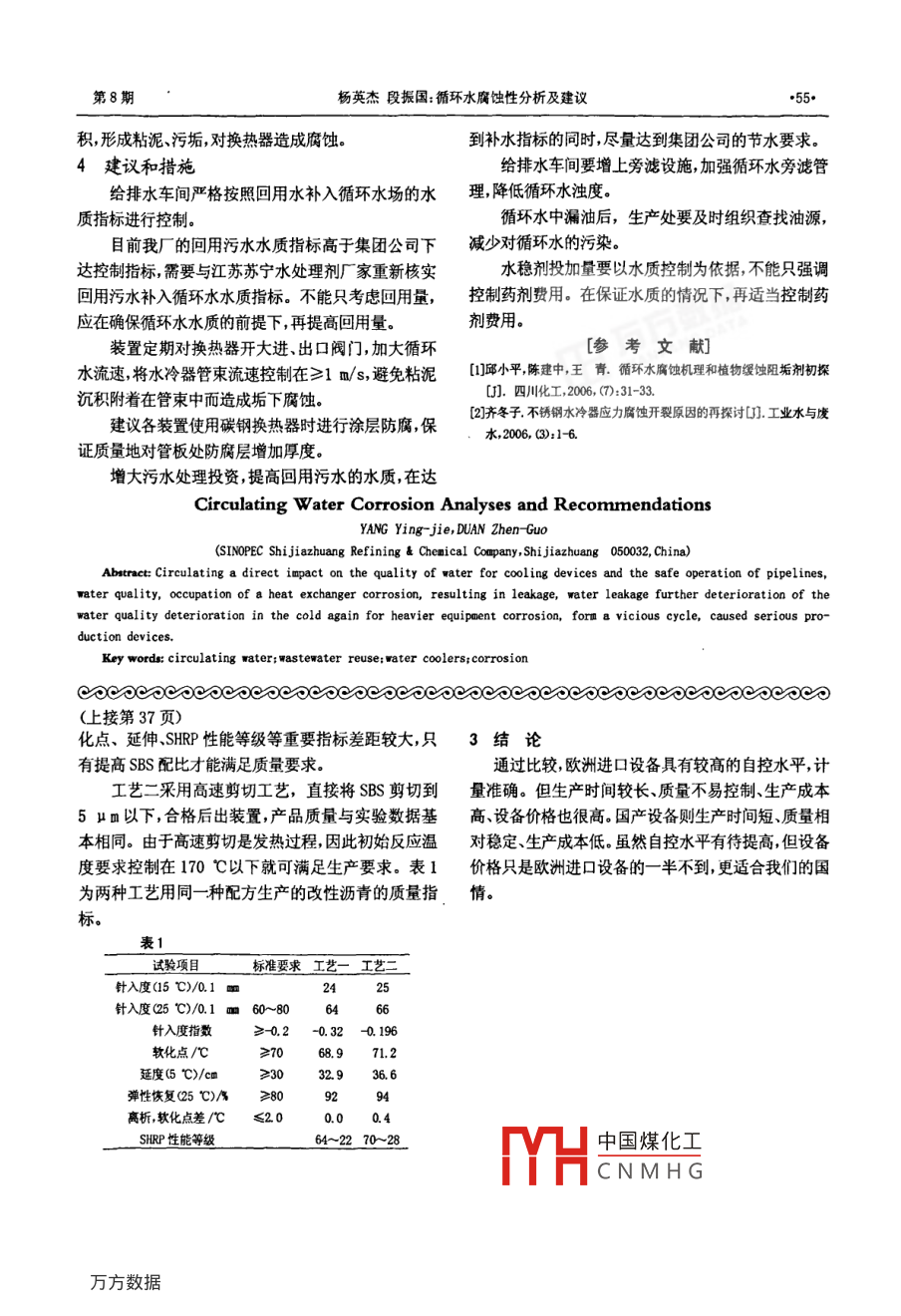 第31卷第8期的壯工VoL 31 Na 8循環(huán)水腐蝕性分析及建議楊英杰,段振國中國石油化工股份有限公司石家莊煉化分公司河北石家莊050032)摘要]循環(huán)水的水質(zhì)直接影響裝置水冷器及管路的安全運(yùn)行,水質(zhì)超標(biāo),對換熱器形成腐蝕造成泄漏泄漏進(jìn)一步使水質(zhì)惡化,惡化的水質(zhì)再對冷換設(shè)備加重腐蝕形成惡性循環(huán),嚴(yán)重時造成裝置停產(chǎn)[關(guān)鍵詞]循環(huán)水;污水回用:水冷器:腐蝕[中圖分類號]TQ085.4文獻(xiàn)標(biāo)識碼]B[文章編號]1003-5095(2008)08-0053-03中國石油化工股份有限公司石家莊煉化分公司02+2H0→40H催化車間循環(huán)水投用污水回用水以來從裝置冷卻器Fe*+ 2 OH-Fe(OH)2 4檢修的情況來看,有腐蝕加劇的趨勢,大多數(shù)情況是由于Fe(OH2的不穩(wěn)定性,在溶解氧存在的情況循環(huán)水側(cè)腐蝕,尤其是管板管子和焊縫腐蝕最嚴(yán)重,下有以下反應(yīng):許多管束的管板管子的焊縫產(chǎn)生裂紋。4 Fe(OH2+2 H 0+0 +4 Fe(OHD),冷卻水重復(fù)利用是節(jié)水減排的必然趨勢,但也不最終產(chǎn)生黑色的四氧化三鐵,其反應(yīng)如下:是無條件的。一方面在水的重復(fù)利用過程中,隨著水2 Fe(Odd,+ Fe(oHD). +4 H-O分的蒸發(fā),水中的溶解鹽類、懸浮固體及非揮發(fā)性有以上產(chǎn)物多數(shù)沉積于金屬設(shè)備的內(nèi)表面,形成了機(jī)物濃度逐步增大,超過一定濃度時在管道設(shè)備特宏觀上的腐蝕產(chǎn)物,呈現(xiàn)出大小不等的小鼓包清除別是在換熱面上發(fā)生結(jié)垢另一方面在水中有溶解掉腐蝕產(chǎn)物后,金屬表面上呈現(xiàn)出大小不等的凹坑氧存在的條件下,以鐵的陽級發(fā)生反應(yīng)可促進(jìn)形成有的呈點狀蝕坑有的呈潰瘍狀蝕坑嚴(yán)重者出現(xiàn)穿腐蝕電池造成嚴(yán)重的垢下腐蝕污垢覆蓋下的貧氧孔泄漏區(qū)與裸露的富氧區(qū)之間也能形成氧濃差電池使金屬1.1.2C02引起的腐蝕遭受局部腐蝕。反之,腐蝕也必然改變金屬的表明性C2的存在使水呈酸性在pH值降到7以下時,狀使結(jié)垢加劇。這樣,結(jié)垢腐蝕相輔相成相互促反應(yīng)可以生成H2,這樣腐蝕就可以不斷地進(jìn)行下去進(jìn)形成錯綜復(fù)雜的協(xié)同效應(yīng)影響甚至破壞生產(chǎn)系具體反應(yīng)如下:統(tǒng)的正常運(yùn)行。CO2+H0→H+HQ3H+2e→H2↑1腐蝕結(jié)垢的原因分析1.1電化學(xué)反應(yīng)過程的FeCO2腐蝕發(fā)生后,生成的Fe隨水流走,金屬在循環(huán)水處理過程中,大多數(shù)單位用自來水補(bǔ)表面沒有沉積的腐蝕產(chǎn)物,只能使設(shè)備的金屬表面不充而自來水中一般都溶解有一定量的Cl、O2、這斷變薄。些物質(zhì)都會與循環(huán)水設(shè)備形成原電池。1.2微生物腐蝕1.1.1氟引起的腐蝕循環(huán)水中鐵細(xì)菌硫細(xì)菌等微生物能加速電化學(xué)在含有C的水中,由于Cl所起的電荷轉(zhuǎn)移作腐蝕。鐵細(xì)菌將Fe氧化成Fe,硫酸鹽還原菌消耗用鐵原子失去兩個電子,變成二價鐵離子氧和水得H1,具體的反應(yīng)如下到電子而變成氫氧根離子,二價鐵離子與氫氧根離子Fe2→Fe+e結(jié)合生成氫氧化亞鐵具體的反應(yīng)過程如下:Fe-2e→Fe中國煤化工Fe+8°2+4H0[收稿日期]200804CNMHG條件有厭氧介質(zhì)、[作者簡介楊英杰1971-),男工程師從事設(shè)備管理工作.pH=5.5~85、水溫30~40℃;含有硫酸鹽、PO}、河北化工第8期Fe等無機(jī)物及有機(jī)物,循環(huán)水的條件和此吻合。格會增加設(shè)備的結(jié)垢速度。1.3成垢原因分析2.2氯離子濃度偏高,平均在600~700mg/L,最高天然水中溶解有各種各樣的鹽類,包括碳酸鹽、為945mg/L,氯離子起到促進(jìn)電荷轉(zhuǎn)移提高電化學(xué)硫酸鹽、硅酸鹽、磷酸鹽和氯化物等。通過對水垢的成腐蝕速度,還會形成奧氏體不銹鋼的晶間腐蝕凹分分析得出:導(dǎo)致天然水結(jié)垢主要是碳酸鹽和磷酸3目前存在的問題鹽,其具體的反應(yīng)過程如下3.1水凈化回用水問題ca(HCJ)2→CaC03↓+H0+CO2↑生化系統(tǒng)硝化反硝化反應(yīng)失調(diào)造成pH值偏低;當(dāng)循環(huán)冷卻水中溶解的重碳酸鹽較多時,水流經(jīng)電脫鹽排放的含鹽污水COD較高4000100g,t換熱器表面特別是溫度較高的表面時重碳酸鹽且產(chǎn)生的油渣很多,得不到及時有效處理造成浮選就會受熱分解;當(dāng)循環(huán)水通過冷卻塔時,溶解在水中運(yùn)行效果差,使生化及回用水COD偏高。的二氧化碳就會逸出,水的阻值就會升高,此時,重前期含硫污水汽提裝置運(yùn)行異常,造成凈化水氨碳酸鹽在堿性條件下也會產(chǎn)生CaCO2沉淀。當(dāng)水中溶氮偏高。凈化水回用電脫鹽然后產(chǎn)生上述含鹽污水。有適量的磷酸鹽時磷酸根將與鈣離子生成溶解度只該裝置于9月26~28日檢修,目前裝置已運(yùn)行正常,有0.1mg/幾的磷酸鈣沉淀:凈化水已達(dá)標(biāo)。2PQ+3Ca2-Ca2(PO2↓由于含油污水中氯離子濃度偏高,目前沒有處理循環(huán)水運(yùn)行前期投加有機(jī)瞬系列水穩(wěn)劑但由于手段,造成回用水氯離子濃度偏高,影響污水回用主運(yùn)行中頻繁投加含有活性氯的消毒劑致使阻垢劑水要是1罐區(qū)氯離子1800g/L,20萬四原油脫水解成正磷酸根,最終導(dǎo)致磷酸鈣在換熱器表面析出氯離子5143mg/L,重整污水497mg/L形成磷酸鹽垢對于監(jiān)測數(shù)據(jù),環(huán)保數(shù)據(jù)與水凈化數(shù)據(jù)有差別氧環(h
