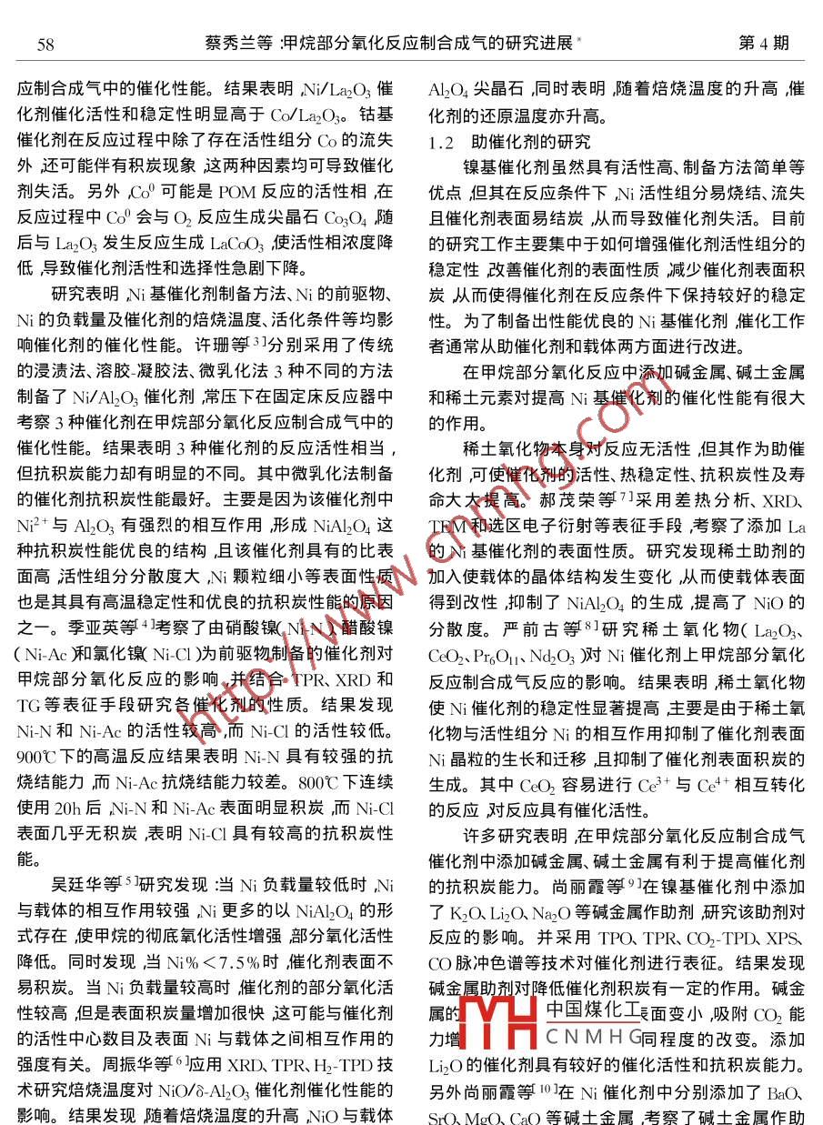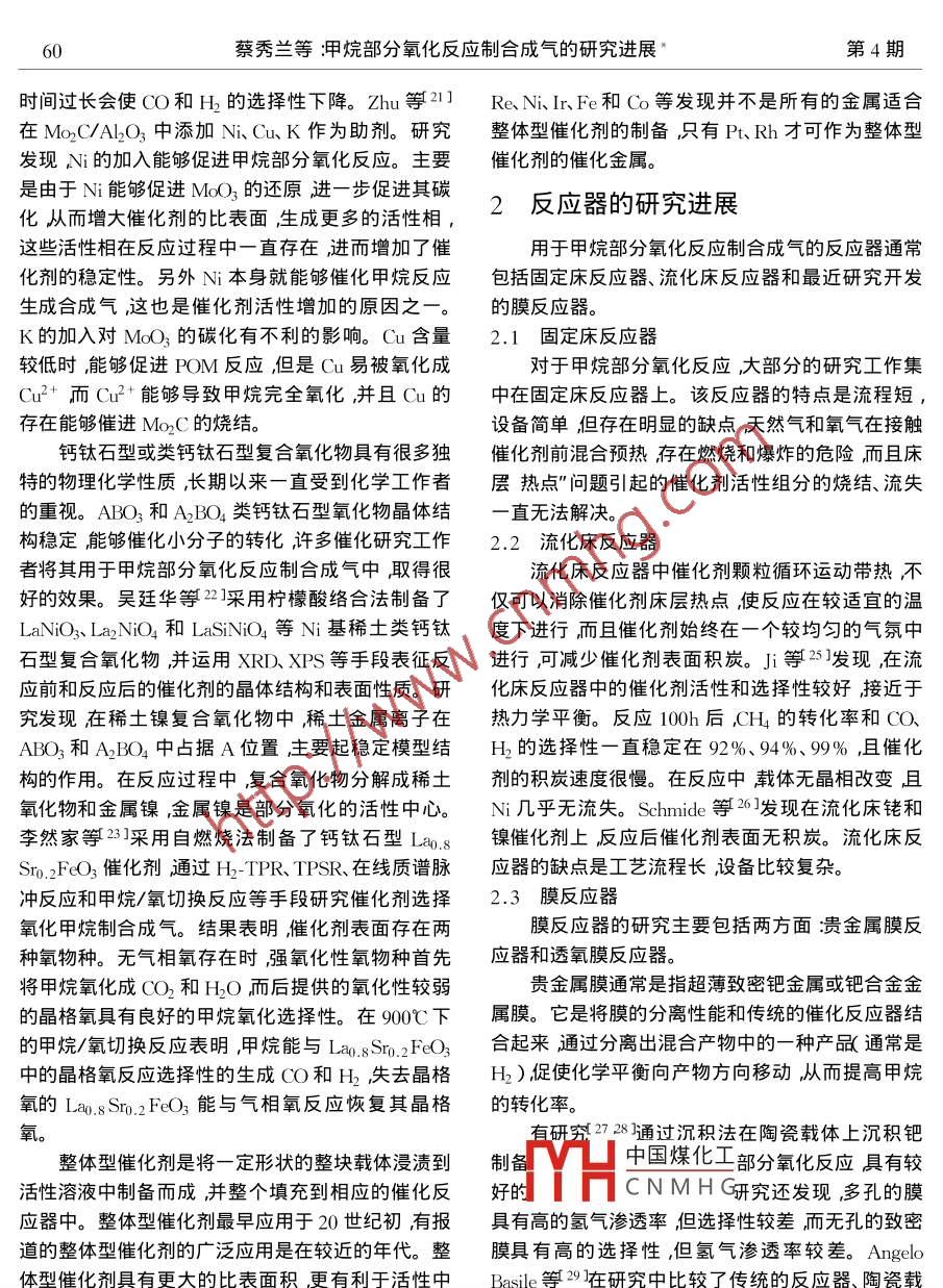2006年第31卷天然氣化工57甲烷部分氧化反應(yīng)制合成氣的研究進(jìn)展蔡秀蘭董新法林維明華南理工大學(xué)化工與能源學(xué)院廣州510640)摘要綜述了甲烷部分氧化反應(yīng)制合成氣的研究進(jìn)展情況重點介紹了催化劑和反應(yīng)器另外對新出現(xiàn)的激光促進(jìn)表面反應(yīng)技術(shù)和等離子體技術(shù)也進(jìn)行了簡單的介紹。關(guān)鍵詞押烷鄗分氧化合成氣催化劑反應(yīng)器中圖分類號621文獻(xiàn)標(biāo)識碼文章編號1001-92192006)4-5706自然界蘊藏著豐富的天然氣資源。目前,天然研究主要集中在催化劑研究、反應(yīng)器的研究等方面氣作為化工原料其用量僅占天然氣消耗量的~5%。但隨著天然氣化工技術(shù)的進(jìn)步從長遠(yuǎn)發(fā)展來看天催化劑的研究進(jìn)展然氣有可能成為21世紀(jì)取代石油的主要能源和化甲烷部分氧化反應(yīng)制合成氣中催化劑的研究主工原料。甲烷是天然氣的主要成分研究開發(fā)利用要包括活性組分、助催化劑和載體的研究。甲烷的技術(shù)是當(dāng)前國際上的熱門課題之一。甲烷的1.1活性組分的研究化學(xué)利用主要有兩種方法:直接轉(zhuǎn)化法和間接轉(zhuǎn)化甲烷部分氧化反應(yīng)制合成氣的催化劑多為負(fù)載法。直接轉(zhuǎn)化法是將甲烷直接轉(zhuǎn)化為工業(yè)上需要的型催化劑其活性組分主要分為潰貴金屬催化劑、非產(chǎn)品包括甲烷氧化偶聯(lián)制乙烷、乙烯甲烷選擇性貴金屬催化劑和其他活性組分的催化劑。氧化制甲醇、甲醛等以及甲烷無氧芳構(gòu)化等反應(yīng)。1.1.1貴金屬催化劑直接轉(zhuǎn)化法中甲烷轉(zhuǎn)化率和產(chǎn)品收率低短期內(nèi)無貴金屬催化劑由于具有高活性、高選擇性、穩(wěn)定法實現(xiàn)工業(yè)化。間接轉(zhuǎn)化法是將甲烷轉(zhuǎn)化成合成性、抗積炭等優(yōu)點而受到研究者的關(guān)注。研究發(fā)現(xiàn)氣進(jìn)而合成氨、甲醇、乙醇等化工產(chǎn)品。目前甲烷催化劑表面的抗積炭能力Rh、Ru、P1、I>>Pd其的大規(guī)模利用主要依賴于間接轉(zhuǎn)化法。中Rh、Pt的活性和穩(wěn)定性較好。Yman等1發(fā)現(xiàn)Rh業(yè)上主要采用水蒸氣重整工藝來制合成氣。的催化性能比Ru好。他們認(rèn)為貴金屬催化劑之所由于此反應(yīng)為強吸熱反應(yīng),需外界供熱才能獲得較以表現(xiàn)出不同的催化性能主要是由于催化劑表面高的甲烷轉(zhuǎn)化率該工藝能耗大、投資高且反應(yīng)產(chǎn)發(fā)生的反應(yīng)機理不同。在研究了RSiO、Ru/SiO物中H2yWOO)3不利于甲醇、費托合成等催化劑表面發(fā)生的反應(yīng)后發(fā)現(xiàn)在RbSO2的表反應(yīng)的進(jìn)行。另外在反應(yīng)過程中需加入過量的水面CO為最初產(chǎn)物而在Ru/SO2的表面AO2為來抑制積炭的形成。而甲烷部分氧化反應(yīng)(POM)最初產(chǎn)物,即RhSO2表面發(fā)生的是直接氧化反為溫和的放熱反應(yīng)可以利用反應(yīng)自身放出的熱量應(yīng)而RuSO2表面發(fā)生的是間接氧化反應(yīng)。由于進(jìn)行反應(yīng)且反應(yīng)產(chǎn)物中VH2yCO)=2有利貴金屬催化劑負(fù)載量高價格昂貴因此難以工業(yè)化于下游反應(yīng)。另外甲烷部分氧化反應(yīng)制合成氣的應(yīng)用反應(yīng)器體積小效率高這就有可能大幅度地降低制凵中國煤化工合成氣的投資與成本。近年來由于甲烷部分氧化CNMHGⅧB的鎳、鈷、鐵等催反應(yīng)制合成氣具有的明顯優(yōu)勢而受到廣泛的關(guān)注,化劑尤其是鎳基催化劑其催化性能僅次于銠且價修改稿日期20050805湛金來源疒東省自然基金資助項格便宜因此具有很好的研究和應(yīng)用前景。目前的艮(030514和廣東省科技計劃項目(200C34501)作者簡研究工作大多是圍繞鎳基催化劑進(jìn)行的。畢先鈞介秀當(dāng)努數(shù)等2堵考察了鎳基和鈷基催化劑在甲烷部分氧化反58蔡秀蘭等呷烷部分氧化反應(yīng)制合成氣的研究進(jìn)展第4期應(yīng)制合成氣中的催化性能。結(jié)果表明Ni/LaO3催№l2O4尖晶石,同時表明隨著焙燒溫度的升高催化劑催化活性和穩(wěn)定性明顯高于(o/La2O3。鈷基化劑的還原溫度亦升高。催化劑在反應(yīng)過程中除了存在活性組分Co的流失1.2助催化劑的研究外還可能伴有積炭現(xiàn)象這兩種因素均可導(dǎo)致催化鎳基催化劑雖然具有活性高、制備方法簡單等劑失活。另外C。可能是POM反應(yīng)的活性相在優(yōu)點但其在反應(yīng)條件下Ni活性組分易燒結(jié)、流失反應(yīng)過程中C會與O2反應(yīng)生成尖晶石Co3O4隨且催化劑表面易結(jié)炭從而導(dǎo)致催化劑失活。目前后與La2O3發(fā)生反應(yīng)生成LaCωO3使活性相濃度降的研究工作主要集中于如何增強催化劑活性組分的低導(dǎo)致催化劑活性和選擇性急劇下降。穩(wěn)定性改善催化劑的表面性質(zhì)減少催化劑表面積研究表眀N基催化劑制備方法、Ni的前驅(qū)物、炭從而使得催化劑在反應(yīng)條件下保持較好的穩(wěn)定N的負(fù)載量及催化劑的焙燒溫度、活化條件等均影性。為了制備出性能優(yōu)良的Ni基催化劑催化工作響催化劑的催化性能。許珊等3分別采用了傳統(tǒng)者通常從助催化劑和載體兩方面進(jìn)行改進(jìn)的浸漬法、溶膠凝膠法、微乳化法3種不同的方法在甲烷部分氧化反應(yīng)中添加堿金屬、堿土金屬制備了N/Al2O3催化劑常壓