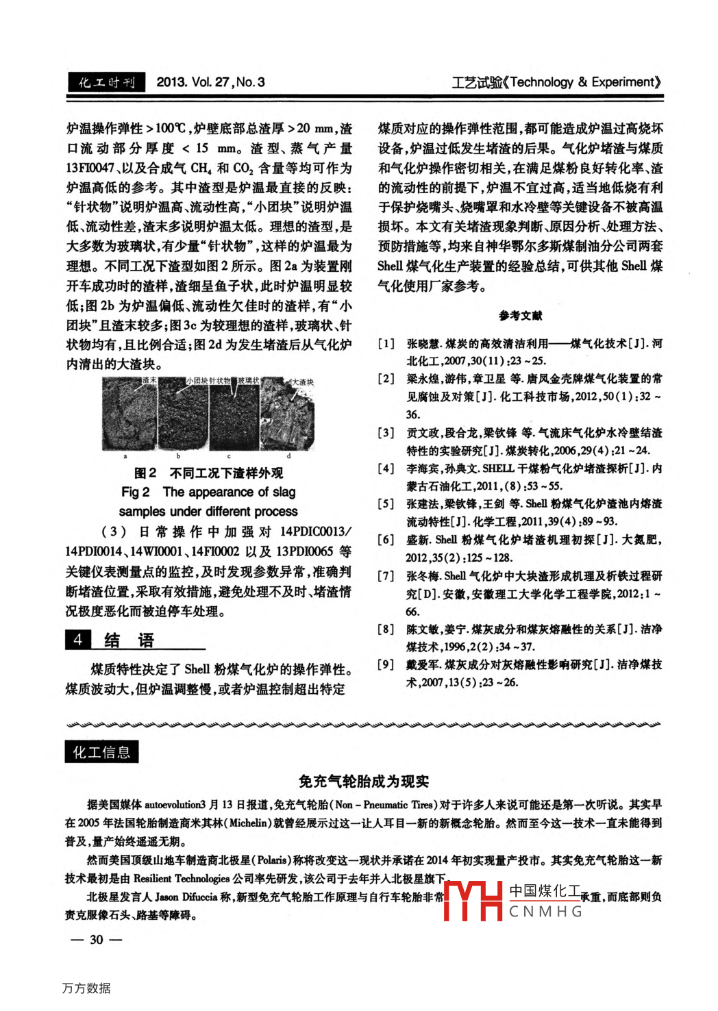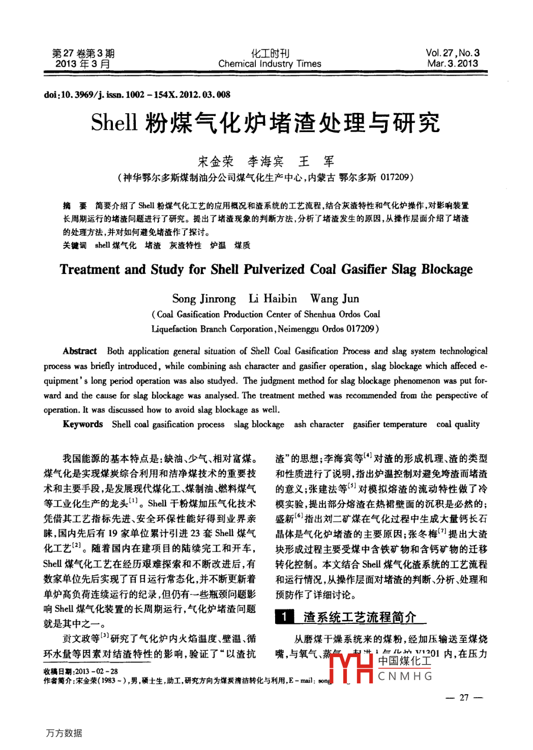 第27卷第3期化工時(shí)刊Vol.27 ,No.32013年3月Chemical Industry TimesMar.3.2013doi:10. 3969/j. issn. 1002 - 154X.2012. 03. 008Shell粉煤氣化爐堵渣處理與研究宋金榮李海賓王軍(神華鄂爾多斯煤制油分公司煤氣化生產(chǎn)中心,內(nèi)蒙古鄂爾多斯017209)摘要簡要介紹了Shell粉煤氣化工藝的應(yīng)用概況和渣系統(tǒng)的工藝流程,結(jié)合灰渣特性和氣化妒操作,對影響裝置長周期運(yùn)行的堵渣問題進(jìn)行了研究。提出了堵渣現(xiàn)象的判斷方法,分析了堵渣發(fā)生的原因,從操作層面介紹了堵渣的處理方法,并對如何避免堵渣作了探討。關(guān)鍵詞shell煤氣化 堵渣灰渣特性爐溫煤質(zhì)Treatment and Study for Shell Pulverized Coal Gasifier Slag BlockageSong Jinrong Li Haibin W ang Jun( Coal Gasification Production Center of Shenhua Ordos CoalLiquefaction Branch Corporation ,Neimenggu Ordos 017209)Abstract Both application general situation of Shell Coal Gasification Process and slag system technologicalprocess was briefly introduced, while combining ash character and gasifer operation, slag blockage which affeced e-quipment' s long period operation was also studyed. The judgment method for slag blockage phenomenon was put for-ward and the cause for slag blockage was analysed. The treatment methed was recommended from the perspective ofoperation. It was discussed how to avoid slag blockage as well.Keywords Shell coal gasifcation process slag blockage ash character gasifer temperature coal quality我國能源的基本特點(diǎn)是:缺油、少氣、相對富煤。渣”的思想;李海賓等4]對渣的形成機(jī)理、渣的類型煤氣化是實(shí)現(xiàn)煤炭綜合利用和潔凈煤技術(shù)的重要技和性質(zhì)進(jìn)行了說明,指出爐溫控制對避免垮渣而堵渣術(shù)和主要手段,是發(fā)展現(xiàn)代煤化工、煤制油燃料煤氣的意義;張建法等[5]對模擬熔渣的流動(dòng)特性做了冷等工業(yè)化生產(chǎn)的龍頭“。Shell 干粉煤加壓氣化技術(shù)模實(shí)驗(yàn),提出部分熔渣在熱裙壁面的沉積是必然的;憑借其工藝指標(biāo)先進(jìn)、安全環(huán)保性能好得到業(yè)界親盛新[°]指出劉二礦煤在氣化過程中生成大量鈣長石睞,國內(nèi)先后有19家單位累計(jì)引進(jìn)23套Shell煤氣晶體是氣化爐堵渣的主要原因;張冬梅(”]提出大渣化工藝(2]。隨著國內(nèi)在建項(xiàng)目的陸續(xù)完工和開車, .塊形成過程主要受煤中含鐵礦物和含鈣礦物的遷移Shell煤氣化工藝在經(jīng)歷艱難探索和不斷改進(jìn)后,有轉(zhuǎn)化控制。本文結(jié)合Shell 煤氣化渣系統(tǒng)的工藝流程數(shù)家單位先后實(shí)現(xiàn)了百日運(yùn)行常態(tài)化,并不斷更新著和運(yùn)行情況,從操作層面對堵渣的判斷分析、處理和單爐高負(fù)荷連續(xù)運(yùn)行的紀(jì)錄,但仍有一些瓶頸問題影預(yù)防作了詳細(xì)討論。響Shell煤氣化裝置的長周期運(yùn)行,氣化爐堵渣問題1L渣系統(tǒng)工藝流程簡介就是其中之一。.貢文政等”研究了氣化爐內(nèi)火焰溫度、壁溫、循從磨煤干燥系統(tǒng)來的煤粉,經(jīng)加壓輸送至煤燒環(huán)水量等因素對結(jié)渣特性的影響,驗(yàn)證了“以渣抗嘴,與氧氣、蒸氣古冼旨兒種1201內(nèi),在壓力中國煤化工收稿日期:2013 -02 -28作者簡介:宋金榮( 1983 ~) ,男,碩士生,助工,研究方向?yàn)槊禾壳鍧嵽D(zhuǎn)化與利用,E - mail: songJYHCNMHG一27-..宋金榮等Shell 粉煤氣化爐堵渣處理與研究2013.Vol.27,No.3化工時(shí)刊(3)渣收集器管表溫度下降:當(dāng)發(fā)生垮渣時(shí),熾.池,細(xì)渣和煤粉在V1402錐部沉積、堆實(shí)造成堵塞。熱的大渣塊掉進(jìn)渣收集器V1402, V1402管表溫度(3)排渣罐錐部堵渣:當(dāng)細(xì)渣和未反應(yīng)完全的煤14T10001將迅速升高;而當(dāng)渣口縮小,進(jìn)入V1402的粉在收集器V1402錐部堆實(shí)、堵塞時(shí),排渣罐V1403渣量減小,14TI0001將逐漸降低;或者V1402錐部堵錐部稍后也容易發(fā)生同樣的堵塞。渣未有效處理,大量冷渣從V1402往上堆積不能排3.3處理方法出,147T0001也將逐漸降低;(1)渣口堵渣:首先解除13PDI0065HH/LL聯(lián)(4)循環(huán)水量下降:當(dāng)收集器V1402錐部堵渣,鎖,然后對氣化爐提溫。適當(dāng)提高氧煤比,或者根據(jù)渣池水循環(huán)泵P1401打量減小,噴淋水流量14F10002生產(chǎn)需要提高負(fù)荷,均有助于爐溫提升。當(dāng)爐溫提高將降低;而當(dāng)排渣罐V1403錐部堵渣,排水增壓泵后,渣口堆積的渣逐漸熔融掉進(jìn)渣池,由于粘度降低,P1402打量14F10003也將低于正常值;渣口處流動(dòng)性也得到加強(qiáng), 13PD10065壓差也將恢復(fù)(5)渣口上下壓差上漲:正常工況下,渣口上下至正常值。必須注意的是,提高爐溫時(shí)不能過快,以壓力非常接近,13PDI0065為微負(fù)值。而當(dāng)渣口縮小免渣口處垮渣堵塞V1402。甚至堵死時(shí),渣口上方壓力明顯高于下方, 13PD10065(2)收集器錐部堵渣:首先解除渣池液位急劇上漲,嚴(yán)重時(shí)觸及甚至超過+24KPa系統(tǒng)ESD 14L0001 HH/LL聯(lián)鎖和14PDIC0013/14PD10014 聯(lián)跳車值。鎖,然后采取.上頂下壓的方法消橋。上項(xiàng):將V1402(6)排渣罐液位不降:當(dāng)排渣罐V1403錐部堵與V1403隔離,用高壓工藝水將V1403充壓高于塞時(shí),打開排渣閥其液位14L10007 無明顯下降。V14020.3~0.5MP,然后打開14XV0010/3.2原因分析14XV0009, V1402/V1403連通,確認(rèn)14PDIC0013/從Shell煤氣化裝置運(yùn)行情況看,堵渣可能出現(xiàn)14PD1I004 恢復(fù)正常。下壓:將V1402 與