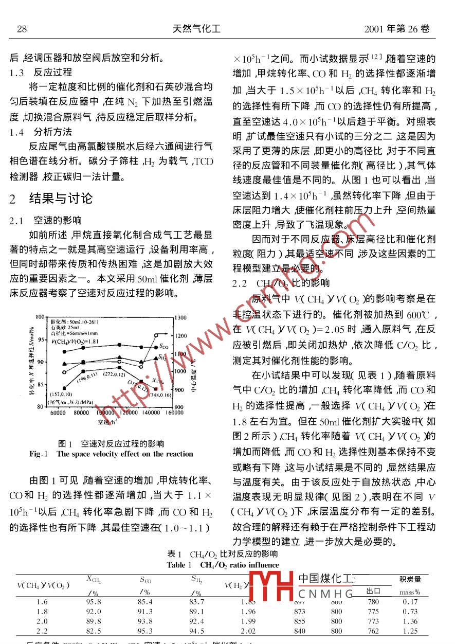 第1期陶家林等押烷氧化制合成氣300m3J/d規(guī)模擴(kuò)試y3<>y甲烷氧化制合成氣300規(guī)模擴(kuò)試技>>x>x發(fā)>陶家林*李慶康星武林世滸于作龍中國科學(xué)院成都有機(jī)化學(xué)研究所成都610041)摘要在自制催化劑上進(jìn)行了甲烷氧化制合成氣工藝300m3/d規(guī)模的擴(kuò)大實驗。實驗表明在原料氣中加入少量水蒸氣抑制了反應(yīng)初期表面N晶粒的燒結(jié)尤其是抑制了床層上部催化劑N晶粒的燒結(jié)提高催化劑活性甲烷轉(zhuǎn)化率、CO和H2選擇性分別可達(dá)到94%~96%、90%-92%、94%-99%在 VCHyVO2yWH2O)=1.90/1/0.22、千氣空速1.3×105/h、30m3/d規(guī)模20h壽命實驗中甲烷轉(zhuǎn)化率和〔O選擇性均大于90%而H選擇性高達(dá)9%以上催化劑顯示了較好的活性和穩(wěn)定性實驗也表明在髙密度放熱狀態(tài)下甲烷催化部分氧化制合成氣工藝具備可操作性和工業(yè)化潛力但工藝參數(shù)的優(yōu)化有賴于工程模型的建立需要進(jìn)一步旳擴(kuò)大實驗。關(guān)鍵詞押烷氧化洽成氣試中圖分類號:E665.3文獻(xiàn)標(biāo)識碼∶文章編號1001-92192001)1-27040前言和出現(xiàn)飛溫結(jié)果不同于一般反應(yīng)其放大效應(yīng)將更為明顯、對催化劑的要求和工藝過程控制將更由于石油資源的日漸減少和我國大量新的夭為苛刻因而反應(yīng)規(guī)模的逐級放大研究對該過程然氣資源的發(fā)現(xiàn),用天然氣轉(zhuǎn)化為液體產(chǎn)品向工業(yè)化發(fā)展是至關(guān)重要的。MeOh dme液體燃料等(GTL過程)以取代部本文通過對Ni擔(dān)載量、不同的載體、助劑、貴分石油資源調(diào)整我國能源結(jié)構(gòu)及其消費結(jié)構(gòu)的金屬添加劑等催化劑制備技術(shù)的全面考察開發(fā)出失衡現(xiàn)象是我國能源結(jié)構(gòu)調(diào)整的重要戰(zhàn)略目標(biāo),了含少量P的負(fù)載Ni金屬催化劑311在1ml催是關(guān)系到我國國民經(jīng)濟(jì)在下世紀(jì)能否持續(xù)快速發(fā)化劑下完成500h壽命試驗表明催化劑具有較高展的基礎(chǔ)所以天然氣的綜合利用近年來受到人的活性、穩(wěn)定性和抗積炭能力。本文考察了在放大們的廣泛重視。而天然氣化工產(chǎn)品中60%的產(chǎn)狀態(tài)下反應(yīng)溫度、壓力、空速、原料氣組成對催化品成本和裝置投資在于造氣部分12所以一直劑活性、催化劑及工藝過程穩(wěn)定性的影響。制備個主要過程水蒸汽重整、()重整和催化直接氧1實驗部分化或上述3個過程間的組合過程沖催化直接氧1.1催化劑的制備化法是溫和的放熱過程,它具有能耗低、產(chǎn)生適于本文所用催化劑為浸漬法制備具體制備過FT合成和合成醇的合成氣(V(H2yV(CO)程見文獻(xiàn)1132)超高空速≥1×105h-1河大大地提高生產(chǎn)效1.2反應(yīng)裝置率等優(yōu)點被視為是最有開發(fā)前景的工藝是降低脫硫后的天然氣經(jīng)質(zhì)量流量計計量后(天然造氣成本和投資的最可行方法。氣組成為:甲烷,92.25%;乙烷3.14%;丙烷雖然甲烷直接部分氧化制合成氣為弱放熱反0.75%汀烷混合物0.16%戎烷混合物0.12%應(yīng)但由于反應(yīng)空速大放熱密度高停留時間短,二中國煤化工%主要為氮氣;平均使得過程散熱困難易于在催化劑床層形成熱點分子CNMHG打入的經(jīng)氣化后的收稿日期20007-10基金來源油中國科學(xué)院技術(shù)水蒸汽混合然后在與經(jīng)質(zhì)量流量計計量并預(yù)熱重點項目資助作者簡介陶家林男,1962年生副研后的氧氣99.5%在T型混合器混合。天然氣、究員;興通訊聯(lián)系人O和水蒸氣在保溫下流經(jīng)預(yù)熱器加熱到400℃然后在反應(yīng)器反應(yīng)尾氣經(jīng)盤管冷卻除去冷凝水28天然氣化工2001年第26卷后經(jīng)調(diào)壓器和放空閥后放空和分析?!?05h-1之間。而小試數(shù)據(jù)顯示121隨著空速的1.3反應(yīng)過程増加,甲烷轉(zhuǎn)化率、O和H’的選擇性都逐漸增將一定粒度和比例的催化劑和石英砂混合均加當(dāng)大于1.5×10h-以后CH4轉(zhuǎn)化率和H2勻后裝填在反應(yīng)器中,在純N2下加熱至引燃溫的選擇性有所下降而CO的選擇性仍有所提高度切換混合原料氣待反應(yīng)穩(wěn)定后取樣分析直至空速達(dá)4.0×105h1以后趨于平衡。對照表1.4分析方法明擴(kuò)試最佳空速只有小試的三分之二這是因為反應(yīng)尾氣由高氯酸鎂脫水后經(jīng)六通閥進(jìn)行氣采用了更薄的床層即更小的高徑比對于不同直相色譜在線分析。碳分子篩柱為載氣,TCD徑的反應(yīng)管和不同裝量催化劑高徑比)其氣體檢測器校正碳?xì)w一法計量。線速度最佳值是不同的。從圖1也可以看出當(dāng)2結(jié)果與討論空速達(dá)到1.4×105h-1,雖然轉(zhuǎn)化率下降但由于床層阻力增大使催化劑柱前壓力上升空間熱量2.1空速的影響密度上升導(dǎo)致了飛溫現(xiàn)象。如前所述甲烷直接氧化制合成氣工藝最顯因而對于不同反應(yīng)器、床層高徑比和催化劑著的特點之一就是其高空速運行,設(shè)備利用率高粒度阻力)其最適空速不同涉及這些因素的工但同時卻帶來傳質(zhì)和傳熱困難這是加劇放大效程模型建立是必要的應(yīng)的重要因素之一。本文采用50m催化劑薄層2.2CH/O2比的影響床反應(yīng)器考察了空速對反應(yīng)過程的影響。原料氣中WCH4yW(O2)影響考察是在非控溫狀態(tài)下進(jìn)行的。催化劑被加熱到600℃,在CH4yWO2)=2.05時通入原料氣在反E9511200KCH小應(y
